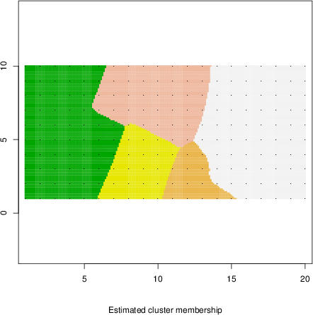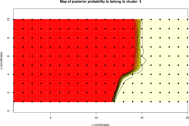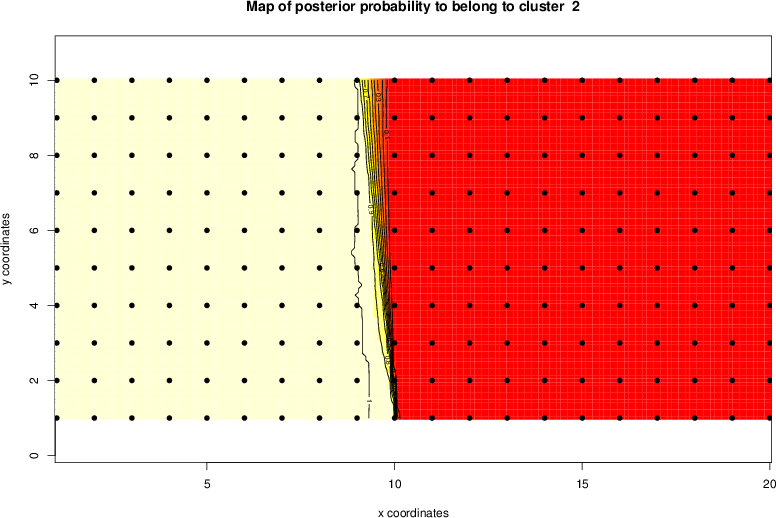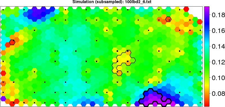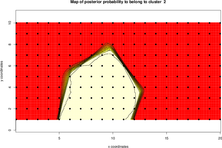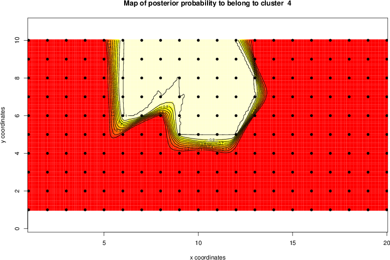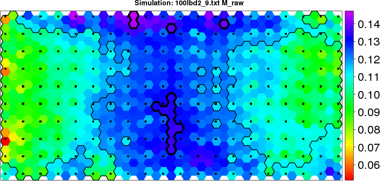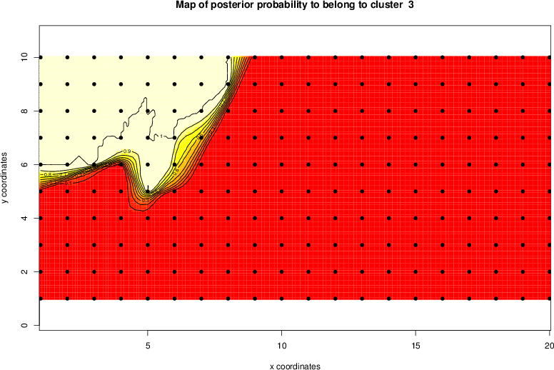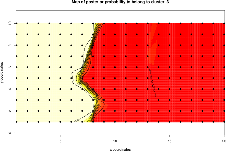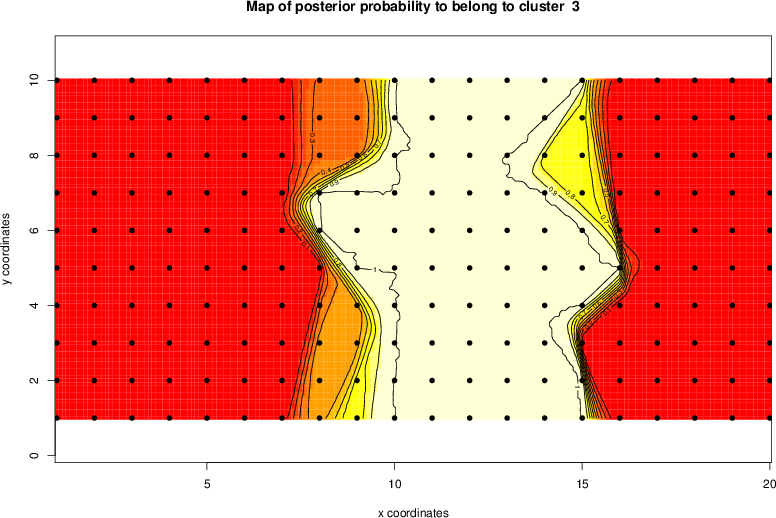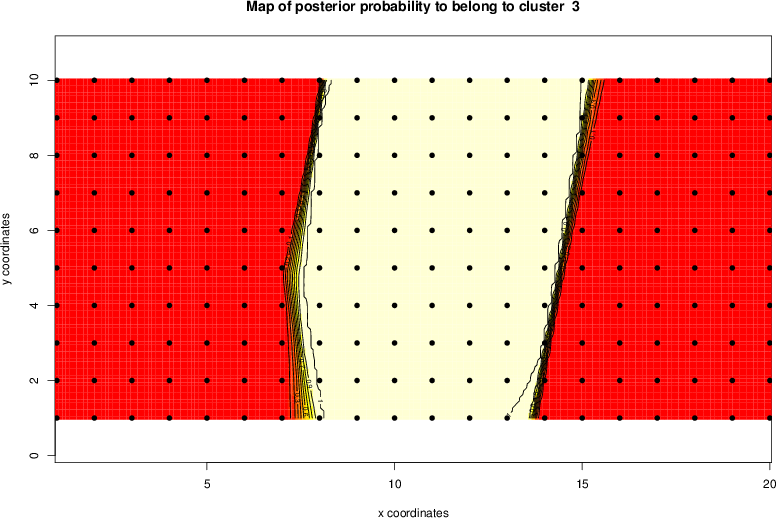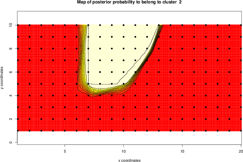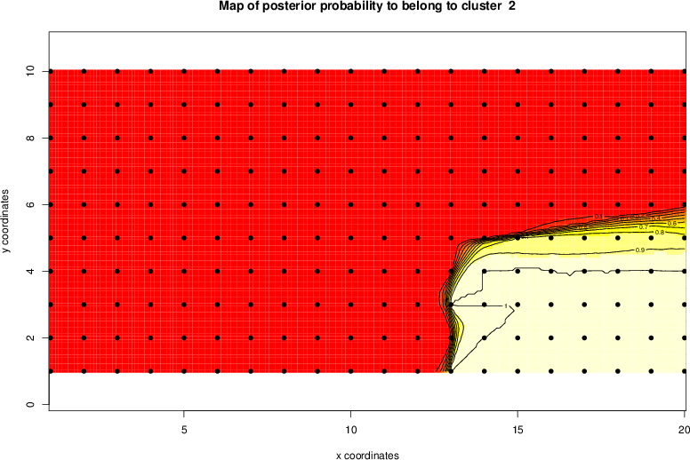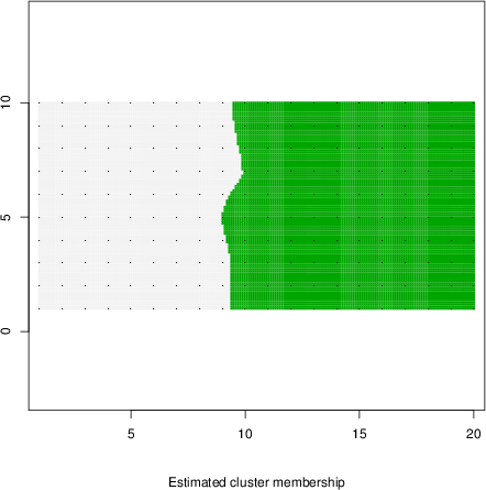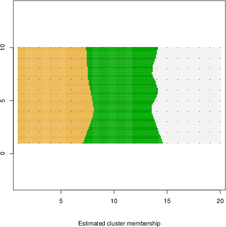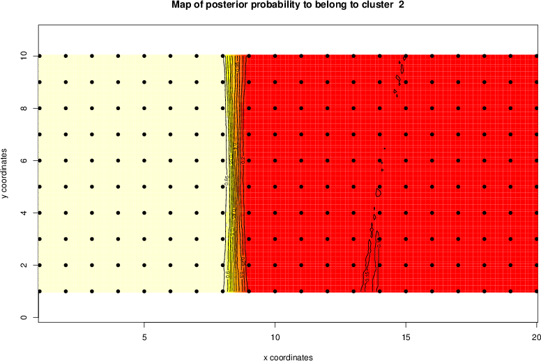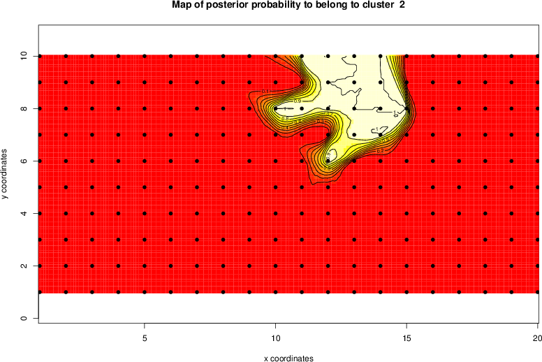 Simulated data | Geographical plots of weighted mean of all ellipse values (i.e., individual genetic distances ar of Rousset 2000) and significant barrier (cells with differentiation values higher than expected under a random distribution (no FDR applied) are materialized with thick black borders) | Idem, Benjamini-Yekutieli FDR applied | MAPI analysis (no FDR applied) with subsampled (75/200) dataset | MAPI analysis (Benjamini-Yekutieli FDR applied) with subsampled (75/200) dataset | Best probability memberships | Probability memberships for cluster 1 | Probability memberships for cluster 2 | Probability memberships for cluster 3 | Probability memberships for cluster 4 | Probability memberships for cluster 5 | Best probability memberships | Probability memberships for cluster 1 | Probability memberships for cluster 2 | Probability memberships for cluster 3 | Probability memberships for cluster 4 | Probability memberships for cluster 5 | Scatter plot showing the first two components of the DAPC (when K*>2) or density plot showing the first principal component of the DAPC (when K*=2) | Probability memberships for cluster 1 | Probability memberships for cluster 2 | Probability memberships for cluster 3 | Probability memberships for cluster 4 | Probability memberships for cluster 5 | Scatter plot showing the first two components of the DAPC (when K*>2) or density plot showing the first principal component of the DAPC (when K*=2) | Probability memberships for cluster 1 | Probability memberships for cluster 2 | Probability memberships for cluster 3 | Probability memberships for cluster 4 | Probability memberships for cluster 5 |