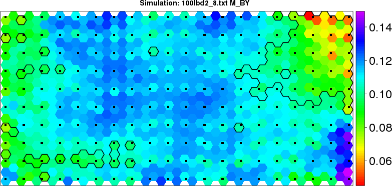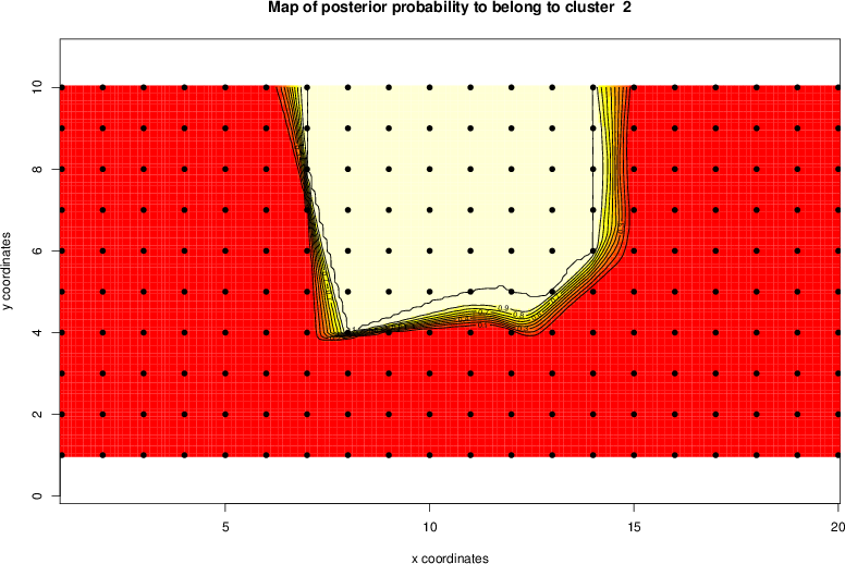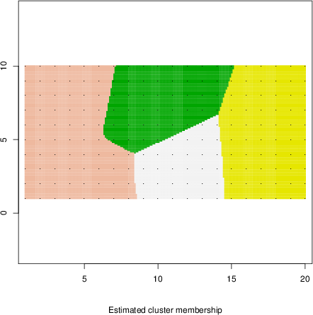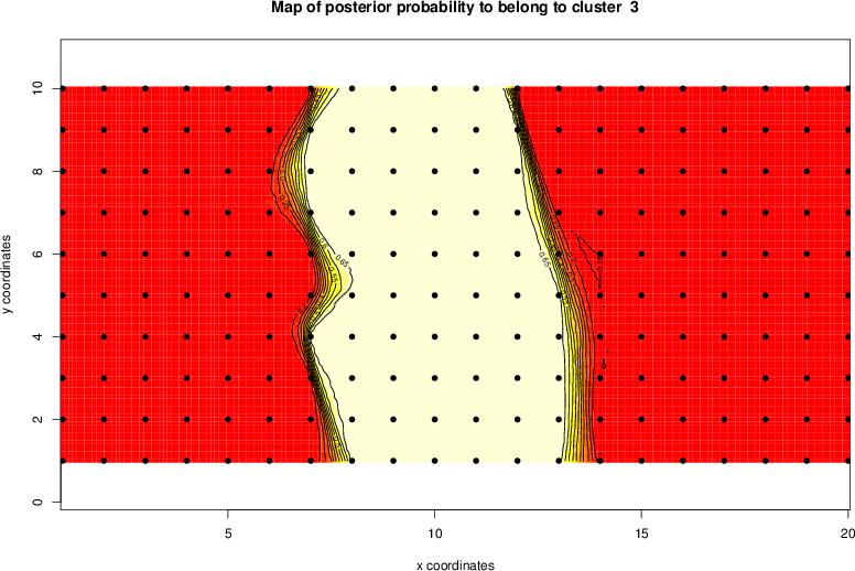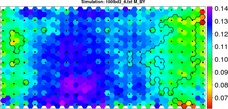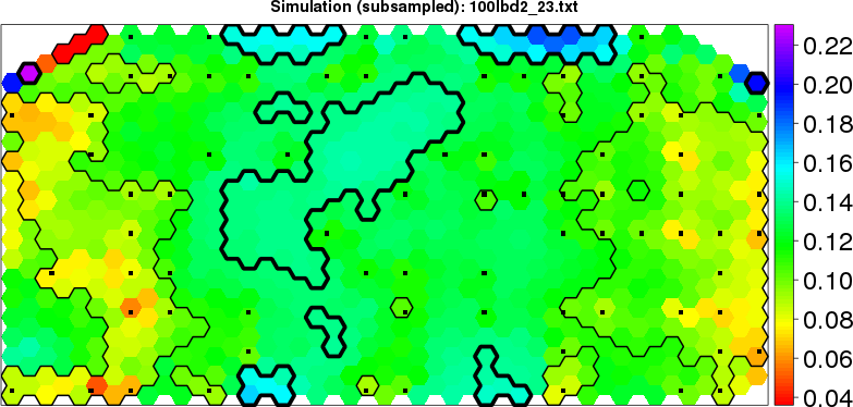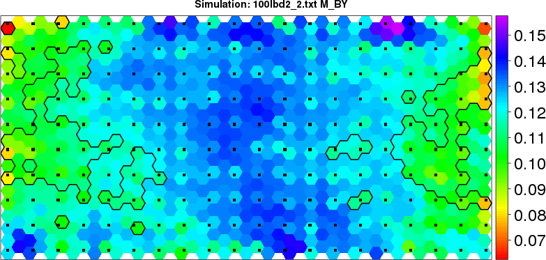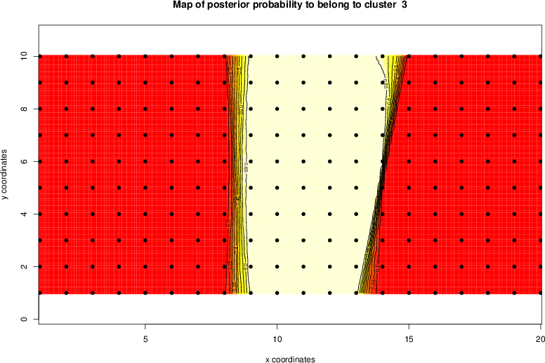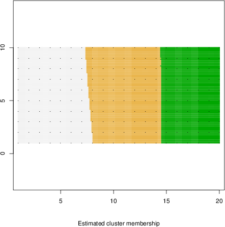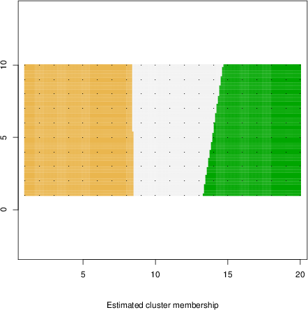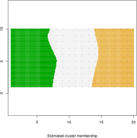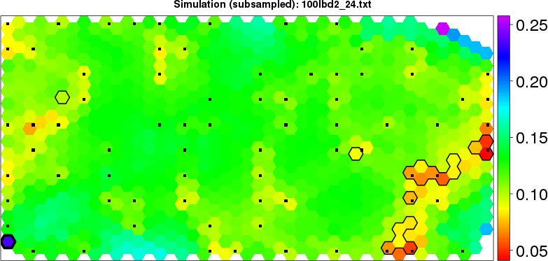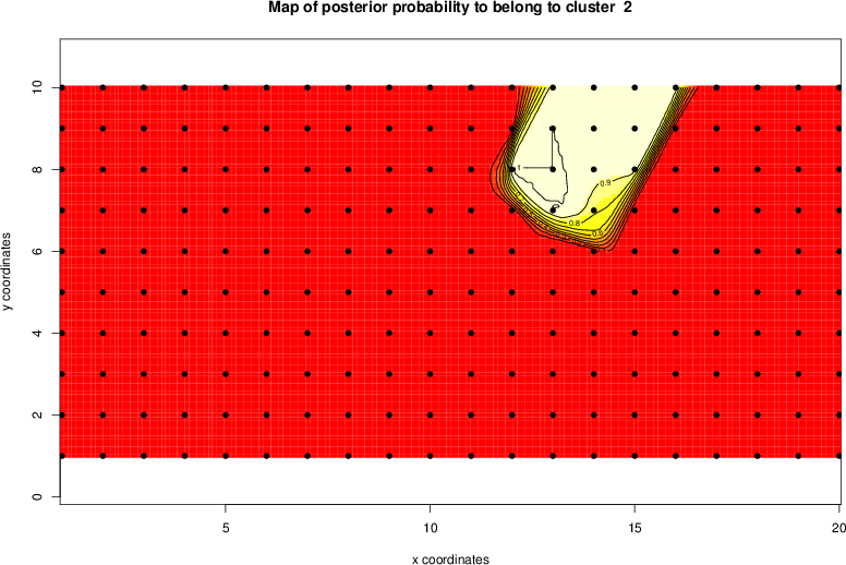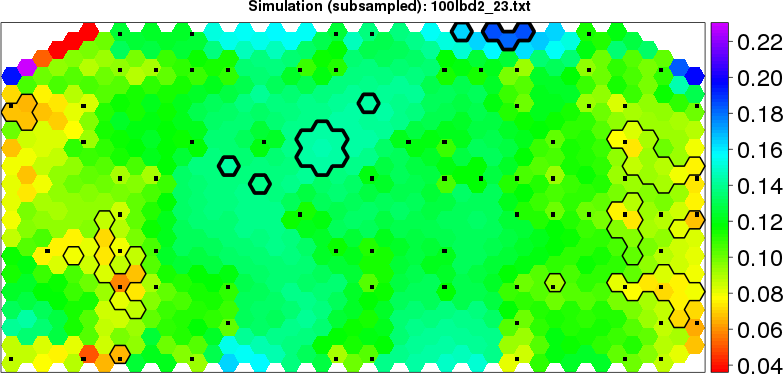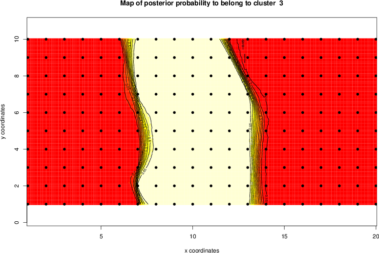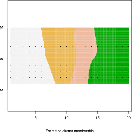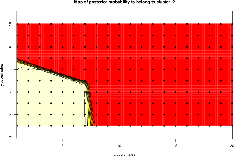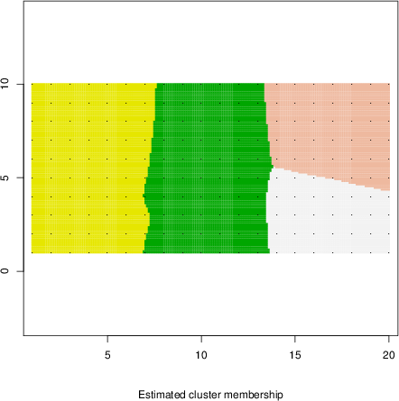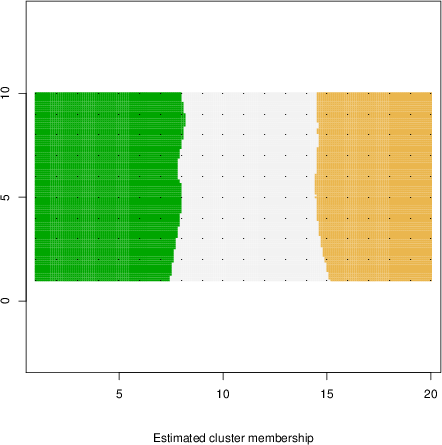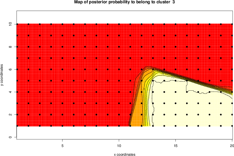 Simulated data | Geographical plots of weighted mean of all ellipse values (i.e., individual genetic distances ar of Rousset 2000) and significant barrier (cells with differentiation values higher than expected under a random distribution (no FDR applied) are materialized with thick black borders) | Idem, Benjamini-Yekutieli FDR applied | MAPI analysis (no FDR applied) with subsampled (75/200) dataset | MAPI analysis (Benjamini-Yekutieli FDR applied) with subsampled (75/200) dataset | Best probability memberships | Probability memberships for cluster 1 | Probability memberships for cluster 2 | Probability memberships for cluster 3 | Probability memberships for cluster 4 | Probability memberships for cluster 5 | Best probability memberships | Probability memberships for cluster 1 | Probability memberships for cluster 2 | Probability memberships for cluster 3 | Probability memberships for cluster 4 | Probability memberships for cluster 5 | Scatter plot showing the first two components of the DAPC (when K*>2) or density plot showing the first principal component of the DAPC (when K*=2) | Probability memberships for cluster 1 | Probability memberships for cluster 2 | Probability memberships for cluster 3 | Probability memberships for cluster 4 | Probability memberships for cluster 5 | Scatter plot showing the first two components of the DAPC (when K*>2) or density plot showing the first principal component of the DAPC (when K*=2) | Probability memberships for cluster 1 | Probability memberships for cluster 2 | Probability memberships for cluster 3 | Probability memberships for cluster 4 | Probability memberships for cluster 5 |