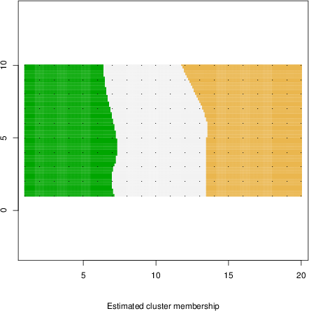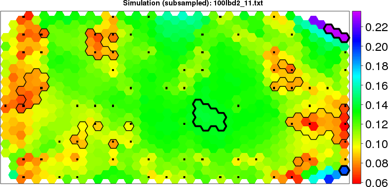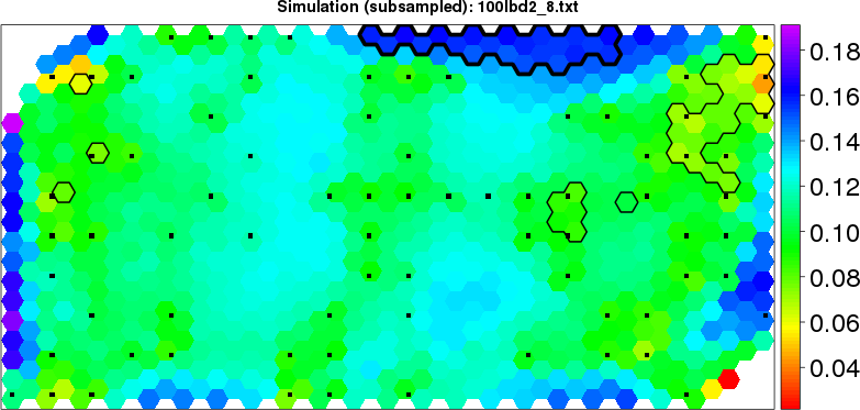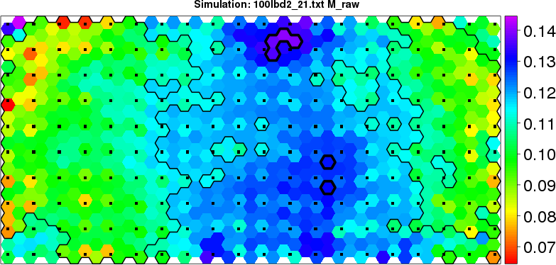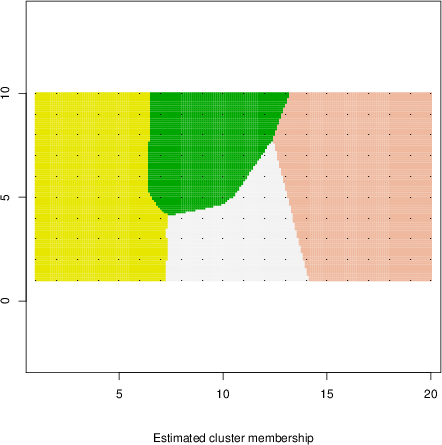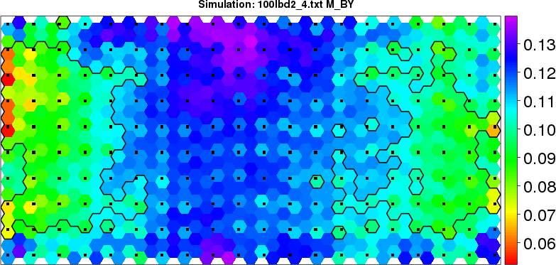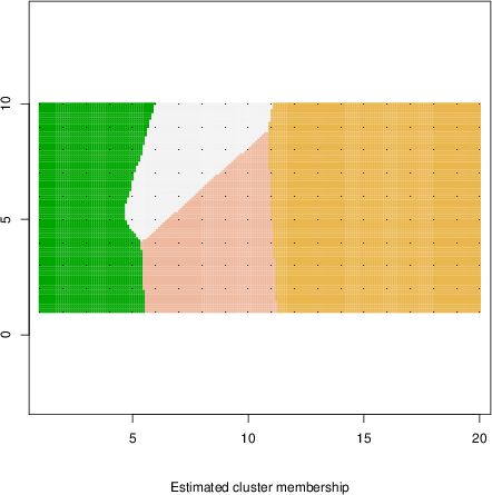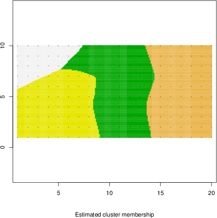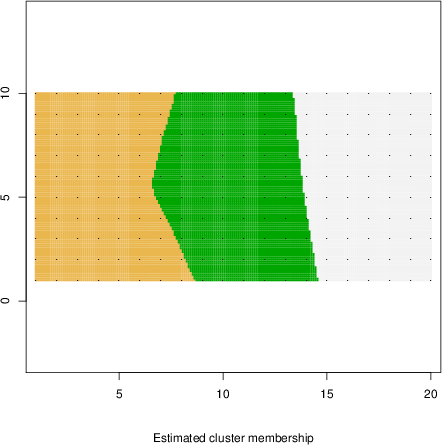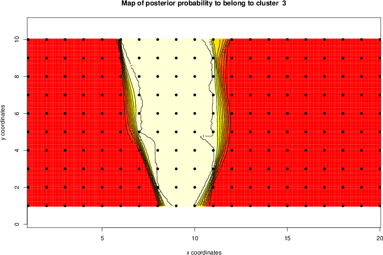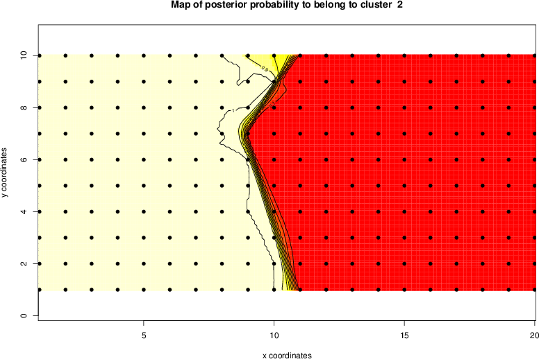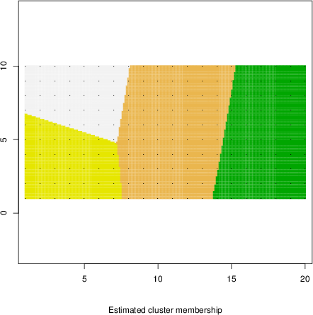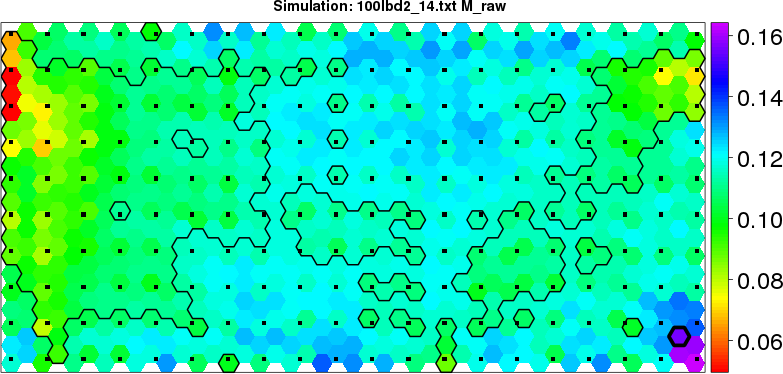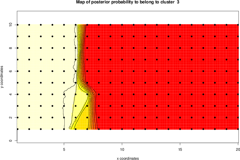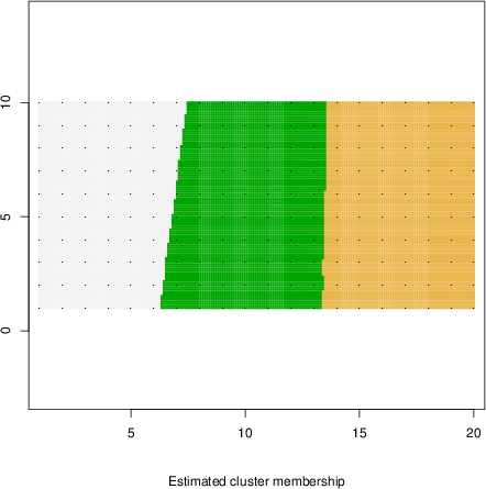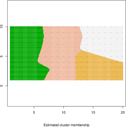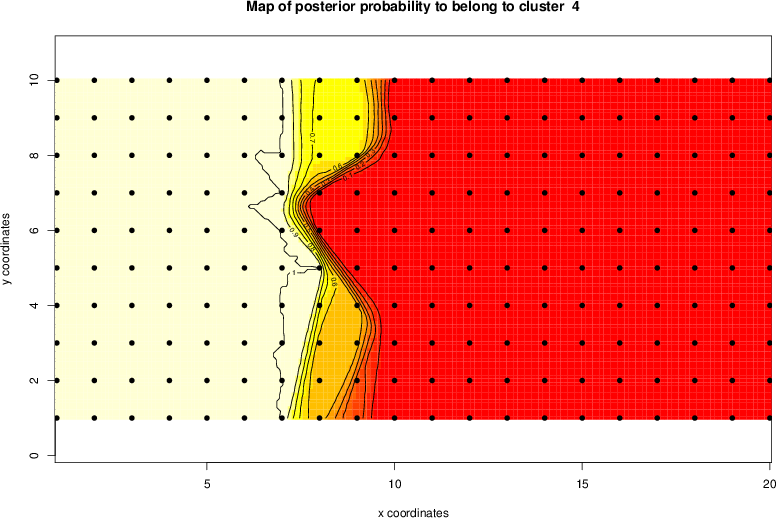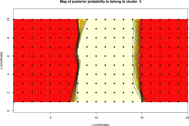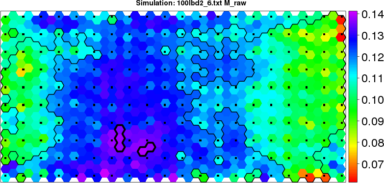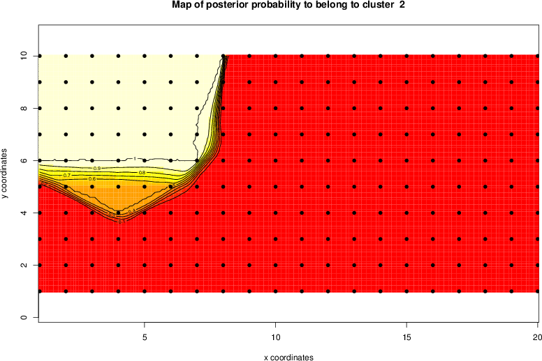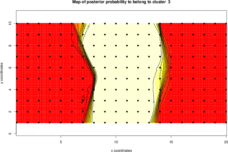Simulated data | Geographical plots of weighted mean of all ellipse values (i.e., individual genetic distances ar of Rousset 2000) and significant barrier (cells with differentiation values higher than expected under a random distribution (no FDR applied) are materialized with thick black borders) | Idem, Benjamini-Yekutieli FDR applied | MAPI analysis (no FDR applied) with subsampled (75/200) dataset | MAPI analysis (Benjamini-Yekutieli FDR applied) with subsampled (75/200) dataset | Best probability memberships | Probability memberships for cluster 1 | Probability memberships for cluster 2 | Probability memberships for cluster 3 | Probability memberships for cluster 4 | Probability memberships for cluster 5 | Best probability memberships | Probability memberships for cluster 1 | Probability memberships for cluster 2 | Probability memberships for cluster 3 | Probability memberships for cluster 4 | Probability memberships for cluster 5 | Scatter plot showing the first two components of the DAPC (when K*>2) or density plot showing the first principal component of the DAPC (when K*=2) | Probability memberships for cluster 1 | Probability memberships for cluster 2 | Probability memberships for cluster 3 | Probability memberships for cluster 4 | Probability memberships for cluster 5 | Scatter plot showing the first two components of the DAPC (when K*>2) or density plot showing the first principal component of the DAPC (when K*=2) | Probability memberships for cluster 1 | Probability memberships for cluster 2 | Probability memberships for cluster 3 | Probability memberships for cluster 4 | Probability memberships for cluster 5 |