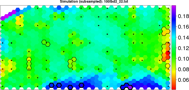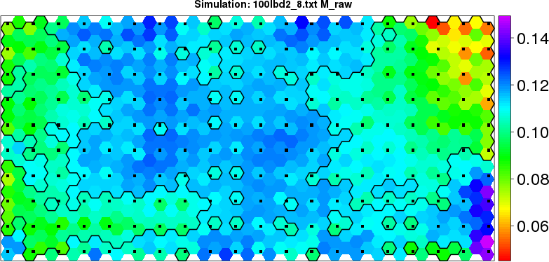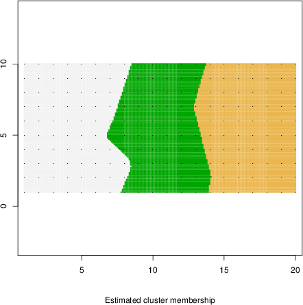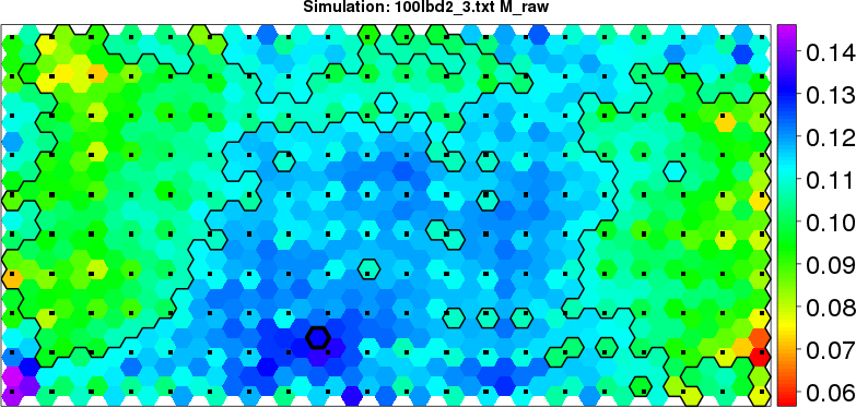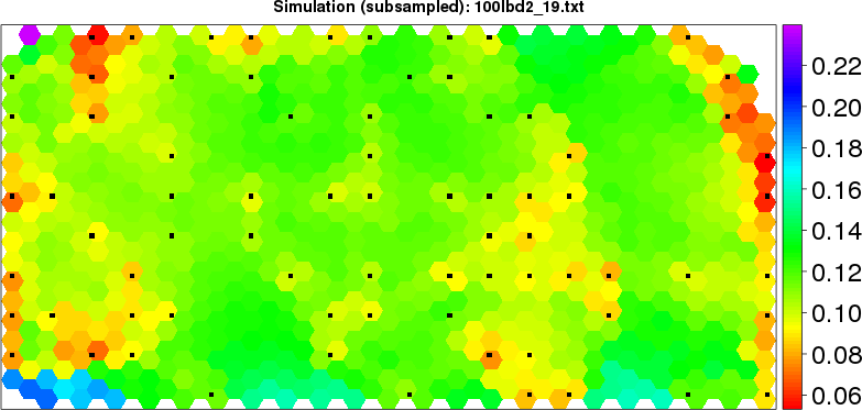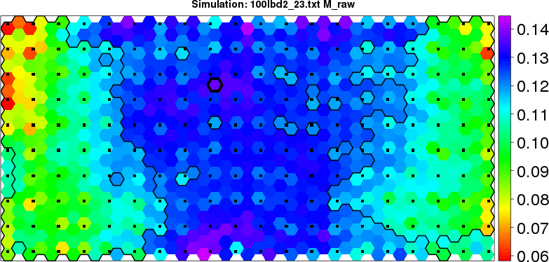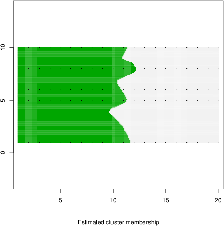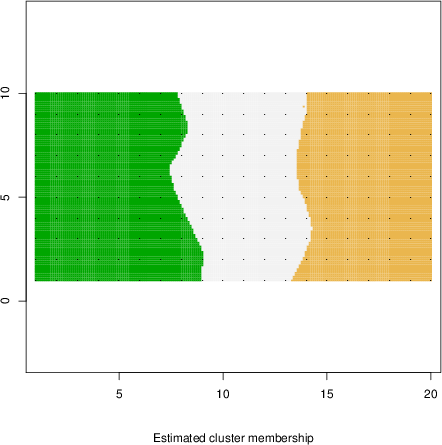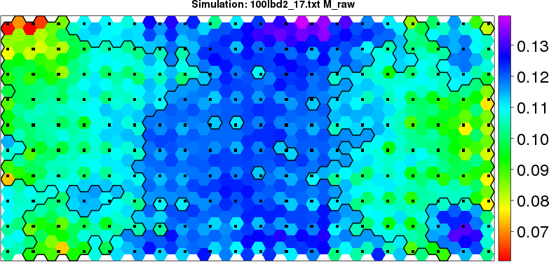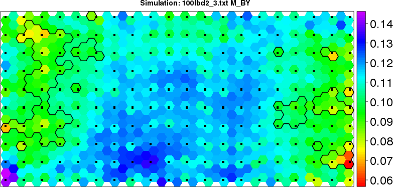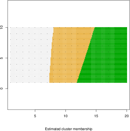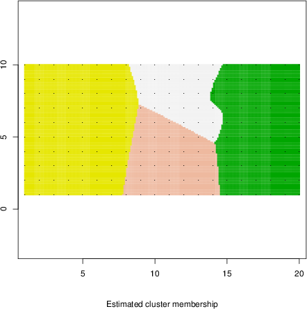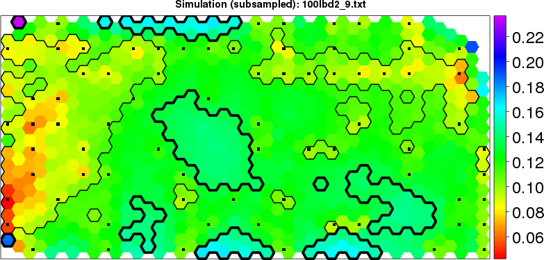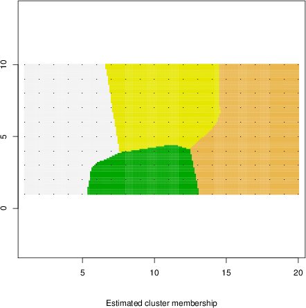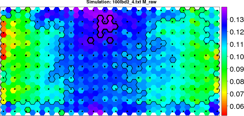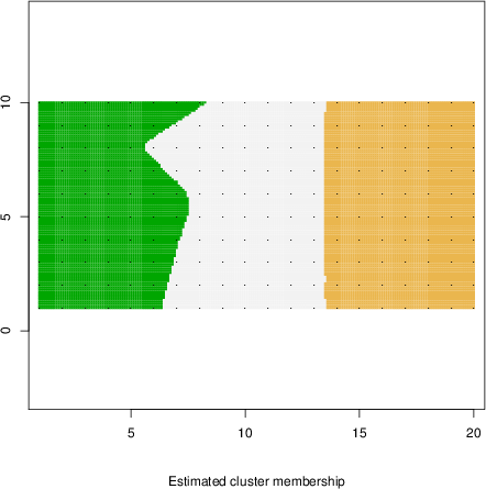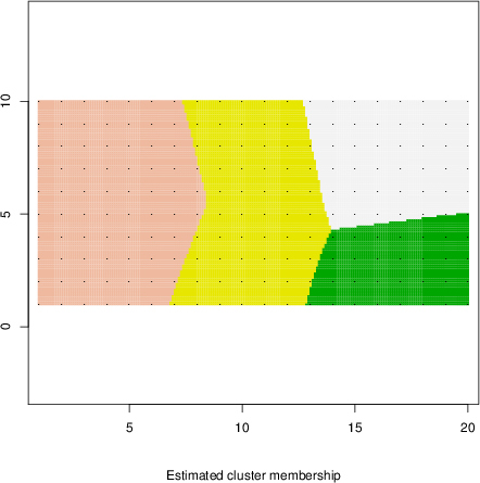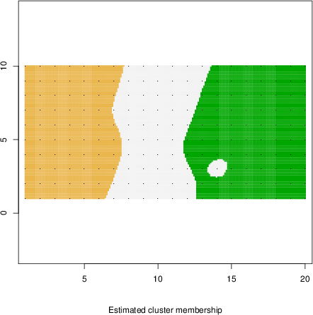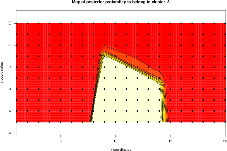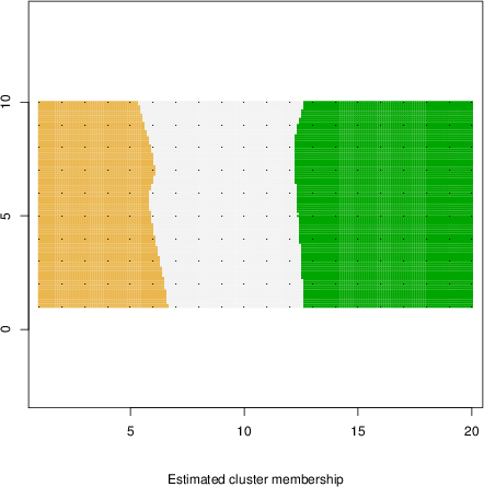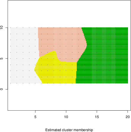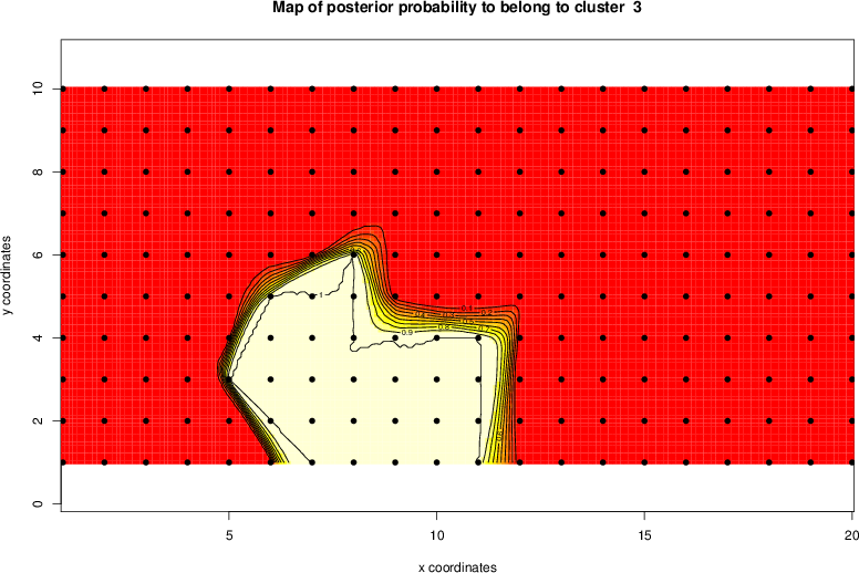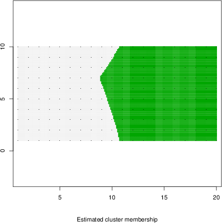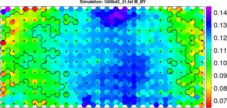 Simulated data | Geographical plots of weighted mean of all ellipse values (i.e., individual genetic distances ar of Rousset 2000) and significant barrier (cells with differentiation values higher than expected under a random distribution (no FDR applied) are materialized with thick black borders) | Idem, Benjamini-Yekutieli FDR applied | MAPI analysis (no FDR applied) with subsampled (75/200) dataset | MAPI analysis (Benjamini-Yekutieli FDR applied) with subsampled (75/200) dataset | Best probability memberships | Probability memberships for cluster 1 | Probability memberships for cluster 2 | Probability memberships for cluster 3 | Probability memberships for cluster 4 | Probability memberships for cluster 5 | Best probability memberships | Probability memberships for cluster 1 | Probability memberships for cluster 2 | Probability memberships for cluster 3 | Probability memberships for cluster 4 | Probability memberships for cluster 5 | Scatter plot showing the first two components of the DAPC (when K*>2) or density plot showing the first principal component of the DAPC (when K*=2) | Probability memberships for cluster 1 | Probability memberships for cluster 2 | Probability memberships for cluster 3 | Probability memberships for cluster 4 | Probability memberships for cluster 5 | Scatter plot showing the first two components of the DAPC (when K*>2) or density plot showing the first principal component of the DAPC (when K*=2) | Probability memberships for cluster 1 | Probability memberships for cluster 2 | Probability memberships for cluster 3 | Probability memberships for cluster 4 | Probability memberships for cluster 5 |