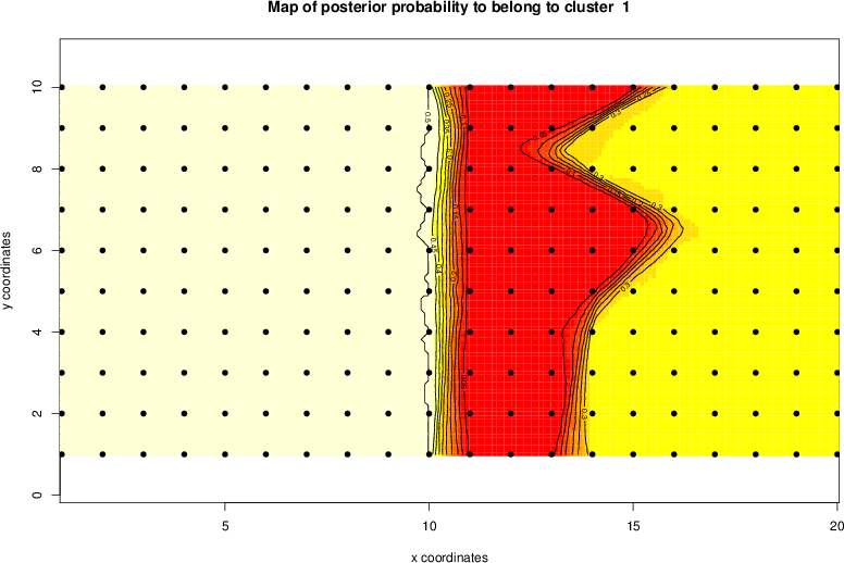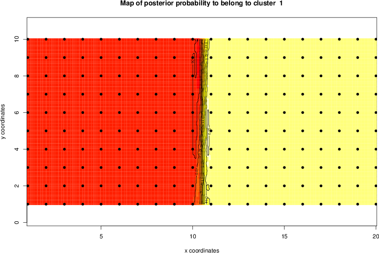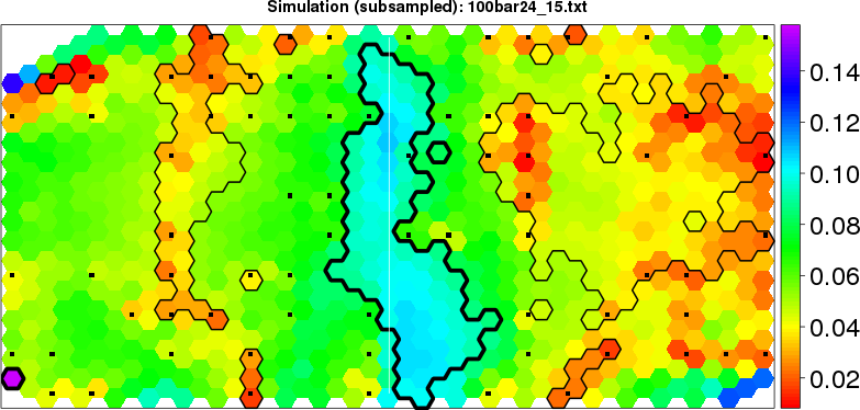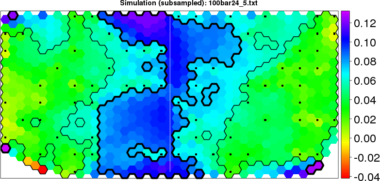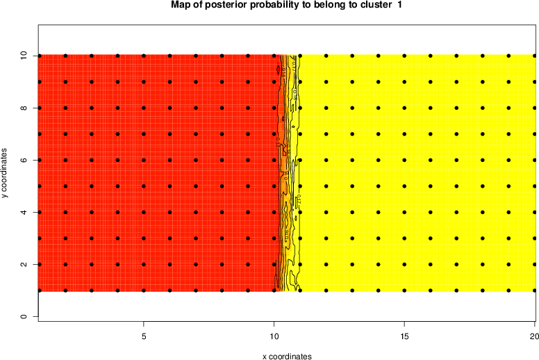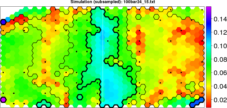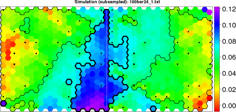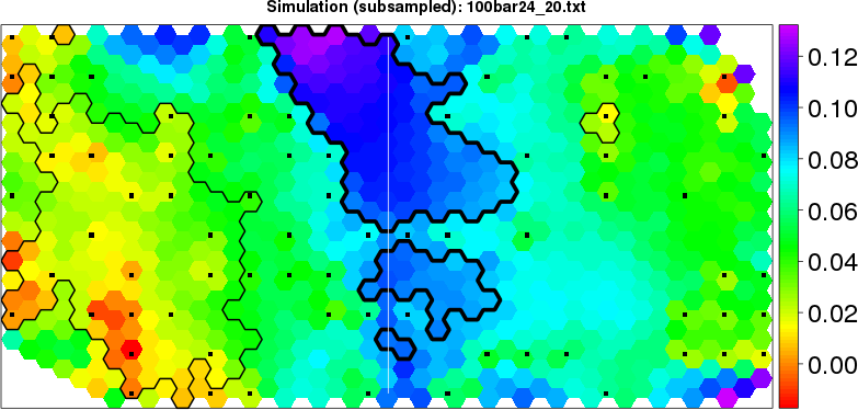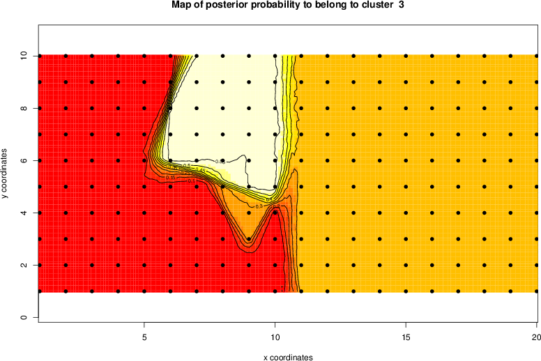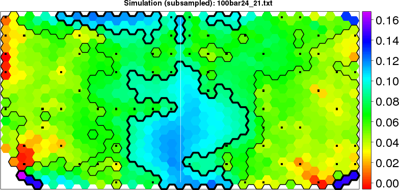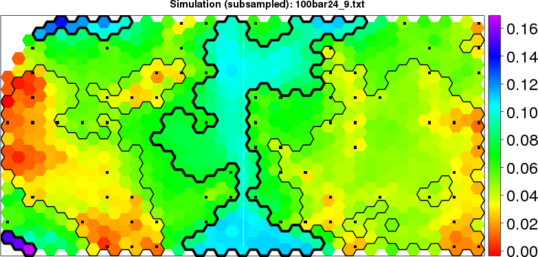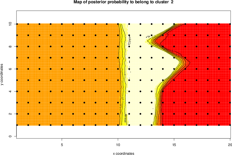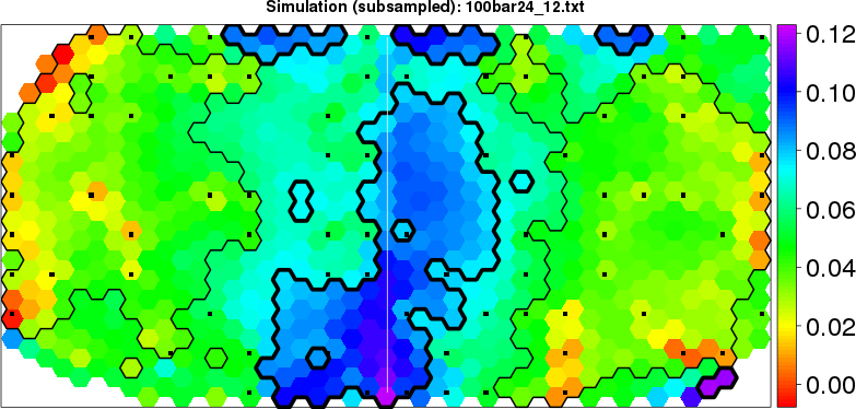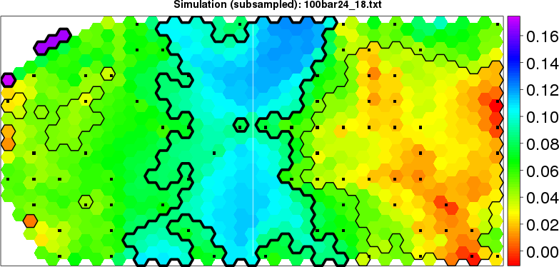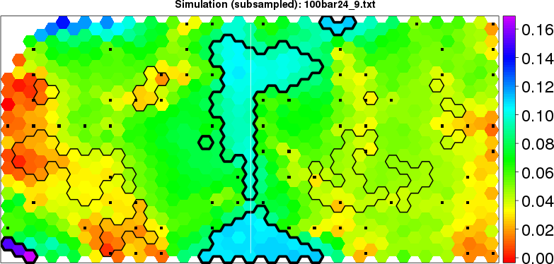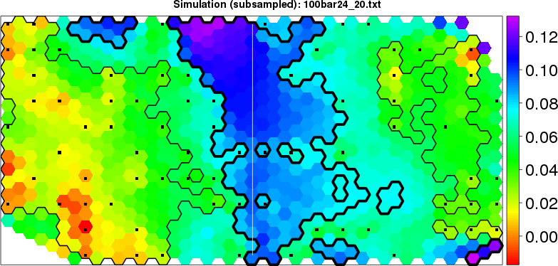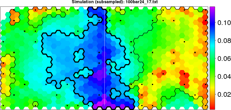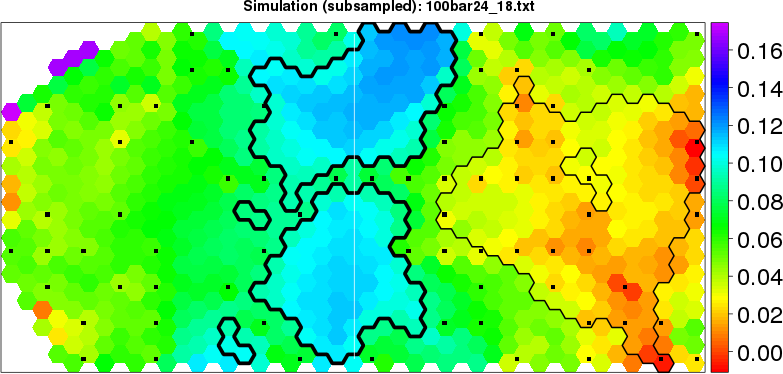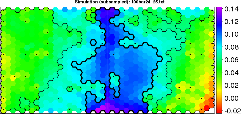 Simulated data | Geographical plots of weighted mean of all ellipse values (i.e., individual genetic distances ar of Rousset 2000) and significant barrier (cells with differentiation values higher than expected under a random distribution (no FDR applied) are materialized with thick black borders) | Idem, Benjamini-Yekutieli FDR applied | MAPI analysis (no FDR applied) with subsampled (75/200) dataset | MAPI analysis (Benjamini-Yekutieli FDR applied) with subsampled (75/200) dataset | Best probability memberships | Probability memberships for cluster 1 | Probability memberships for cluster 2 | Probability memberships for cluster 3 | Probability memberships for cluster 4 | Probability memberships for cluster 5 | Best probability memberships | Probability memberships for cluster 1 | Probability memberships for cluster 2 | Probability memberships for cluster 3 | Probability memberships for cluster 4 | Probability memberships for cluster 5 | Scatter plot showing the first two components of the DAPC (when K*>2) or density plot showing the first principal component of the DAPC (when K*=2) | Probability memberships for cluster 1 | Probability memberships for cluster 2 | Probability memberships for cluster 3 | Probability memberships for cluster 4 | Probability memberships for cluster 5 | Scatter plot showing the first two components of the DAPC (when K*>2) or density plot showing the first principal component of the DAPC (when K*=2) | Probability memberships for cluster 1 | Probability memberships for cluster 2 | Probability memberships for cluster 3 | Probability memberships for cluster 4 | Probability memberships for cluster 5 |