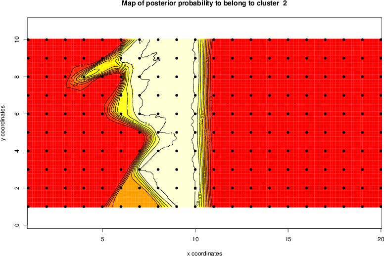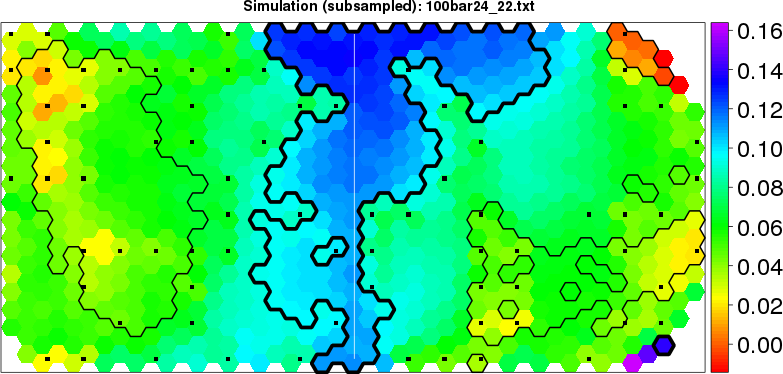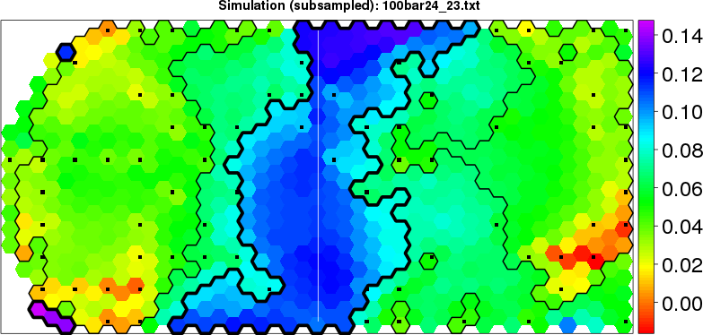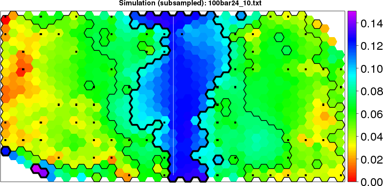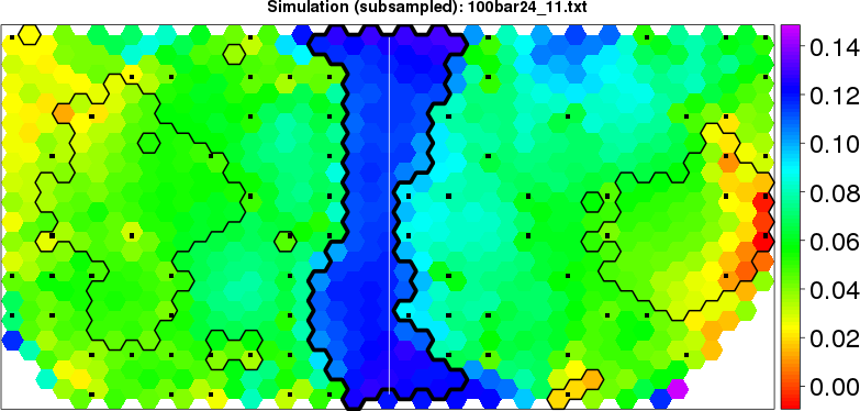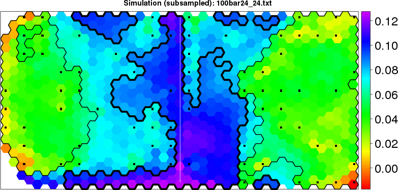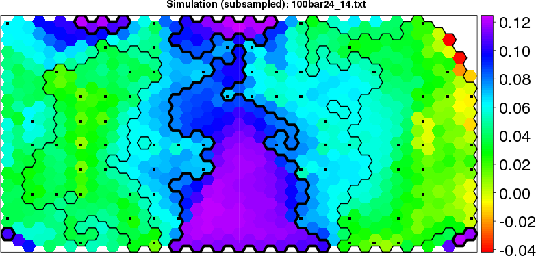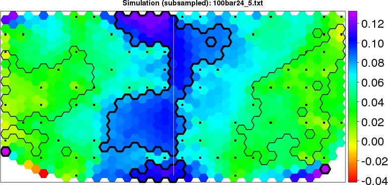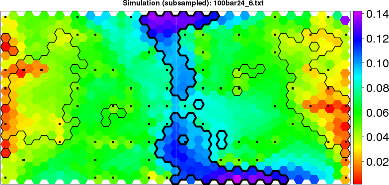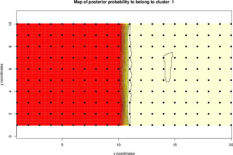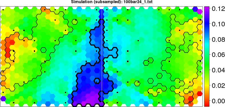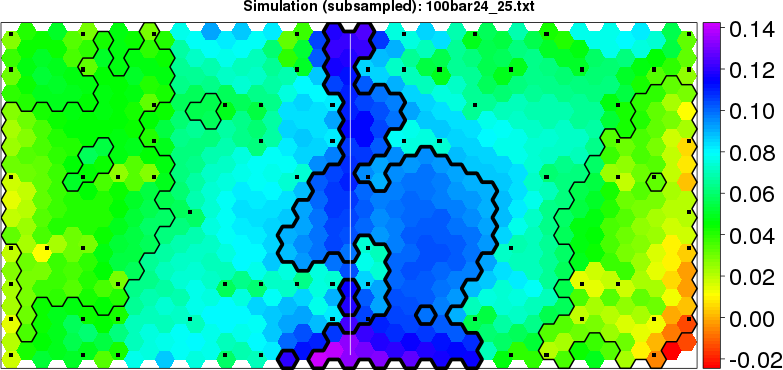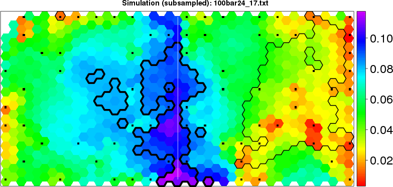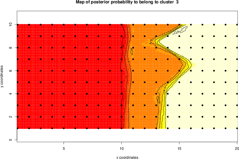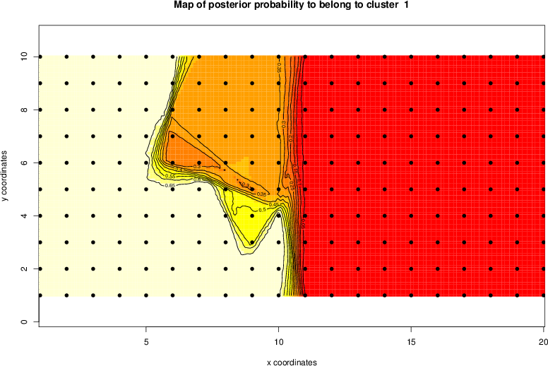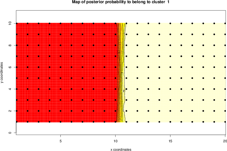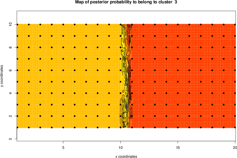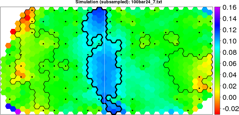 Simulated data | Geographical plots of weighted mean of all ellipse values (i.e., individual genetic distances ar of Rousset 2000) and significant barrier (cells with differentiation values higher than expected under a random distribution (no FDR applied) are materialized with thick black borders) | Idem, Benjamini-Yekutieli FDR applied | MAPI analysis (no FDR applied) with subsampled (75/200) dataset | MAPI analysis (Benjamini-Yekutieli FDR applied) with subsampled (75/200) dataset | Best probability memberships | Probability memberships for cluster 1 | Probability memberships for cluster 2 | Probability memberships for cluster 3 | Probability memberships for cluster 4 | Probability memberships for cluster 5 | Best probability memberships | Probability memberships for cluster 1 | Probability memberships for cluster 2 | Probability memberships for cluster 3 | Probability memberships for cluster 4 | Probability memberships for cluster 5 | Scatter plot showing the first two components of the DAPC (when K*>2) or density plot showing the first principal component of the DAPC (when K*=2) | Probability memberships for cluster 1 | Probability memberships for cluster 2 | Probability memberships for cluster 3 | Probability memberships for cluster 4 | Probability memberships for cluster 5 | Scatter plot showing the first two components of the DAPC (when K*>2) or density plot showing the first principal component of the DAPC (when K*=2) | Probability memberships for cluster 1 | Probability memberships for cluster 2 | Probability memberships for cluster 3 | Probability memberships for cluster 4 | Probability memberships for cluster 5 |