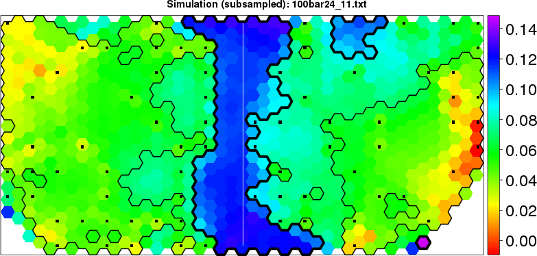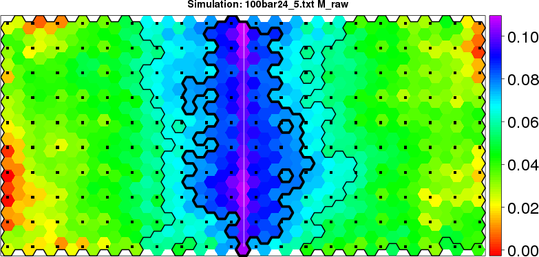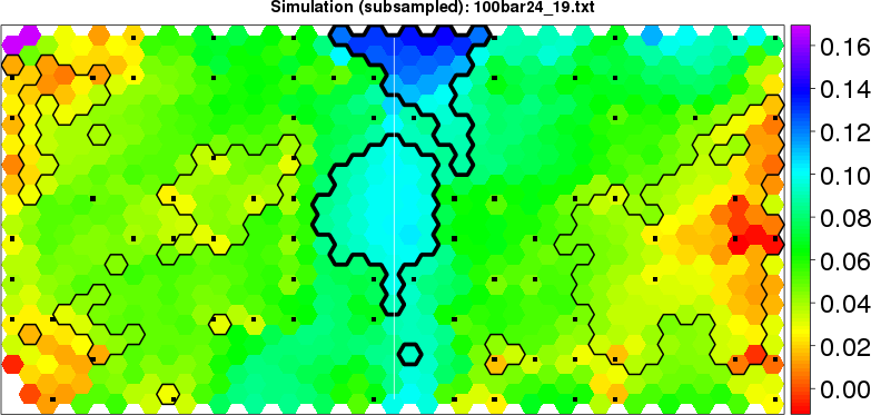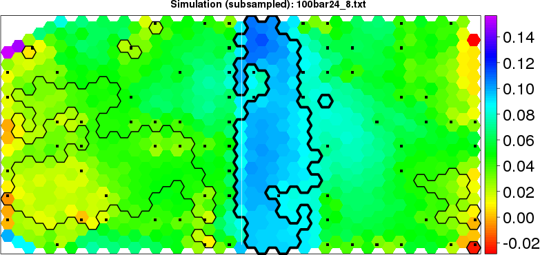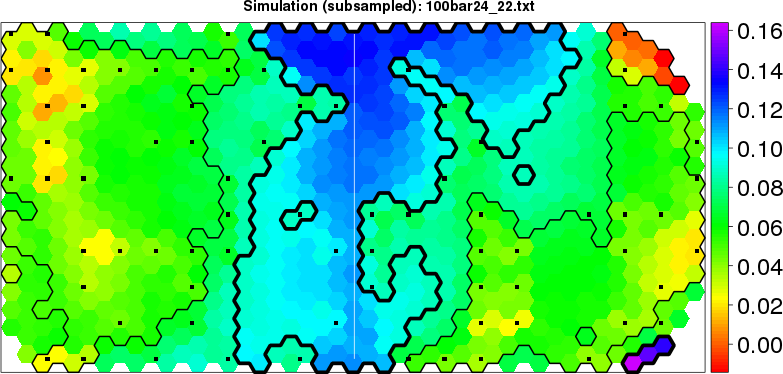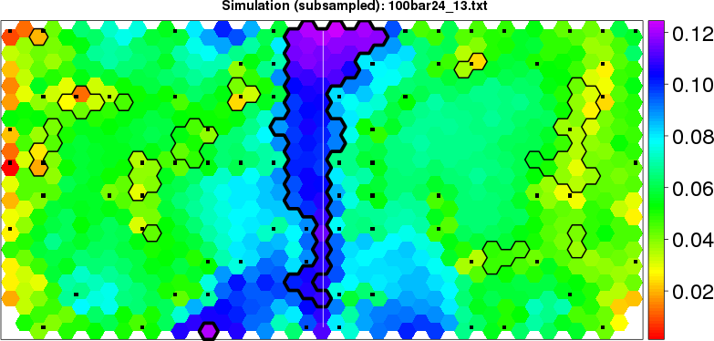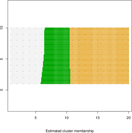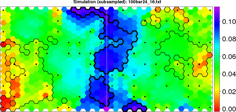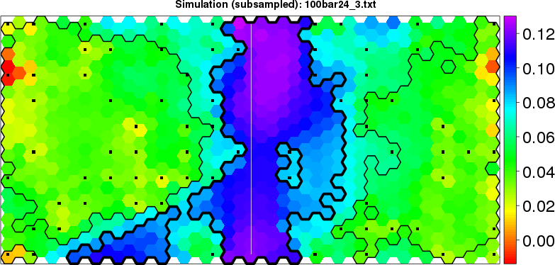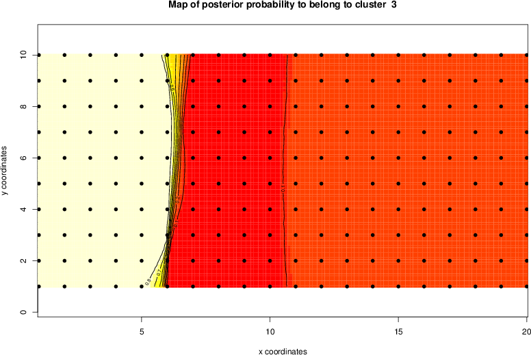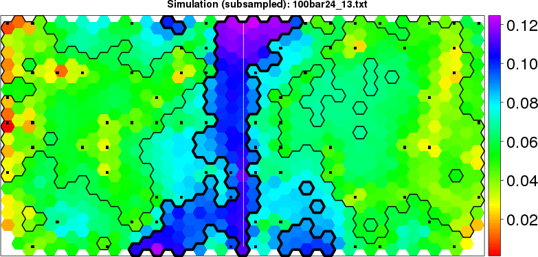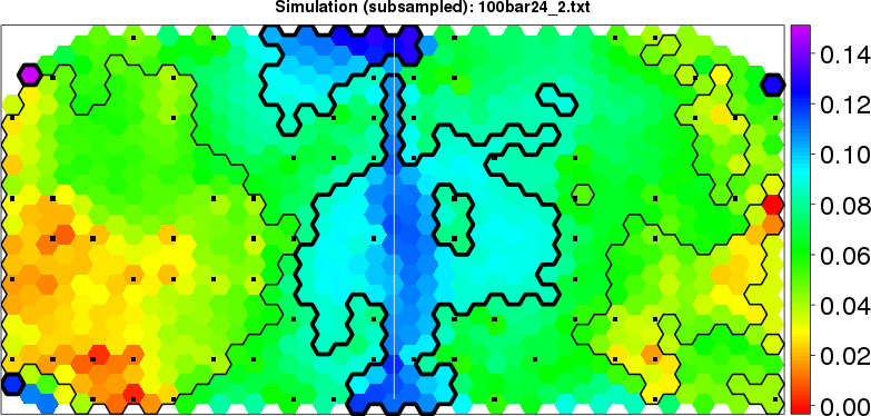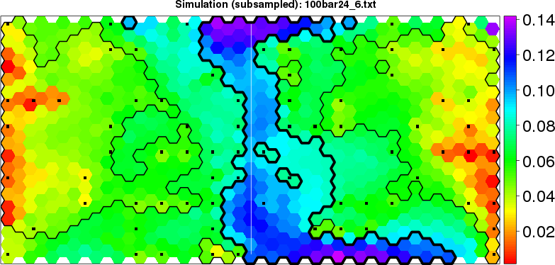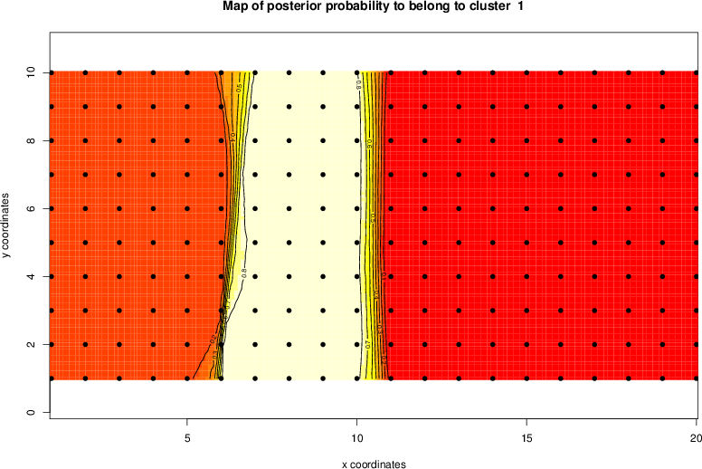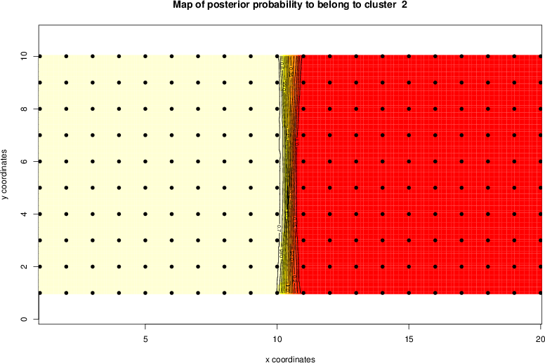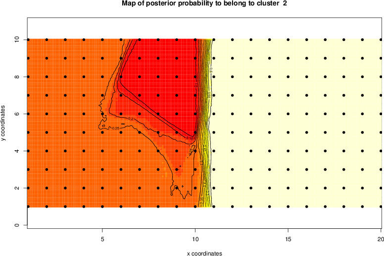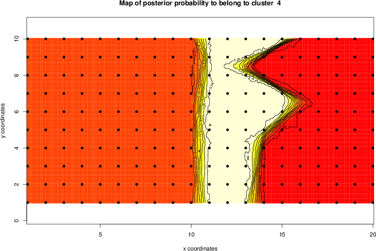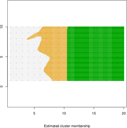 Simulated data | Geographical plots of weighted mean of all ellipse values (i.e., individual genetic distances ar of Rousset 2000) and significant barrier (cells with differentiation values higher than expected under a random distribution (no FDR applied) are materialized with thick black borders) | Idem, Benjamini-Yekutieli FDR applied | MAPI analysis (no FDR applied) with subsampled (75/200) dataset | MAPI analysis (Benjamini-Yekutieli FDR applied) with subsampled (75/200) dataset | Best probability memberships | Probability memberships for cluster 1 | Probability memberships for cluster 2 | Probability memberships for cluster 3 | Probability memberships for cluster 4 | Probability memberships for cluster 5 | Best probability memberships | Probability memberships for cluster 1 | Probability memberships for cluster 2 | Probability memberships for cluster 3 | Probability memberships for cluster 4 | Probability memberships for cluster 5 | Scatter plot showing the first two components of the DAPC (when K*>2) or density plot showing the first principal component of the DAPC (when K*=2) | Probability memberships for cluster 1 | Probability memberships for cluster 2 | Probability memberships for cluster 3 | Probability memberships for cluster 4 | Probability memberships for cluster 5 | Scatter plot showing the first two components of the DAPC (when K*>2) or density plot showing the first principal component of the DAPC (when K*=2) | Probability memberships for cluster 1 | Probability memberships for cluster 2 | Probability memberships for cluster 3 | Probability memberships for cluster 4 | Probability memberships for cluster 5 |