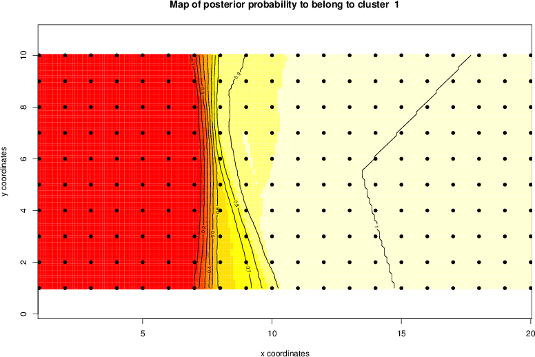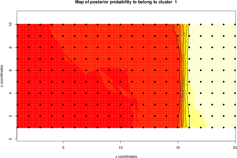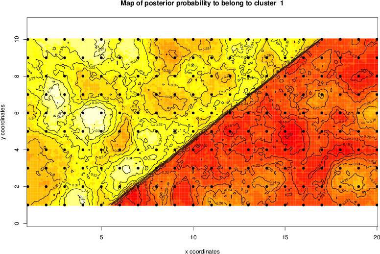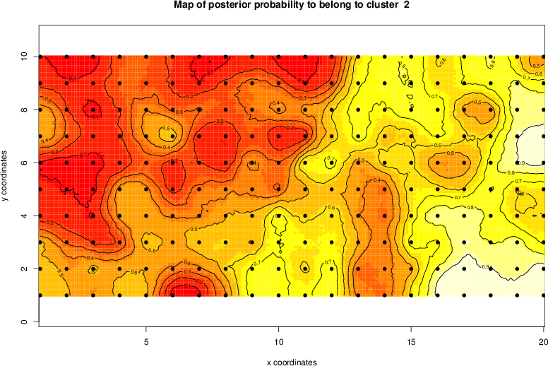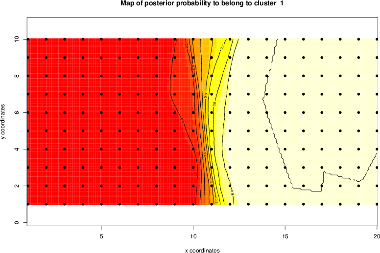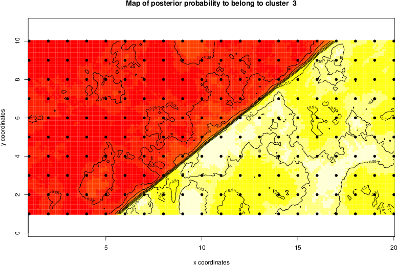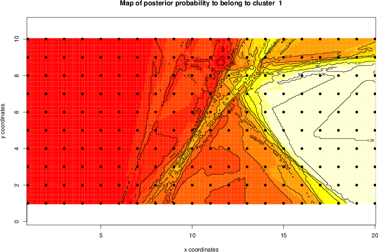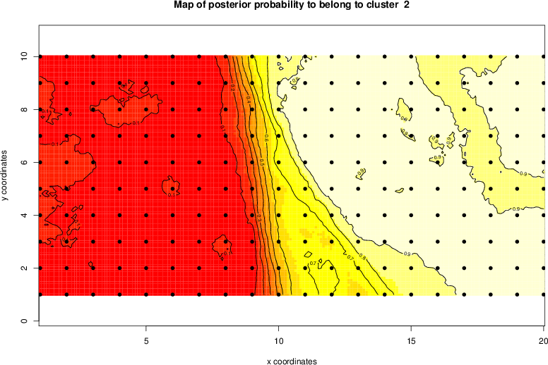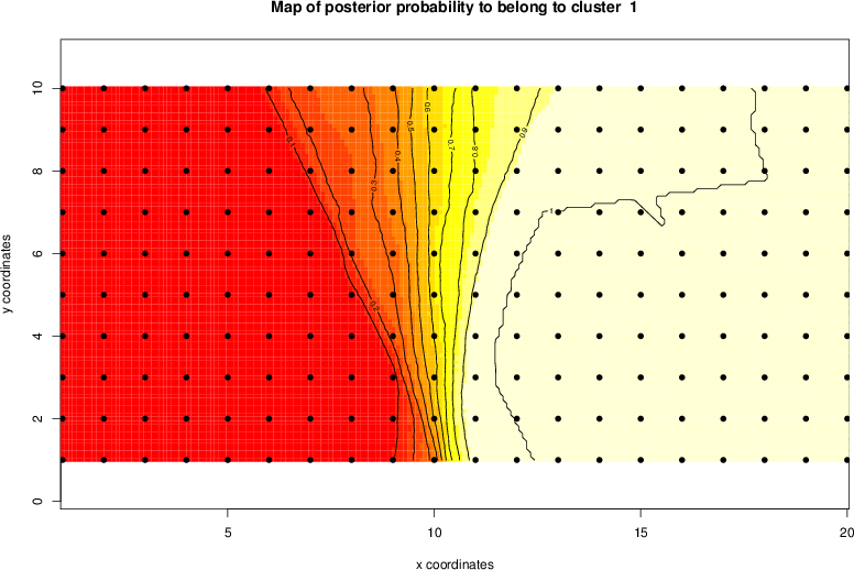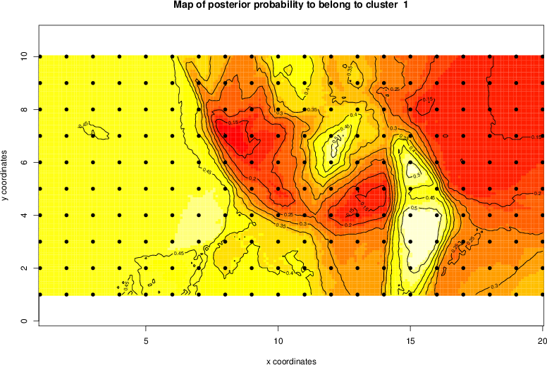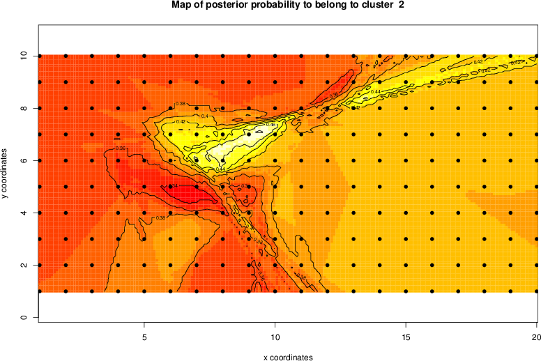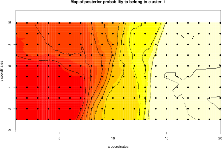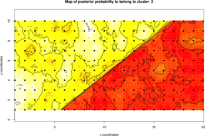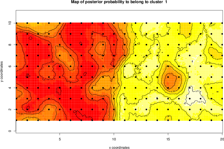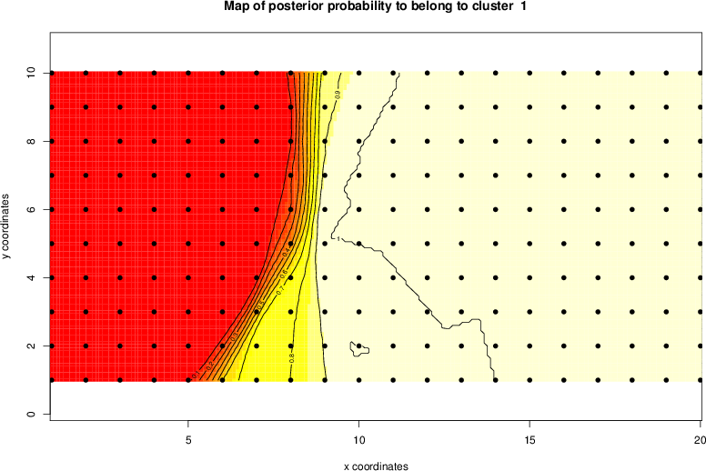 Simulated data | Geographical plots of weighted mean of all ellipse values (i.e., individual genetic distances ar of Rousset 2000) and significant barrier (cells with differentiation values higher than expected under a random distribution (no FDR applied) are materialized with thick black borders) | Idem, Benjamini-Yekutieli FDR applied | MAPI analysis (no FDR applied) with subsampled (75/200) dataset | MAPI analysis (Benjamini-Yekutieli FDR applied) with subsampled (75/200) dataset | Best probability memberships | Probability memberships for cluster 1 | Probability memberships for cluster 2 | Probability memberships for cluster 3 | Probability memberships for cluster 4 | Probability memberships for cluster 5 | Best probability memberships | Probability memberships for cluster 1 | Probability memberships for cluster 2 | Probability memberships for cluster 3 | Probability memberships for cluster 4 | Probability memberships for cluster 5 | Scatter plot showing the first two components of the DAPC (when K*>2) or density plot showing the first principal component of the DAPC (when K*=2) | Probability memberships for cluster 1 | Probability memberships for cluster 2 | Probability memberships for cluster 3 | Probability memberships for cluster 4 | Probability memberships for cluster 5 | Scatter plot showing the first two components of the DAPC (when K*>2) or density plot showing the first principal component of the DAPC (when K*=2) | Probability memberships for cluster 1 | Probability memberships for cluster 2 | Probability memberships for cluster 3 | Probability memberships for cluster 4 | Probability memberships for cluster 5 |