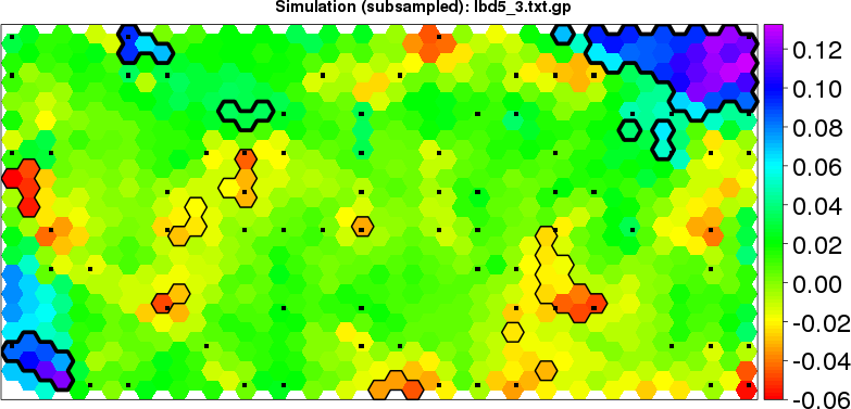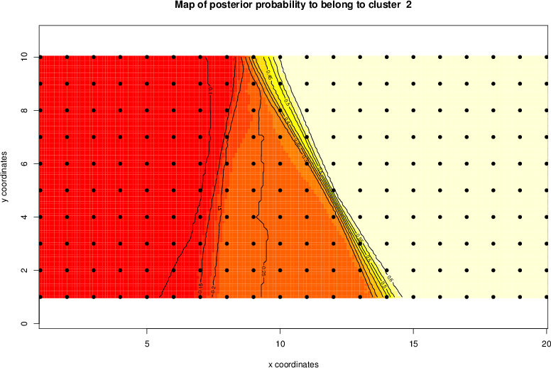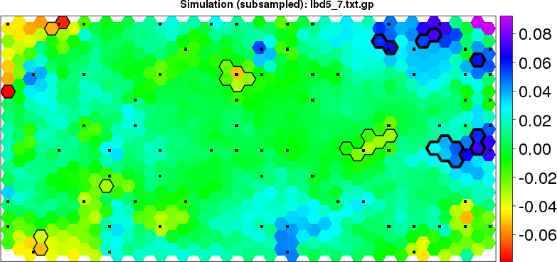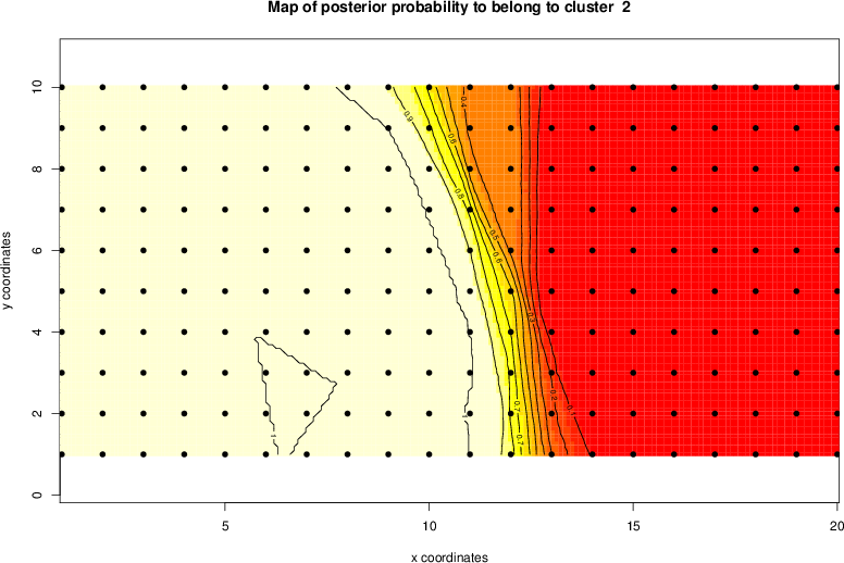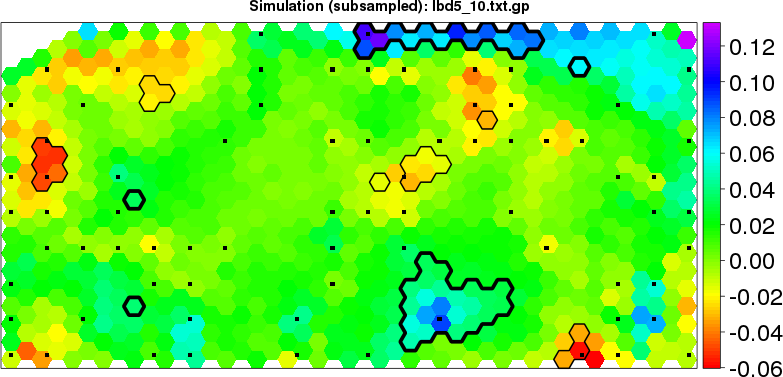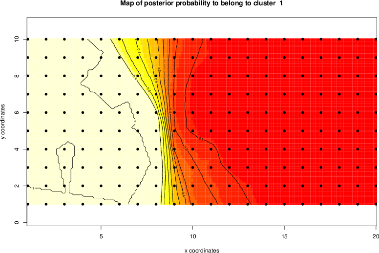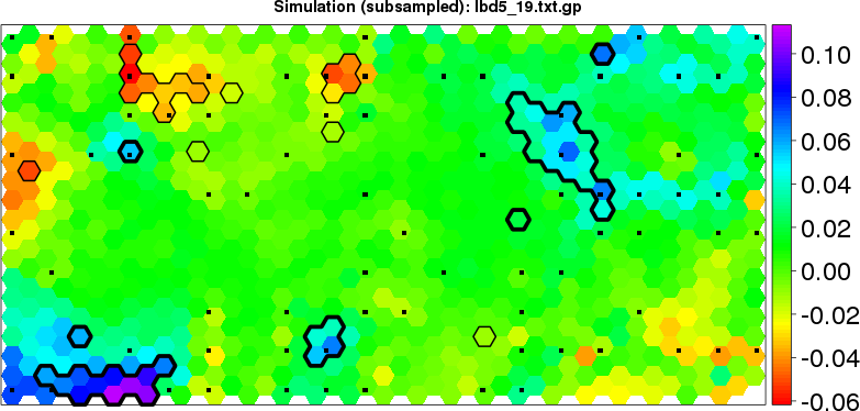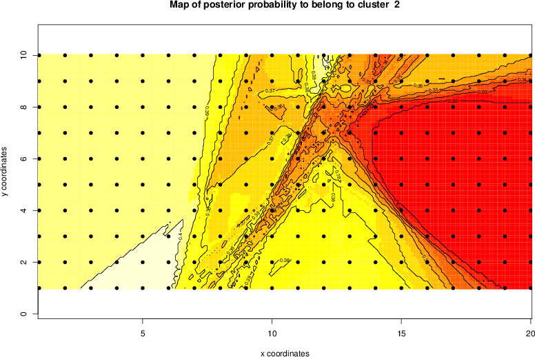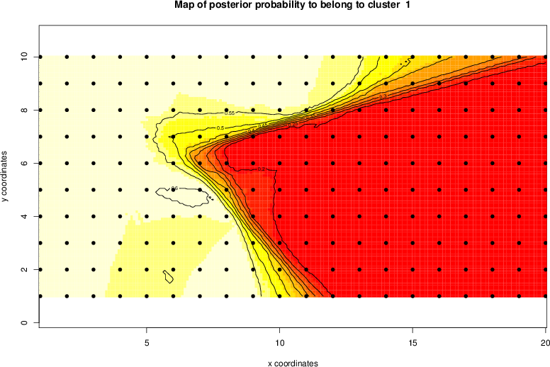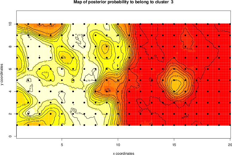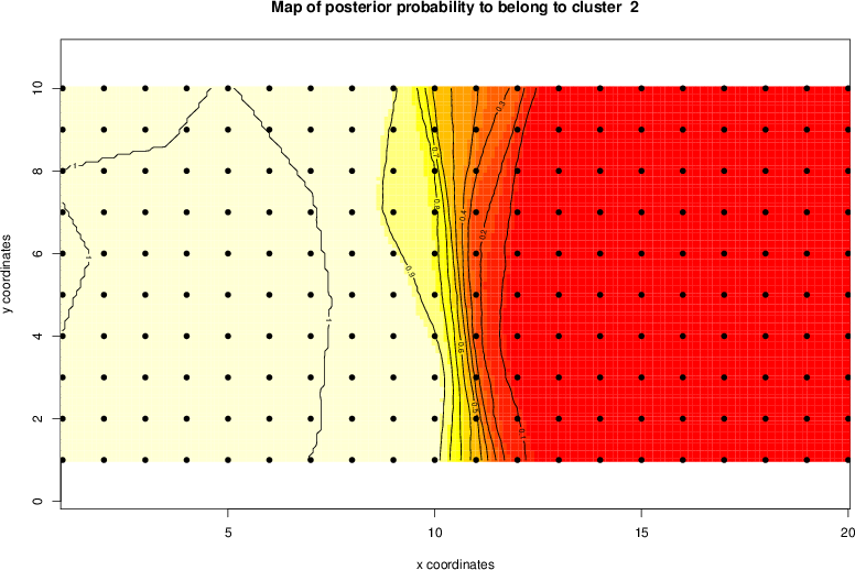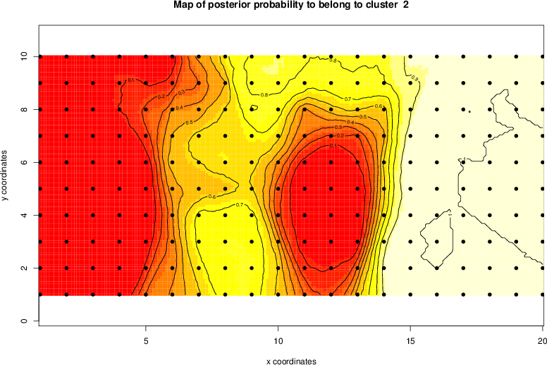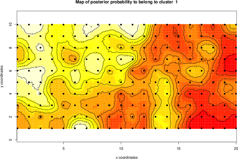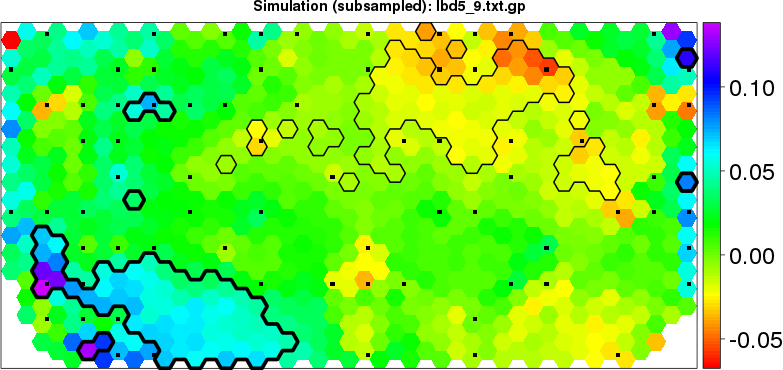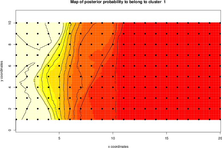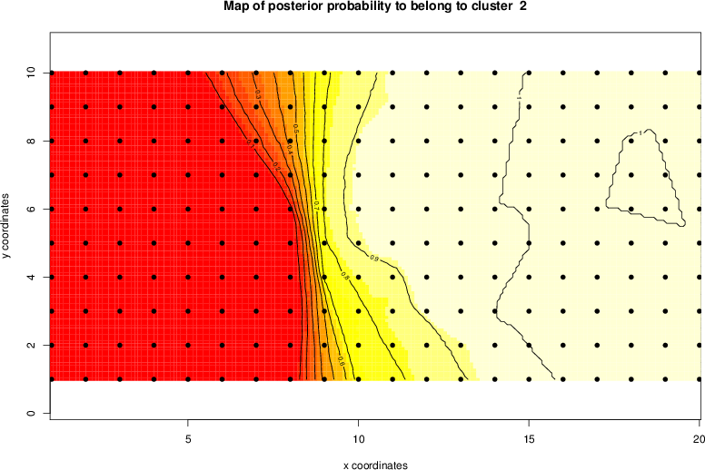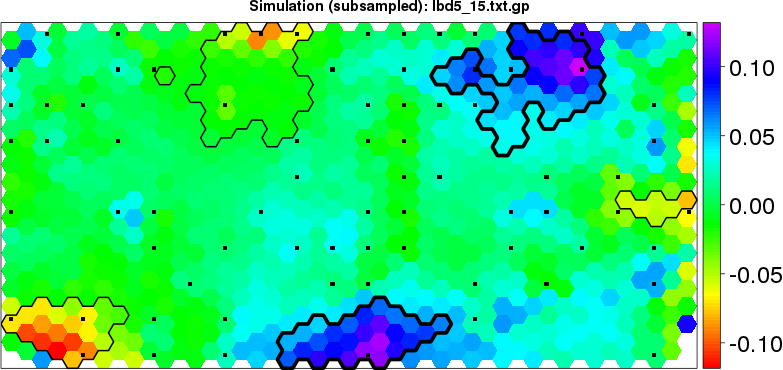 Simulated data | Geographical plots of weighted mean of all ellipse values (i.e., individual genetic distances ar of Rousset 2000) and significant barrier (cells with differentiation values higher than expected under a random distribution (no FDR applied) are materialized with thick black borders) | Idem, Benjamini-Yekutieli FDR applied | MAPI analysis (no FDR applied) with subsampled (75/200) dataset | MAPI analysis (Benjamini-Yekutieli FDR applied) with subsampled (75/200) dataset | Best probability memberships | Probability memberships for cluster 1 | Probability memberships for cluster 2 | Probability memberships for cluster 3 | Probability memberships for cluster 4 | Probability memberships for cluster 5 | Best probability memberships | Probability memberships for cluster 1 | Probability memberships for cluster 2 | Probability memberships for cluster 3 | Probability memberships for cluster 4 | Probability memberships for cluster 5 | Scatter plot showing the first two components of the DAPC (when K*>2) or density plot showing the first principal component of the DAPC (when K*=2) | Probability memberships for cluster 1 | Probability memberships for cluster 2 | Probability memberships for cluster 3 | Probability memberships for cluster 4 | Probability memberships for cluster 5 | Scatter plot showing the first two components of the DAPC (when K*>2) or density plot showing the first principal component of the DAPC (when K*=2) | Probability memberships for cluster 1 | Probability memberships for cluster 2 | Probability memberships for cluster 3 | Probability memberships for cluster 4 | Probability memberships for cluster 5 |