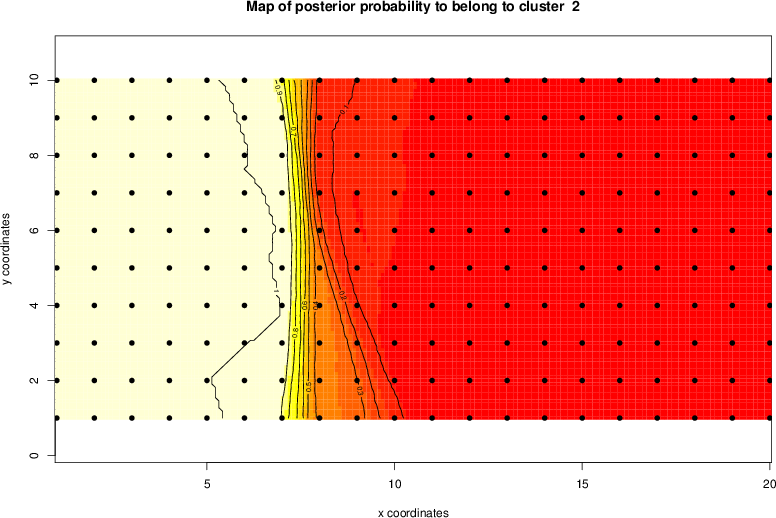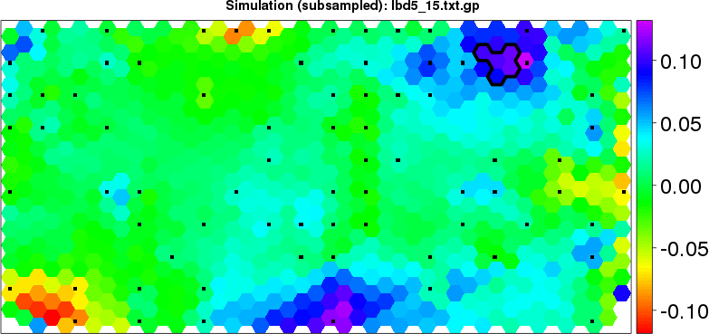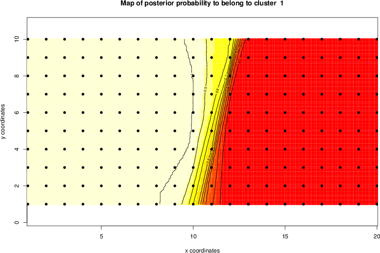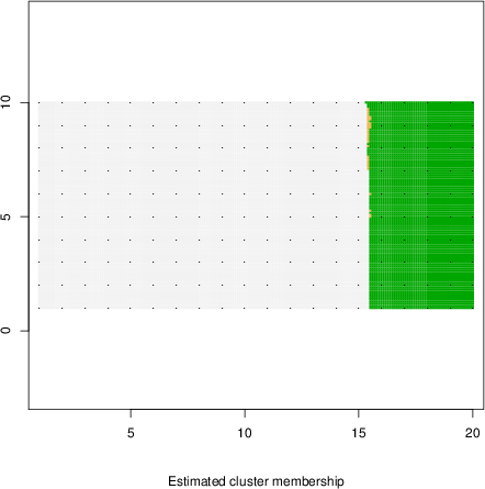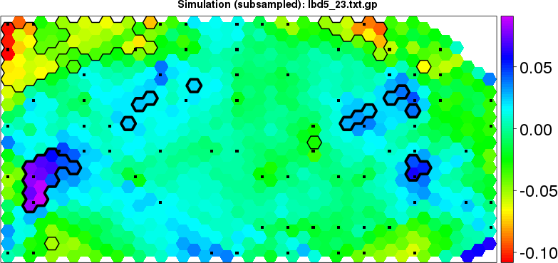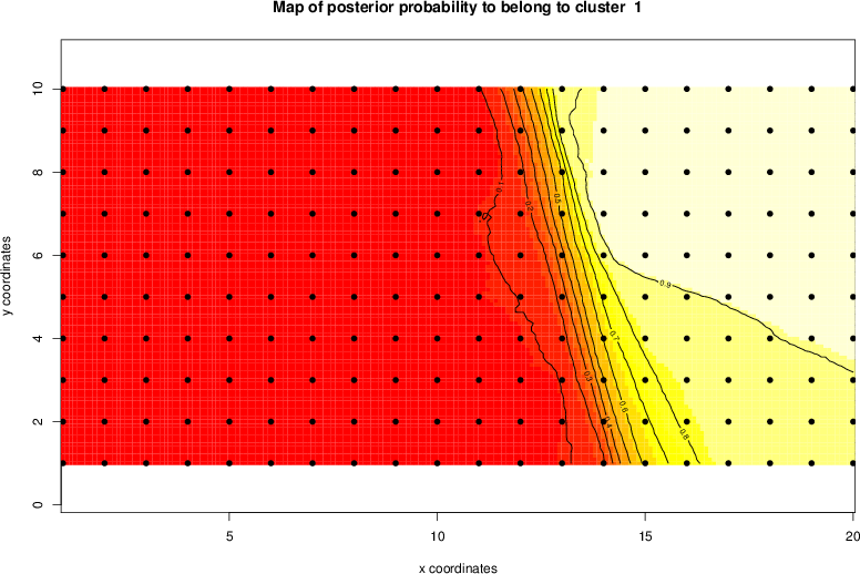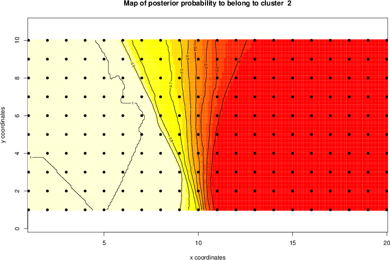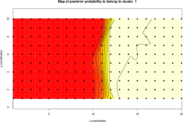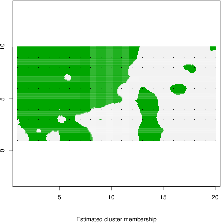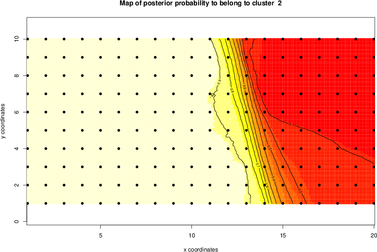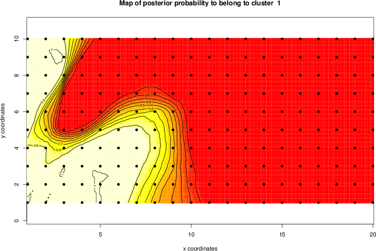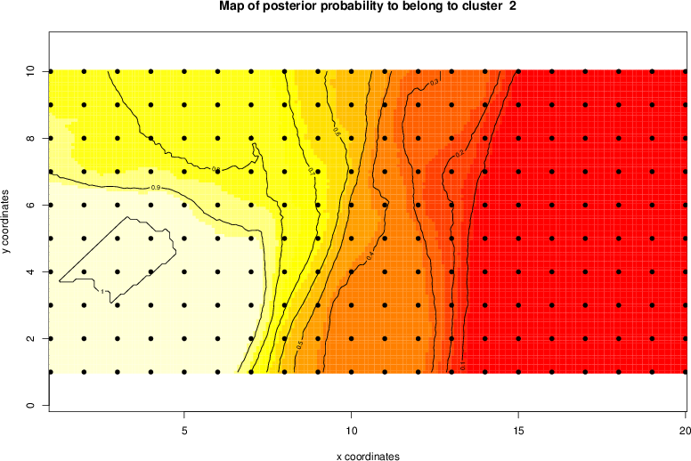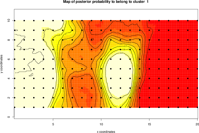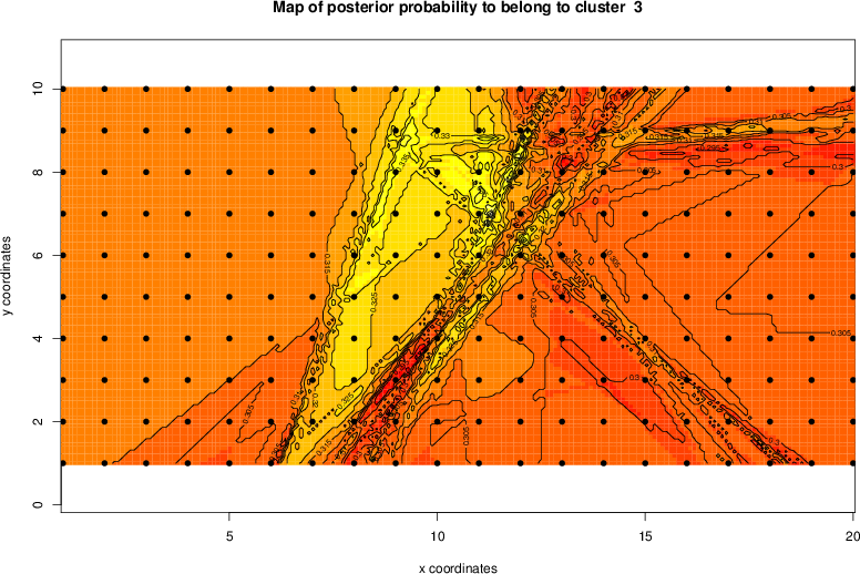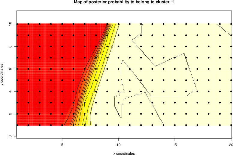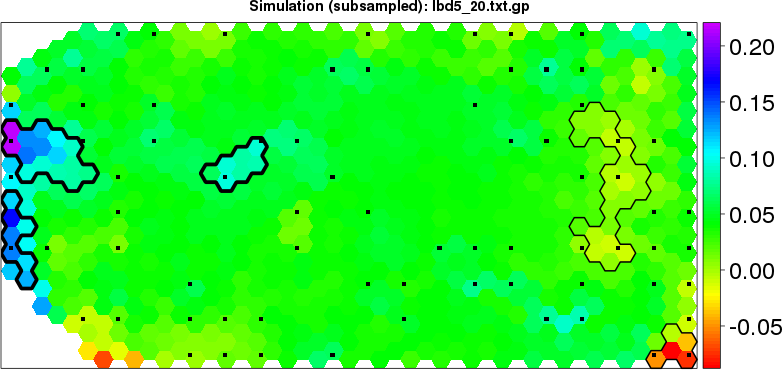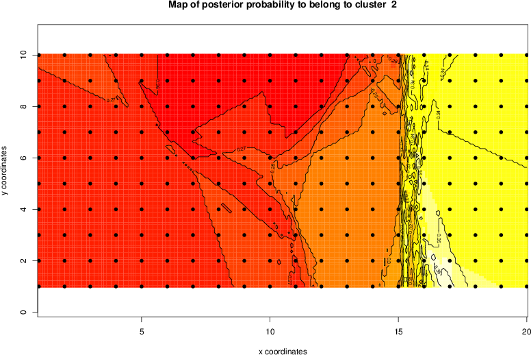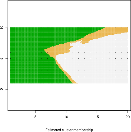 Simulated data | Geographical plots of weighted mean of all ellipse values (i.e., individual genetic distances ar of Rousset 2000) and significant barrier (cells with differentiation values higher than expected under a random distribution (no FDR applied) are materialized with thick black borders) | Idem, Benjamini-Yekutieli FDR applied | MAPI analysis (no FDR applied) with subsampled (75/200) dataset | MAPI analysis (Benjamini-Yekutieli FDR applied) with subsampled (75/200) dataset | Best probability memberships | Probability memberships for cluster 1 | Probability memberships for cluster 2 | Probability memberships for cluster 3 | Probability memberships for cluster 4 | Probability memberships for cluster 5 | Best probability memberships | Probability memberships for cluster 1 | Probability memberships for cluster 2 | Probability memberships for cluster 3 | Probability memberships for cluster 4 | Probability memberships for cluster 5 | Scatter plot showing the first two components of the DAPC (when K*>2) or density plot showing the first principal component of the DAPC (when K*=2) | Probability memberships for cluster 1 | Probability memberships for cluster 2 | Probability memberships for cluster 3 | Probability memberships for cluster 4 | Probability memberships for cluster 5 | Scatter plot showing the first two components of the DAPC (when K*>2) or density plot showing the first principal component of the DAPC (when K*=2) | Probability memberships for cluster 1 | Probability memberships for cluster 2 | Probability memberships for cluster 3 | Probability memberships for cluster 4 | Probability memberships for cluster 5 |