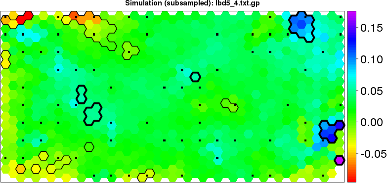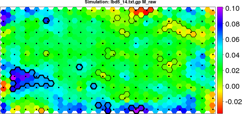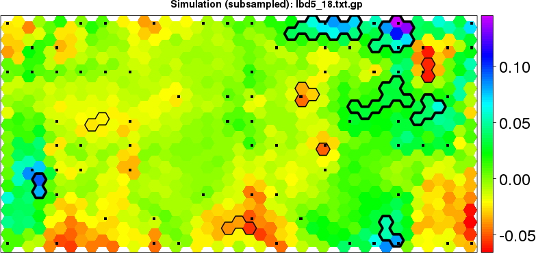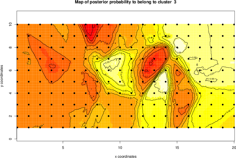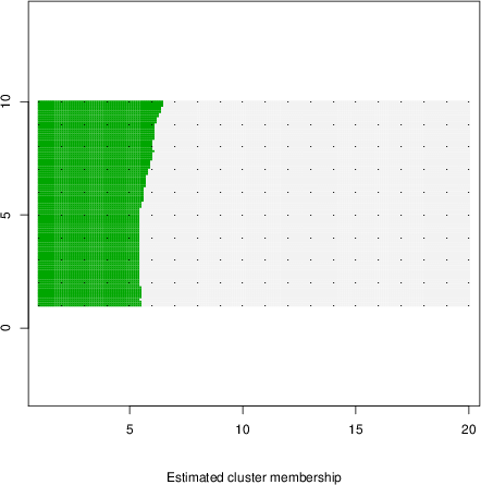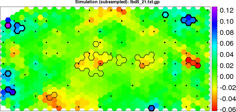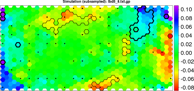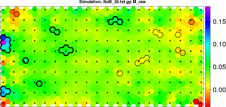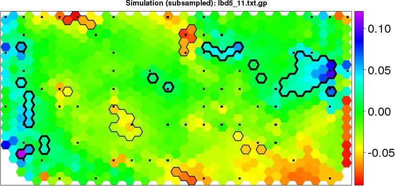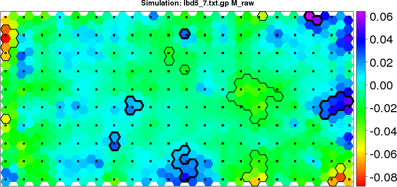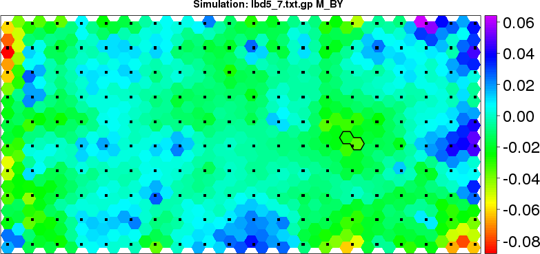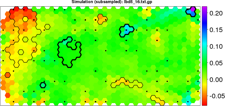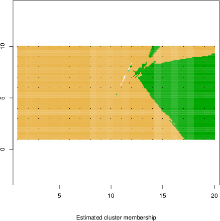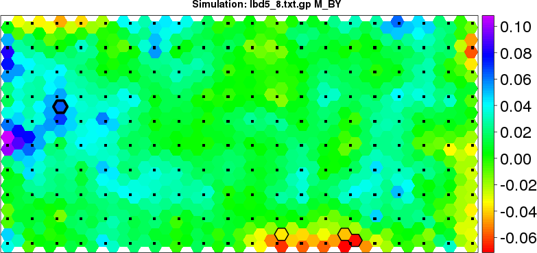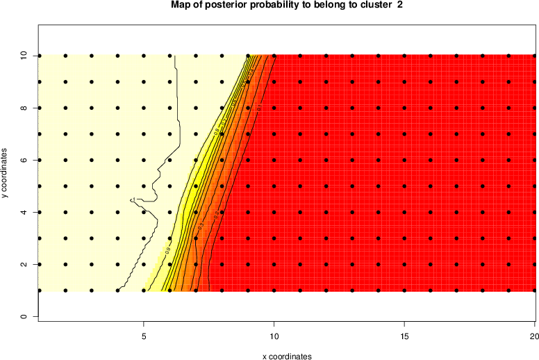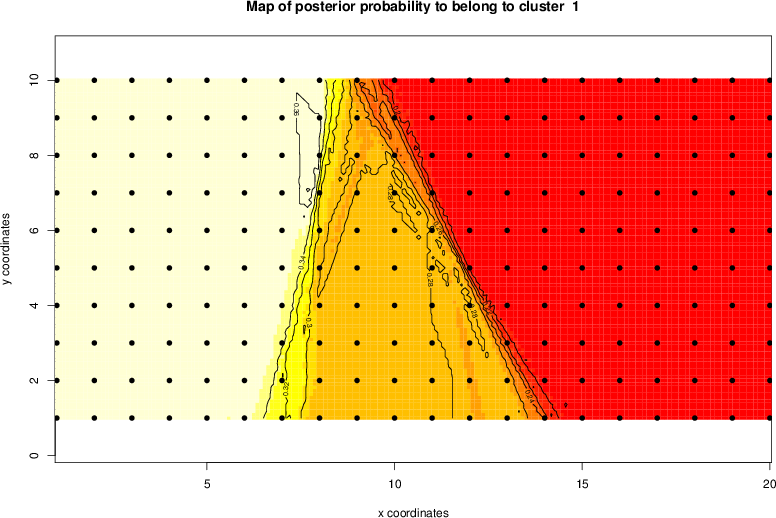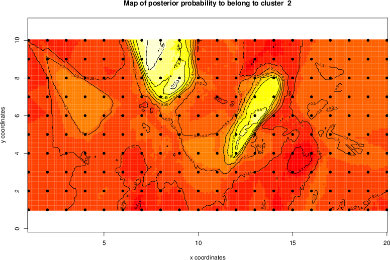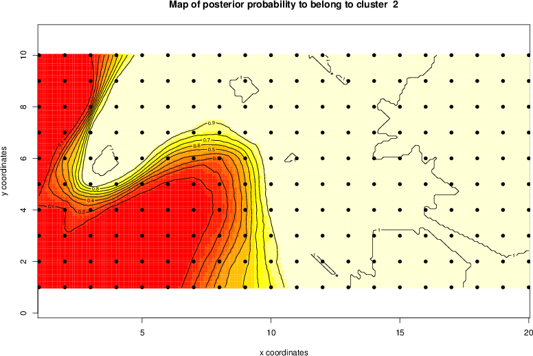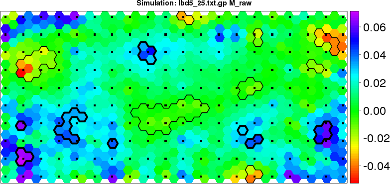 Simulated data | Geographical plots of weighted mean of all ellipse values (i.e., individual genetic distances ar of Rousset 2000) and significant barrier (cells with differentiation values higher than expected under a random distribution (no FDR applied) are materialized with thick black borders) | Idem, Benjamini-Yekutieli FDR applied | MAPI analysis (no FDR applied) with subsampled (75/200) dataset | MAPI analysis (Benjamini-Yekutieli FDR applied) with subsampled (75/200) dataset | Best probability memberships | Probability memberships for cluster 1 | Probability memberships for cluster 2 | Probability memberships for cluster 3 | Probability memberships for cluster 4 | Probability memberships for cluster 5 | Best probability memberships | Probability memberships for cluster 1 | Probability memberships for cluster 2 | Probability memberships for cluster 3 | Probability memberships for cluster 4 | Probability memberships for cluster 5 | Scatter plot showing the first two components of the DAPC (when K*>2) or density plot showing the first principal component of the DAPC (when K*=2) | Probability memberships for cluster 1 | Probability memberships for cluster 2 | Probability memberships for cluster 3 | Probability memberships for cluster 4 | Probability memberships for cluster 5 | Scatter plot showing the first two components of the DAPC (when K*>2) or density plot showing the first principal component of the DAPC (when K*=2) | Probability memberships for cluster 1 | Probability memberships for cluster 2 | Probability memberships for cluster 3 | Probability memberships for cluster 4 | Probability memberships for cluster 5 |