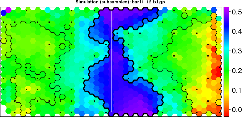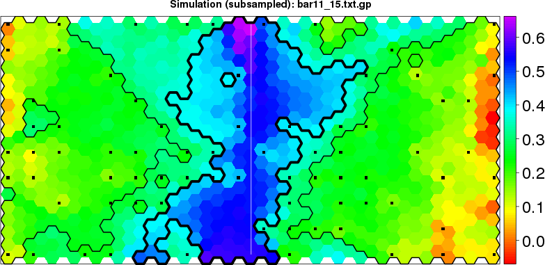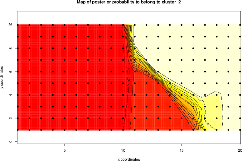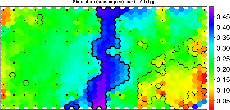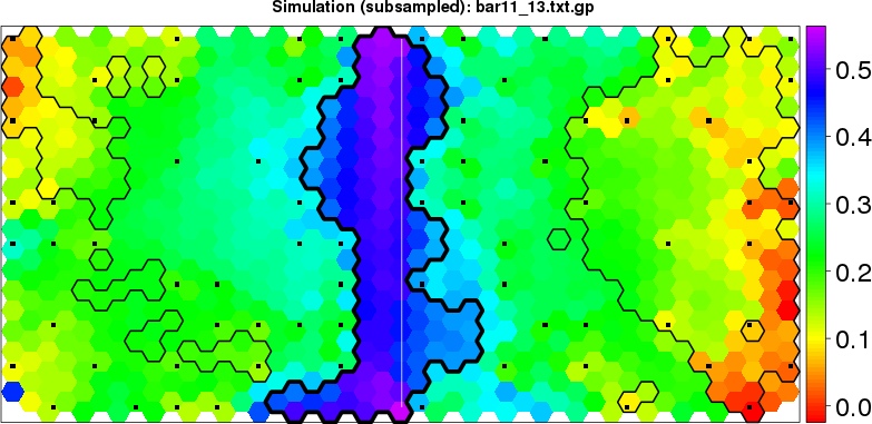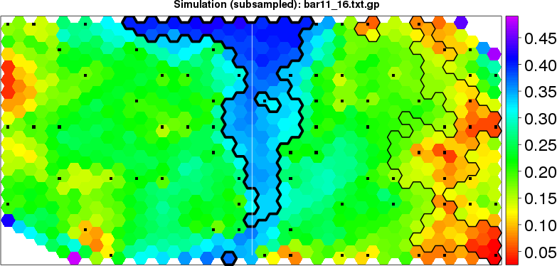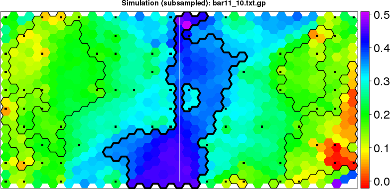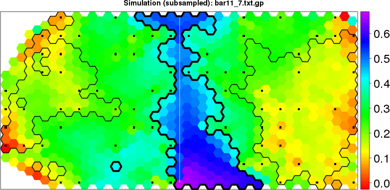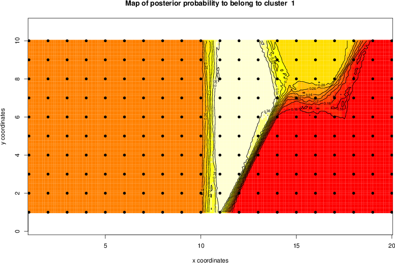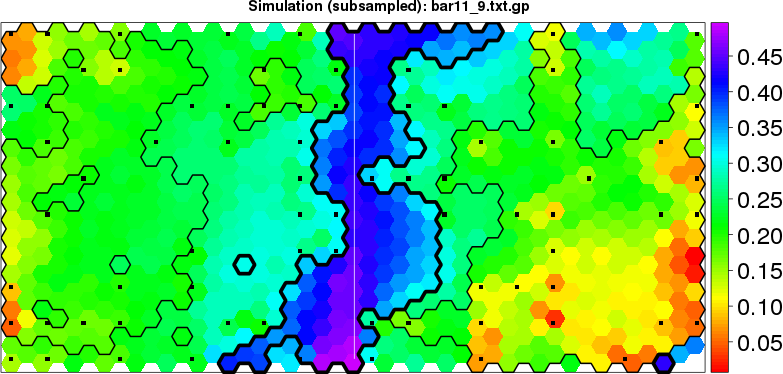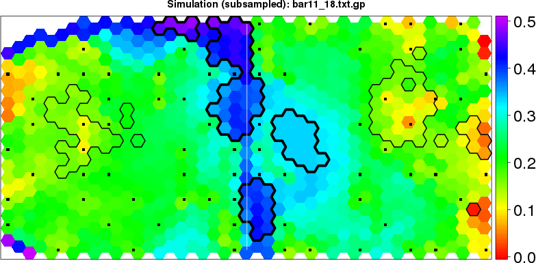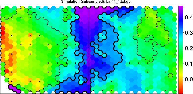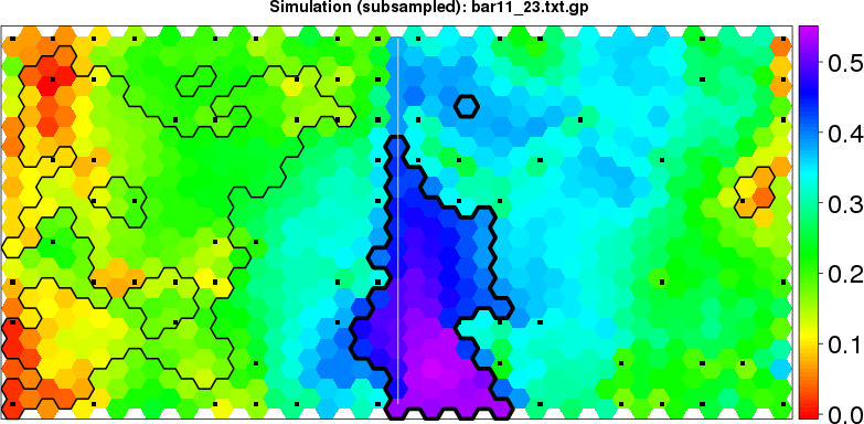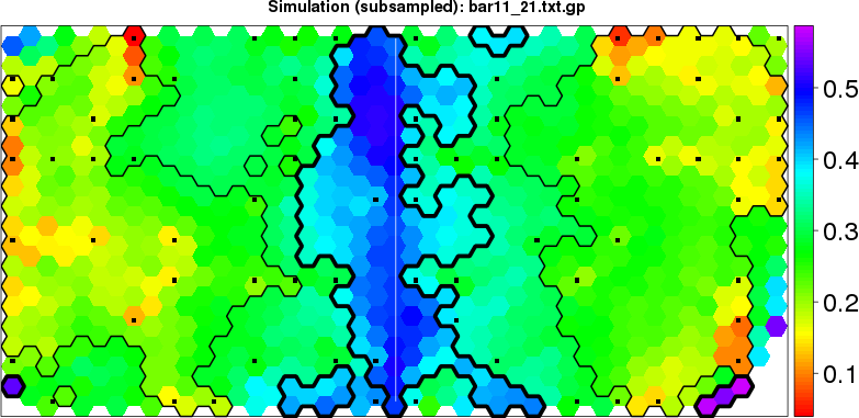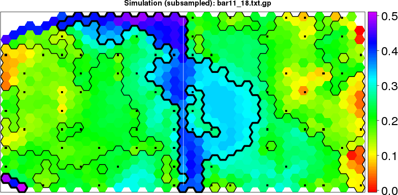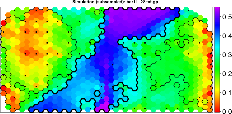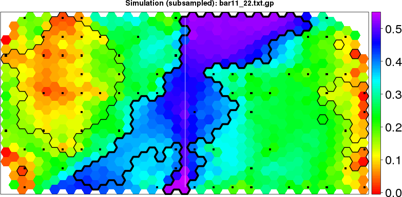 Simulated data | Geographical plots of weighted mean of all ellipse values (i.e., individual genetic distances ar of Rousset 2000) and significant barrier (cells with differentiation values higher than expected under a random distribution (no FDR applied) are materialized with thick black borders) | Idem, Benjamini-Yekutieli FDR applied | MAPI analysis (no FDR applied) with subsampled (75/200) dataset | MAPI analysis (Benjamini-Yekutieli FDR applied) with subsampled (75/200) dataset | Best probability memberships | Probability memberships for cluster 1 | Probability memberships for cluster 2 | Probability memberships for cluster 3 | Probability memberships for cluster 4 | Probability memberships for cluster 5 | Best probability memberships | Probability memberships for cluster 1 | Probability memberships for cluster 2 | Probability memberships for cluster 3 | Probability memberships for cluster 4 | Probability memberships for cluster 5 | Scatter plot showing the first two components of the DAPC (when K*>2) or density plot showing the first principal component of the DAPC (when K*=2) | Probability memberships for cluster 1 | Probability memberships for cluster 2 | Probability memberships for cluster 3 | Probability memberships for cluster 4 | Probability memberships for cluster 5 | Scatter plot showing the first two components of the DAPC (when K*>2) or density plot showing the first principal component of the DAPC (when K*=2) | Probability memberships for cluster 1 | Probability memberships for cluster 2 | Probability memberships for cluster 3 | Probability memberships for cluster 4 | Probability memberships for cluster 5 |