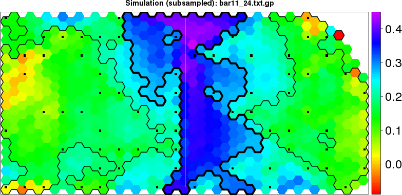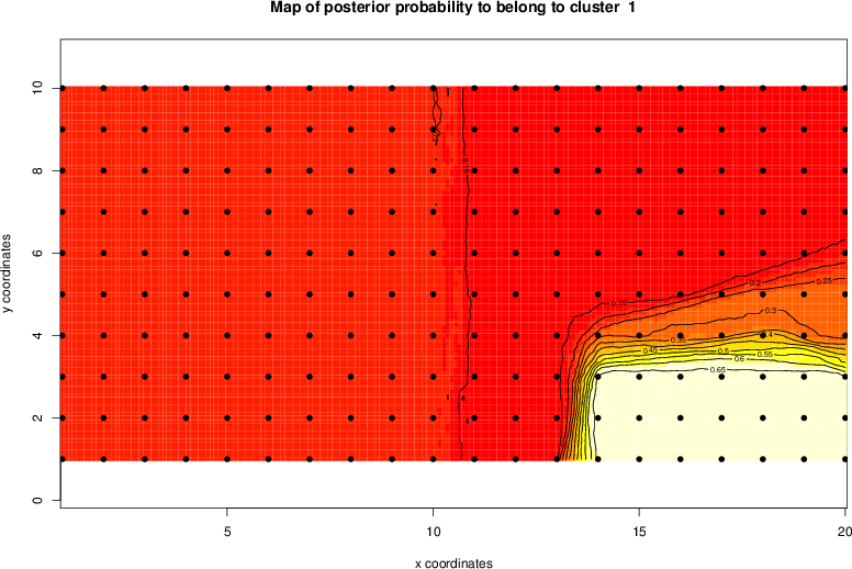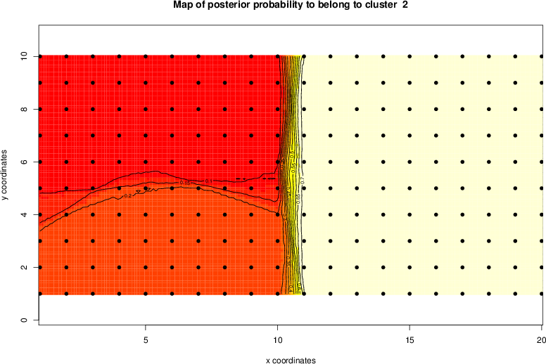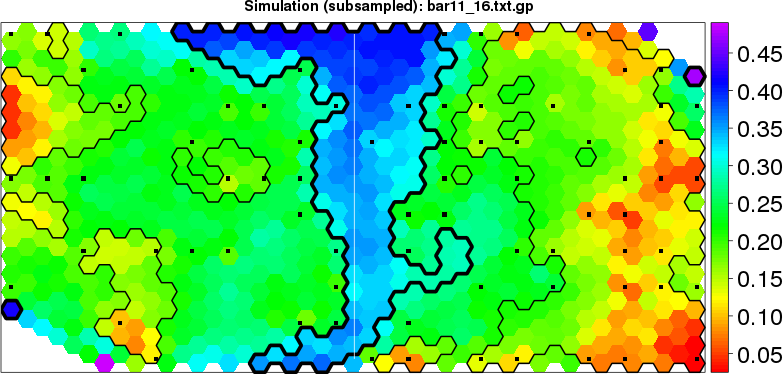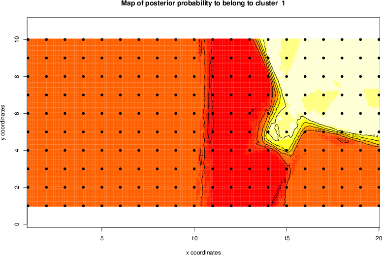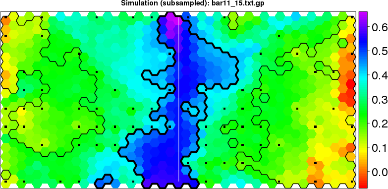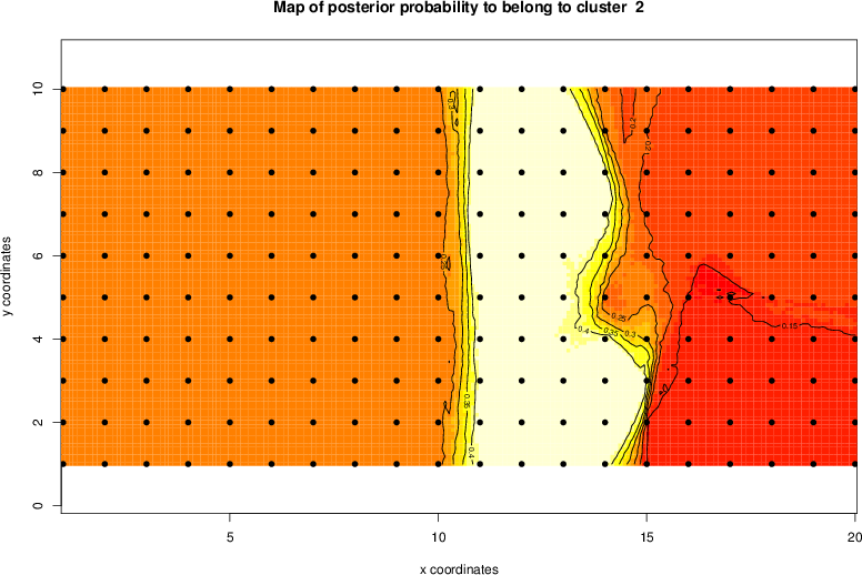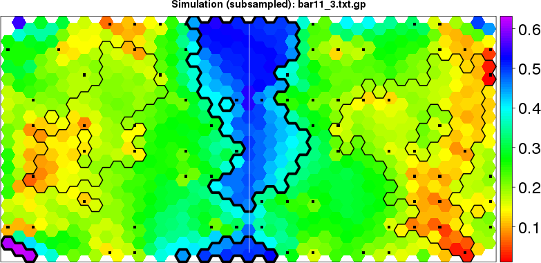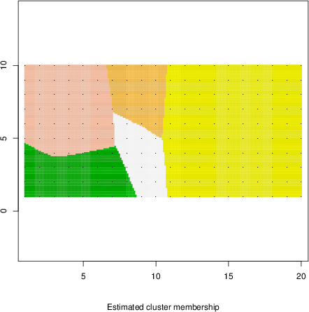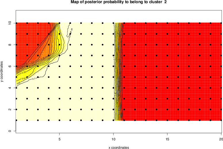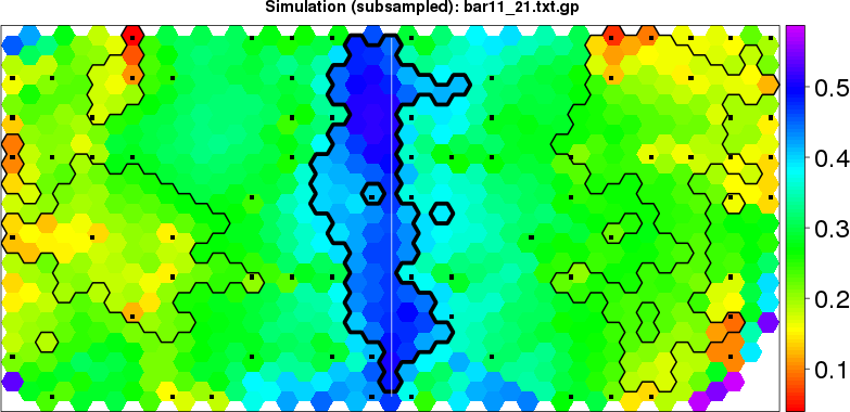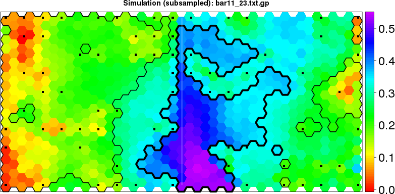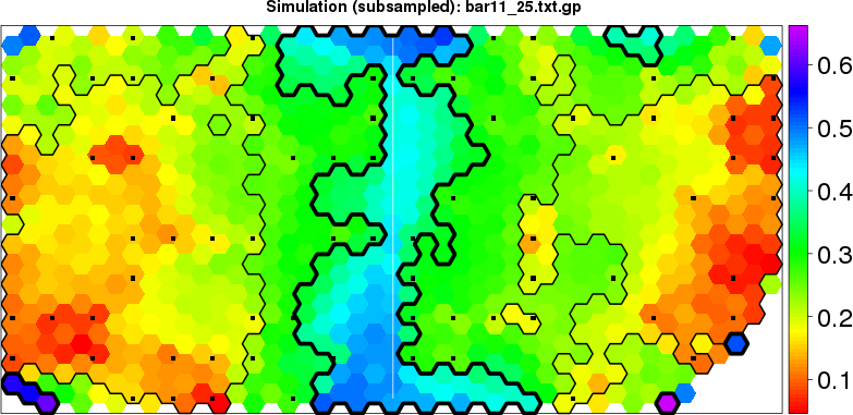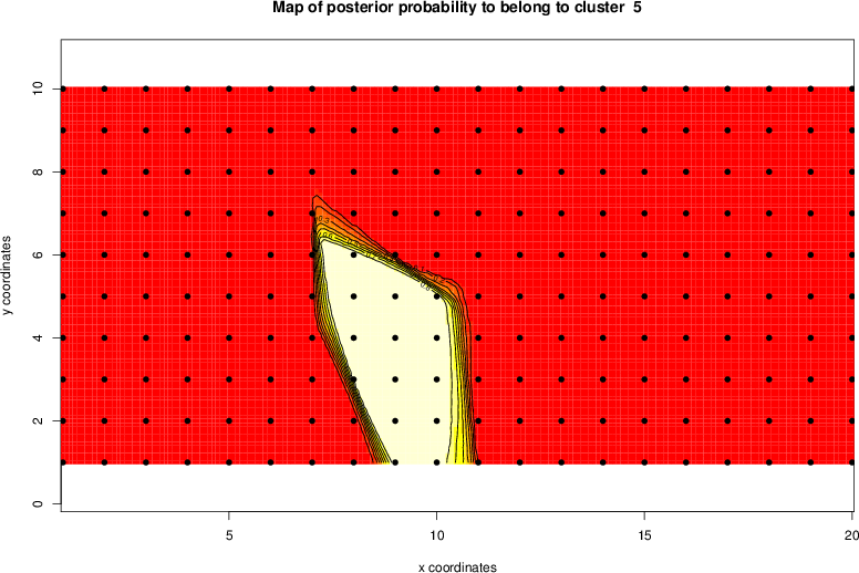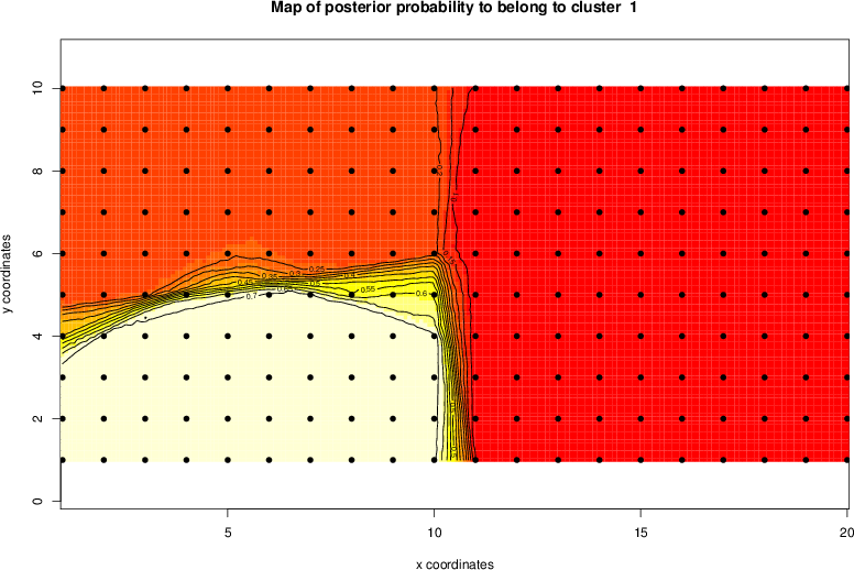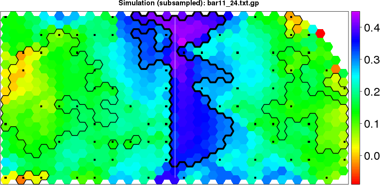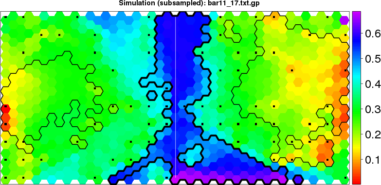Simulated data | Geographical plots of weighted mean of all ellipse values (i.e., individual genetic distances ar of Rousset 2000) and significant barrier (cells with differentiation values higher than expected under a random distribution (no FDR applied) are materialized with thick black borders) | Idem, Benjamini-Yekutieli FDR applied | MAPI analysis (no FDR applied) with subsampled (75/200) dataset | MAPI analysis (Benjamini-Yekutieli FDR applied) with subsampled (75/200) dataset | Best probability memberships | Probability memberships for cluster 1 | Probability memberships for cluster 2 | Probability memberships for cluster 3 | Probability memberships for cluster 4 | Probability memberships for cluster 5 | Best probability memberships | Probability memberships for cluster 1 | Probability memberships for cluster 2 | Probability memberships for cluster 3 | Probability memberships for cluster 4 | Probability memberships for cluster 5 | Scatter plot showing the first two components of the DAPC (when K*>2) or density plot showing the first principal component of the DAPC (when K*=2) | Probability memberships for cluster 1 | Probability memberships for cluster 2 | Probability memberships for cluster 3 | Probability memberships for cluster 4 | Probability memberships for cluster 5 | Scatter plot showing the first two components of the DAPC (when K*>2) or density plot showing the first principal component of the DAPC (when K*=2) | Probability memberships for cluster 1 | Probability memberships for cluster 2 | Probability memberships for cluster 3 | Probability memberships for cluster 4 | Probability memberships for cluster 5 |