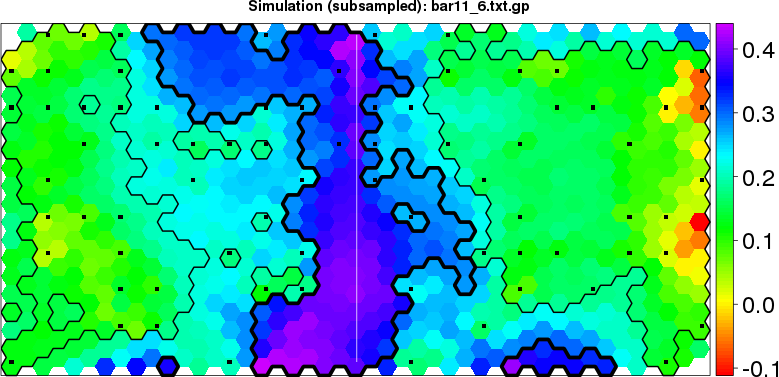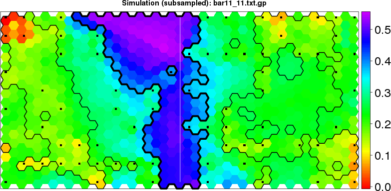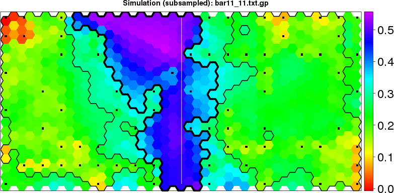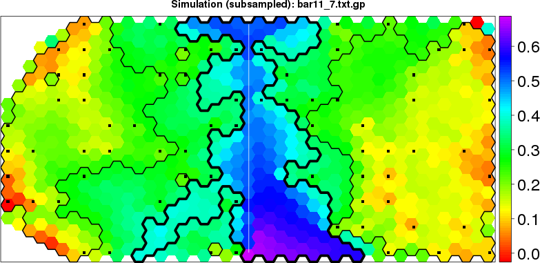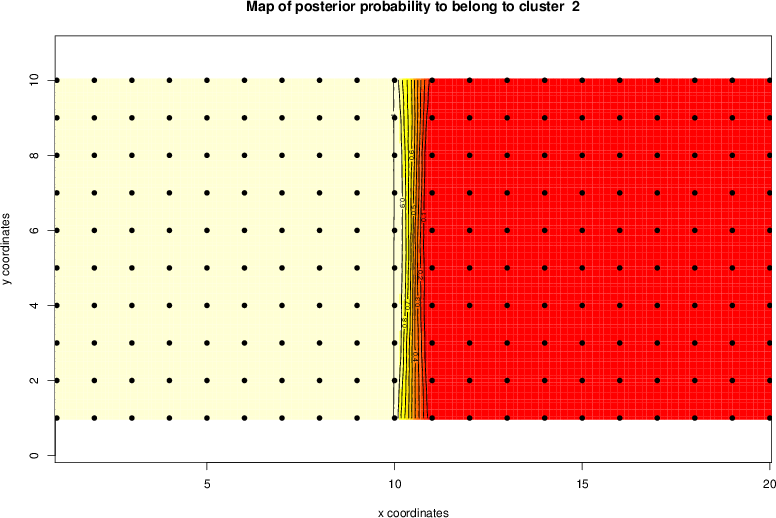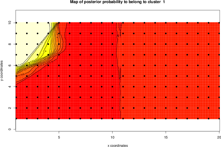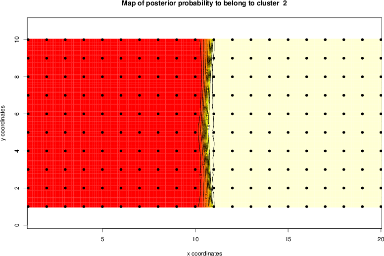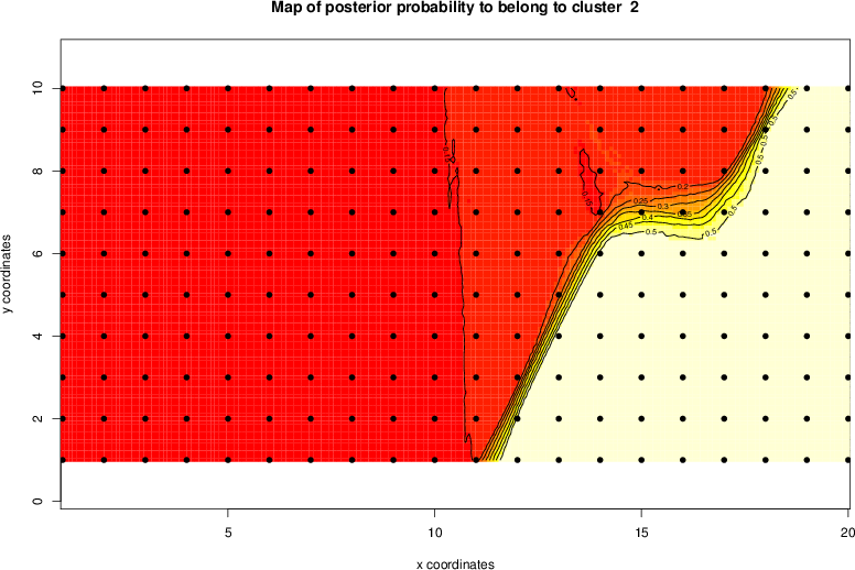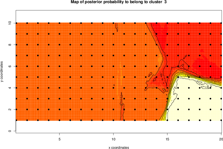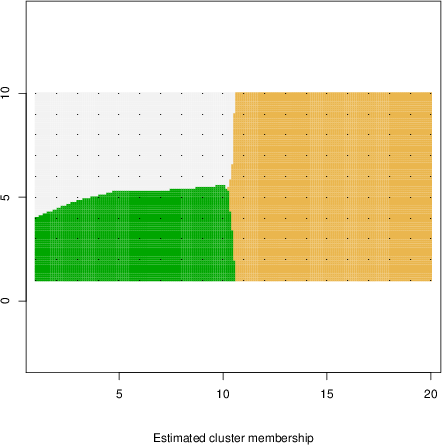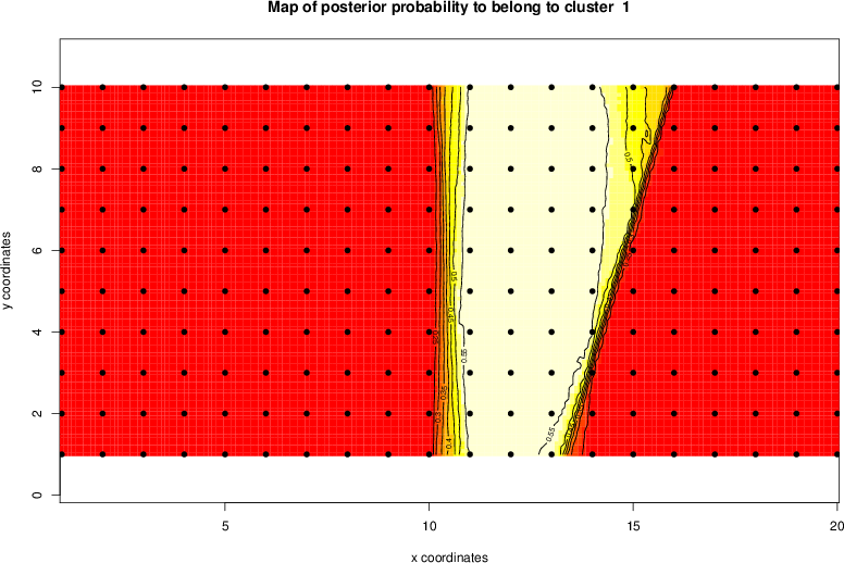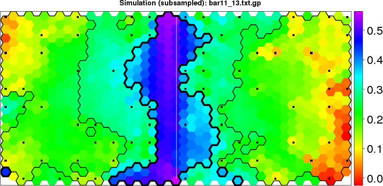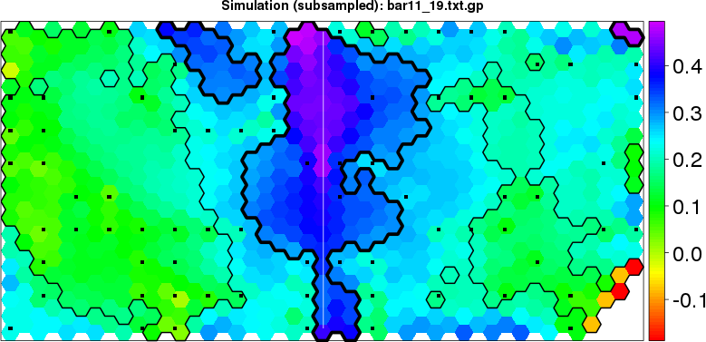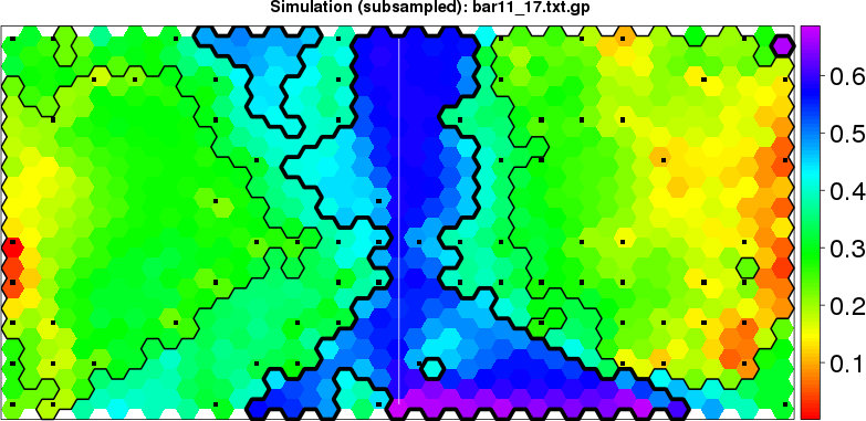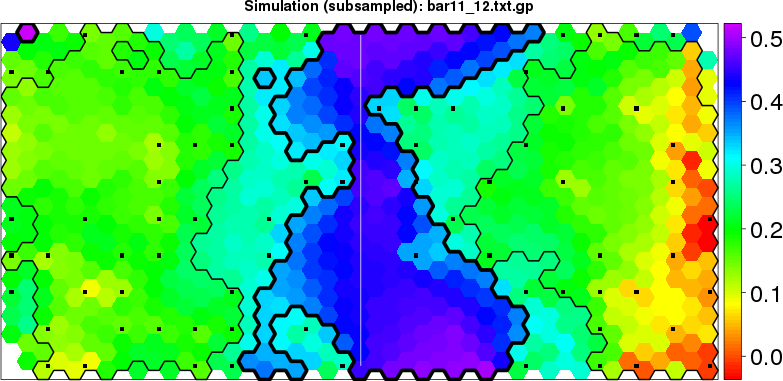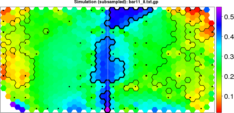 Simulated data | Geographical plots of weighted mean of all ellipse values (i.e., individual genetic distances ar of Rousset 2000) and significant barrier (cells with differentiation values higher than expected under a random distribution (no FDR applied) are materialized with thick black borders) | Idem, Benjamini-Yekutieli FDR applied | MAPI analysis (no FDR applied) with subsampled (75/200) dataset | MAPI analysis (Benjamini-Yekutieli FDR applied) with subsampled (75/200) dataset | Best probability memberships | Probability memberships for cluster 1 | Probability memberships for cluster 2 | Probability memberships for cluster 3 | Probability memberships for cluster 4 | Probability memberships for cluster 5 | Best probability memberships | Probability memberships for cluster 1 | Probability memberships for cluster 2 | Probability memberships for cluster 3 | Probability memberships for cluster 4 | Probability memberships for cluster 5 | Scatter plot showing the first two components of the DAPC (when K*>2) or density plot showing the first principal component of the DAPC (when K*=2) | Probability memberships for cluster 1 | Probability memberships for cluster 2 | Probability memberships for cluster 3 | Probability memberships for cluster 4 | Probability memberships for cluster 5 | Scatter plot showing the first two components of the DAPC (when K*>2) or density plot showing the first principal component of the DAPC (when K*=2) | Probability memberships for cluster 1 | Probability memberships for cluster 2 | Probability memberships for cluster 3 | Probability memberships for cluster 4 | Probability memberships for cluster 5 |