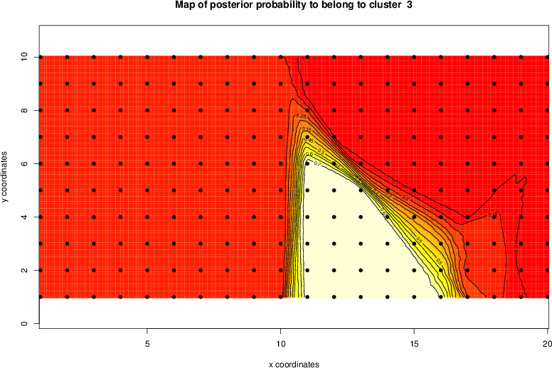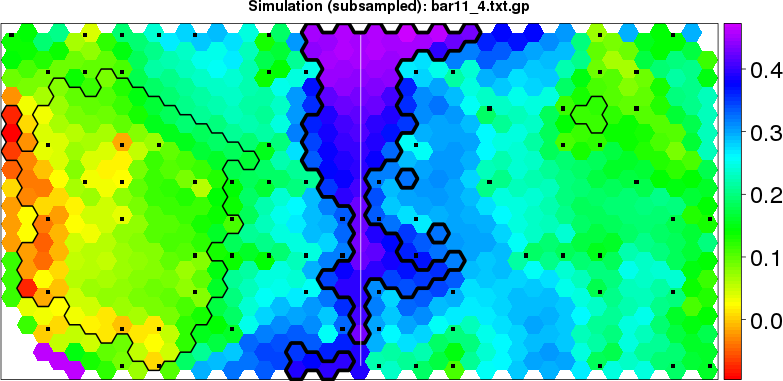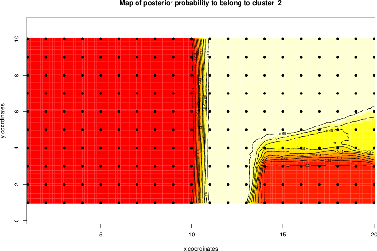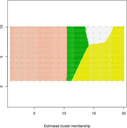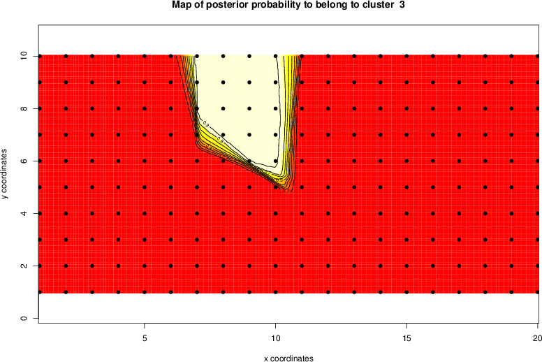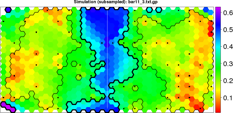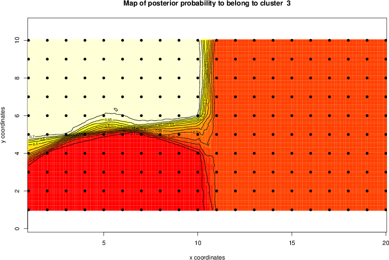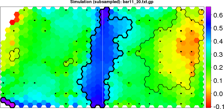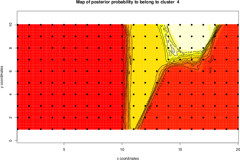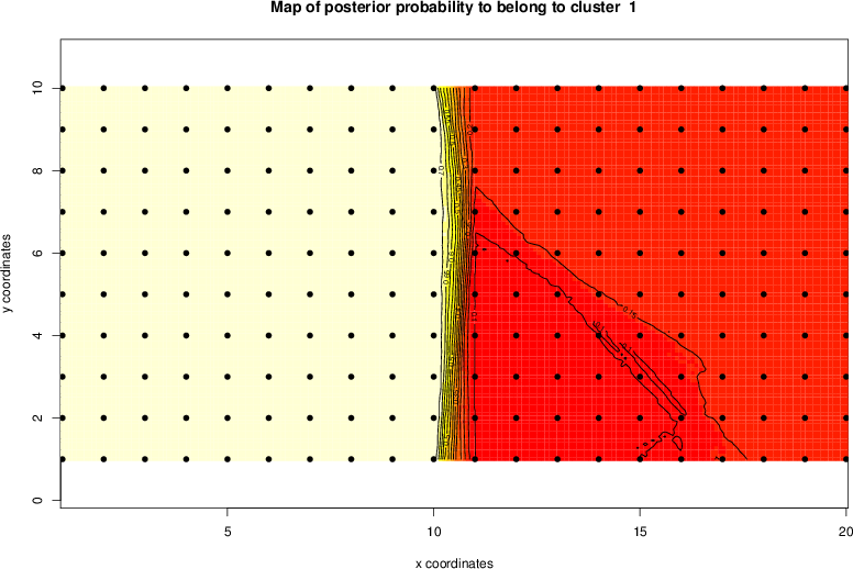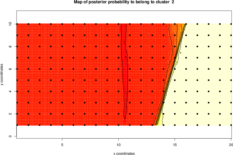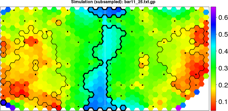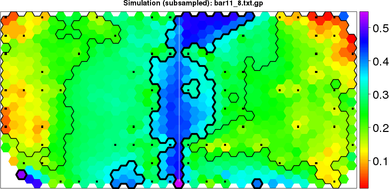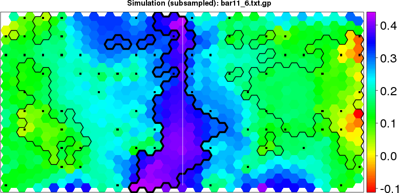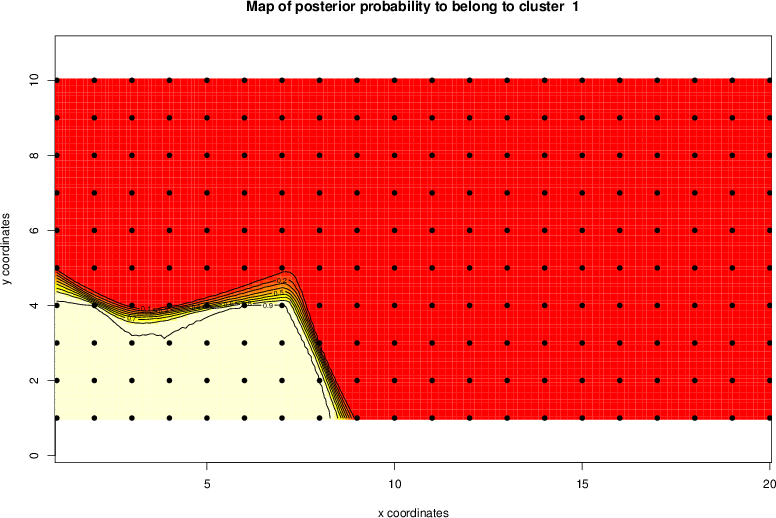 Simulated data | Geographical plots of weighted mean of all ellipse values (i.e., individual genetic distances ar of Rousset 2000) and significant barrier (cells with differentiation values higher than expected under a random distribution (no FDR applied) are materialized with thick black borders) | Idem, Benjamini-Yekutieli FDR applied | MAPI analysis (no FDR applied) with subsampled (75/200) dataset | MAPI analysis (Benjamini-Yekutieli FDR applied) with subsampled (75/200) dataset | Best probability memberships | Probability memberships for cluster 1 | Probability memberships for cluster 2 | Probability memberships for cluster 3 | Probability memberships for cluster 4 | Probability memberships for cluster 5 | Best probability memberships | Probability memberships for cluster 1 | Probability memberships for cluster 2 | Probability memberships for cluster 3 | Probability memberships for cluster 4 | Probability memberships for cluster 5 | Scatter plot showing the first two components of the DAPC (when K*>2) or density plot showing the first principal component of the DAPC (when K*=2) | Probability memberships for cluster 1 | Probability memberships for cluster 2 | Probability memberships for cluster 3 | Probability memberships for cluster 4 | Probability memberships for cluster 5 | Scatter plot showing the first two components of the DAPC (when K*>2) or density plot showing the first principal component of the DAPC (when K*=2) | Probability memberships for cluster 1 | Probability memberships for cluster 2 | Probability memberships for cluster 3 | Probability memberships for cluster 4 | Probability memberships for cluster 5 |