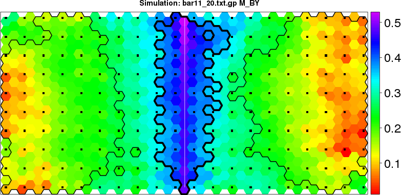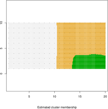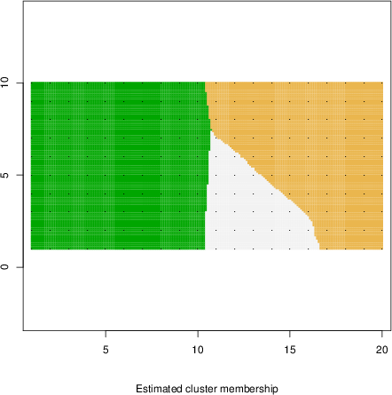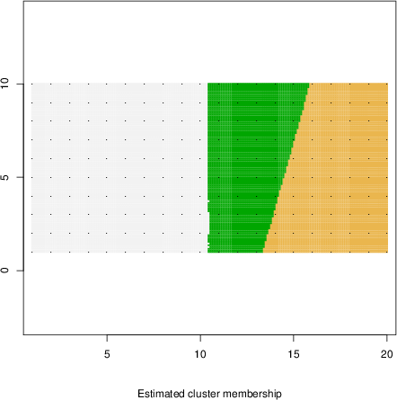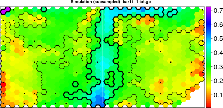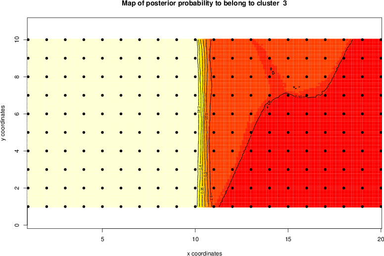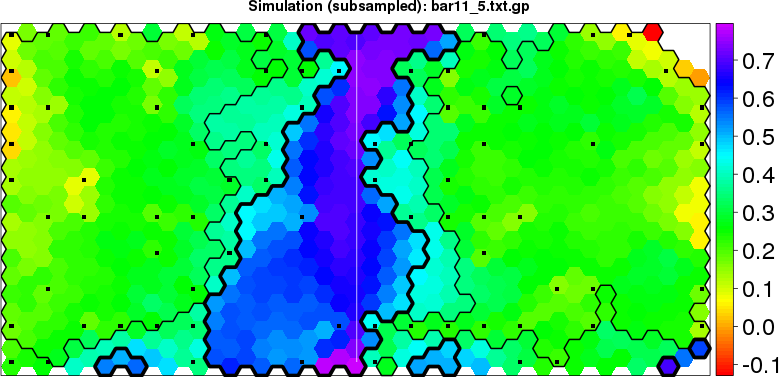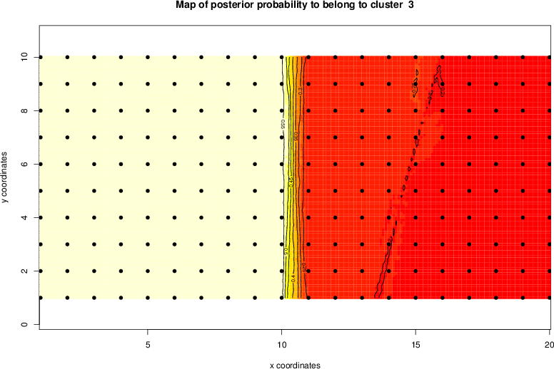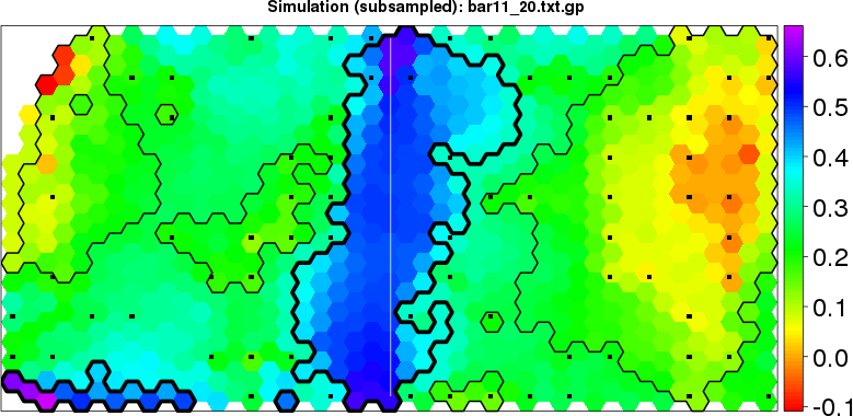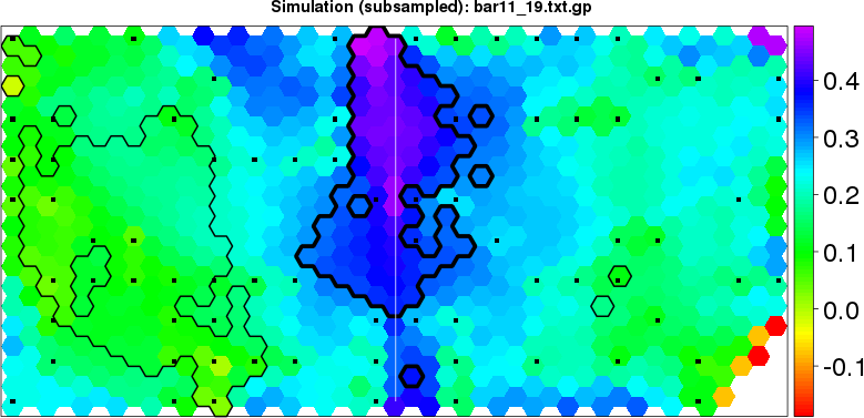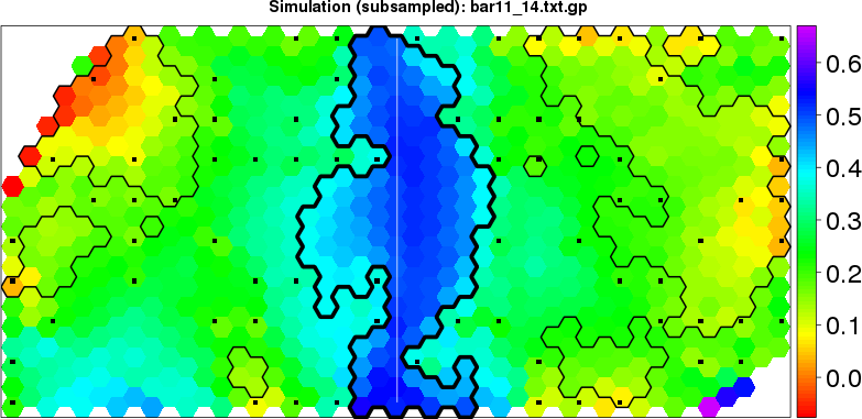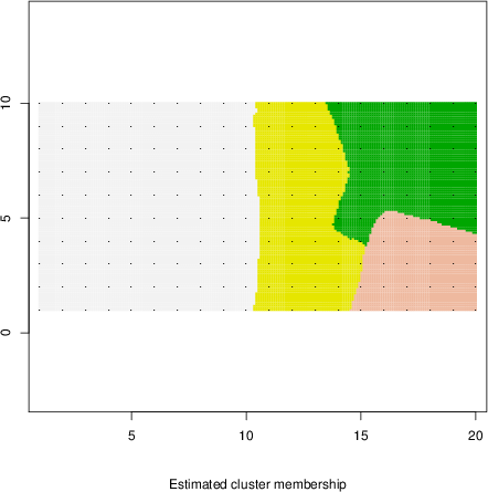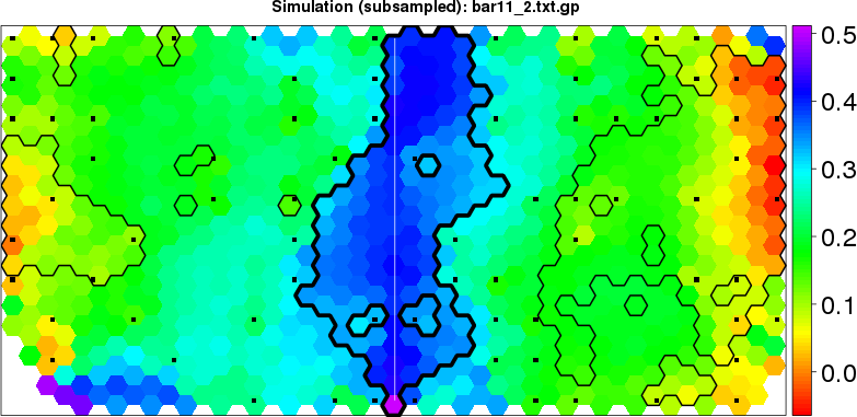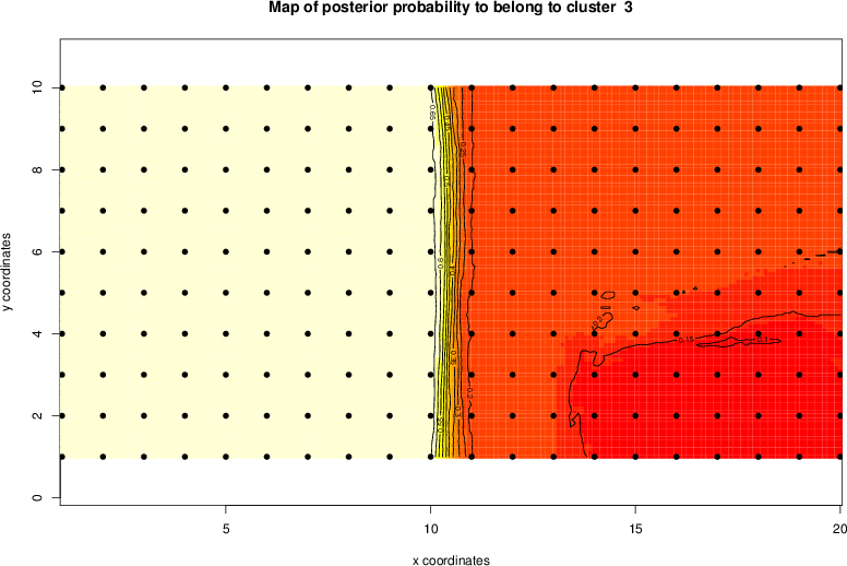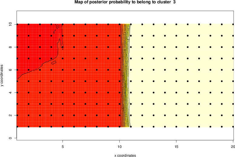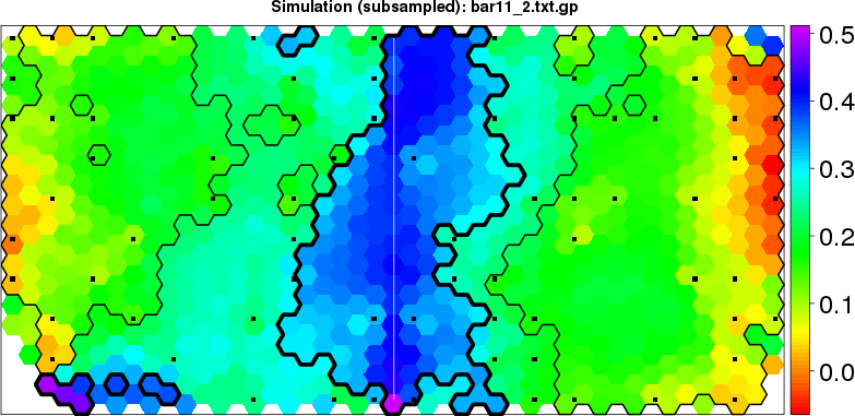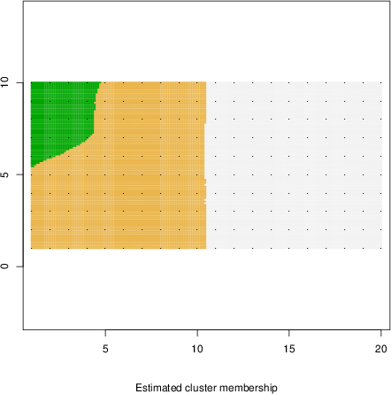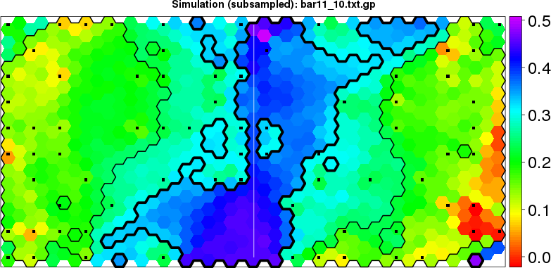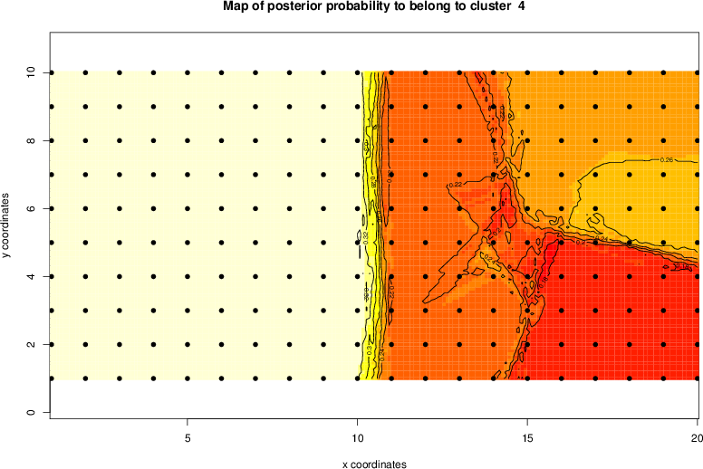 Simulated data | Geographical plots of weighted mean of all ellipse values (i.e., individual genetic distances ar of Rousset 2000) and significant barrier (cells with differentiation values higher than expected under a random distribution (no FDR applied) are materialized with thick black borders) | Idem, Benjamini-Yekutieli FDR applied | MAPI analysis (no FDR applied) with subsampled (75/200) dataset | MAPI analysis (Benjamini-Yekutieli FDR applied) with subsampled (75/200) dataset | Best probability memberships | Probability memberships for cluster 1 | Probability memberships for cluster 2 | Probability memberships for cluster 3 | Probability memberships for cluster 4 | Probability memberships for cluster 5 | Best probability memberships | Probability memberships for cluster 1 | Probability memberships for cluster 2 | Probability memberships for cluster 3 | Probability memberships for cluster 4 | Probability memberships for cluster 5 | Scatter plot showing the first two components of the DAPC (when K*>2) or density plot showing the first principal component of the DAPC (when K*=2) | Probability memberships for cluster 1 | Probability memberships for cluster 2 | Probability memberships for cluster 3 | Probability memberships for cluster 4 | Probability memberships for cluster 5 | Scatter plot showing the first two components of the DAPC (when K*>2) or density plot showing the first principal component of the DAPC (when K*=2) | Probability memberships for cluster 1 | Probability memberships for cluster 2 | Probability memberships for cluster 3 | Probability memberships for cluster 4 | Probability memberships for cluster 5 |