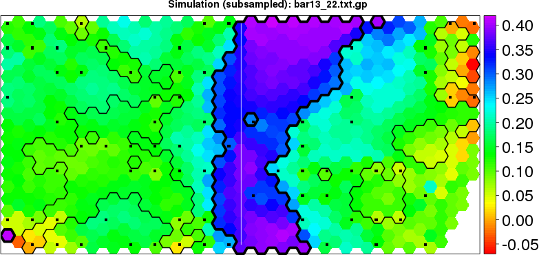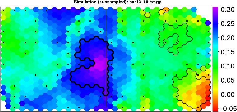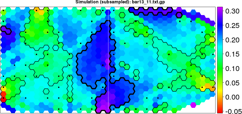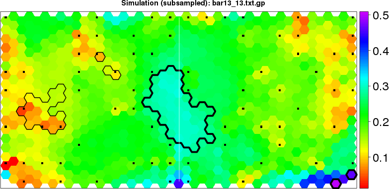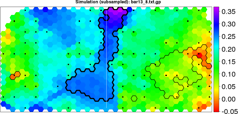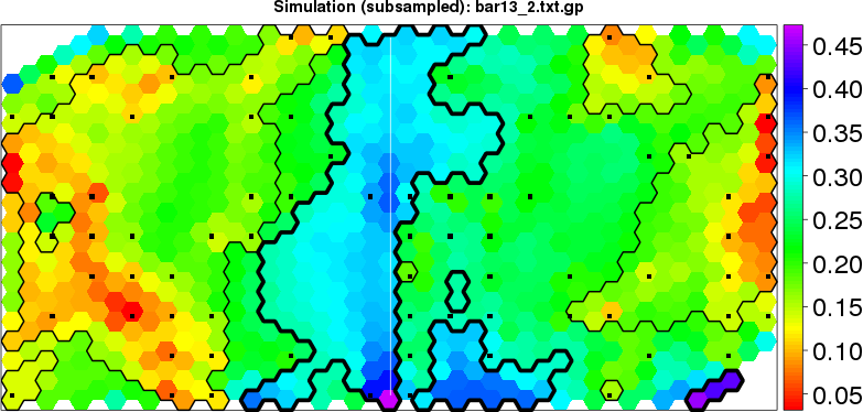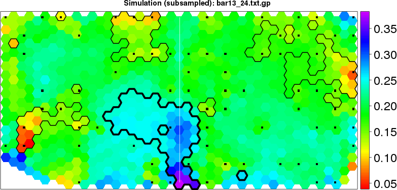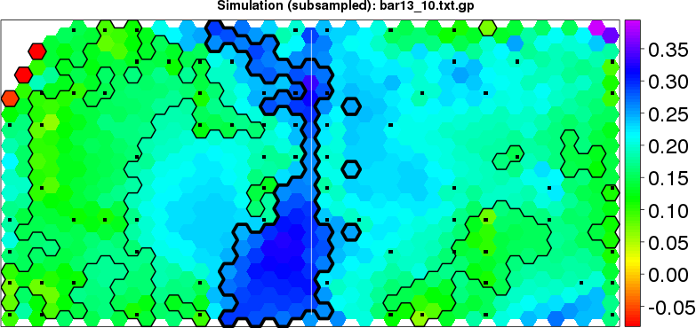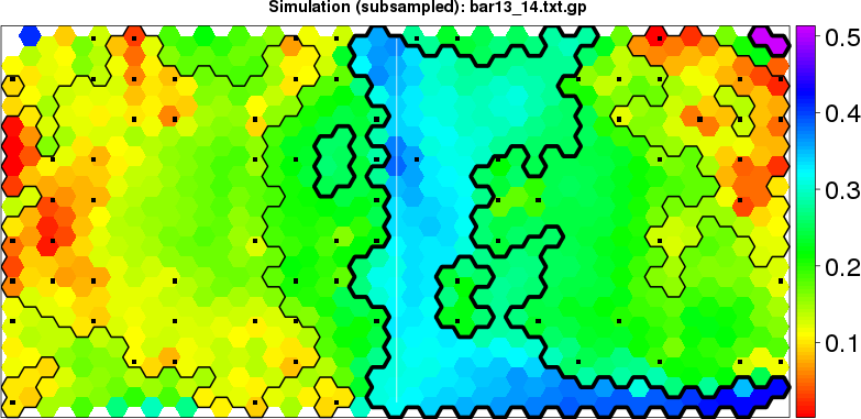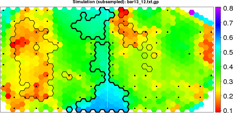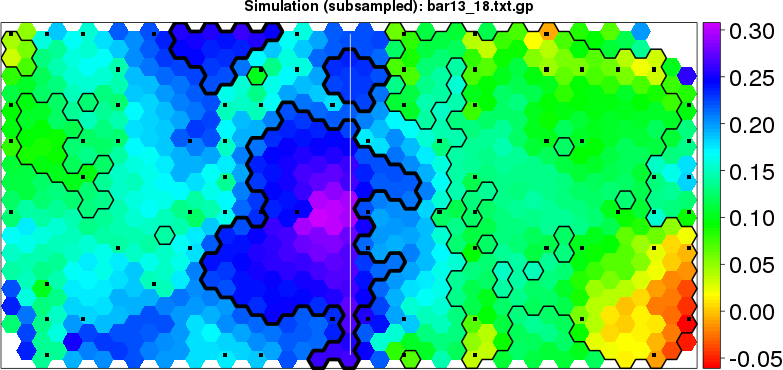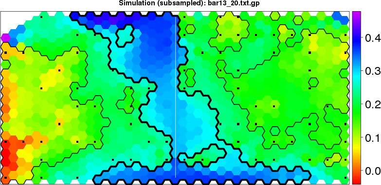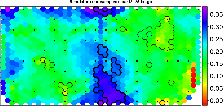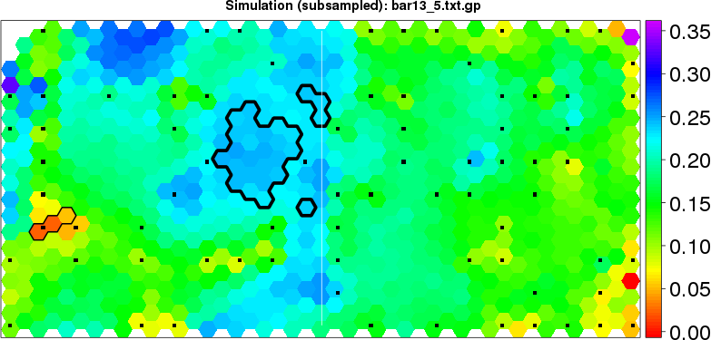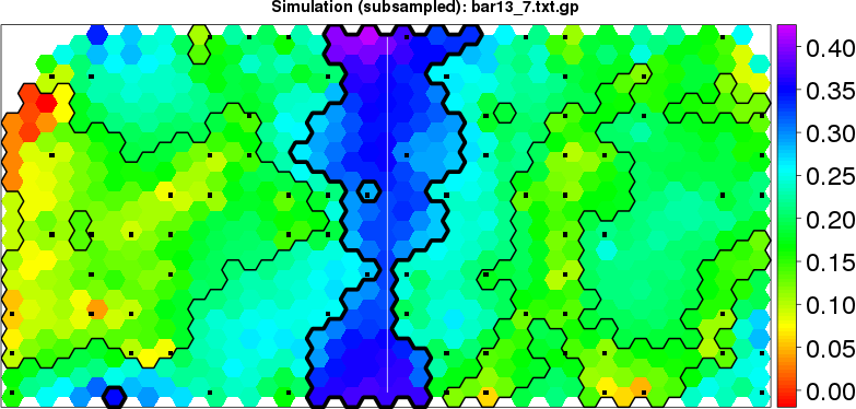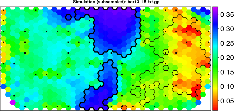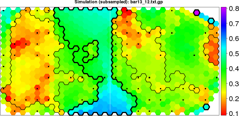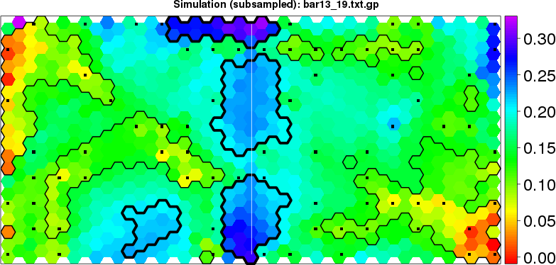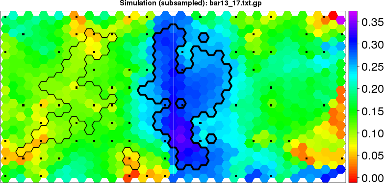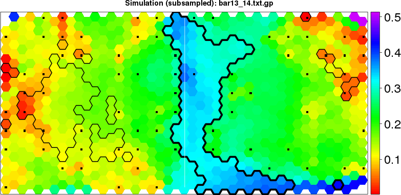 Simulated data | Geographical plots of weighted mean of all ellipse values (i.e., individual genetic distances ar of Rousset 2000) and significant barrier (cells with differentiation values higher than expected under a random distribution (no FDR applied) are materialized with thick black borders) | Idem, Benjamini-Yekutieli FDR applied | MAPI analysis (no FDR applied) with subsampled (75/200) dataset | MAPI analysis (Benjamini-Yekutieli FDR applied) with subsampled (75/200) dataset | Best probability memberships | Probability memberships for cluster 1 | Probability memberships for cluster 2 | Probability memberships for cluster 3 | Probability memberships for cluster 4 | Probability memberships for cluster 5 | Best probability memberships | Probability memberships for cluster 1 | Probability memberships for cluster 2 | Probability memberships for cluster 3 | Probability memberships for cluster 4 | Probability memberships for cluster 5 | Scatter plot showing the first two components of the DAPC (when K*>2) or density plot showing the first principal component of the DAPC (when K*=2) | Probability memberships for cluster 1 | Probability memberships for cluster 2 | Probability memberships for cluster 3 | Probability memberships for cluster 4 | Probability memberships for cluster 5 | Scatter plot showing the first two components of the DAPC (when K*>2) or density plot showing the first principal component of the DAPC (when K*=2) | Probability memberships for cluster 1 | Probability memberships for cluster 2 | Probability memberships for cluster 3 | Probability memberships for cluster 4 | Probability memberships for cluster 5 |