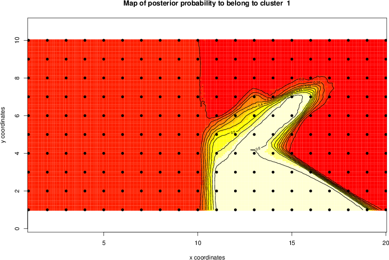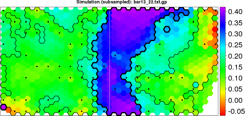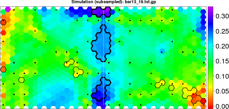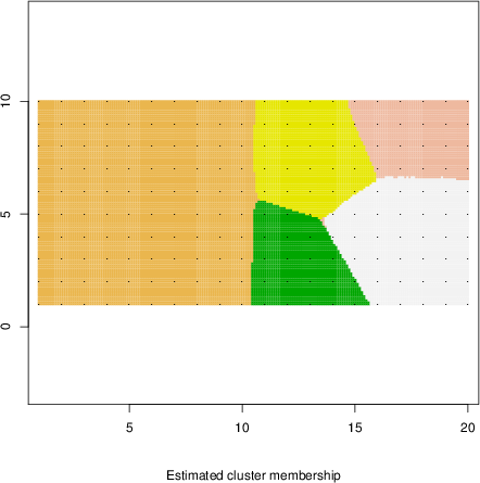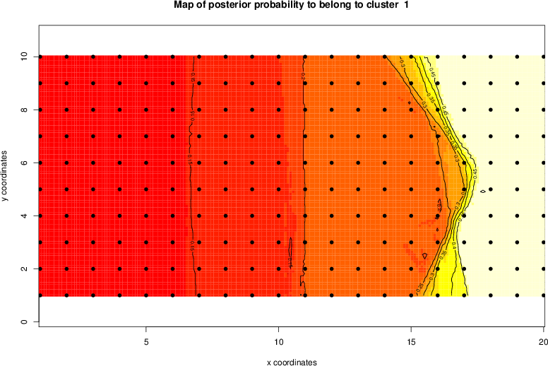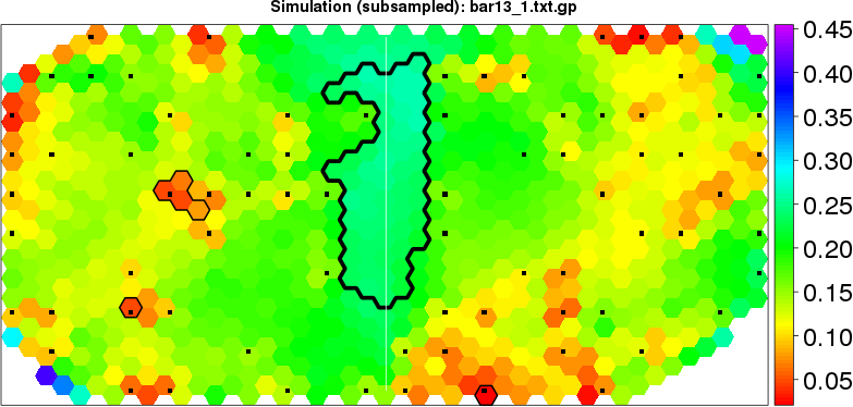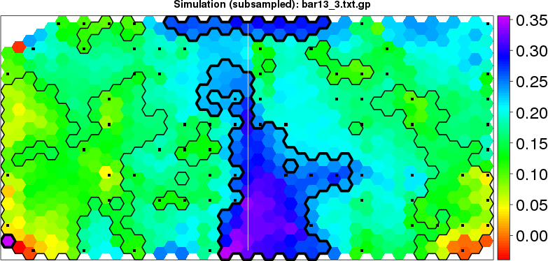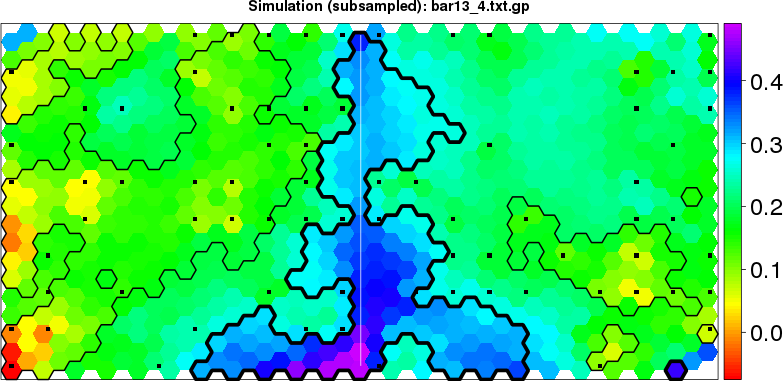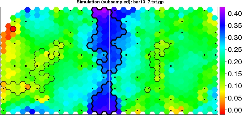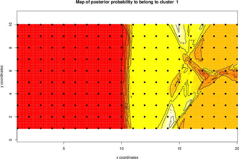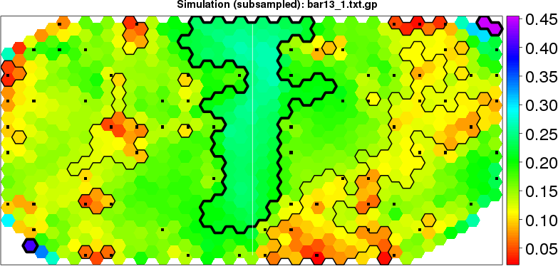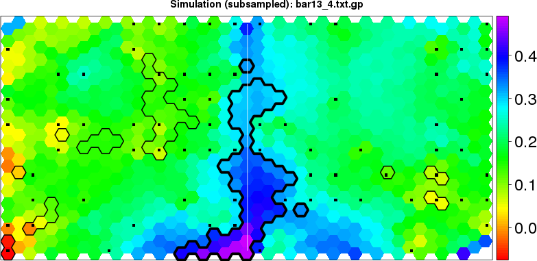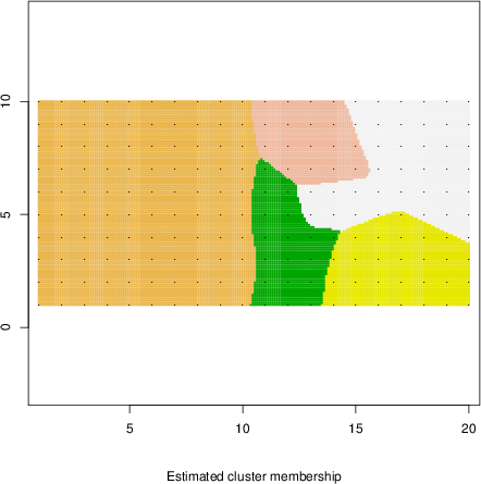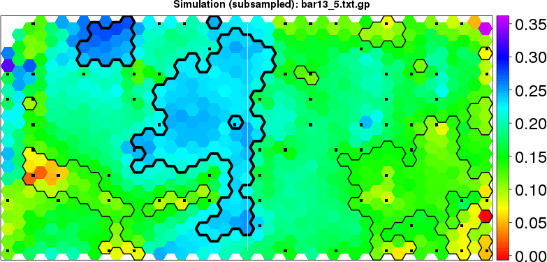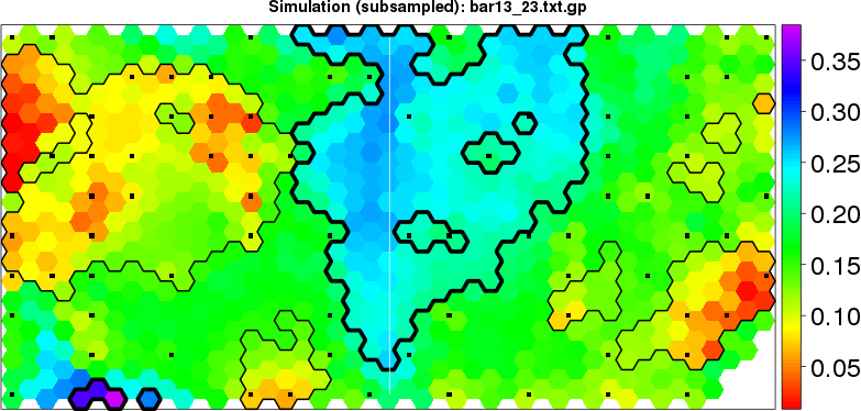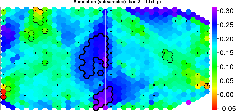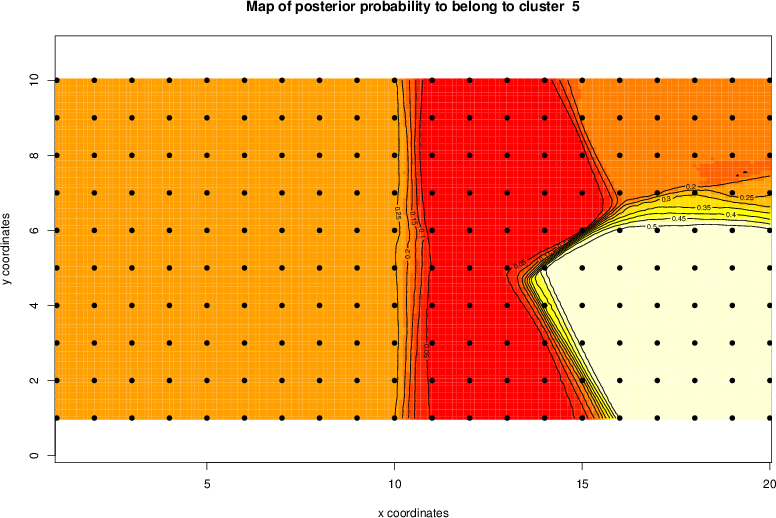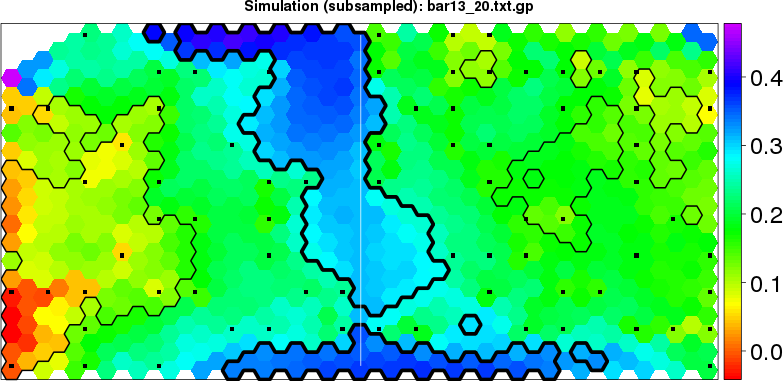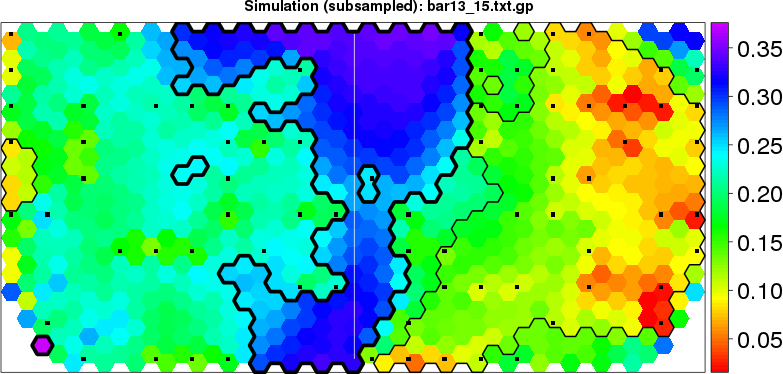 Simulated data | Geographical plots of weighted mean of all ellipse values (i.e., individual genetic distances ar of Rousset 2000) and significant barrier (cells with differentiation values higher than expected under a random distribution (no FDR applied) are materialized with thick black borders) | Idem, Benjamini-Yekutieli FDR applied | MAPI analysis (no FDR applied) with subsampled (75/200) dataset | MAPI analysis (Benjamini-Yekutieli FDR applied) with subsampled (75/200) dataset | Best probability memberships | Probability memberships for cluster 1 | Probability memberships for cluster 2 | Probability memberships for cluster 3 | Probability memberships for cluster 4 | Probability memberships for cluster 5 | Best probability memberships | Probability memberships for cluster 1 | Probability memberships for cluster 2 | Probability memberships for cluster 3 | Probability memberships for cluster 4 | Probability memberships for cluster 5 | Scatter plot showing the first two components of the DAPC (when K*>2) or density plot showing the first principal component of the DAPC (when K*=2) | Probability memberships for cluster 1 | Probability memberships for cluster 2 | Probability memberships for cluster 3 | Probability memberships for cluster 4 | Probability memberships for cluster 5 | Scatter plot showing the first two components of the DAPC (when K*>2) or density plot showing the first principal component of the DAPC (when K*=2) | Probability memberships for cluster 1 | Probability memberships for cluster 2 | Probability memberships for cluster 3 | Probability memberships for cluster 4 | Probability memberships for cluster 5 |