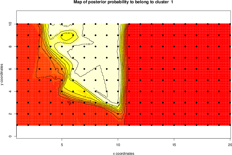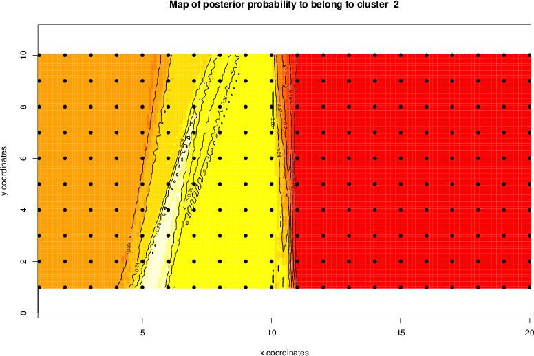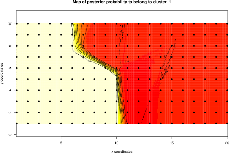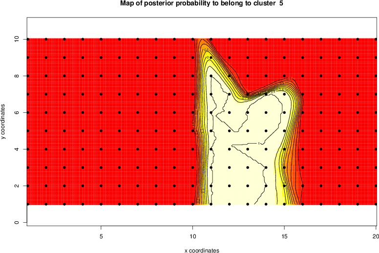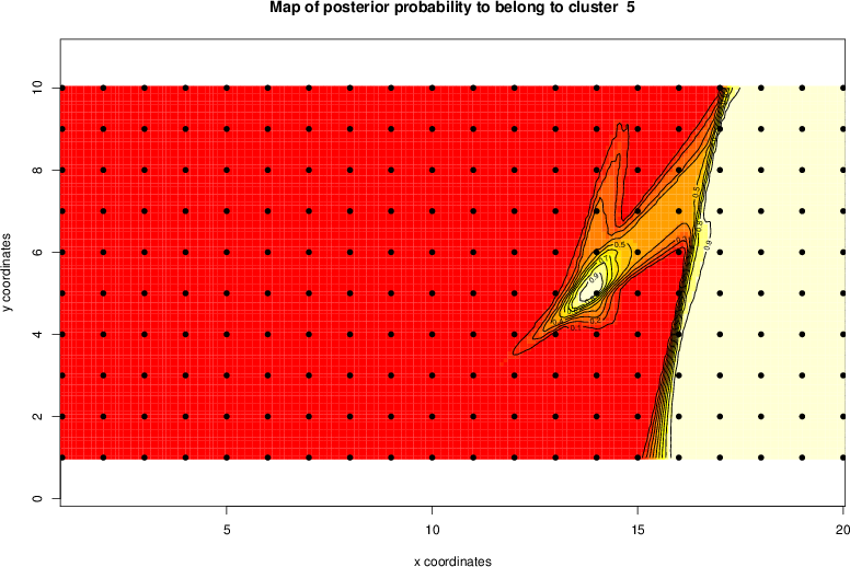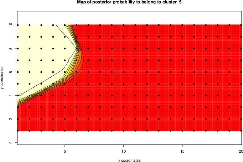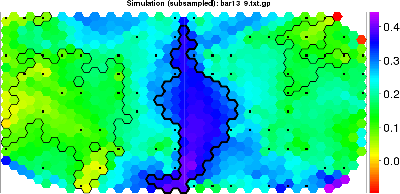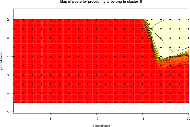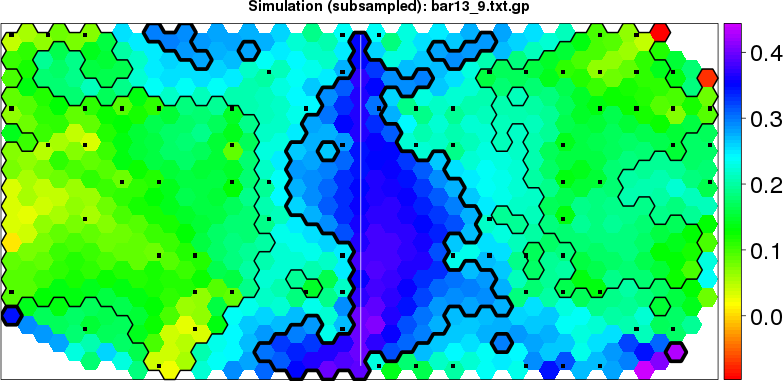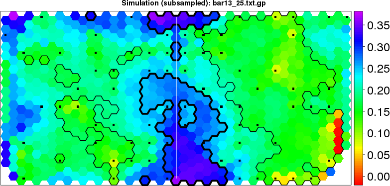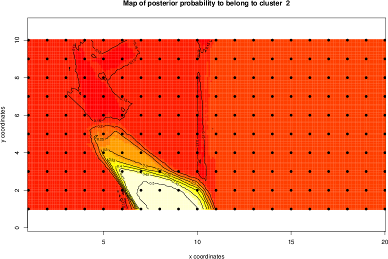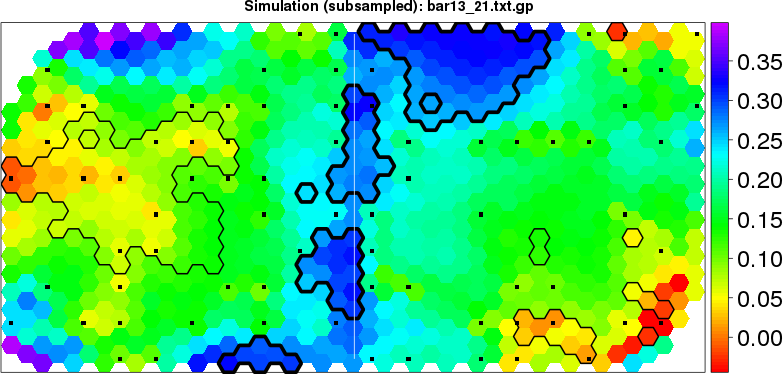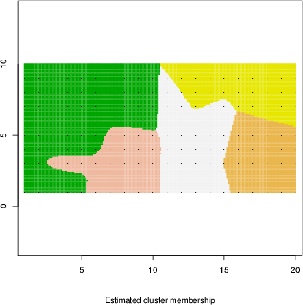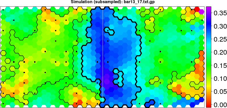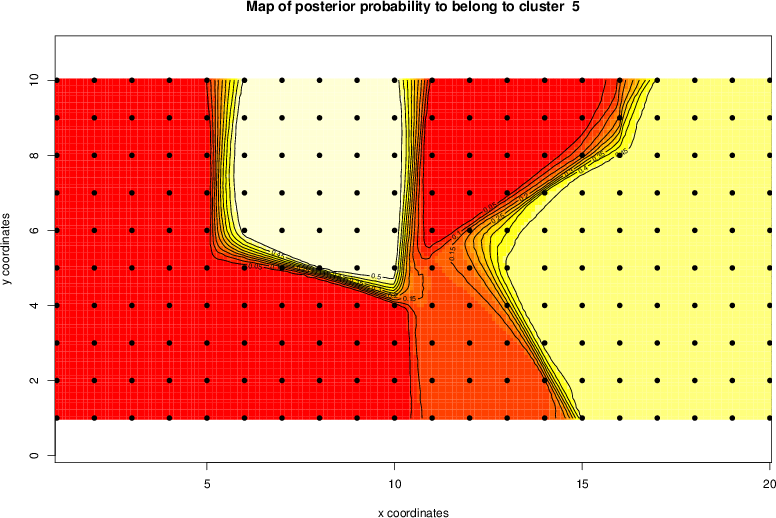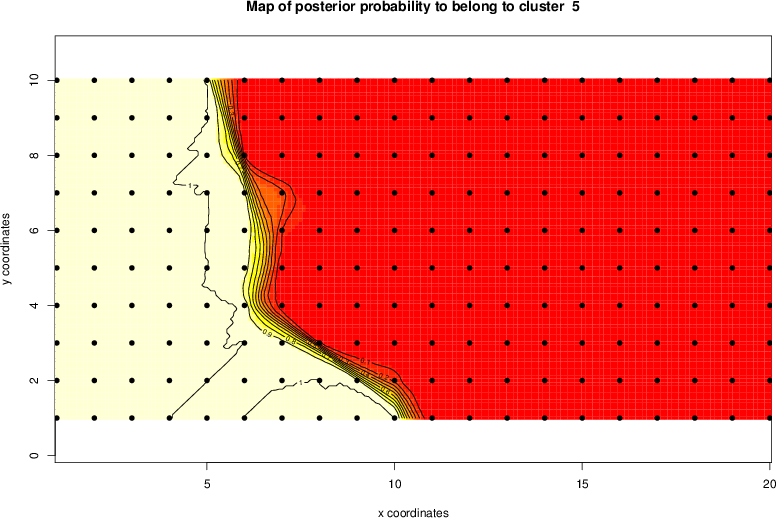 Simulated data | Geographical plots of weighted mean of all ellipse values (i.e., individual genetic distances ar of Rousset 2000) and significant barrier (cells with differentiation values higher than expected under a random distribution (no FDR applied) are materialized with thick black borders) | Idem, Benjamini-Yekutieli FDR applied | MAPI analysis (no FDR applied) with subsampled (75/200) dataset | MAPI analysis (Benjamini-Yekutieli FDR applied) with subsampled (75/200) dataset | Best probability memberships | Probability memberships for cluster 1 | Probability memberships for cluster 2 | Probability memberships for cluster 3 | Probability memberships for cluster 4 | Probability memberships for cluster 5 | Best probability memberships | Probability memberships for cluster 1 | Probability memberships for cluster 2 | Probability memberships for cluster 3 | Probability memberships for cluster 4 | Probability memberships for cluster 5 | Scatter plot showing the first two components of the DAPC (when K*>2) or density plot showing the first principal component of the DAPC (when K*=2) | Probability memberships for cluster 1 | Probability memberships for cluster 2 | Probability memberships for cluster 3 | Probability memberships for cluster 4 | Probability memberships for cluster 5 | Scatter plot showing the first two components of the DAPC (when K*>2) or density plot showing the first principal component of the DAPC (when K*=2) | Probability memberships for cluster 1 | Probability memberships for cluster 2 | Probability memberships for cluster 3 | Probability memberships for cluster 4 | Probability memberships for cluster 5 |
