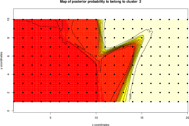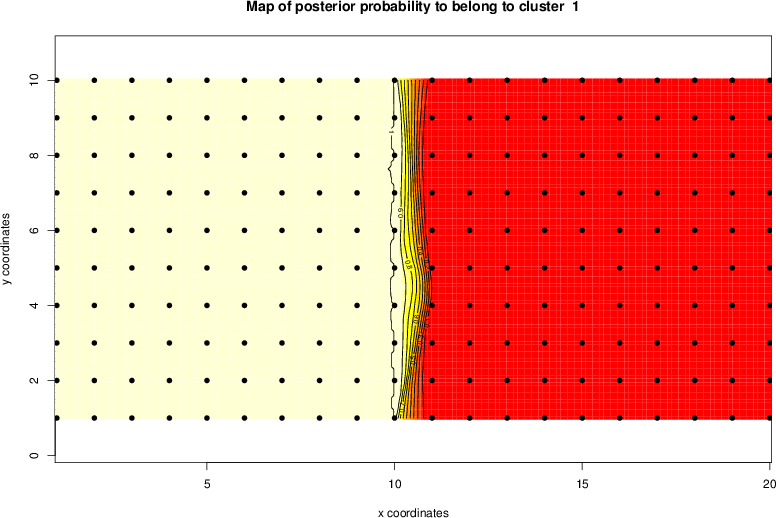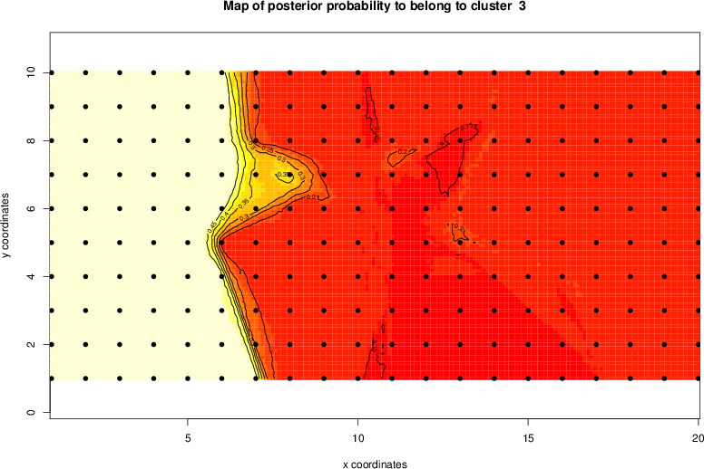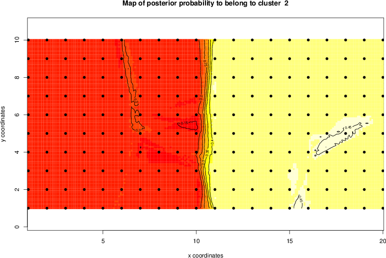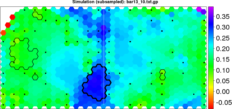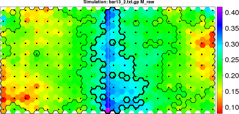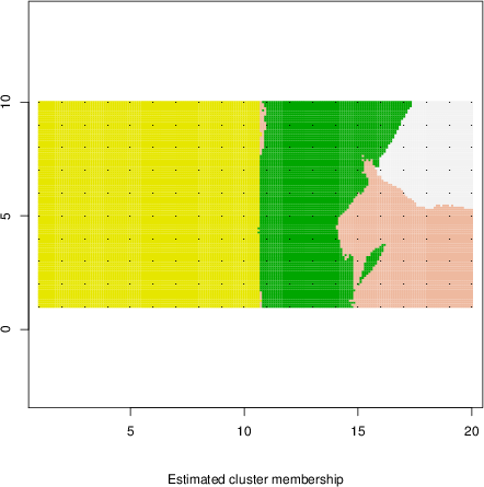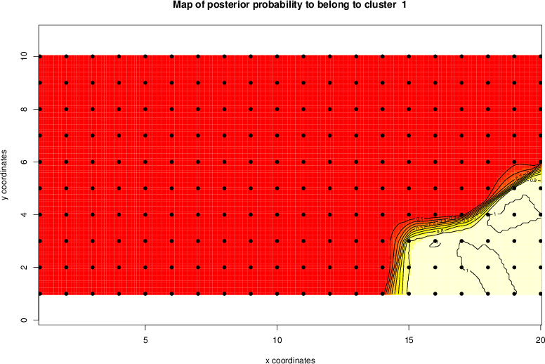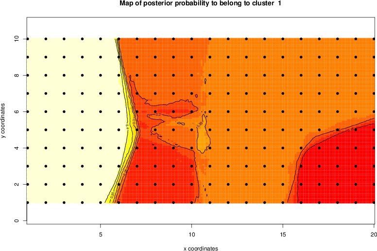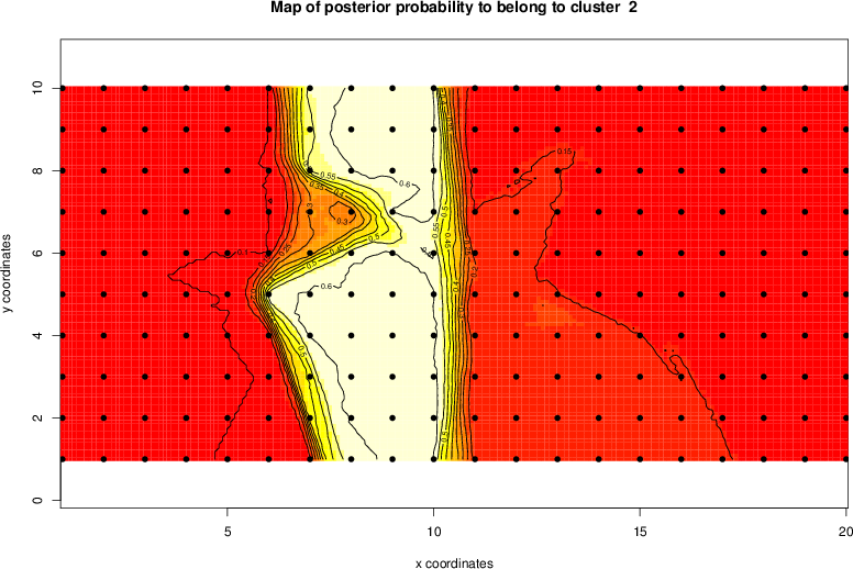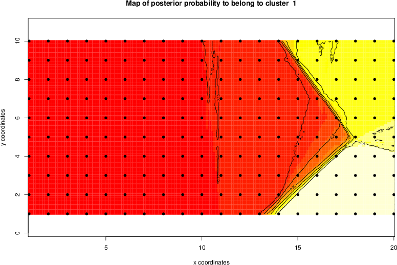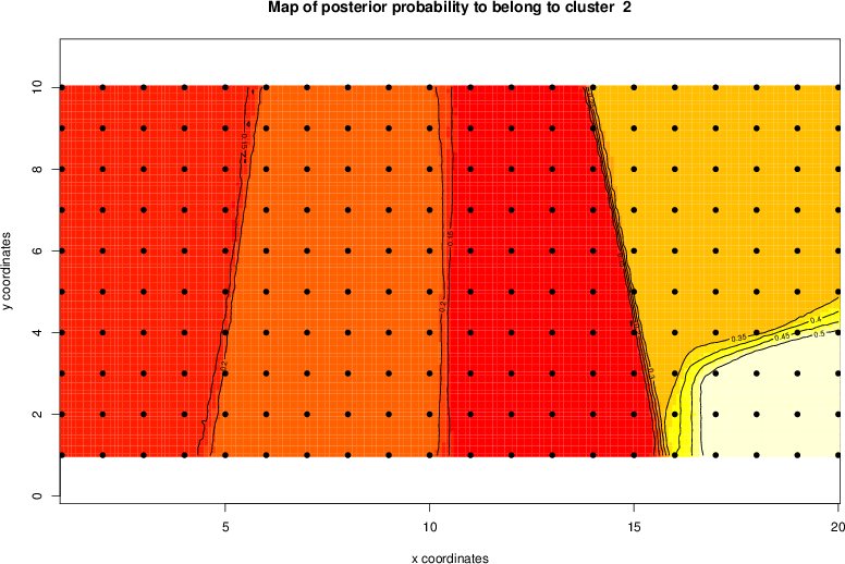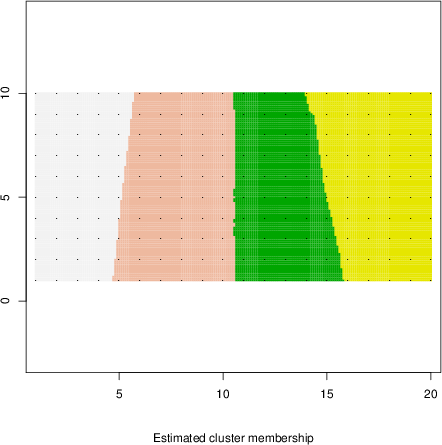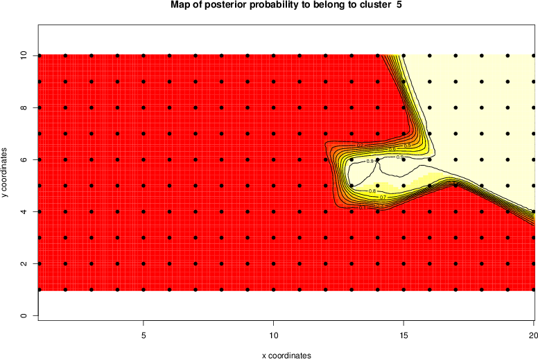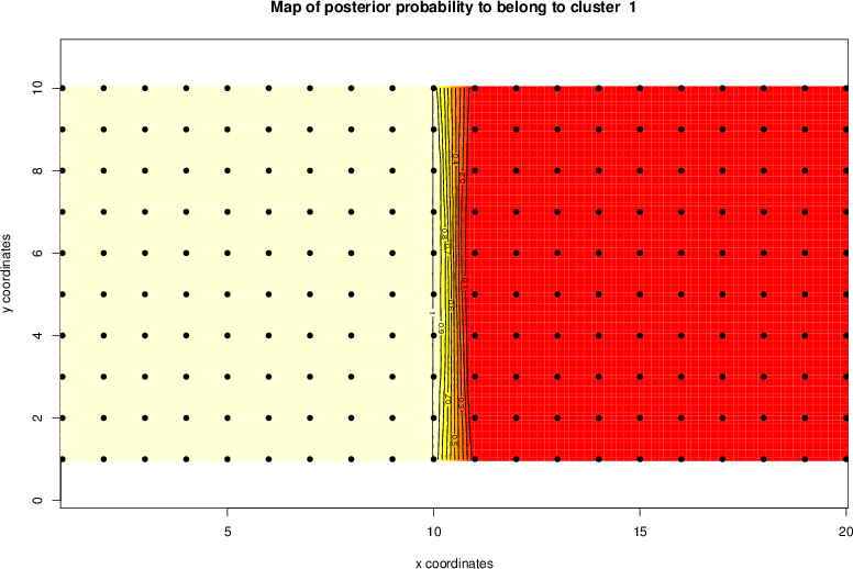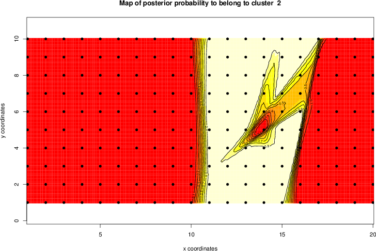 Simulated data | Geographical plots of weighted mean of all ellipse values (i.e., individual genetic distances ar of Rousset 2000) and significant barrier (cells with differentiation values higher than expected under a random distribution (no FDR applied) are materialized with thick black borders) | Idem, Benjamini-Yekutieli FDR applied | MAPI analysis (no FDR applied) with subsampled (75/200) dataset | MAPI analysis (Benjamini-Yekutieli FDR applied) with subsampled (75/200) dataset | Best probability memberships | Probability memberships for cluster 1 | Probability memberships for cluster 2 | Probability memberships for cluster 3 | Probability memberships for cluster 4 | Probability memberships for cluster 5 | Best probability memberships | Probability memberships for cluster 1 | Probability memberships for cluster 2 | Probability memberships for cluster 3 | Probability memberships for cluster 4 | Probability memberships for cluster 5 | Scatter plot showing the first two components of the DAPC (when K*>2) or density plot showing the first principal component of the DAPC (when K*=2) | Probability memberships for cluster 1 | Probability memberships for cluster 2 | Probability memberships for cluster 3 | Probability memberships for cluster 4 | Probability memberships for cluster 5 | Scatter plot showing the first two components of the DAPC (when K*>2) or density plot showing the first principal component of the DAPC (when K*=2) | Probability memberships for cluster 1 | Probability memberships for cluster 2 | Probability memberships for cluster 3 | Probability memberships for cluster 4 | Probability memberships for cluster 5 |