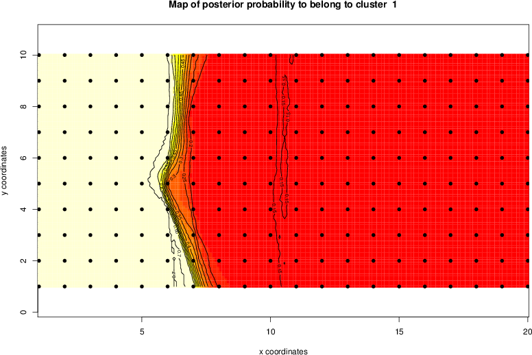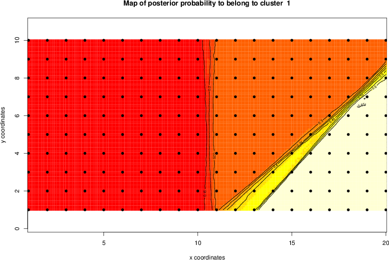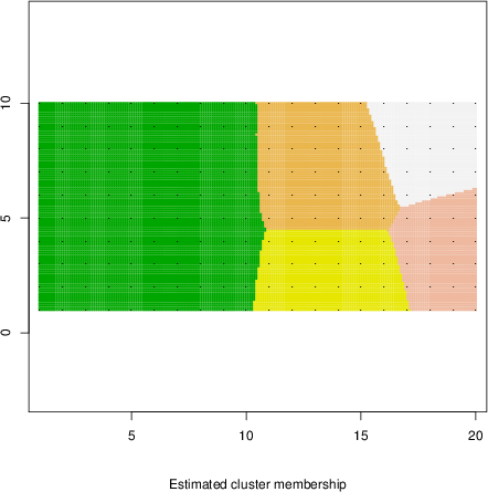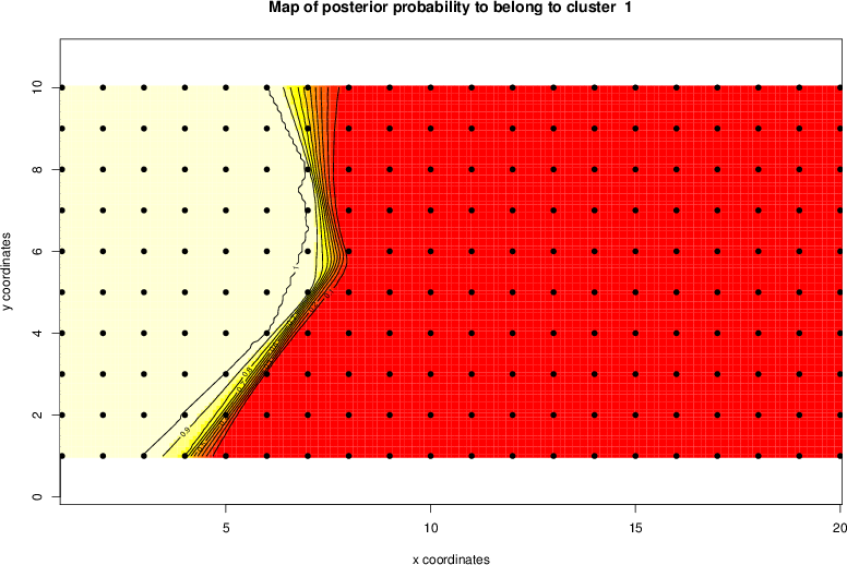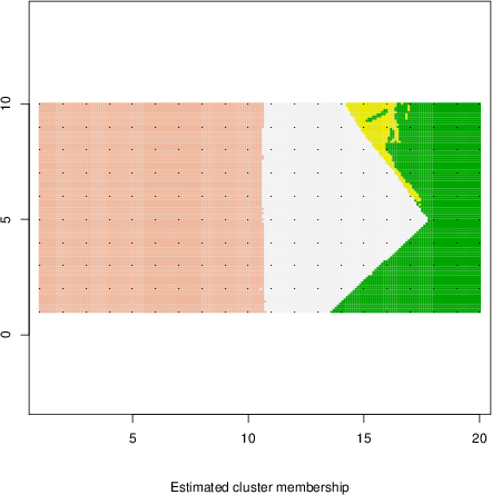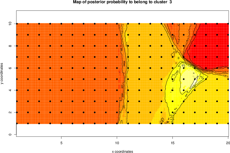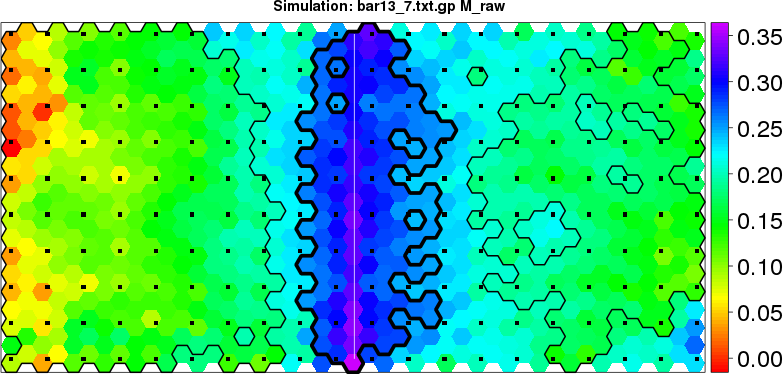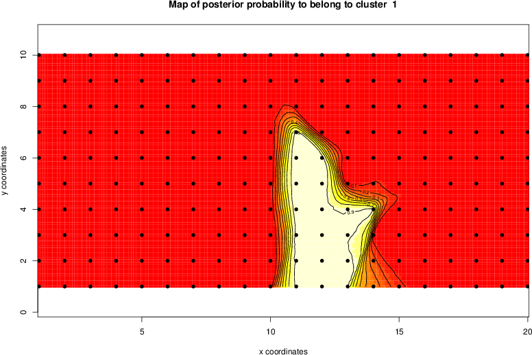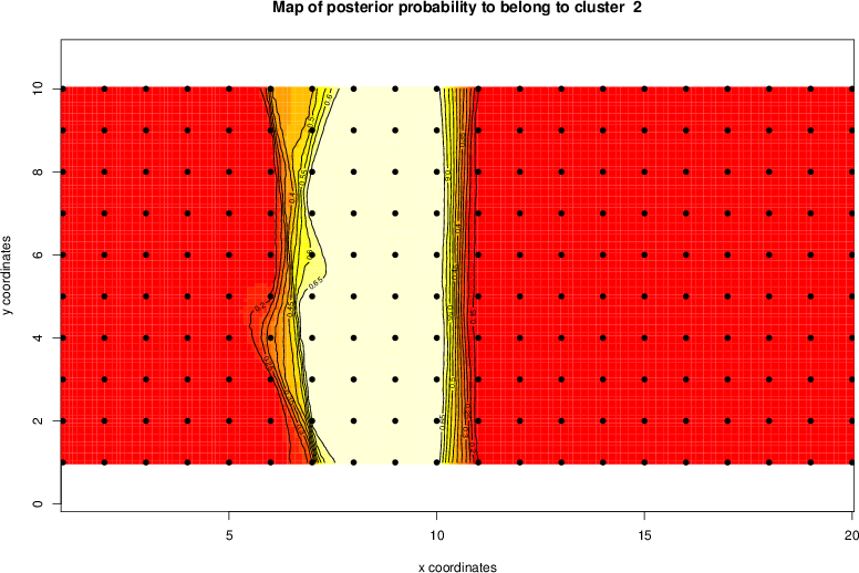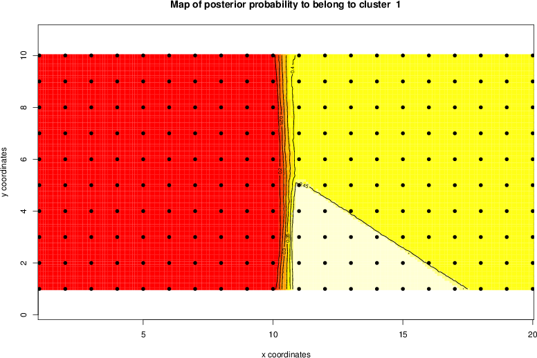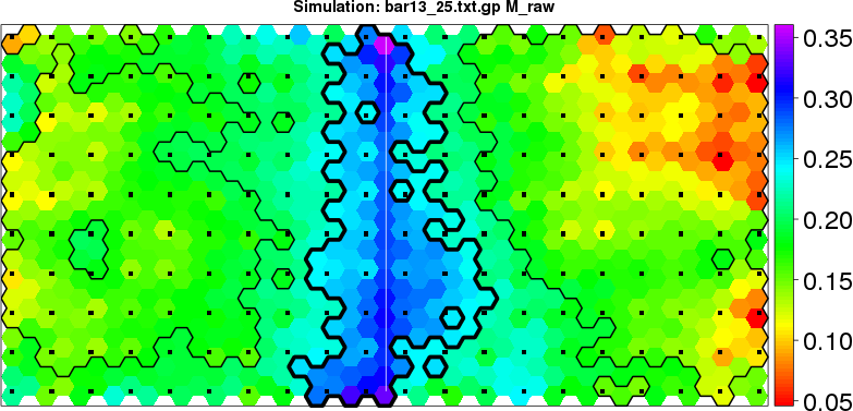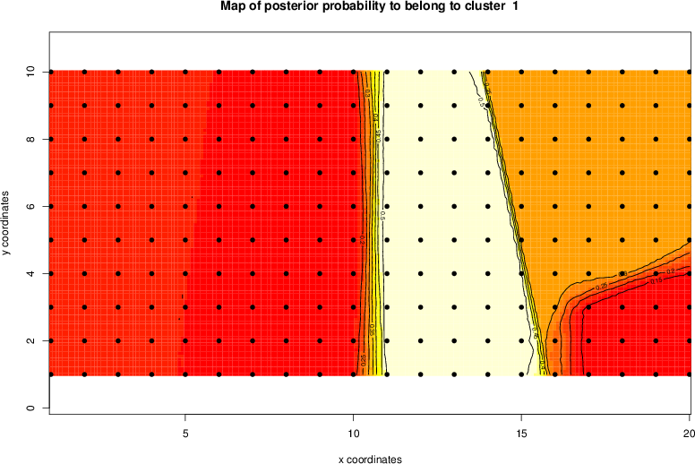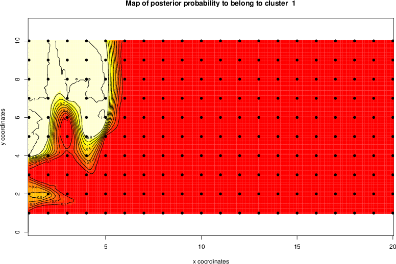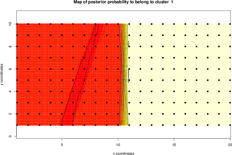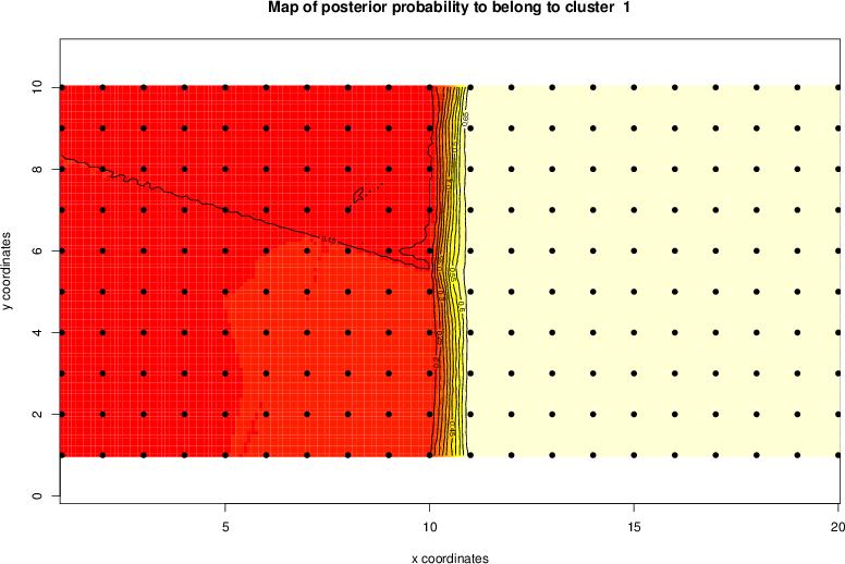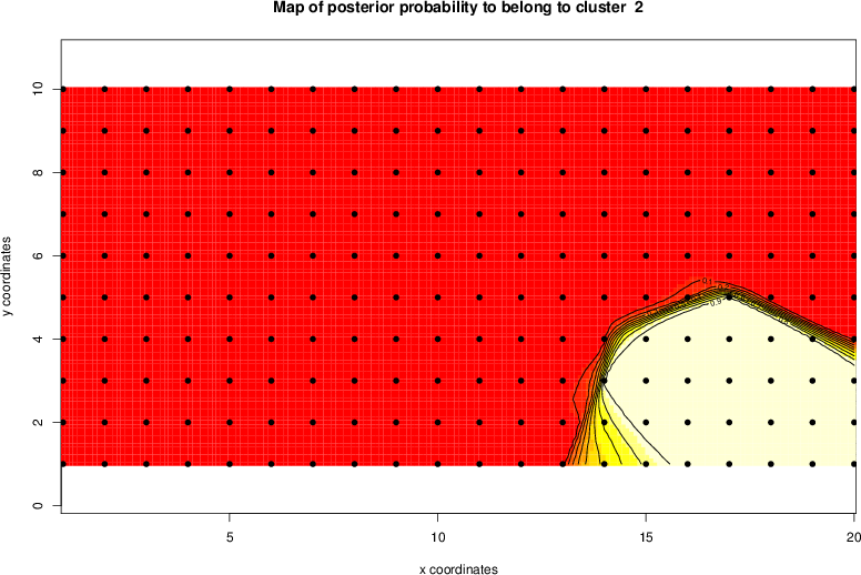 Simulated data | Geographical plots of weighted mean of all ellipse values (i.e., individual genetic distances ar of Rousset 2000) and significant barrier (cells with differentiation values higher than expected under a random distribution (no FDR applied) are materialized with thick black borders) | Idem, Benjamini-Yekutieli FDR applied | MAPI analysis (no FDR applied) with subsampled (75/200) dataset | MAPI analysis (Benjamini-Yekutieli FDR applied) with subsampled (75/200) dataset | Best probability memberships | Probability memberships for cluster 1 | Probability memberships for cluster 2 | Probability memberships for cluster 3 | Probability memberships for cluster 4 | Probability memberships for cluster 5 | Best probability memberships | Probability memberships for cluster 1 | Probability memberships for cluster 2 | Probability memberships for cluster 3 | Probability memberships for cluster 4 | Probability memberships for cluster 5 | Scatter plot showing the first two components of the DAPC (when K*>2) or density plot showing the first principal component of the DAPC (when K*=2) | Probability memberships for cluster 1 | Probability memberships for cluster 2 | Probability memberships for cluster 3 | Probability memberships for cluster 4 | Probability memberships for cluster 5 | Scatter plot showing the first two components of the DAPC (when K*>2) or density plot showing the first principal component of the DAPC (when K*=2) | Probability memberships for cluster 1 | Probability memberships for cluster 2 | Probability memberships for cluster 3 | Probability memberships for cluster 4 | Probability memberships for cluster 5 |
