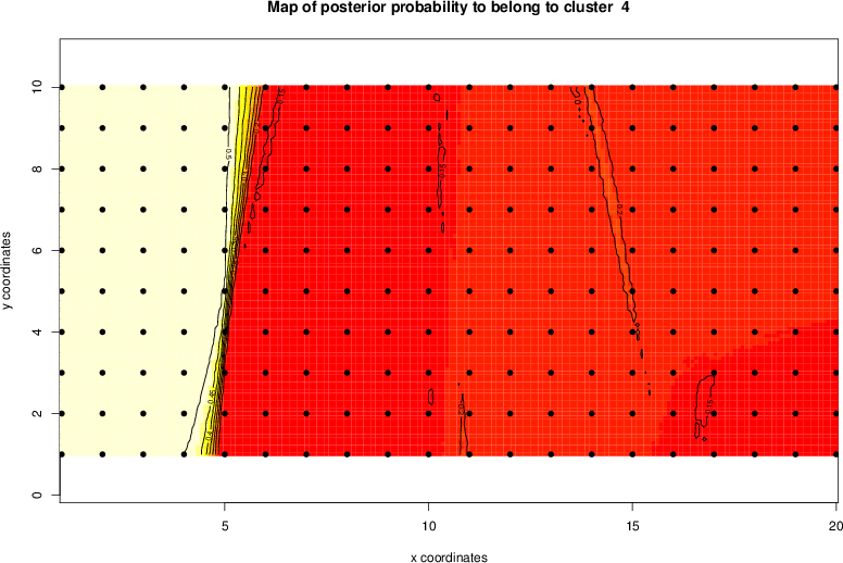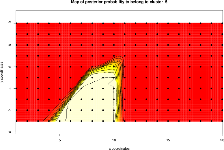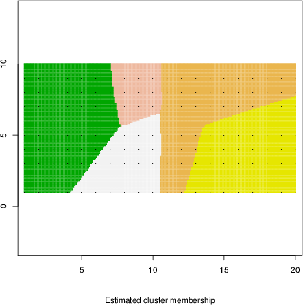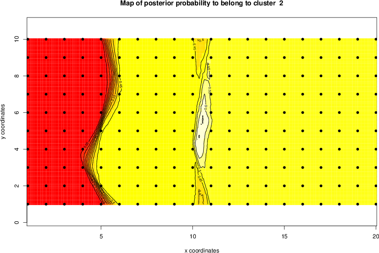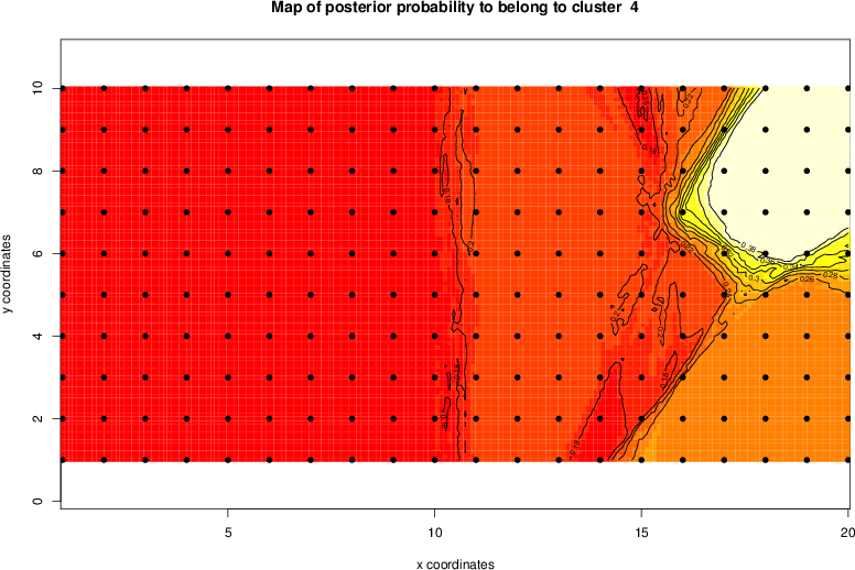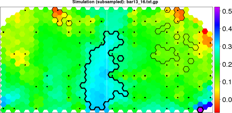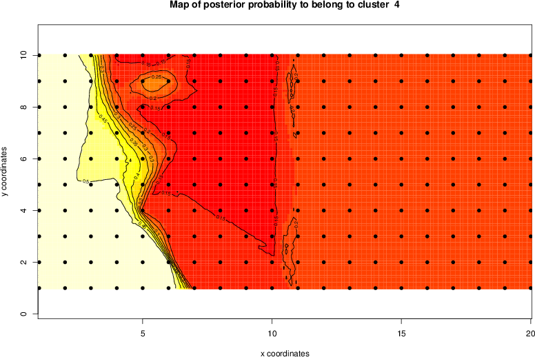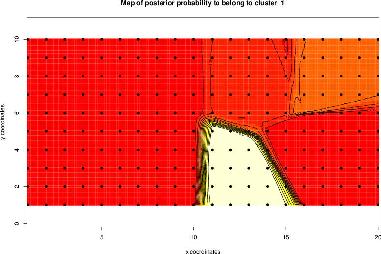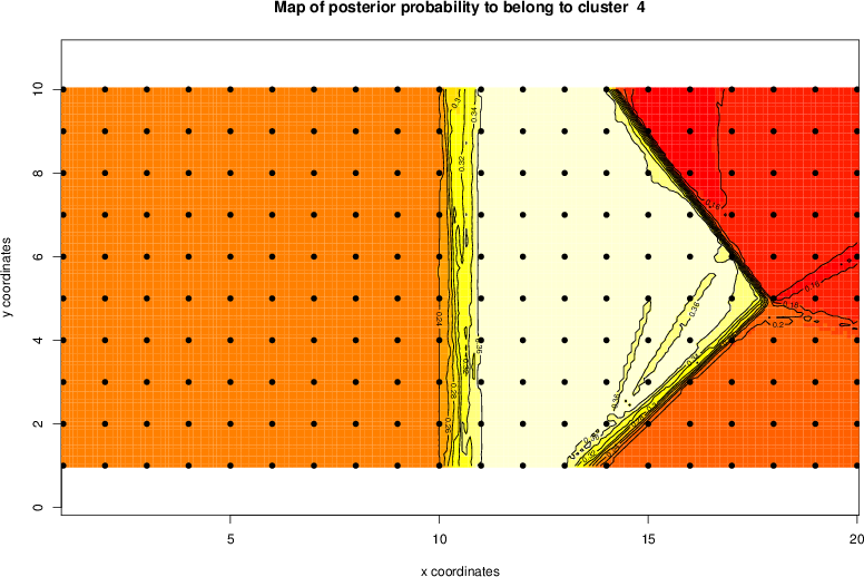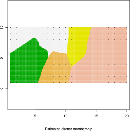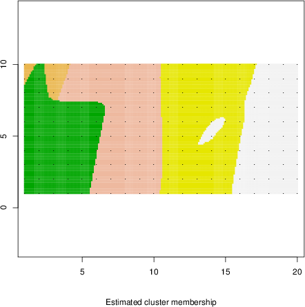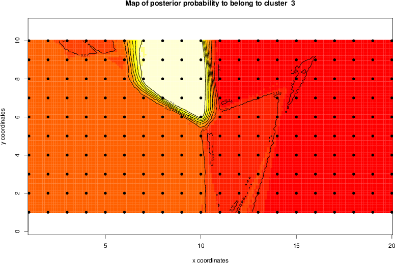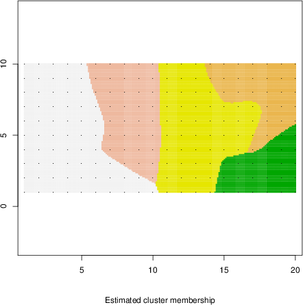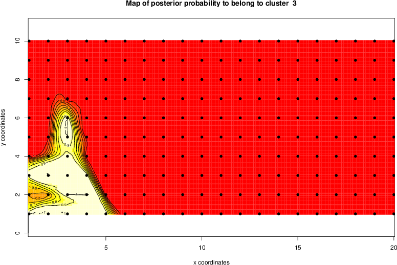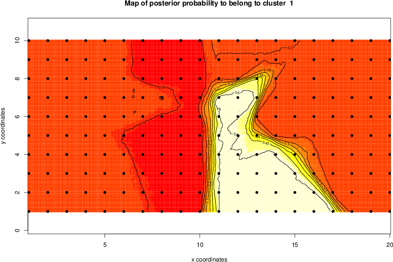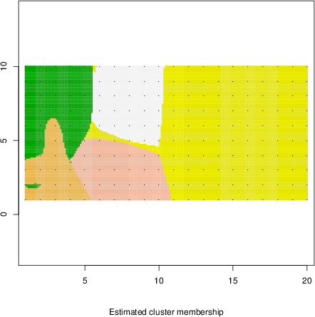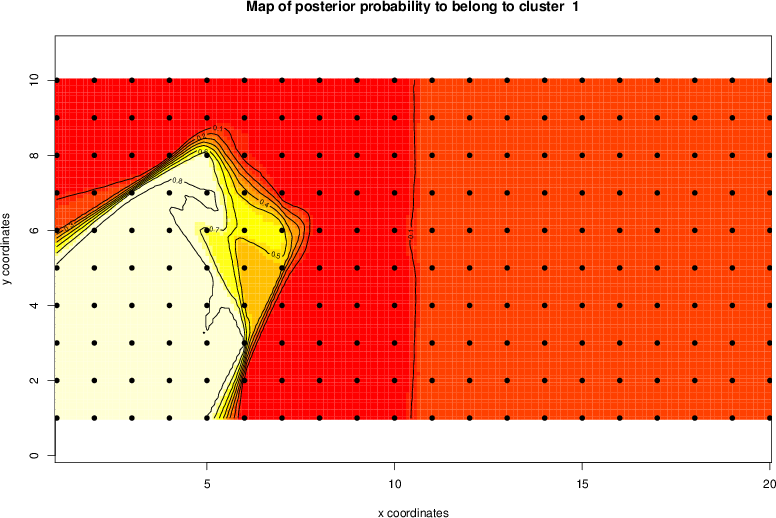 Simulated data | Geographical plots of weighted mean of all ellipse values (i.e., individual genetic distances ar of Rousset 2000) and significant barrier (cells with differentiation values higher than expected under a random distribution (no FDR applied) are materialized with thick black borders) | Idem, Benjamini-Yekutieli FDR applied | MAPI analysis (no FDR applied) with subsampled (75/200) dataset | MAPI analysis (Benjamini-Yekutieli FDR applied) with subsampled (75/200) dataset | Best probability memberships | Probability memberships for cluster 1 | Probability memberships for cluster 2 | Probability memberships for cluster 3 | Probability memberships for cluster 4 | Probability memberships for cluster 5 | Best probability memberships | Probability memberships for cluster 1 | Probability memberships for cluster 2 | Probability memberships for cluster 3 | Probability memberships for cluster 4 | Probability memberships for cluster 5 | Scatter plot showing the first two components of the DAPC (when K*>2) or density plot showing the first principal component of the DAPC (when K*=2) | Probability memberships for cluster 1 | Probability memberships for cluster 2 | Probability memberships for cluster 3 | Probability memberships for cluster 4 | Probability memberships for cluster 5 | Scatter plot showing the first two components of the DAPC (when K*>2) or density plot showing the first principal component of the DAPC (when K*=2) | Probability memberships for cluster 1 | Probability memberships for cluster 2 | Probability memberships for cluster 3 | Probability memberships for cluster 4 | Probability memberships for cluster 5 |