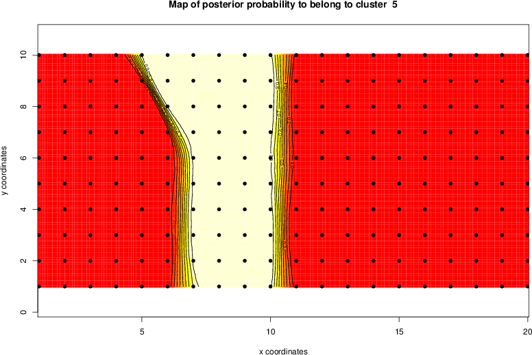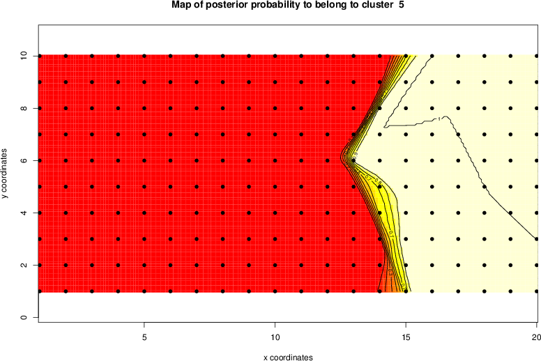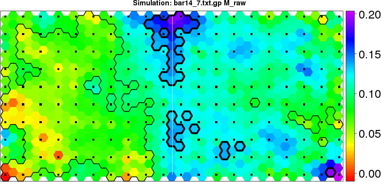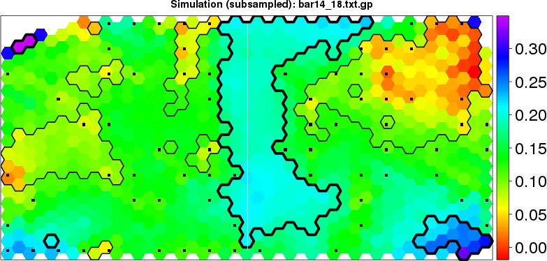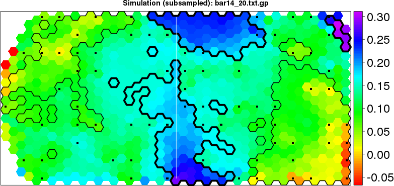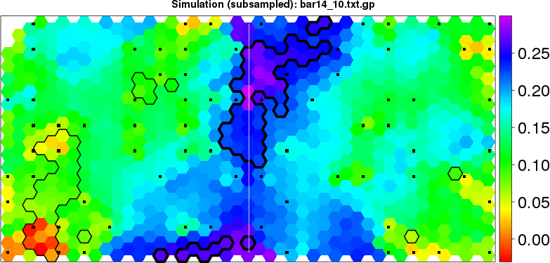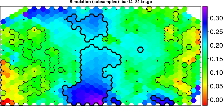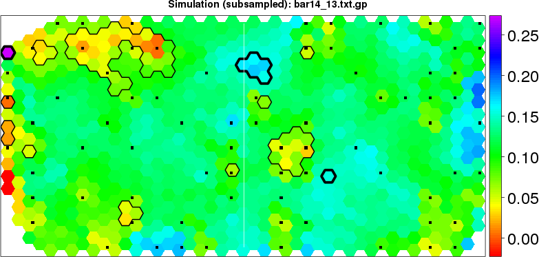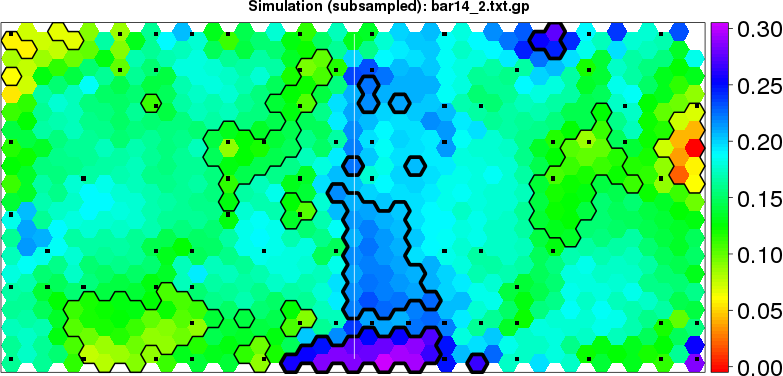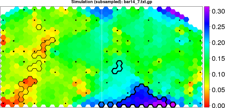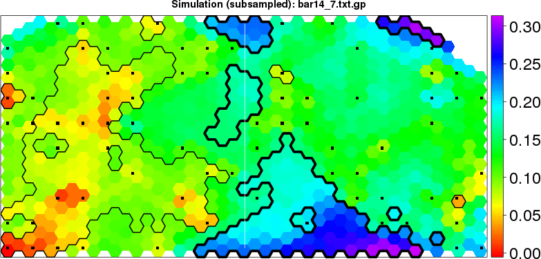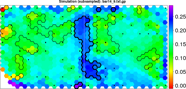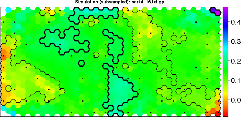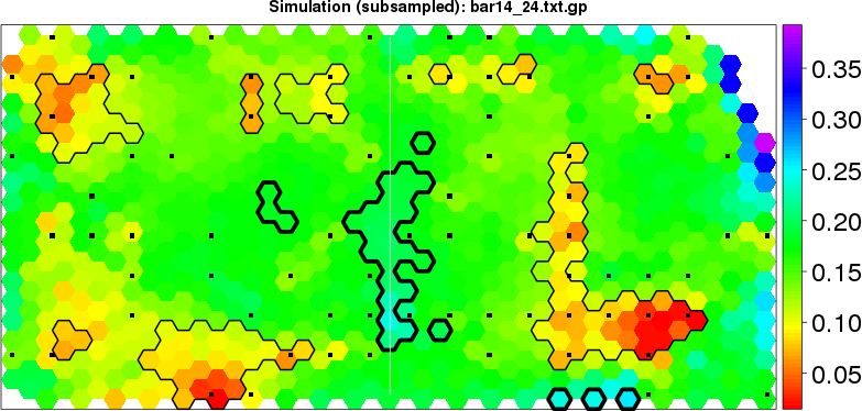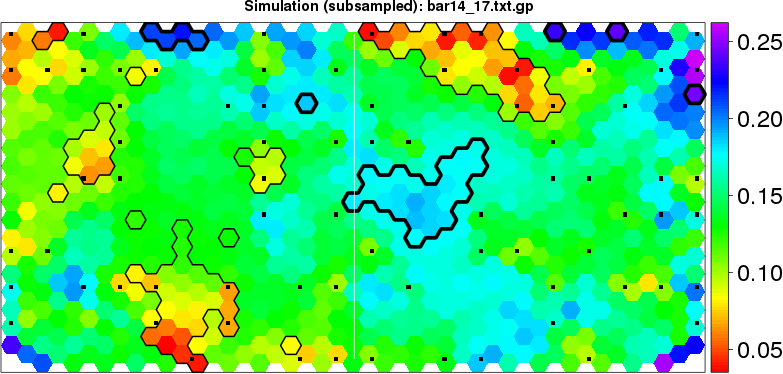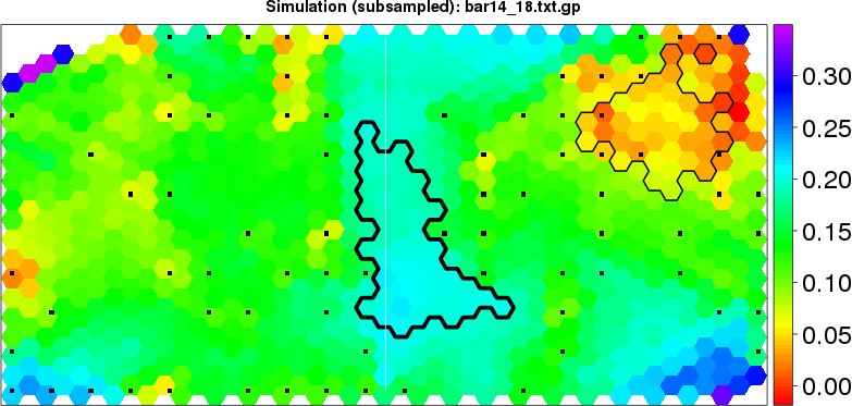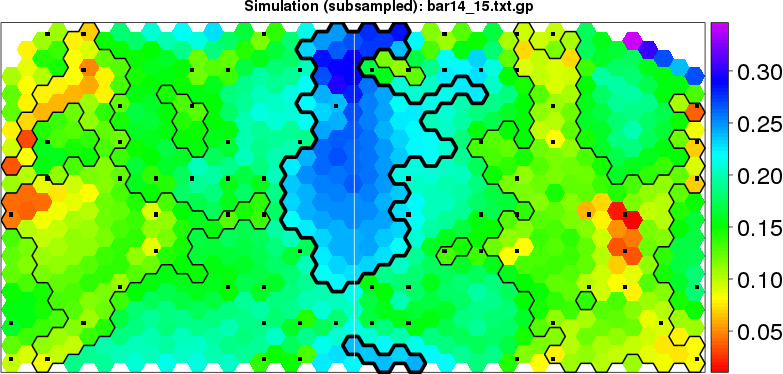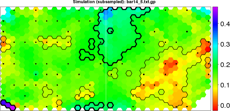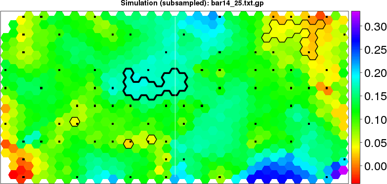 Simulated data | Geographical plots of weighted mean of all ellipse values (i.e., individual genetic distances ar of Rousset 2000) and significant barrier (cells with differentiation values higher than expected under a random distribution (no FDR applied) are materialized with thick black borders) | Idem, Benjamini-Yekutieli FDR applied | MAPI analysis (no FDR applied) with subsampled (75/200) dataset | MAPI analysis (Benjamini-Yekutieli FDR applied) with subsampled (75/200) dataset | Best probability memberships | Probability memberships for cluster 1 | Probability memberships for cluster 2 | Probability memberships for cluster 3 | Probability memberships for cluster 4 | Probability memberships for cluster 5 | Best probability memberships | Probability memberships for cluster 1 | Probability memberships for cluster 2 | Probability memberships for cluster 3 | Probability memberships for cluster 4 | Probability memberships for cluster 5 | Scatter plot showing the first two components of the DAPC (when K*>2) or density plot showing the first principal component of the DAPC (when K*=2) | Probability memberships for cluster 1 | Probability memberships for cluster 2 | Probability memberships for cluster 3 | Probability memberships for cluster 4 | Probability memberships for cluster 5 | Scatter plot showing the first two components of the DAPC (when K*>2) or density plot showing the first principal component of the DAPC (when K*=2) | Probability memberships for cluster 1 | Probability memberships for cluster 2 | Probability memberships for cluster 3 | Probability memberships for cluster 4 | Probability memberships for cluster 5 |
