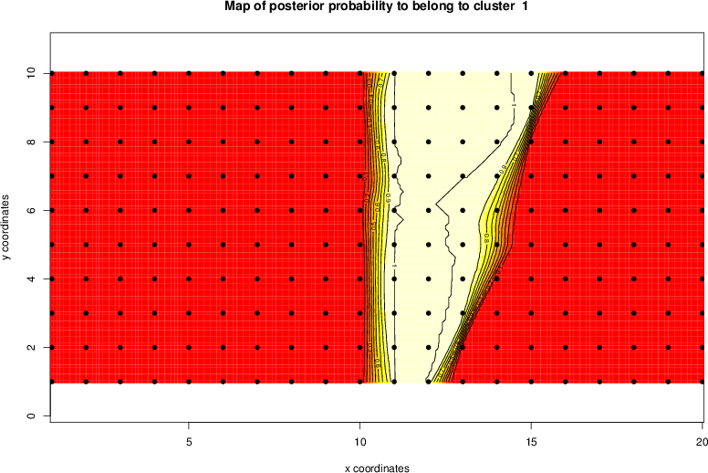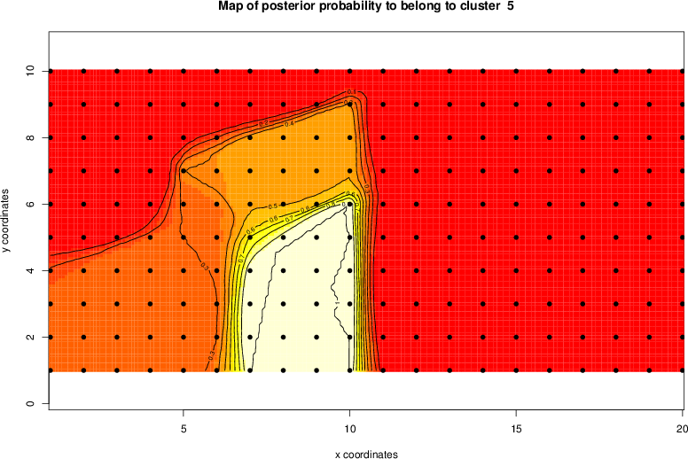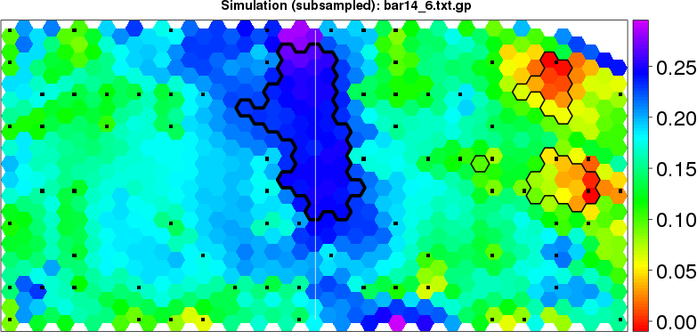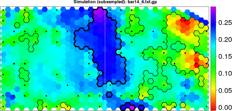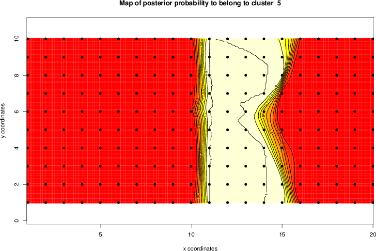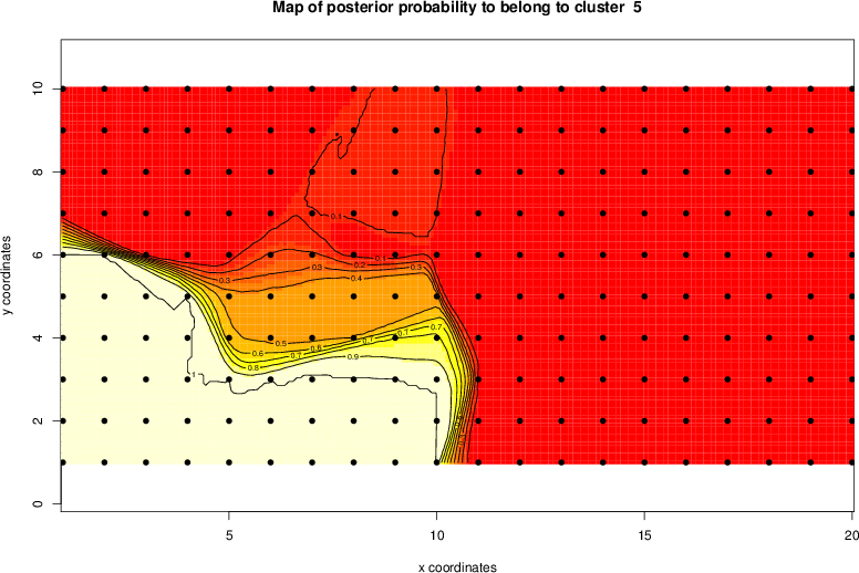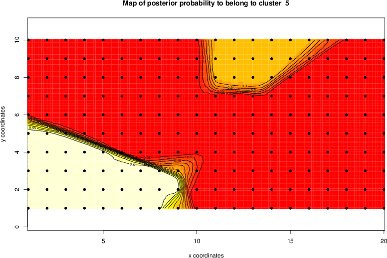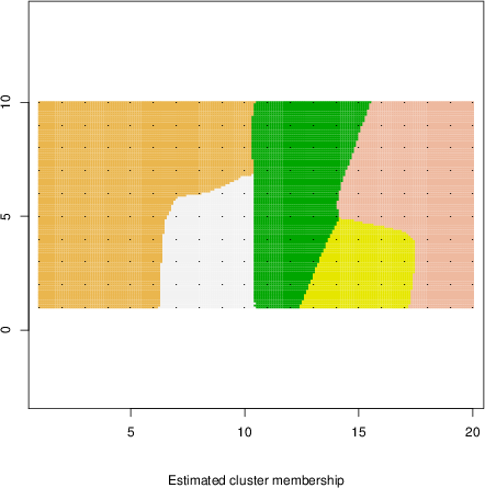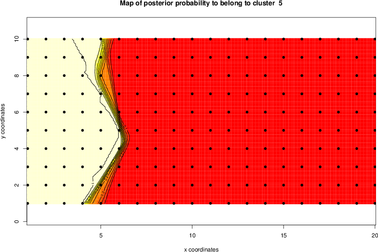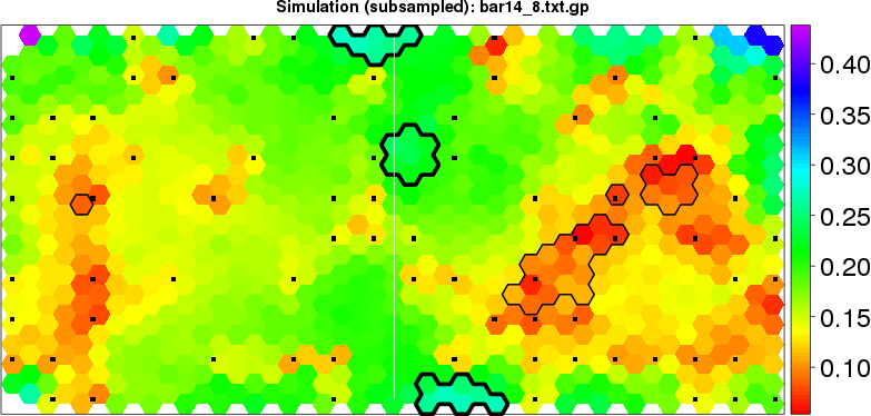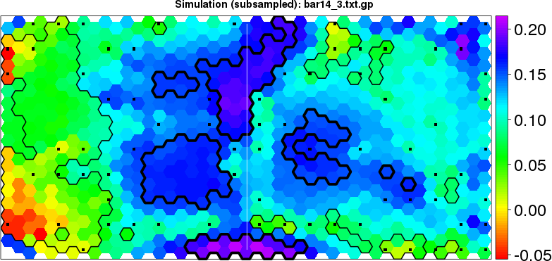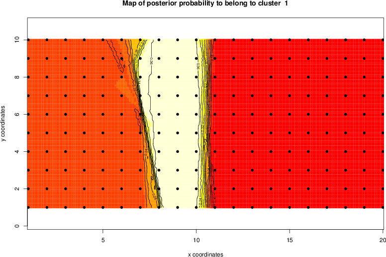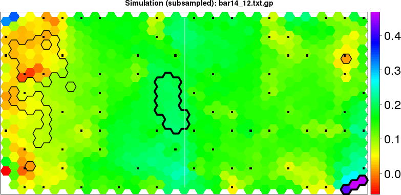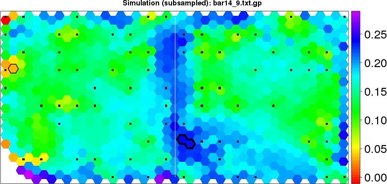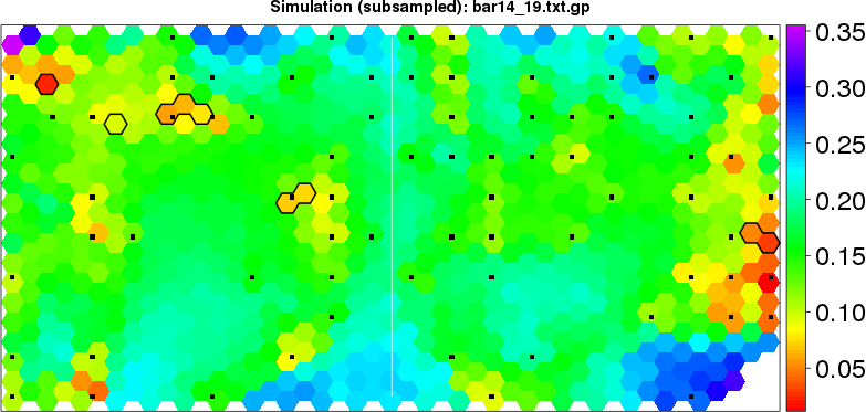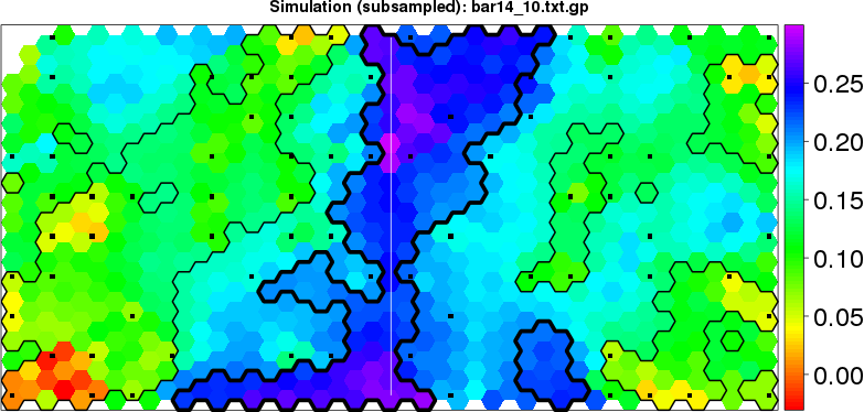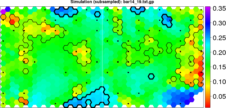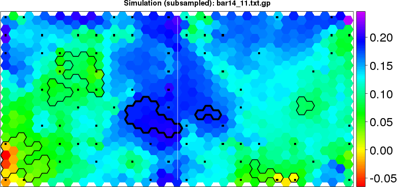 Simulated data | Geographical plots of weighted mean of all ellipse values (i.e., individual genetic distances ar of Rousset 2000) and significant barrier (cells with differentiation values higher than expected under a random distribution (no FDR applied) are materialized with thick black borders) | Idem, Benjamini-Yekutieli FDR applied | MAPI analysis (no FDR applied) with subsampled (75/200) dataset | MAPI analysis (Benjamini-Yekutieli FDR applied) with subsampled (75/200) dataset | Best probability memberships | Probability memberships for cluster 1 | Probability memberships for cluster 2 | Probability memberships for cluster 3 | Probability memberships for cluster 4 | Probability memberships for cluster 5 | Best probability memberships | Probability memberships for cluster 1 | Probability memberships for cluster 2 | Probability memberships for cluster 3 | Probability memberships for cluster 4 | Probability memberships for cluster 5 | Scatter plot showing the first two components of the DAPC (when K*>2) or density plot showing the first principal component of the DAPC (when K*=2) | Probability memberships for cluster 1 | Probability memberships for cluster 2 | Probability memberships for cluster 3 | Probability memberships for cluster 4 | Probability memberships for cluster 5 | Scatter plot showing the first two components of the DAPC (when K*>2) or density plot showing the first principal component of the DAPC (when K*=2) | Probability memberships for cluster 1 | Probability memberships for cluster 2 | Probability memberships for cluster 3 | Probability memberships for cluster 4 | Probability memberships for cluster 5 |