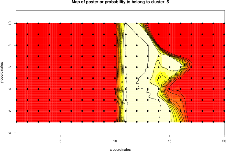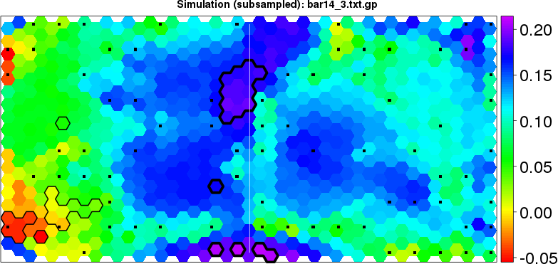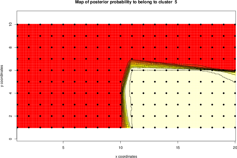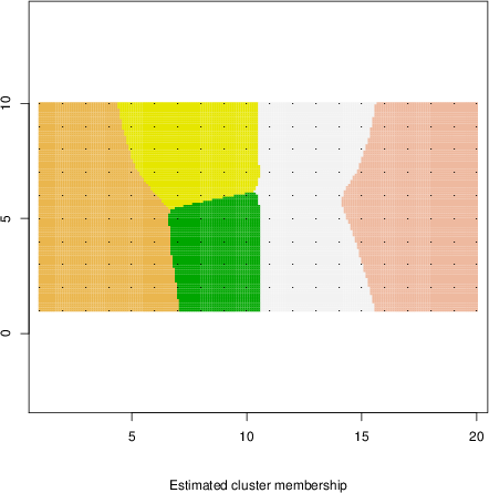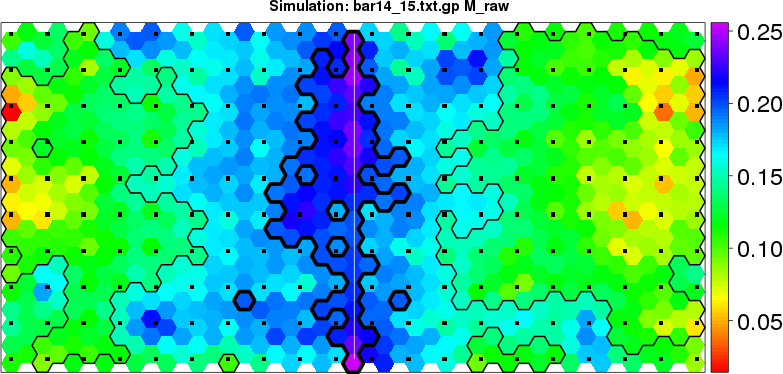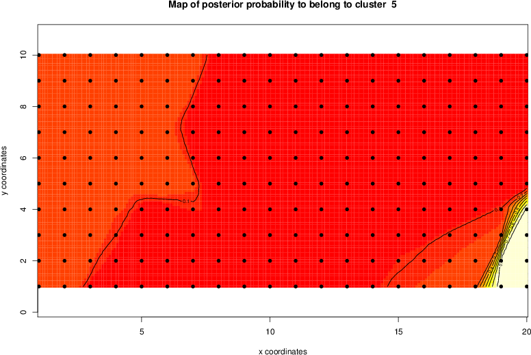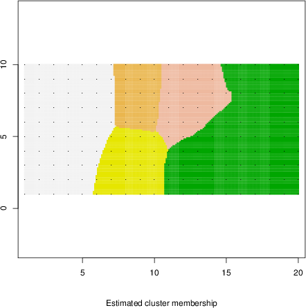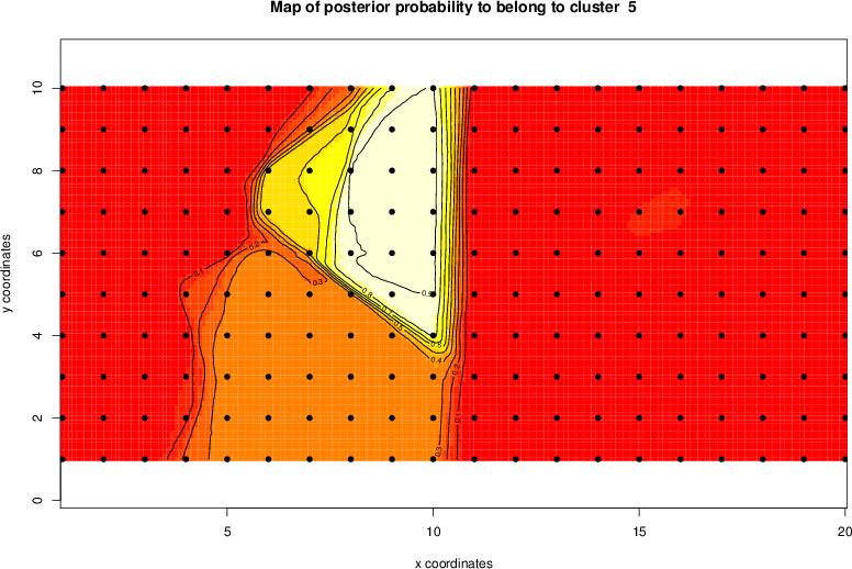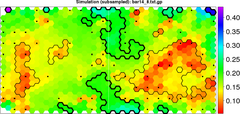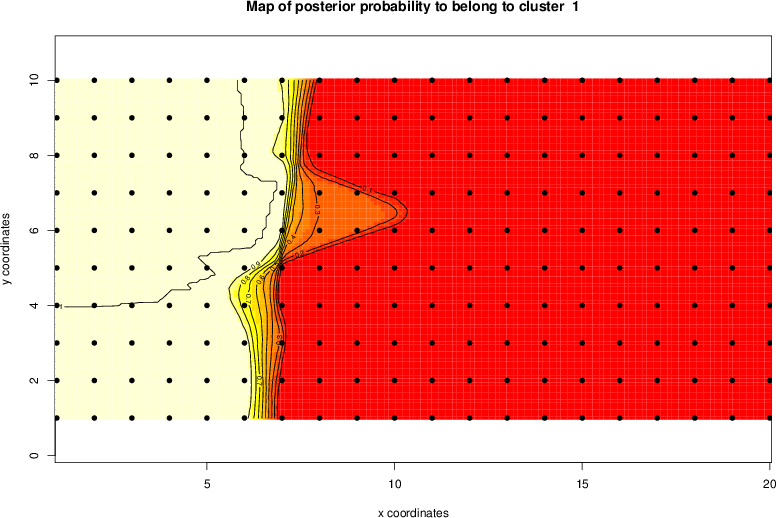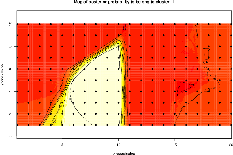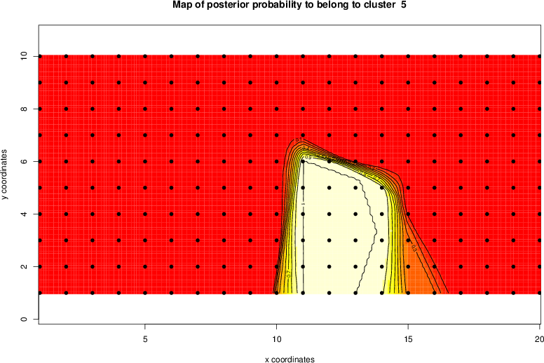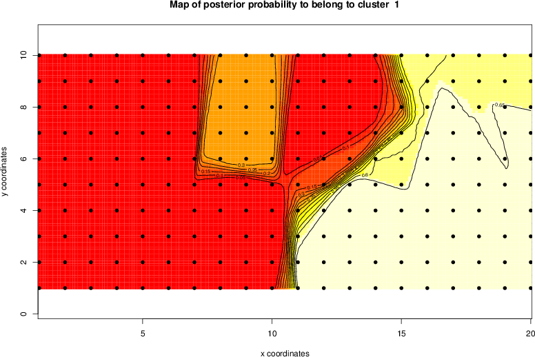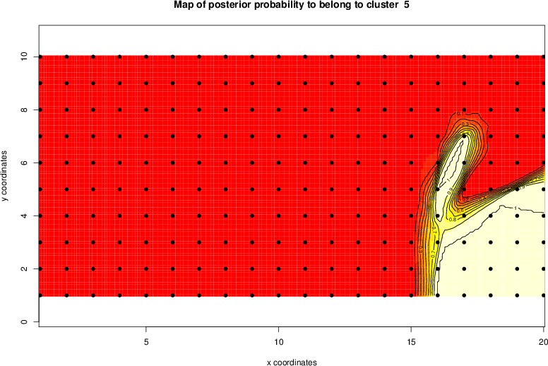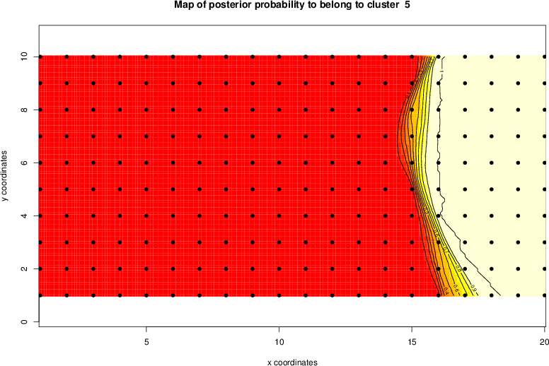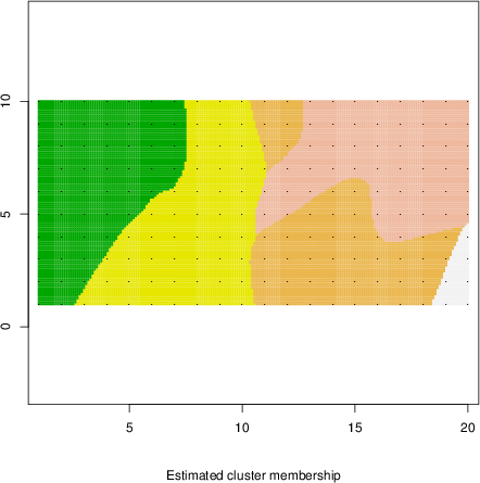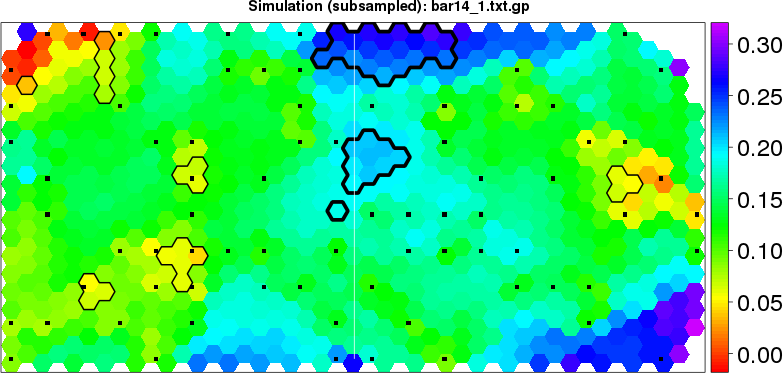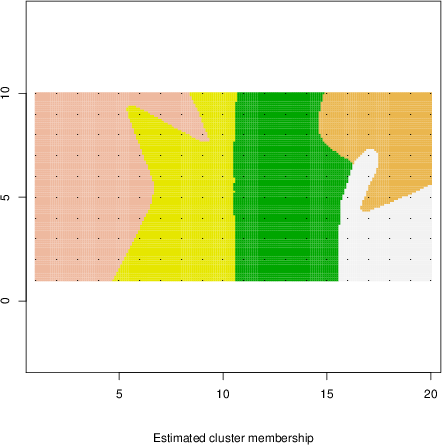 Simulated data | Geographical plots of weighted mean of all ellipse values (i.e., individual genetic distances ar of Rousset 2000) and significant barrier (cells with differentiation values higher than expected under a random distribution (no FDR applied) are materialized with thick black borders) | Idem, Benjamini-Yekutieli FDR applied | MAPI analysis (no FDR applied) with subsampled (75/200) dataset | MAPI analysis (Benjamini-Yekutieli FDR applied) with subsampled (75/200) dataset | Best probability memberships | Probability memberships for cluster 1 | Probability memberships for cluster 2 | Probability memberships for cluster 3 | Probability memberships for cluster 4 | Probability memberships for cluster 5 | Best probability memberships | Probability memberships for cluster 1 | Probability memberships for cluster 2 | Probability memberships for cluster 3 | Probability memberships for cluster 4 | Probability memberships for cluster 5 | Scatter plot showing the first two components of the DAPC (when K*>2) or density plot showing the first principal component of the DAPC (when K*=2) | Probability memberships for cluster 1 | Probability memberships for cluster 2 | Probability memberships for cluster 3 | Probability memberships for cluster 4 | Probability memberships for cluster 5 | Scatter plot showing the first two components of the DAPC (when K*>2) or density plot showing the first principal component of the DAPC (when K*=2) | Probability memberships for cluster 1 | Probability memberships for cluster 2 | Probability memberships for cluster 3 | Probability memberships for cluster 4 | Probability memberships for cluster 5 |