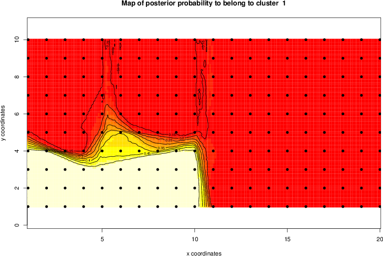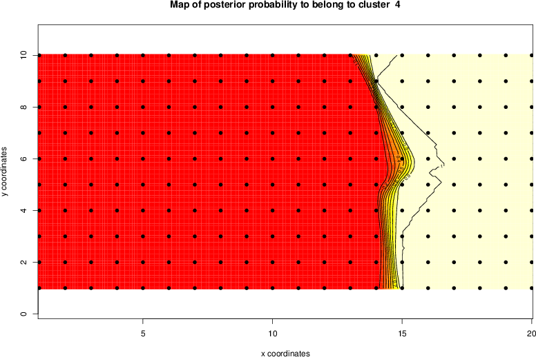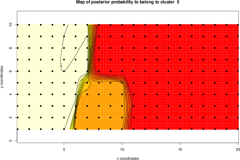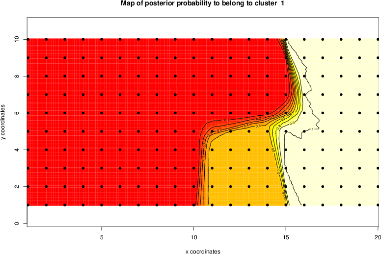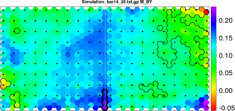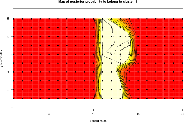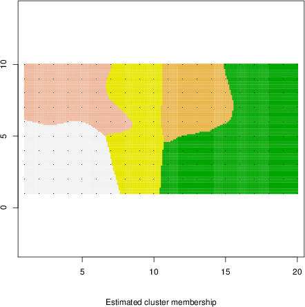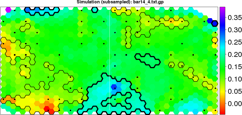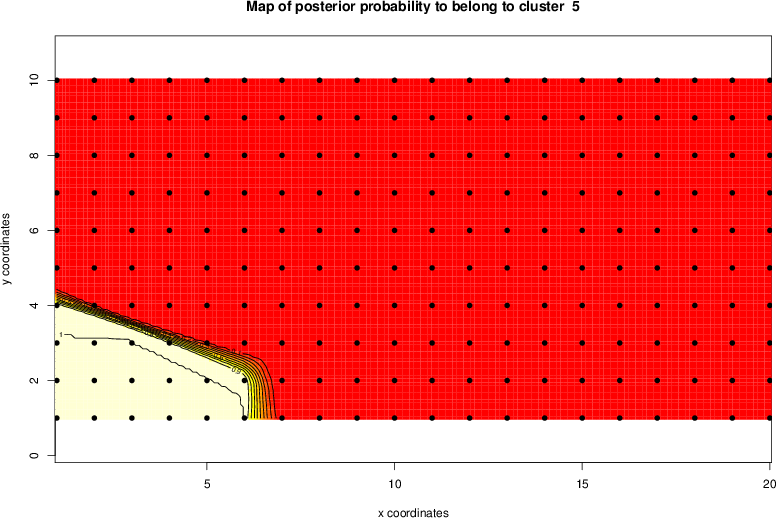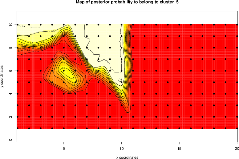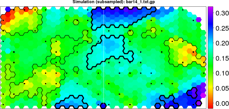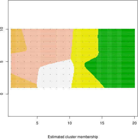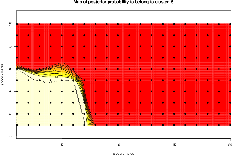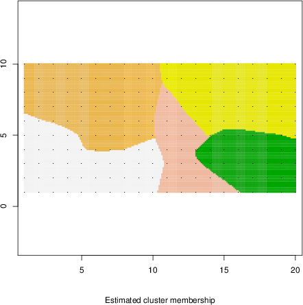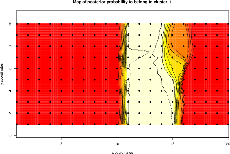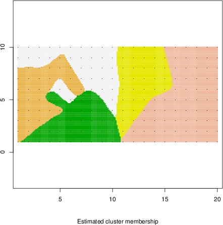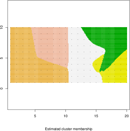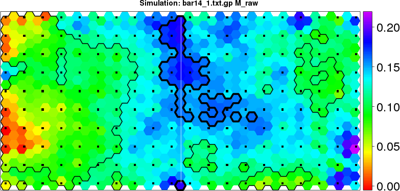 Simulated data | Geographical plots of weighted mean of all ellipse values (i.e., individual genetic distances ar of Rousset 2000) and significant barrier (cells with differentiation values higher than expected under a random distribution (no FDR applied) are materialized with thick black borders) | Idem, Benjamini-Yekutieli FDR applied | MAPI analysis (no FDR applied) with subsampled (75/200) dataset | MAPI analysis (Benjamini-Yekutieli FDR applied) with subsampled (75/200) dataset | Best probability memberships | Probability memberships for cluster 1 | Probability memberships for cluster 2 | Probability memberships for cluster 3 | Probability memberships for cluster 4 | Probability memberships for cluster 5 | Best probability memberships | Probability memberships for cluster 1 | Probability memberships for cluster 2 | Probability memberships for cluster 3 | Probability memberships for cluster 4 | Probability memberships for cluster 5 | Scatter plot showing the first two components of the DAPC (when K*>2) or density plot showing the first principal component of the DAPC (when K*=2) | Probability memberships for cluster 1 | Probability memberships for cluster 2 | Probability memberships for cluster 3 | Probability memberships for cluster 4 | Probability memberships for cluster 5 | Scatter plot showing the first two components of the DAPC (when K*>2) or density plot showing the first principal component of the DAPC (when K*=2) | Probability memberships for cluster 1 | Probability memberships for cluster 2 | Probability memberships for cluster 3 | Probability memberships for cluster 4 | Probability memberships for cluster 5 |
