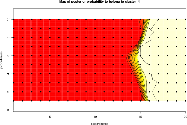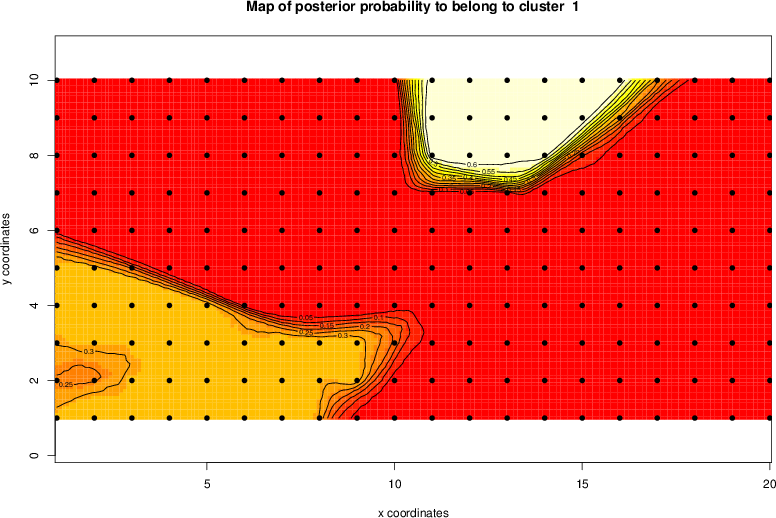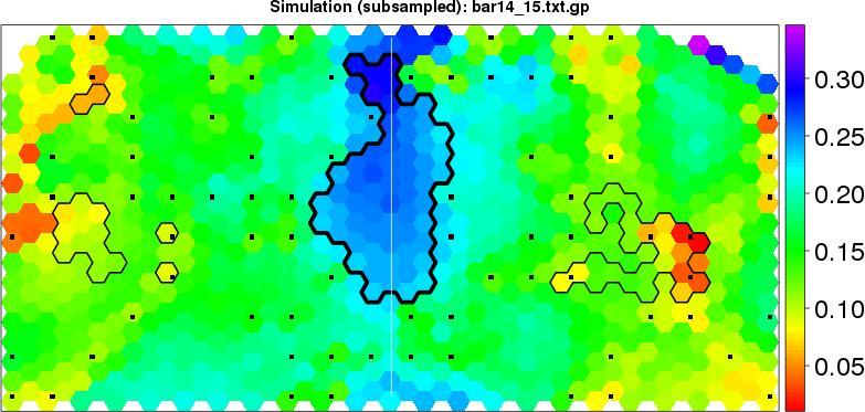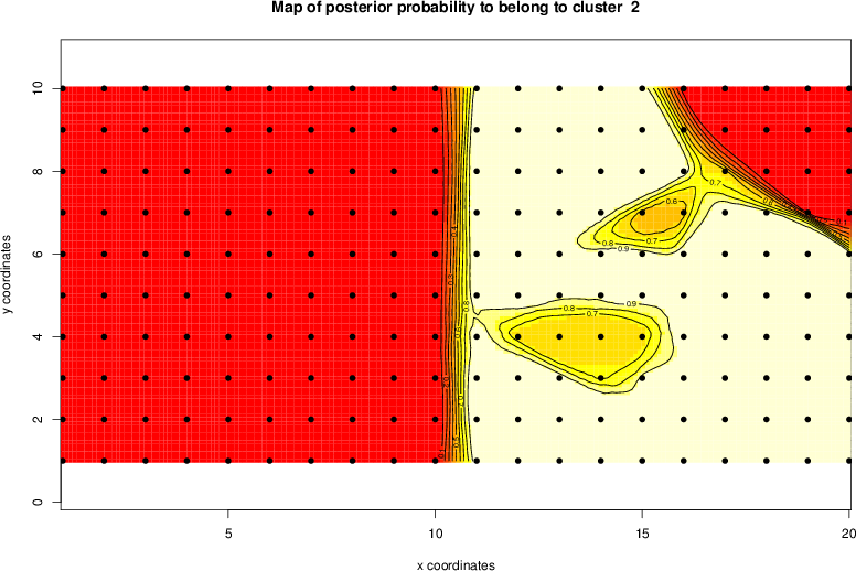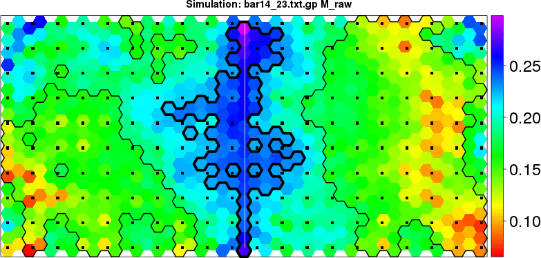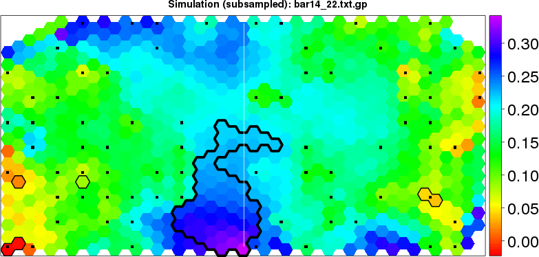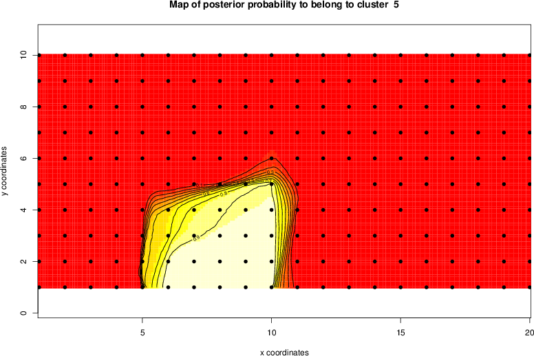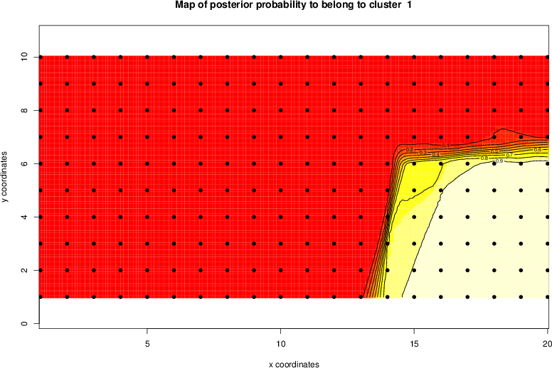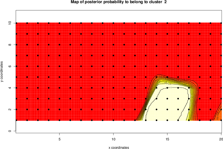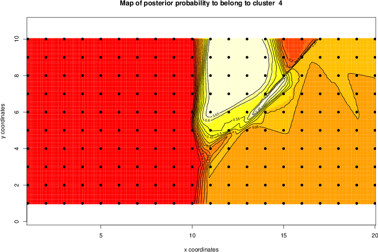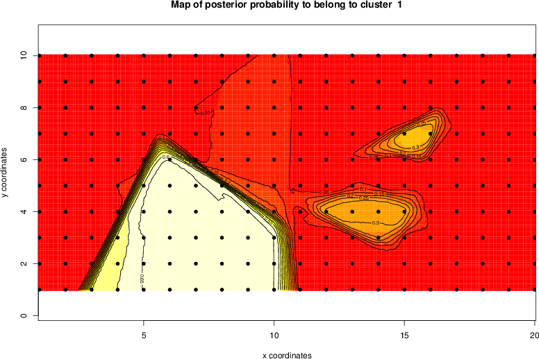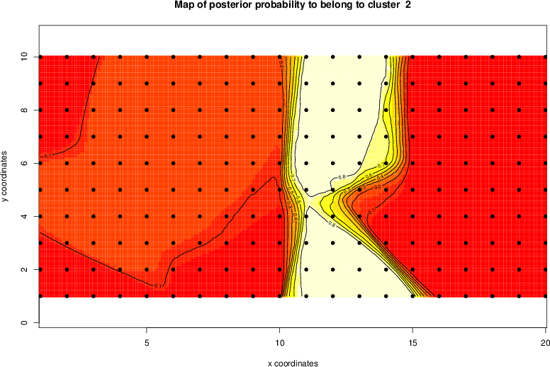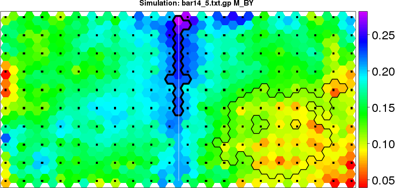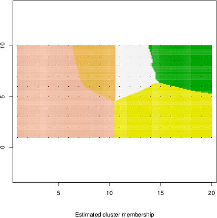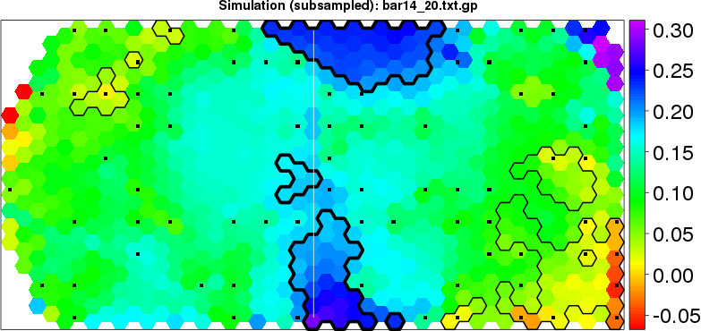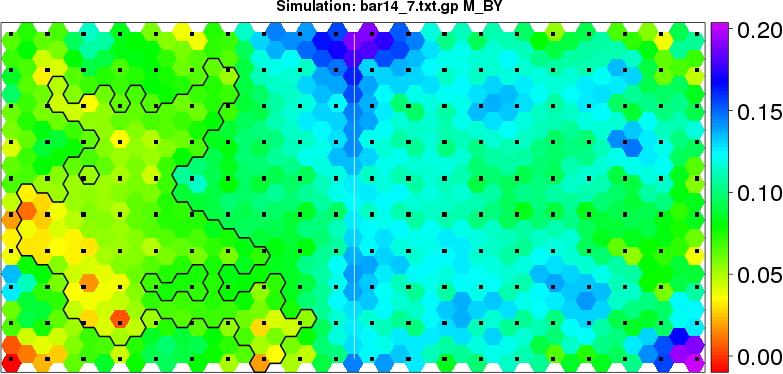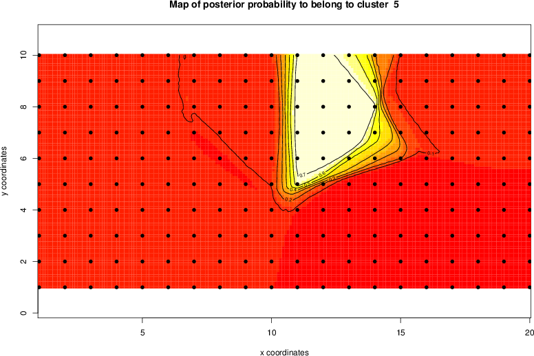 Simulated data | Geographical plots of weighted mean of all ellipse values (i.e., individual genetic distances ar of Rousset 2000) and significant barrier (cells with differentiation values higher than expected under a random distribution (no FDR applied) are materialized with thick black borders) | Idem, Benjamini-Yekutieli FDR applied | MAPI analysis (no FDR applied) with subsampled (75/200) dataset | MAPI analysis (Benjamini-Yekutieli FDR applied) with subsampled (75/200) dataset | Best probability memberships | Probability memberships for cluster 1 | Probability memberships for cluster 2 | Probability memberships for cluster 3 | Probability memberships for cluster 4 | Probability memberships for cluster 5 | Best probability memberships | Probability memberships for cluster 1 | Probability memberships for cluster 2 | Probability memberships for cluster 3 | Probability memberships for cluster 4 | Probability memberships for cluster 5 | Scatter plot showing the first two components of the DAPC (when K*>2) or density plot showing the first principal component of the DAPC (when K*=2) | Probability memberships for cluster 1 | Probability memberships for cluster 2 | Probability memberships for cluster 3 | Probability memberships for cluster 4 | Probability memberships for cluster 5 | Scatter plot showing the first two components of the DAPC (when K*>2) or density plot showing the first principal component of the DAPC (when K*=2) | Probability memberships for cluster 1 | Probability memberships for cluster 2 | Probability memberships for cluster 3 | Probability memberships for cluster 4 | Probability memberships for cluster 5 |