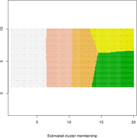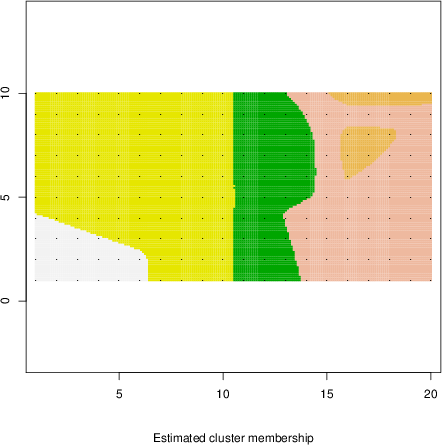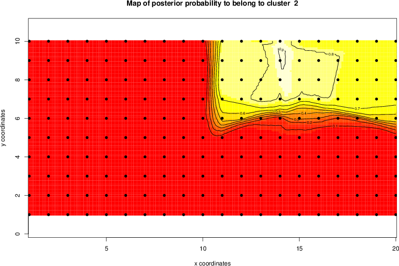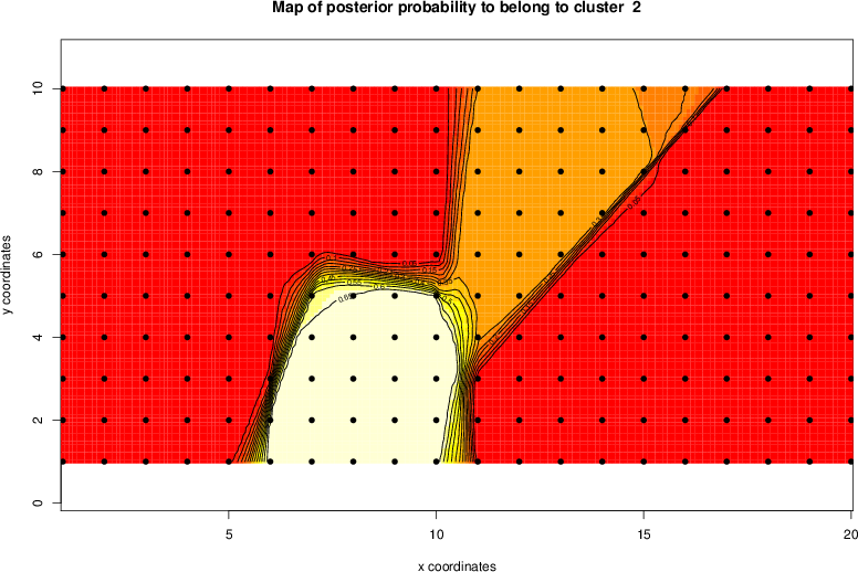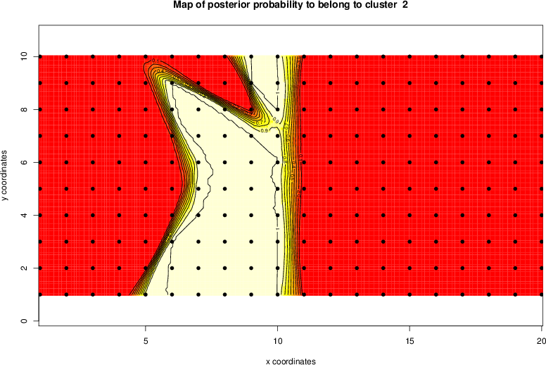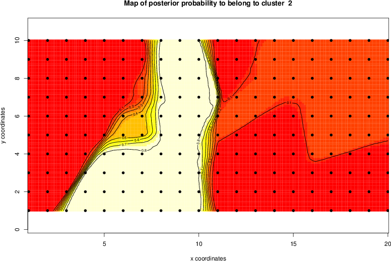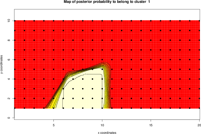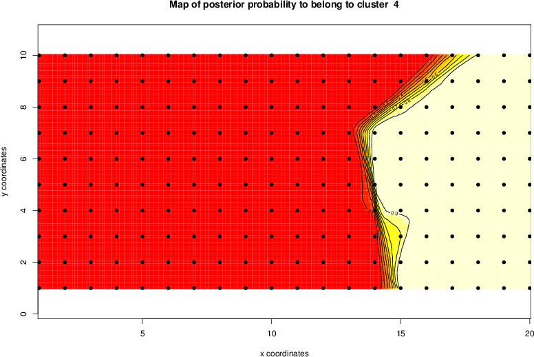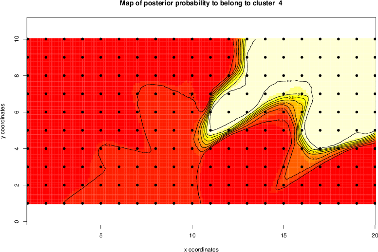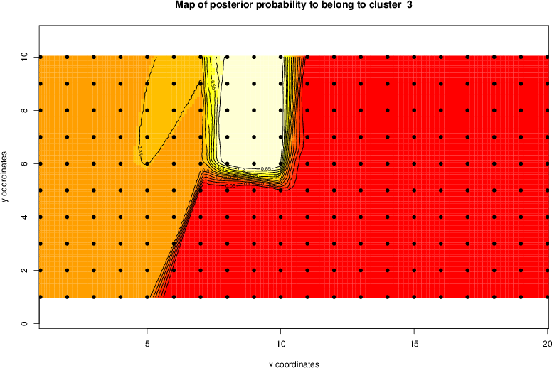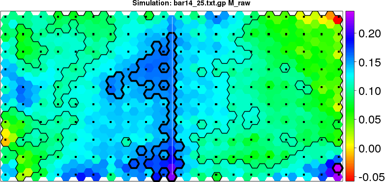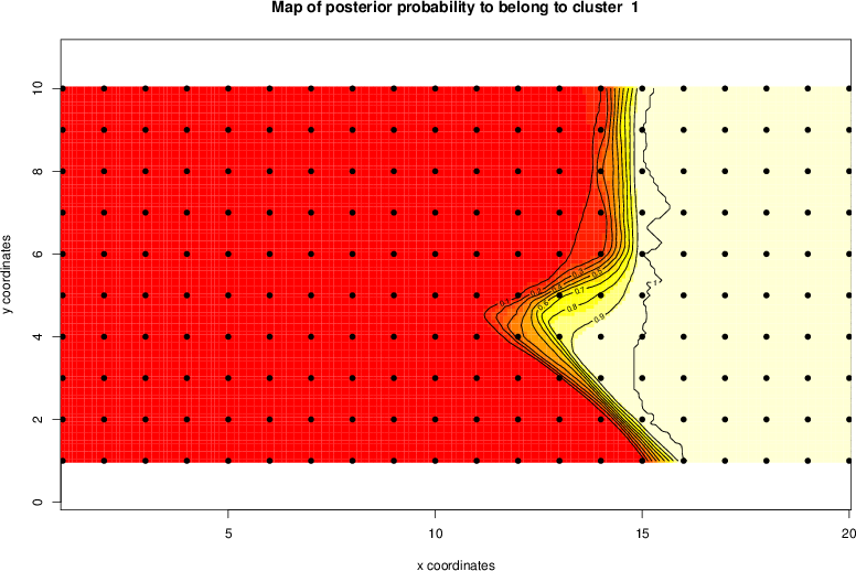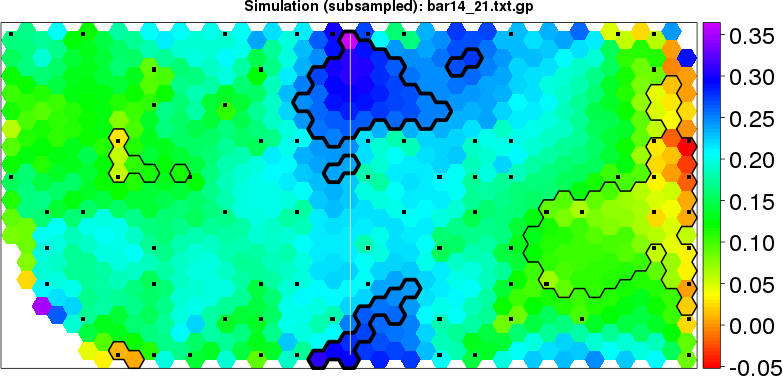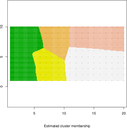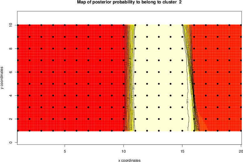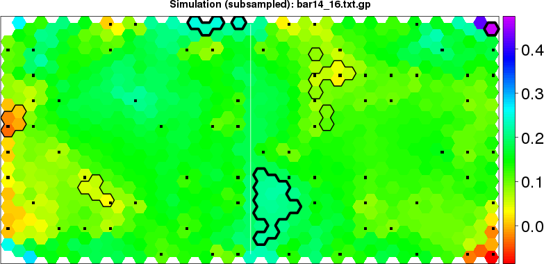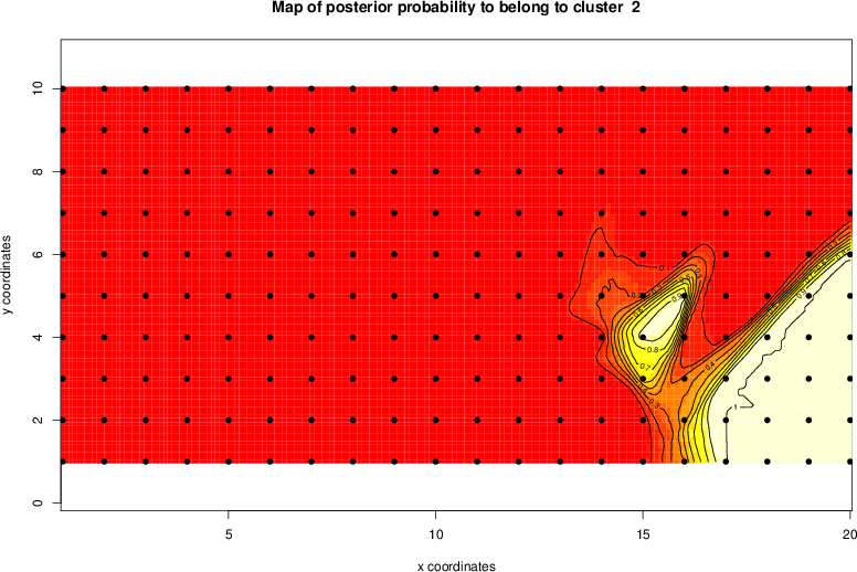 Simulated data | Geographical plots of weighted mean of all ellipse values (i.e., individual genetic distances ar of Rousset 2000) and significant barrier (cells with differentiation values higher than expected under a random distribution (no FDR applied) are materialized with thick black borders) | Idem, Benjamini-Yekutieli FDR applied | MAPI analysis (no FDR applied) with subsampled (75/200) dataset | MAPI analysis (Benjamini-Yekutieli FDR applied) with subsampled (75/200) dataset | Best probability memberships | Probability memberships for cluster 1 | Probability memberships for cluster 2 | Probability memberships for cluster 3 | Probability memberships for cluster 4 | Probability memberships for cluster 5 | Best probability memberships | Probability memberships for cluster 1 | Probability memberships for cluster 2 | Probability memberships for cluster 3 | Probability memberships for cluster 4 | Probability memberships for cluster 5 | Scatter plot showing the first two components of the DAPC (when K*>2) or density plot showing the first principal component of the DAPC (when K*=2) | Probability memberships for cluster 1 | Probability memberships for cluster 2 | Probability memberships for cluster 3 | Probability memberships for cluster 4 | Probability memberships for cluster 5 | Scatter plot showing the first two components of the DAPC (when K*>2) or density plot showing the first principal component of the DAPC (when K*=2) | Probability memberships for cluster 1 | Probability memberships for cluster 2 | Probability memberships for cluster 3 | Probability memberships for cluster 4 | Probability memberships for cluster 5 |