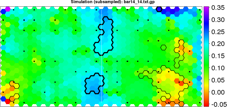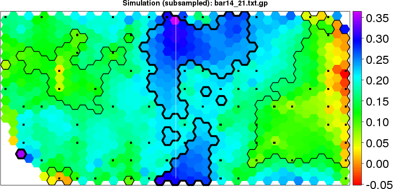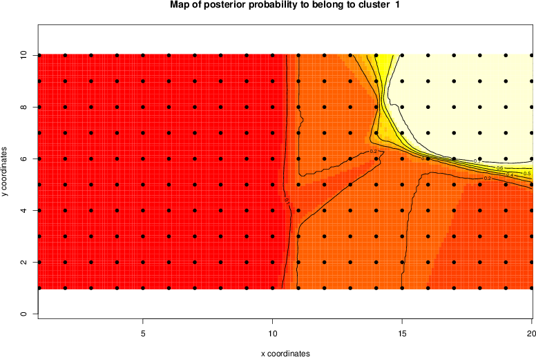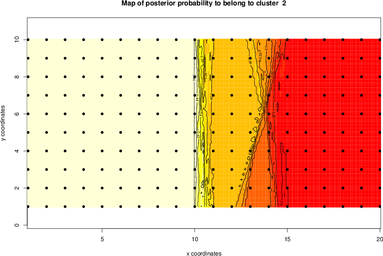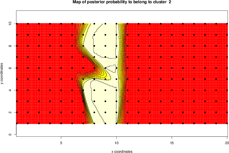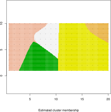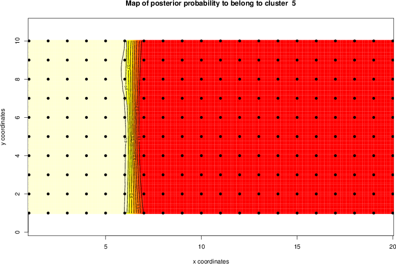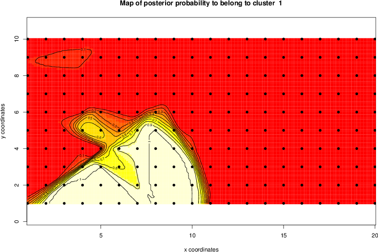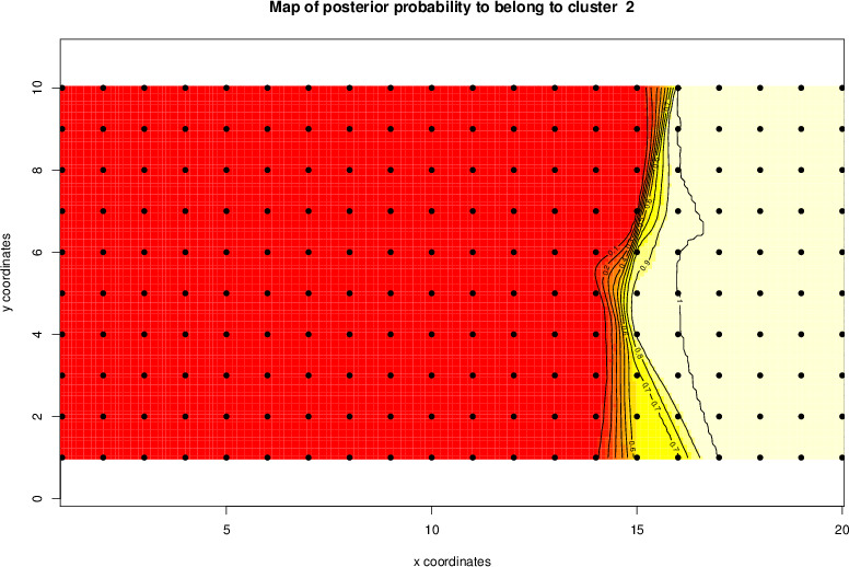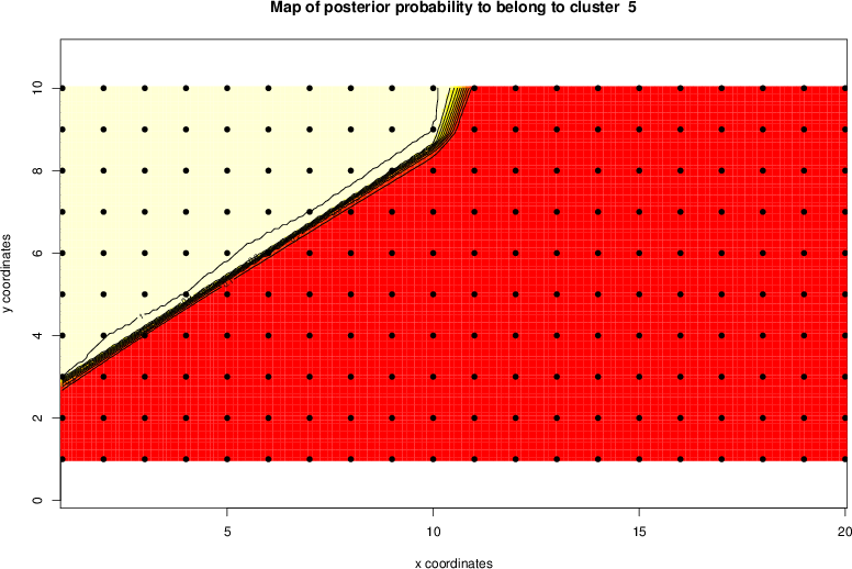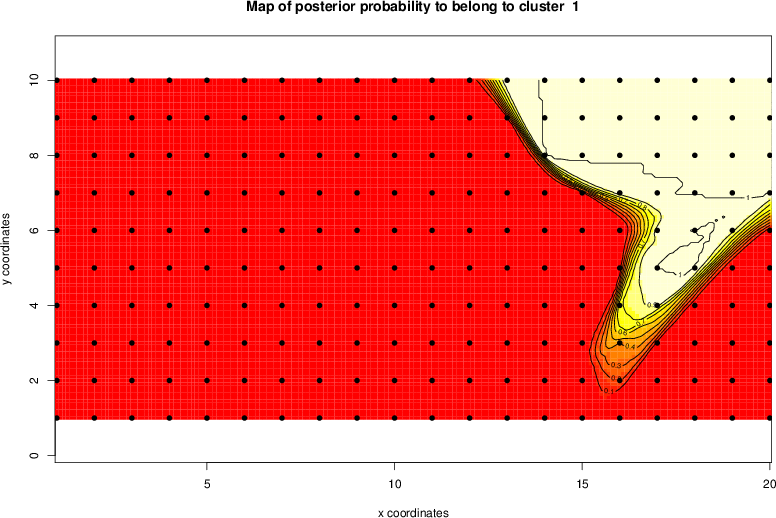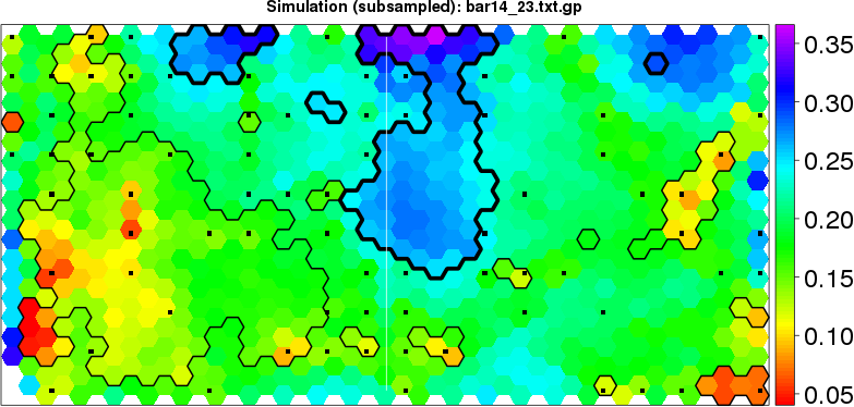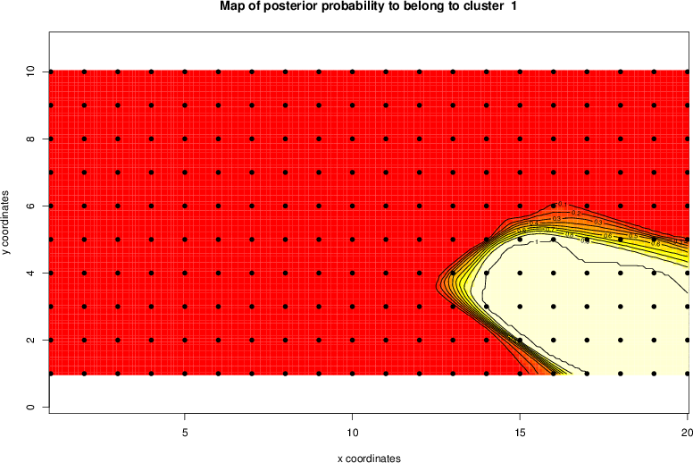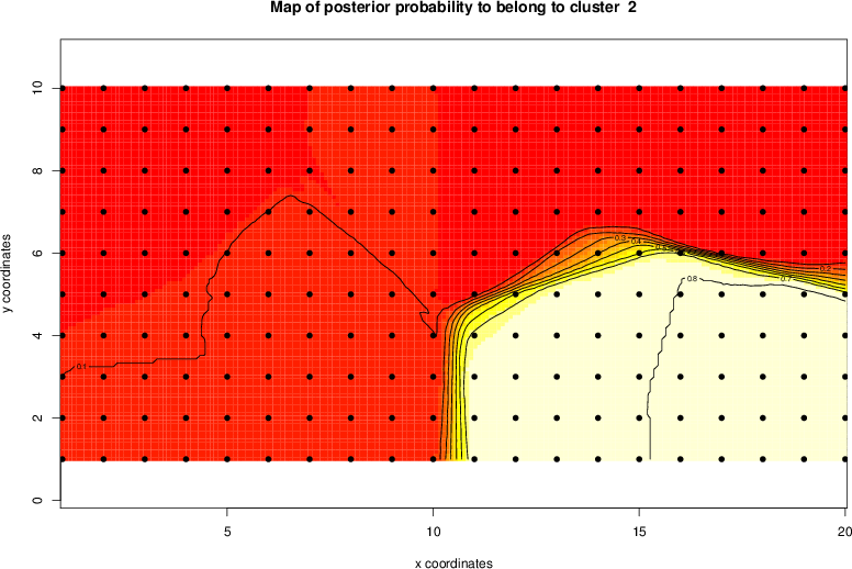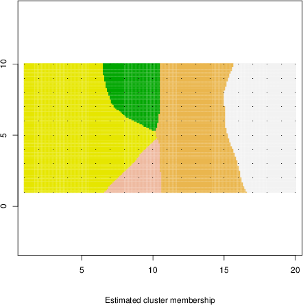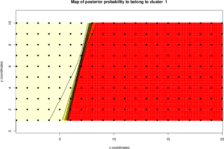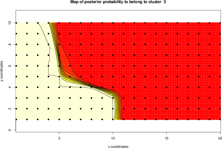Simulated data | Geographical plots of weighted mean of all ellipse values (i.e., individual genetic distances ar of Rousset 2000) and significant barrier (cells with differentiation values higher than expected under a random distribution (no FDR applied) are materialized with thick black borders) | Idem, Benjamini-Yekutieli FDR applied | MAPI analysis (no FDR applied) with subsampled (75/200) dataset | MAPI analysis (Benjamini-Yekutieli FDR applied) with subsampled (75/200) dataset | Best probability memberships | Probability memberships for cluster 1 | Probability memberships for cluster 2 | Probability memberships for cluster 3 | Probability memberships for cluster 4 | Probability memberships for cluster 5 | Best probability memberships | Probability memberships for cluster 1 | Probability memberships for cluster 2 | Probability memberships for cluster 3 | Probability memberships for cluster 4 | Probability memberships for cluster 5 | Scatter plot showing the first two components of the DAPC (when K*>2) or density plot showing the first principal component of the DAPC (when K*=2) | Probability memberships for cluster 1 | Probability memberships for cluster 2 | Probability memberships for cluster 3 | Probability memberships for cluster 4 | Probability memberships for cluster 5 | Scatter plot showing the first two components of the DAPC (when K*>2) or density plot showing the first principal component of the DAPC (when K*=2) | Probability memberships for cluster 1 | Probability memberships for cluster 2 | Probability memberships for cluster 3 | Probability memberships for cluster 4 | Probability memberships for cluster 5 |