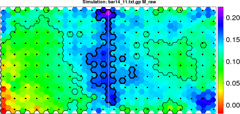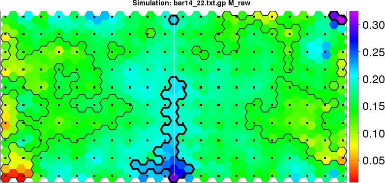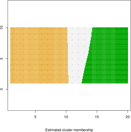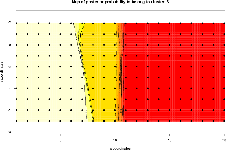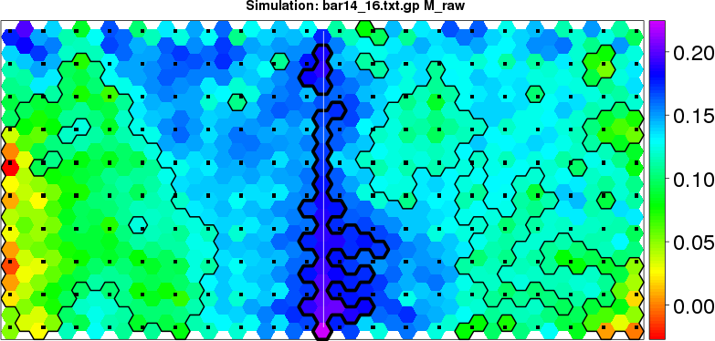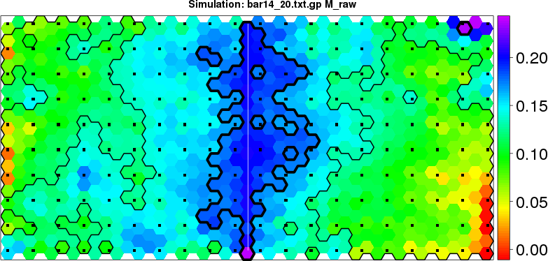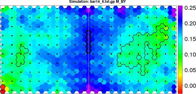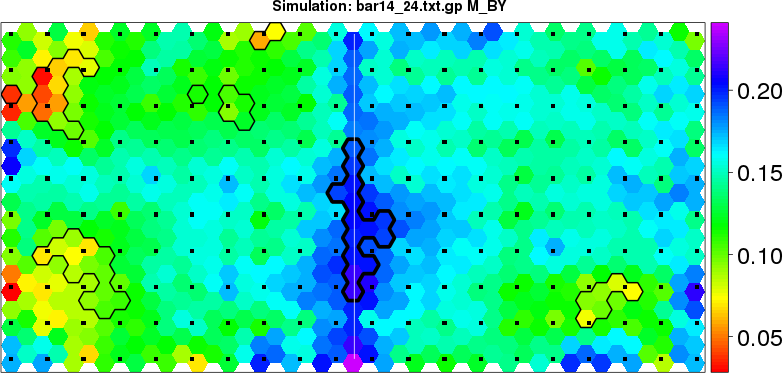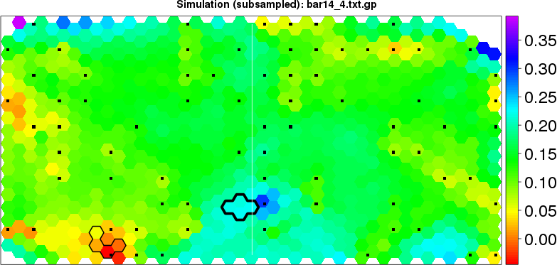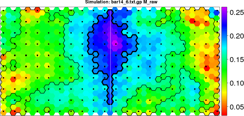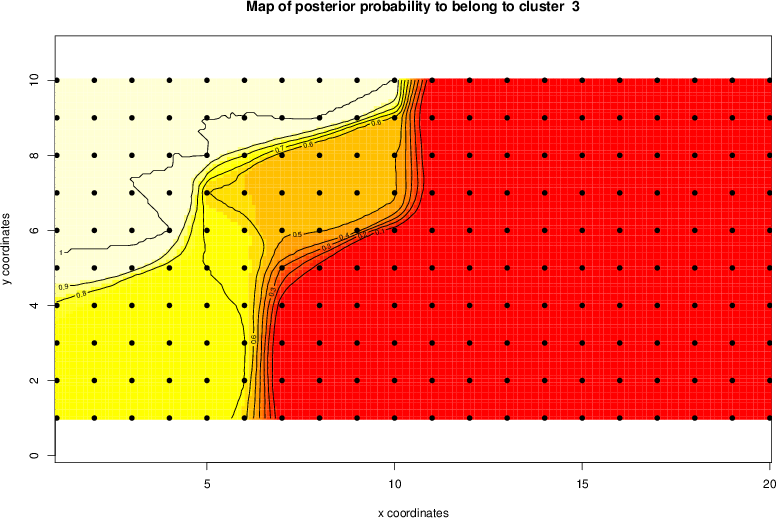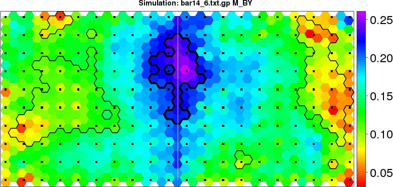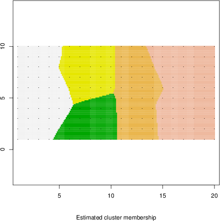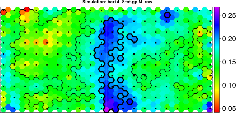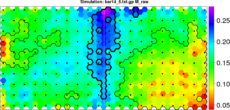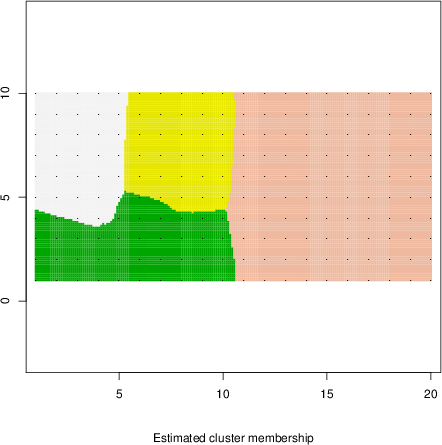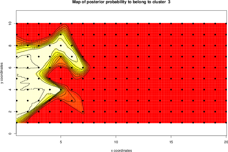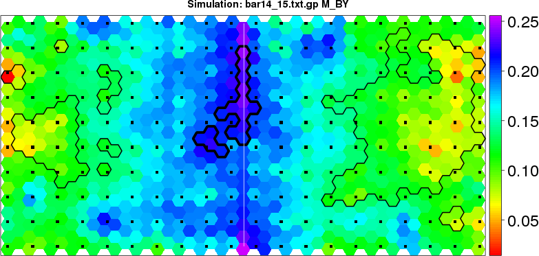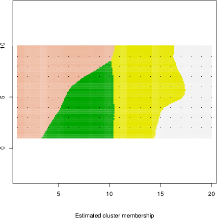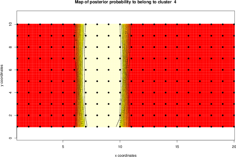 Simulated data | Geographical plots of weighted mean of all ellipse values (i.e., individual genetic distances ar of Rousset 2000) and significant barrier (cells with differentiation values higher than expected under a random distribution (no FDR applied) are materialized with thick black borders) | Idem, Benjamini-Yekutieli FDR applied | MAPI analysis (no FDR applied) with subsampled (75/200) dataset | MAPI analysis (Benjamini-Yekutieli FDR applied) with subsampled (75/200) dataset | Best probability memberships | Probability memberships for cluster 1 | Probability memberships for cluster 2 | Probability memberships for cluster 3 | Probability memberships for cluster 4 | Probability memberships for cluster 5 | Best probability memberships | Probability memberships for cluster 1 | Probability memberships for cluster 2 | Probability memberships for cluster 3 | Probability memberships for cluster 4 | Probability memberships for cluster 5 | Scatter plot showing the first two components of the DAPC (when K*>2) or density plot showing the first principal component of the DAPC (when K*=2) | Probability memberships for cluster 1 | Probability memberships for cluster 2 | Probability memberships for cluster 3 | Probability memberships for cluster 4 | Probability memberships for cluster 5 | Scatter plot showing the first two components of the DAPC (when K*>2) or density plot showing the first principal component of the DAPC (when K*=2) | Probability memberships for cluster 1 | Probability memberships for cluster 2 | Probability memberships for cluster 3 | Probability memberships for cluster 4 | Probability memberships for cluster 5 |