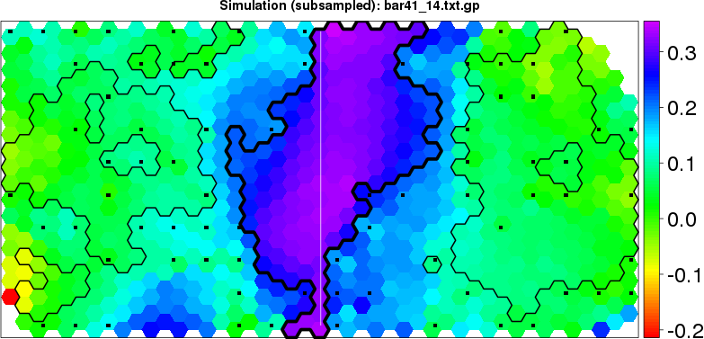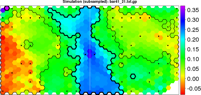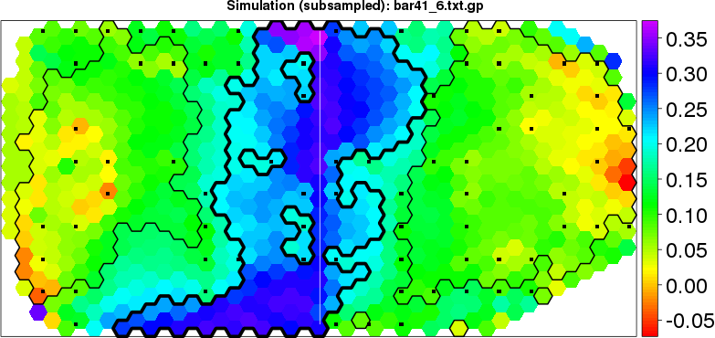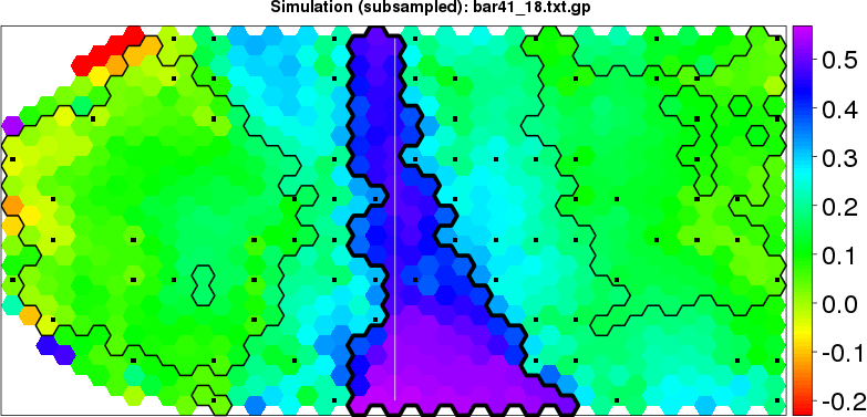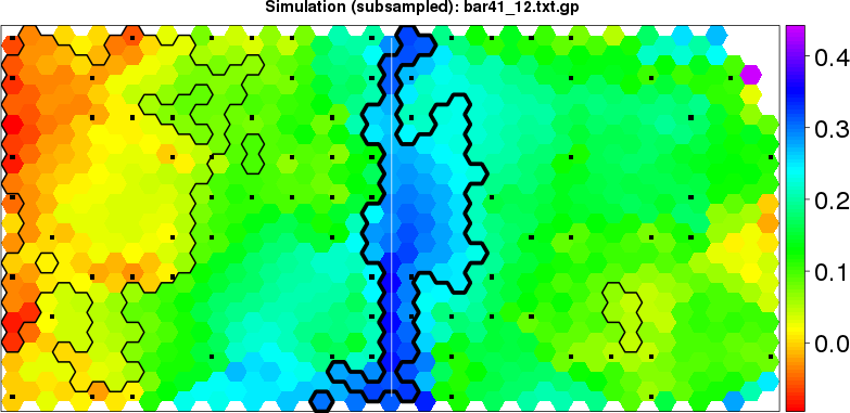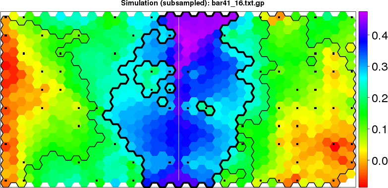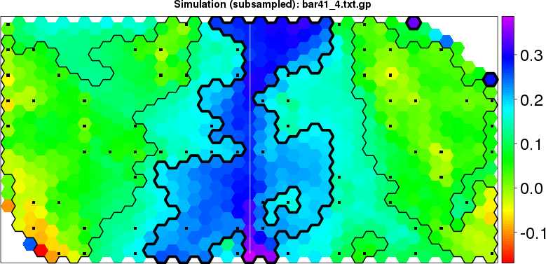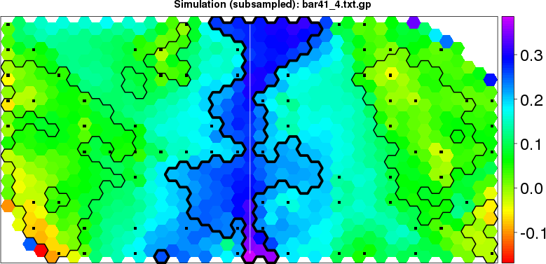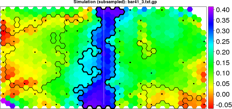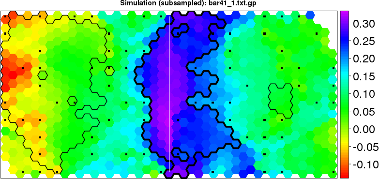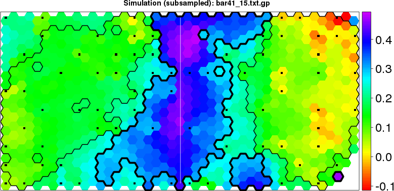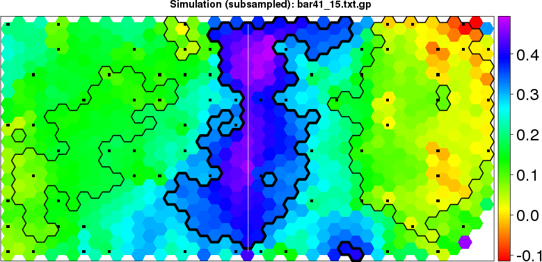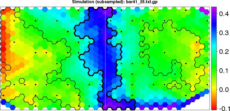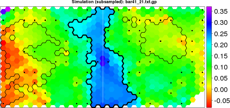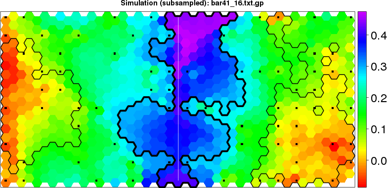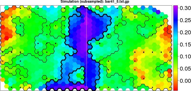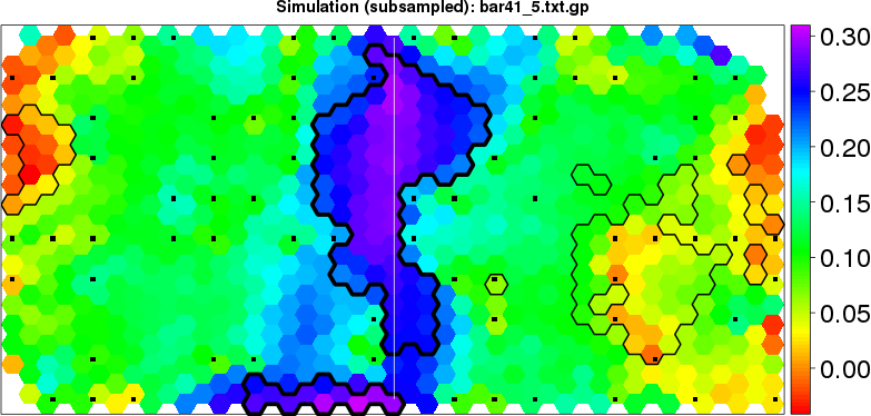 Simulated data | Geographical plots of weighted mean of all ellipse values (i.e., individual genetic distances ar of Rousset 2000) and significant barrier (cells with differentiation values higher than expected under a random distribution (no FDR applied) are materialized with thick black borders) | Idem, Benjamini-Yekutieli FDR applied | MAPI analysis (no FDR applied) with subsampled (75/200) dataset | MAPI analysis (Benjamini-Yekutieli FDR applied) with subsampled (75/200) dataset | Best probability memberships | Probability memberships for cluster 1 | Probability memberships for cluster 2 | Probability memberships for cluster 3 | Probability memberships for cluster 4 | Probability memberships for cluster 5 | Best probability memberships | Probability memberships for cluster 1 | Probability memberships for cluster 2 | Probability memberships for cluster 3 | Probability memberships for cluster 4 | Probability memberships for cluster 5 | Scatter plot showing the first two components of the DAPC (when K*>2) or density plot showing the first principal component of the DAPC (when K*=2) | Probability memberships for cluster 1 | Probability memberships for cluster 2 | Probability memberships for cluster 3 | Probability memberships for cluster 4 | Probability memberships for cluster 5 | Scatter plot showing the first two components of the DAPC (when K*>2) or density plot showing the first principal component of the DAPC (when K*=2) | Probability memberships for cluster 1 | Probability memberships for cluster 2 | Probability memberships for cluster 3 | Probability memberships for cluster 4 | Probability memberships for cluster 5 |