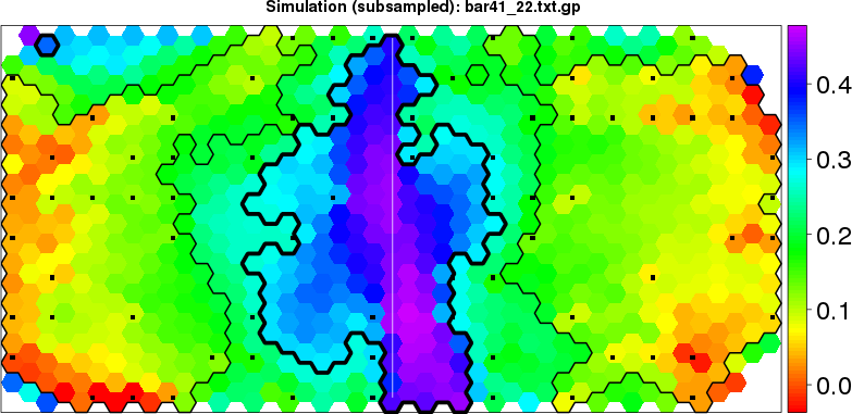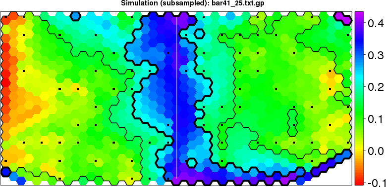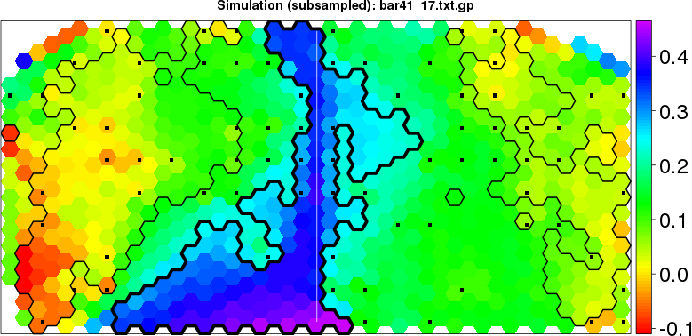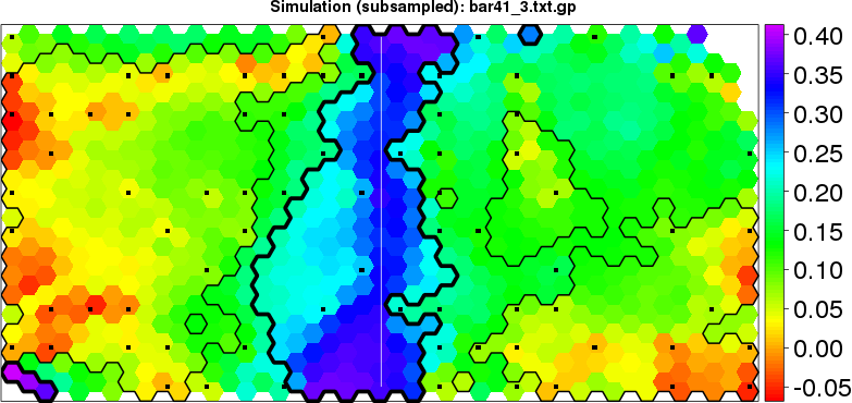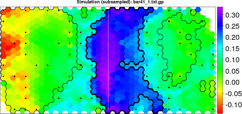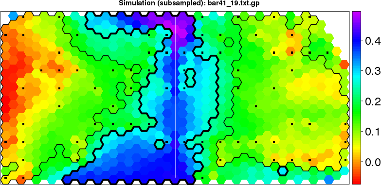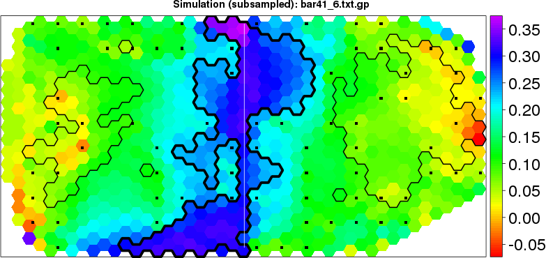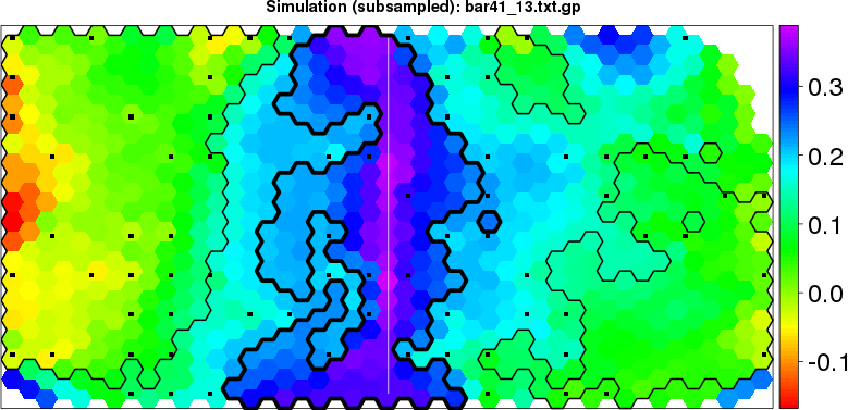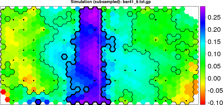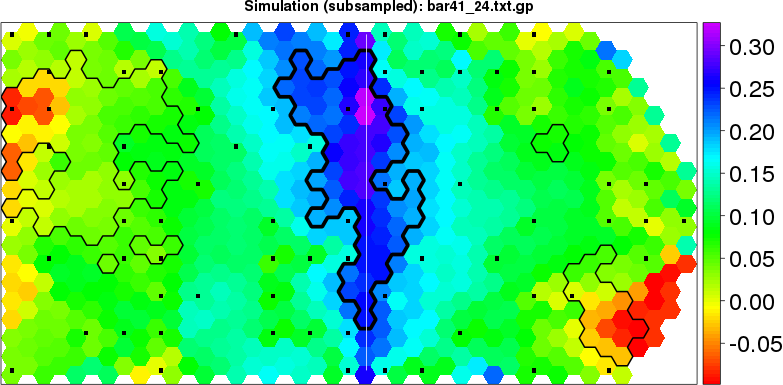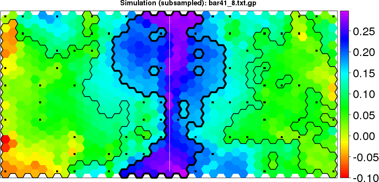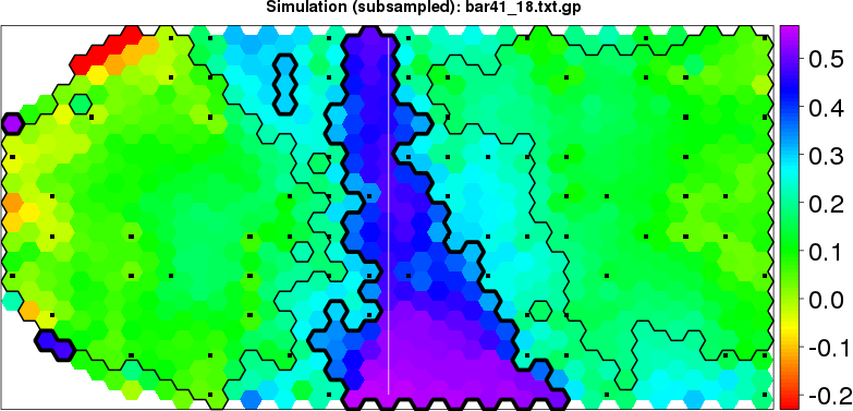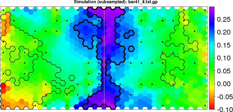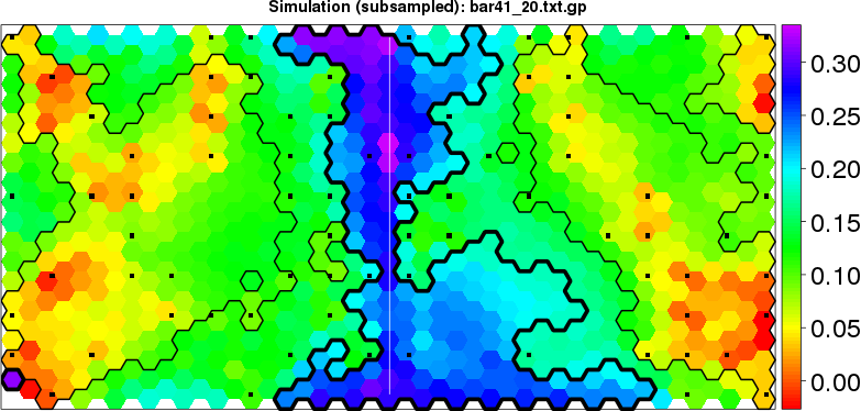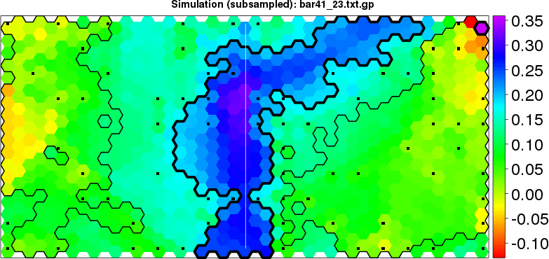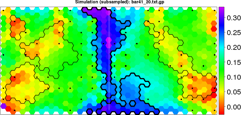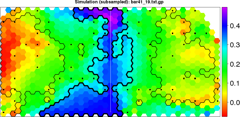 Simulated data | Geographical plots of weighted mean of all ellipse values (i.e., individual genetic distances ar of Rousset 2000) and significant barrier (cells with differentiation values higher than expected under a random distribution (no FDR applied) are materialized with thick black borders) | Idem, Benjamini-Yekutieli FDR applied | MAPI analysis (no FDR applied) with subsampled (75/200) dataset | MAPI analysis (Benjamini-Yekutieli FDR applied) with subsampled (75/200) dataset | Best probability memberships | Probability memberships for cluster 1 | Probability memberships for cluster 2 | Probability memberships for cluster 3 | Probability memberships for cluster 4 | Probability memberships for cluster 5 | Best probability memberships | Probability memberships for cluster 1 | Probability memberships for cluster 2 | Probability memberships for cluster 3 | Probability memberships for cluster 4 | Probability memberships for cluster 5 | Scatter plot showing the first two components of the DAPC (when K*>2) or density plot showing the first principal component of the DAPC (when K*=2) | Probability memberships for cluster 1 | Probability memberships for cluster 2 | Probability memberships for cluster 3 | Probability memberships for cluster 4 | Probability memberships for cluster 5 | Scatter plot showing the first two components of the DAPC (when K*>2) or density plot showing the first principal component of the DAPC (when K*=2) | Probability memberships for cluster 1 | Probability memberships for cluster 2 | Probability memberships for cluster 3 | Probability memberships for cluster 4 | Probability memberships for cluster 5 |