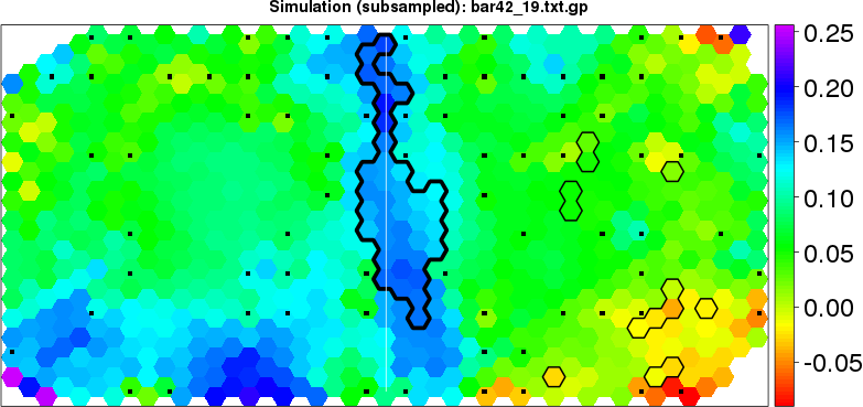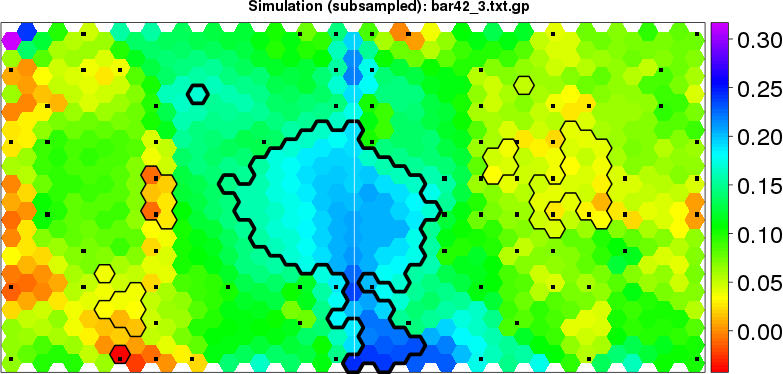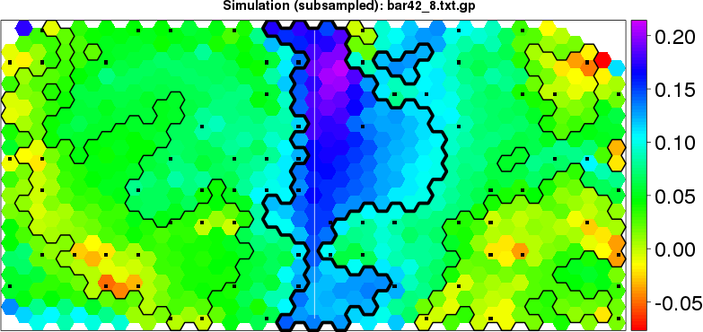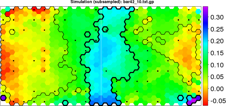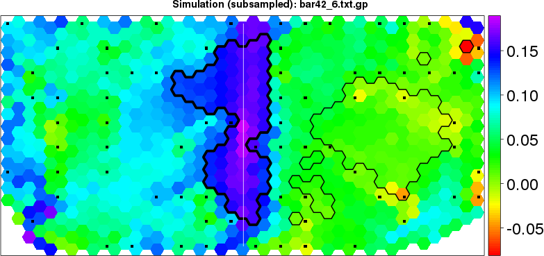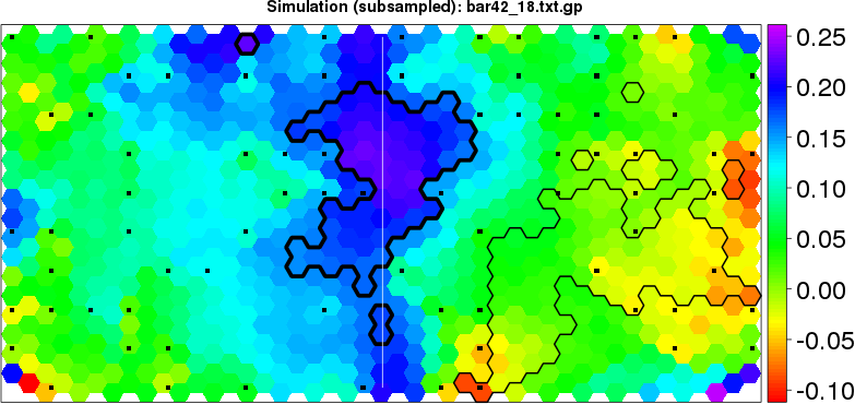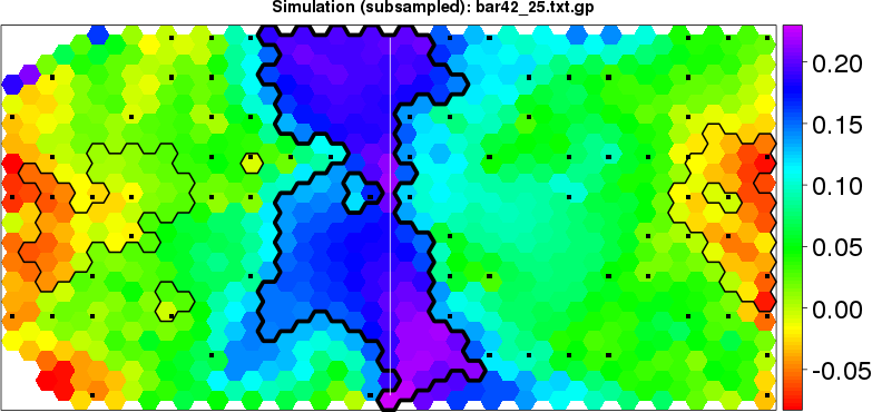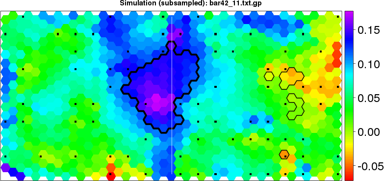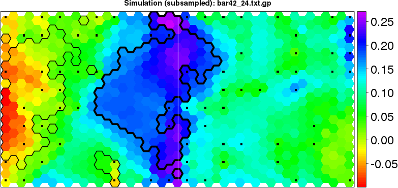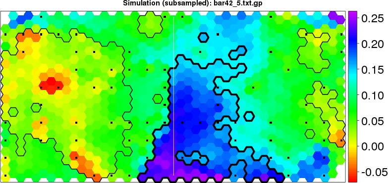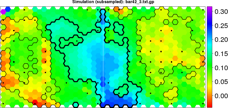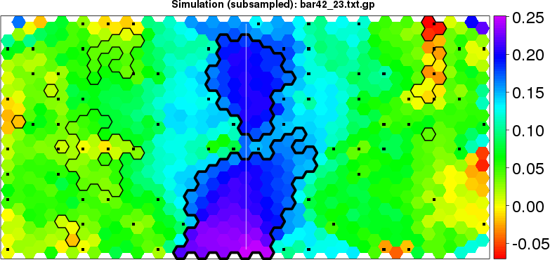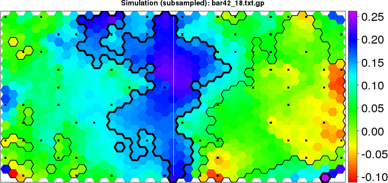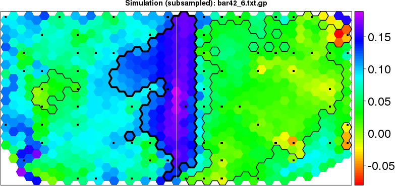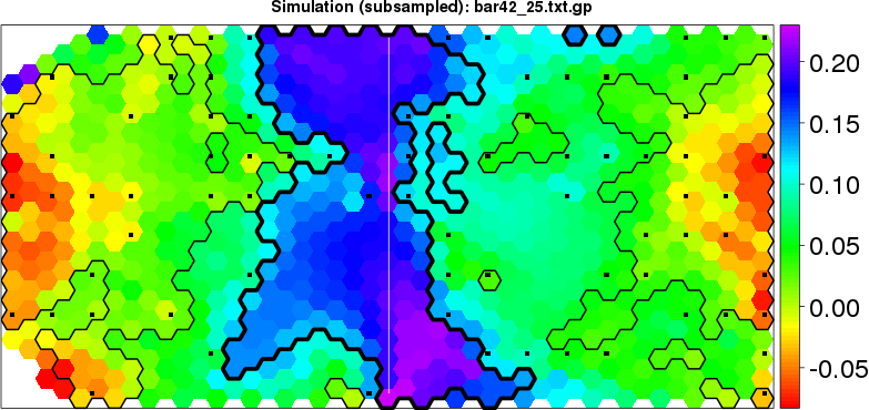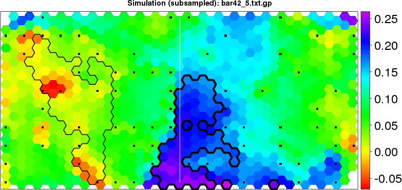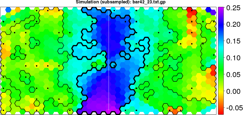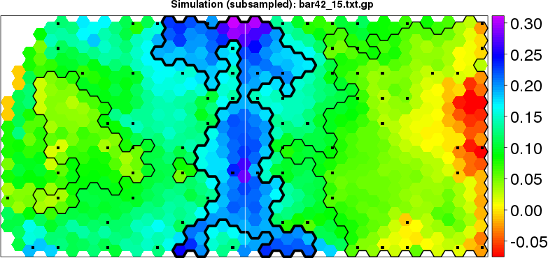 Simulated data | Geographical plots of weighted mean of all ellipse values (i.e., individual genetic distances ar of Rousset 2000) and significant barrier (cells with differentiation values higher than expected under a random distribution (no FDR applied) are materialized with thick black borders) | Idem, Benjamini-Yekutieli FDR applied | MAPI analysis (no FDR applied) with subsampled (75/200) dataset | MAPI analysis (Benjamini-Yekutieli FDR applied) with subsampled (75/200) dataset | Best probability memberships | Probability memberships for cluster 1 | Probability memberships for cluster 2 | Probability memberships for cluster 3 | Probability memberships for cluster 4 | Probability memberships for cluster 5 | Best probability memberships | Probability memberships for cluster 1 | Probability memberships for cluster 2 | Probability memberships for cluster 3 | Probability memberships for cluster 4 | Probability memberships for cluster 5 | Scatter plot showing the first two components of the DAPC (when K*>2) or density plot showing the first principal component of the DAPC (when K*=2) | Probability memberships for cluster 1 | Probability memberships for cluster 2 | Probability memberships for cluster 3 | Probability memberships for cluster 4 | Probability memberships for cluster 5 | Scatter plot showing the first two components of the DAPC (when K*>2) or density plot showing the first principal component of the DAPC (when K*=2) | Probability memberships for cluster 1 | Probability memberships for cluster 2 | Probability memberships for cluster 3 | Probability memberships for cluster 4 | Probability memberships for cluster 5 |