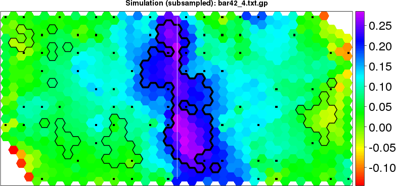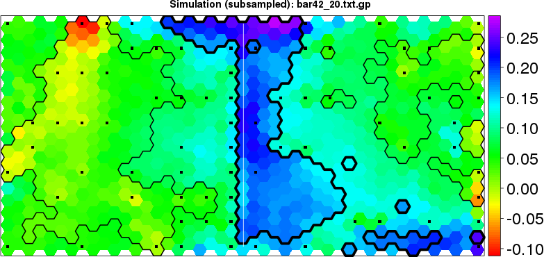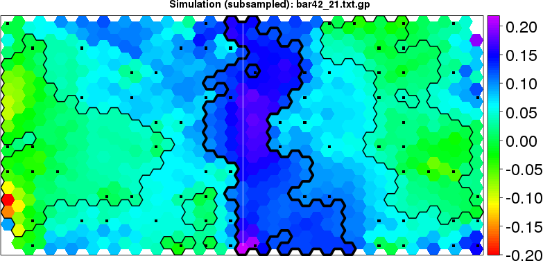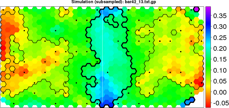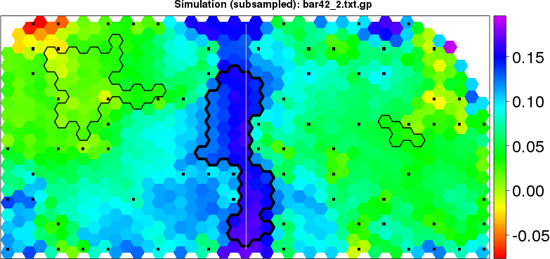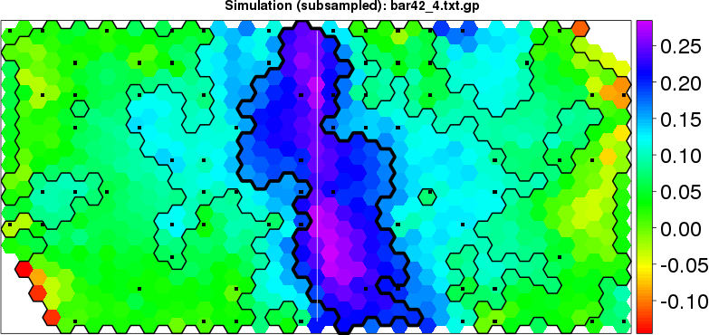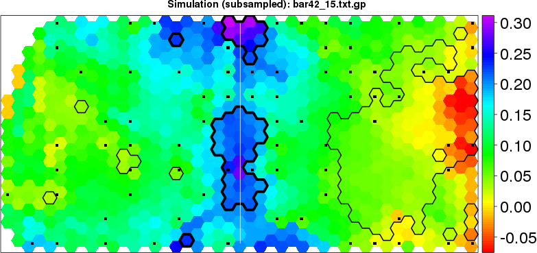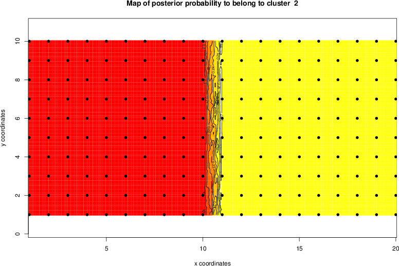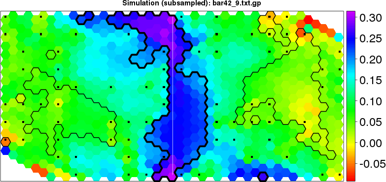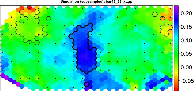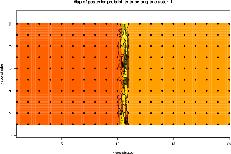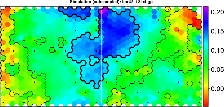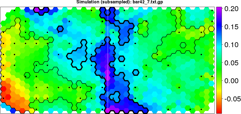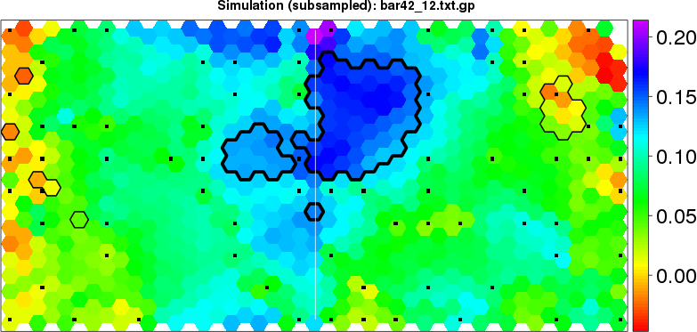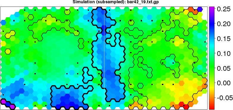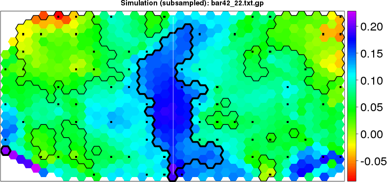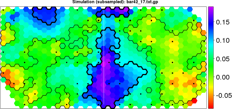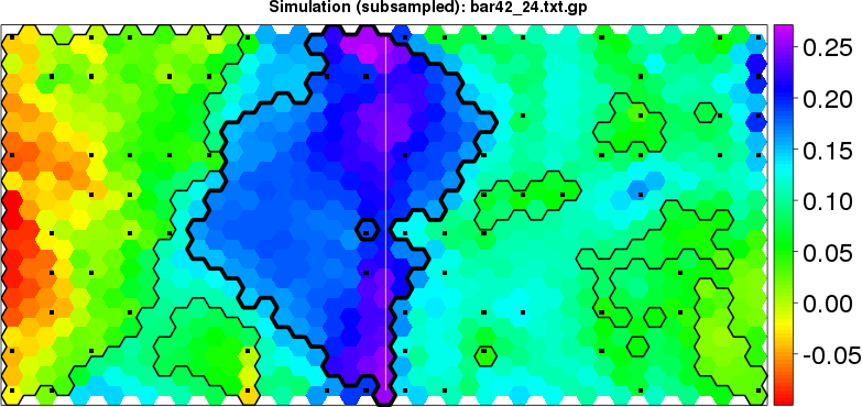 Simulated data | Geographical plots of weighted mean of all ellipse values (i.e., individual genetic distances ar of Rousset 2000) and significant barrier (cells with differentiation values higher than expected under a random distribution (no FDR applied) are materialized with thick black borders) | Idem, Benjamini-Yekutieli FDR applied | MAPI analysis (no FDR applied) with subsampled (75/200) dataset | MAPI analysis (Benjamini-Yekutieli FDR applied) with subsampled (75/200) dataset | Best probability memberships | Probability memberships for cluster 1 | Probability memberships for cluster 2 | Probability memberships for cluster 3 | Probability memberships for cluster 4 | Probability memberships for cluster 5 | Best probability memberships | Probability memberships for cluster 1 | Probability memberships for cluster 2 | Probability memberships for cluster 3 | Probability memberships for cluster 4 | Probability memberships for cluster 5 | Scatter plot showing the first two components of the DAPC (when K*>2) or density plot showing the first principal component of the DAPC (when K*=2) | Probability memberships for cluster 1 | Probability memberships for cluster 2 | Probability memberships for cluster 3 | Probability memberships for cluster 4 | Probability memberships for cluster 5 | Scatter plot showing the first two components of the DAPC (when K*>2) or density plot showing the first principal component of the DAPC (when K*=2) | Probability memberships for cluster 1 | Probability memberships for cluster 2 | Probability memberships for cluster 3 | Probability memberships for cluster 4 | Probability memberships for cluster 5 |