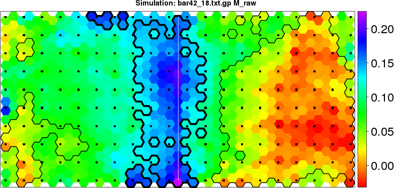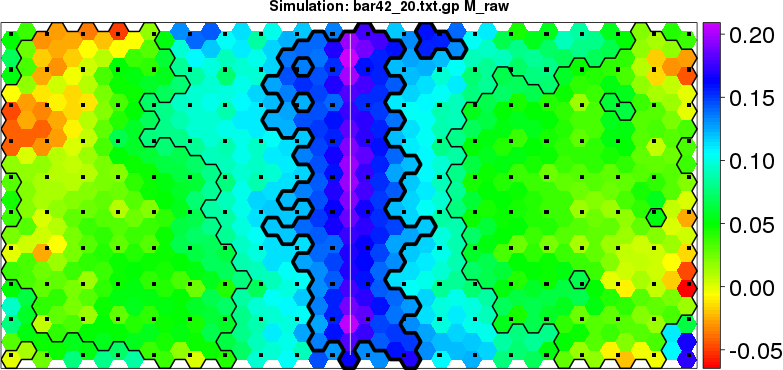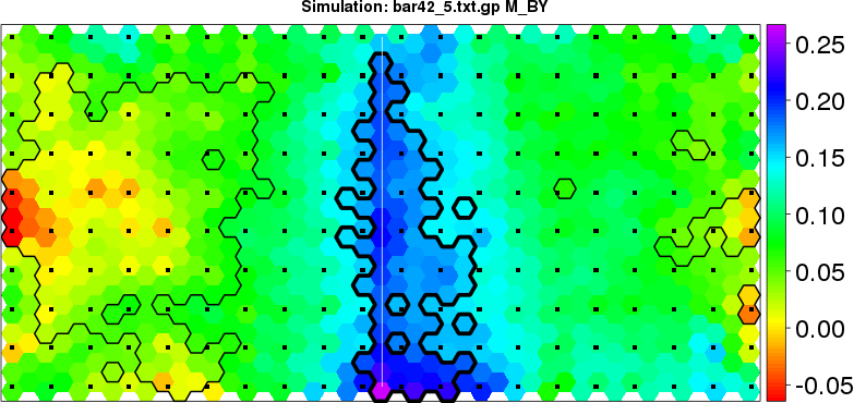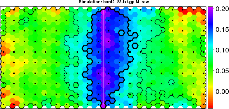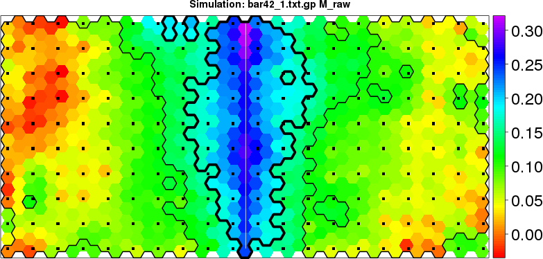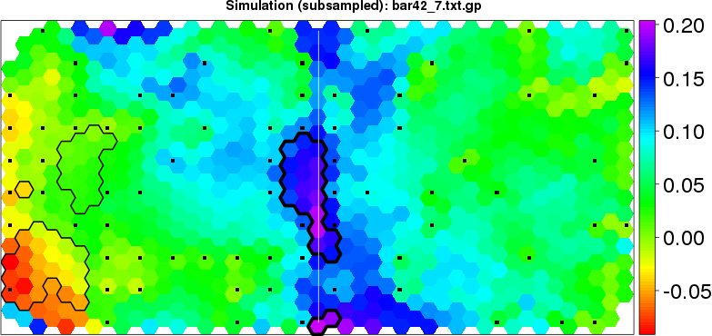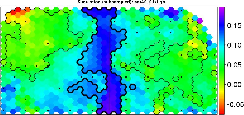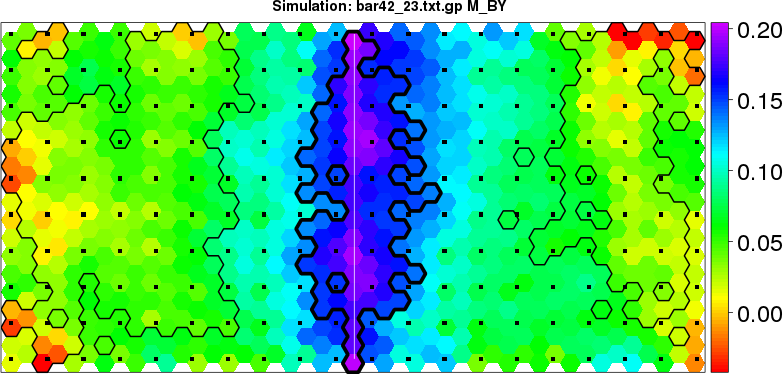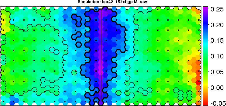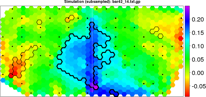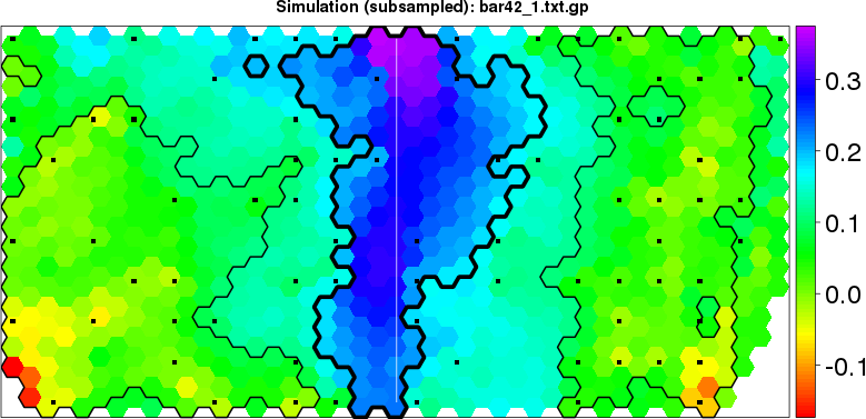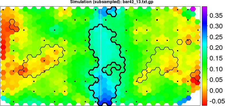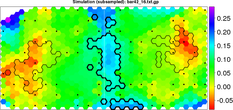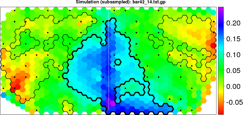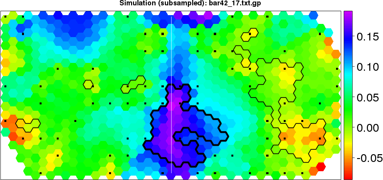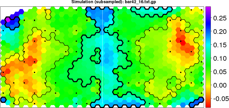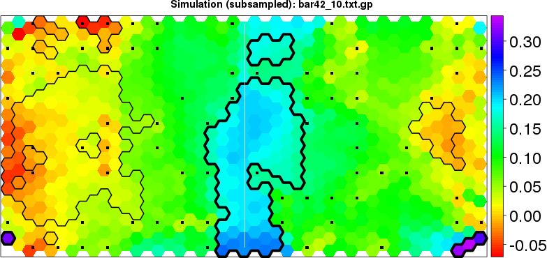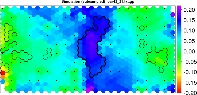 Simulated data | Geographical plots of weighted mean of all ellipse values (i.e., individual genetic distances ar of Rousset 2000) and significant barrier (cells with differentiation values higher than expected under a random distribution (no FDR applied) are materialized with thick black borders) | Idem, Benjamini-Yekutieli FDR applied | MAPI analysis (no FDR applied) with subsampled (75/200) dataset | MAPI analysis (Benjamini-Yekutieli FDR applied) with subsampled (75/200) dataset | Best probability memberships | Probability memberships for cluster 1 | Probability memberships for cluster 2 | Probability memberships for cluster 3 | Probability memberships for cluster 4 | Probability memberships for cluster 5 | Best probability memberships | Probability memberships for cluster 1 | Probability memberships for cluster 2 | Probability memberships for cluster 3 | Probability memberships for cluster 4 | Probability memberships for cluster 5 | Scatter plot showing the first two components of the DAPC (when K*>2) or density plot showing the first principal component of the DAPC (when K*=2) | Probability memberships for cluster 1 | Probability memberships for cluster 2 | Probability memberships for cluster 3 | Probability memberships for cluster 4 | Probability memberships for cluster 5 | Scatter plot showing the first two components of the DAPC (when K*>2) or density plot showing the first principal component of the DAPC (when K*=2) | Probability memberships for cluster 1 | Probability memberships for cluster 2 | Probability memberships for cluster 3 | Probability memberships for cluster 4 | Probability memberships for cluster 5 |