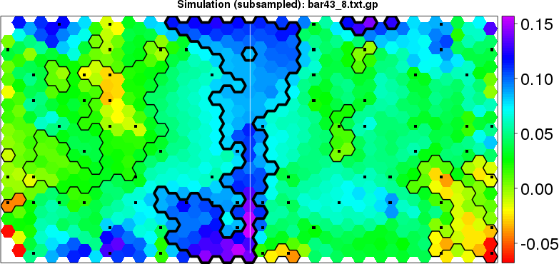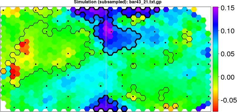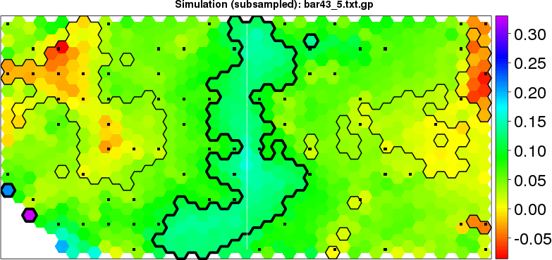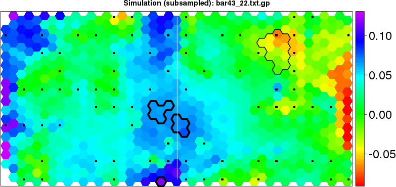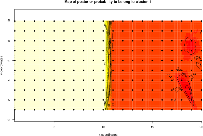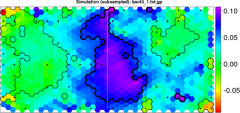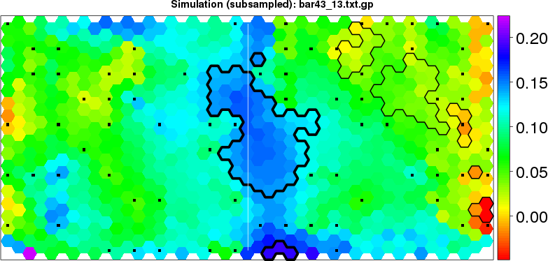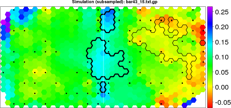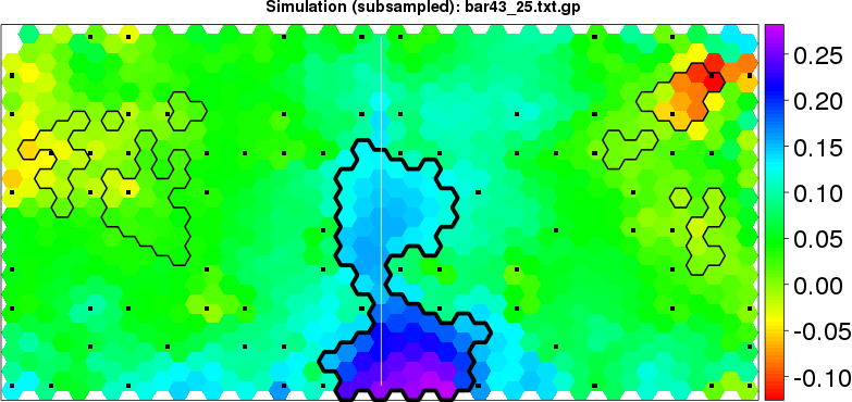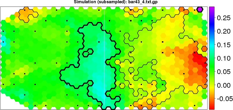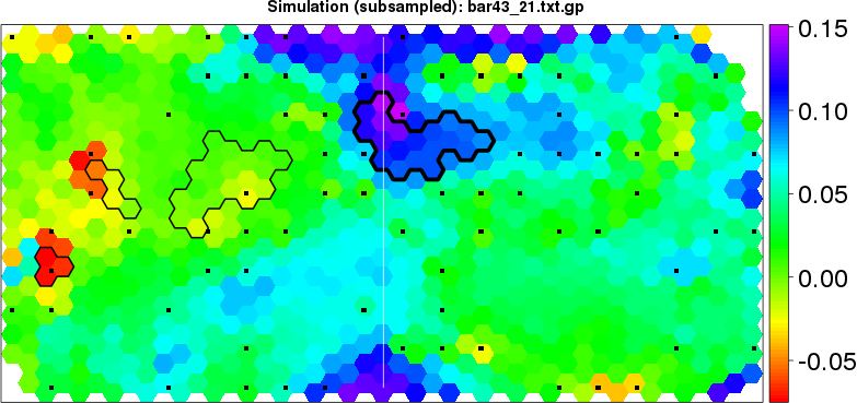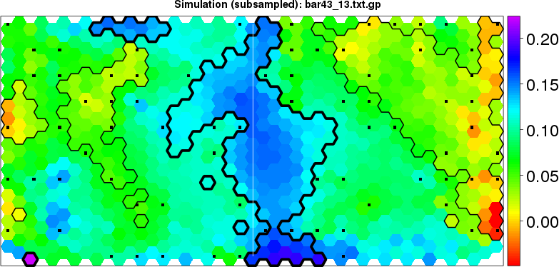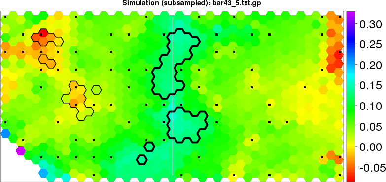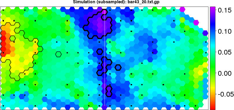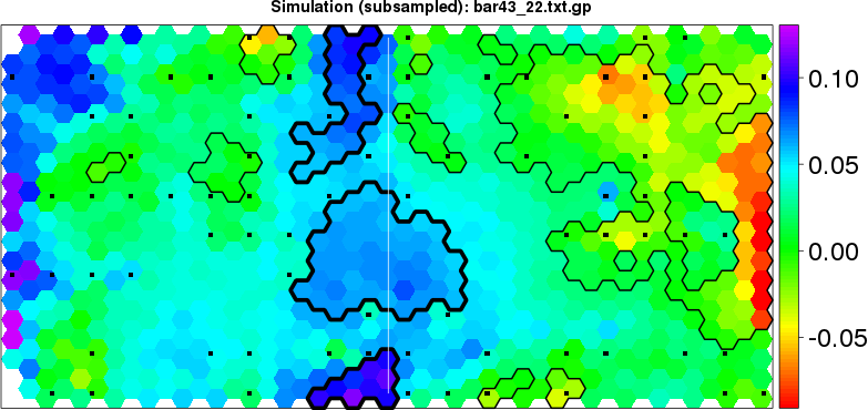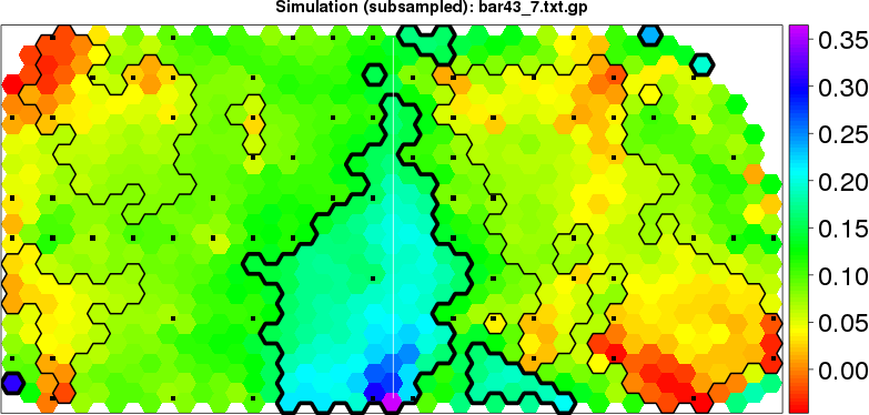 Simulated data | Geographical plots of weighted mean of all ellipse values (i.e., individual genetic distances ar of Rousset 2000) and significant barrier (cells with differentiation values higher than expected under a random distribution (no FDR applied) are materialized with thick black borders) | Idem, Benjamini-Yekutieli FDR applied | MAPI analysis (no FDR applied) with subsampled (75/200) dataset | MAPI analysis (Benjamini-Yekutieli FDR applied) with subsampled (75/200) dataset | Best probability memberships | Probability memberships for cluster 1 | Probability memberships for cluster 2 | Probability memberships for cluster 3 | Probability memberships for cluster 4 | Probability memberships for cluster 5 | Best probability memberships | Probability memberships for cluster 1 | Probability memberships for cluster 2 | Probability memberships for cluster 3 | Probability memberships for cluster 4 | Probability memberships for cluster 5 | Scatter plot showing the first two components of the DAPC (when K*>2) or density plot showing the first principal component of the DAPC (when K*=2) | Probability memberships for cluster 1 | Probability memberships for cluster 2 | Probability memberships for cluster 3 | Probability memberships for cluster 4 | Probability memberships for cluster 5 | Scatter plot showing the first two components of the DAPC (when K*>2) or density plot showing the first principal component of the DAPC (when K*=2) | Probability memberships for cluster 1 | Probability memberships for cluster 2 | Probability memberships for cluster 3 | Probability memberships for cluster 4 | Probability memberships for cluster 5 |