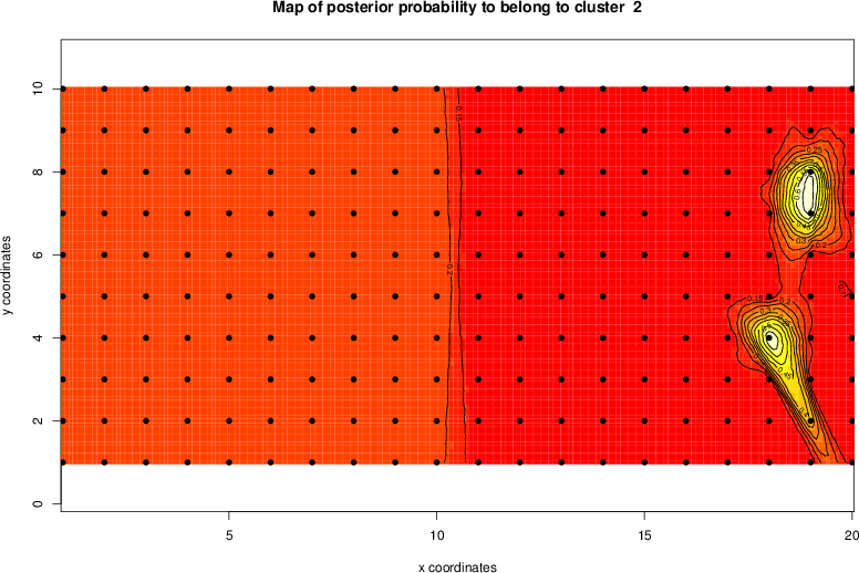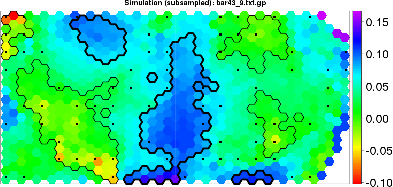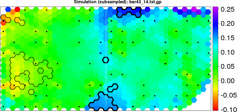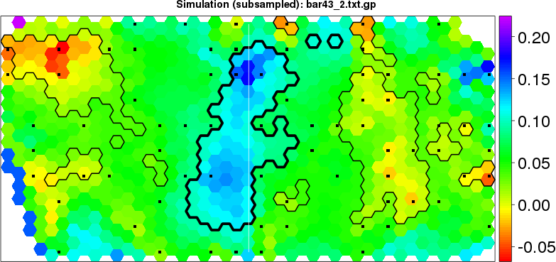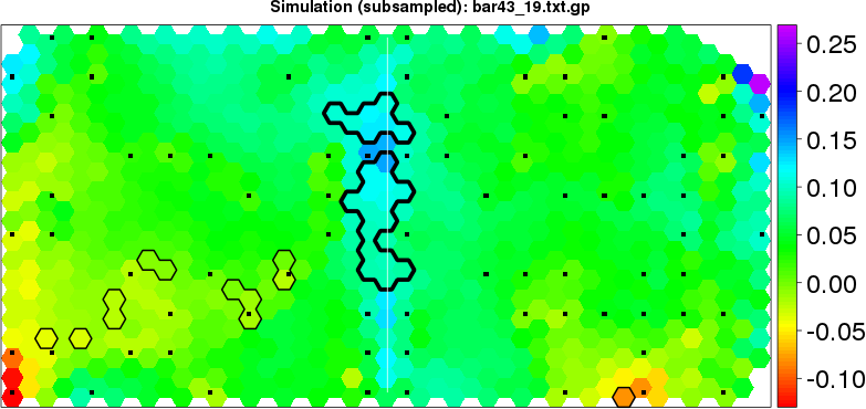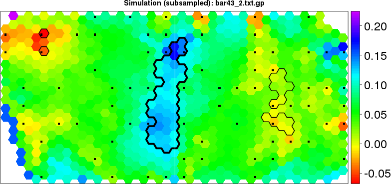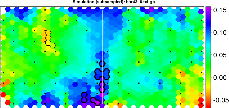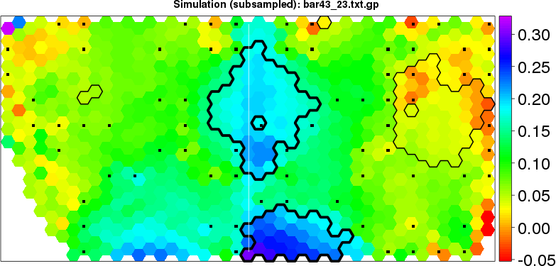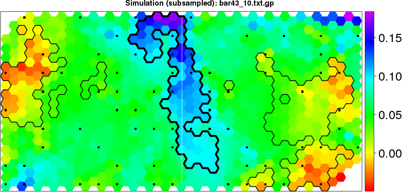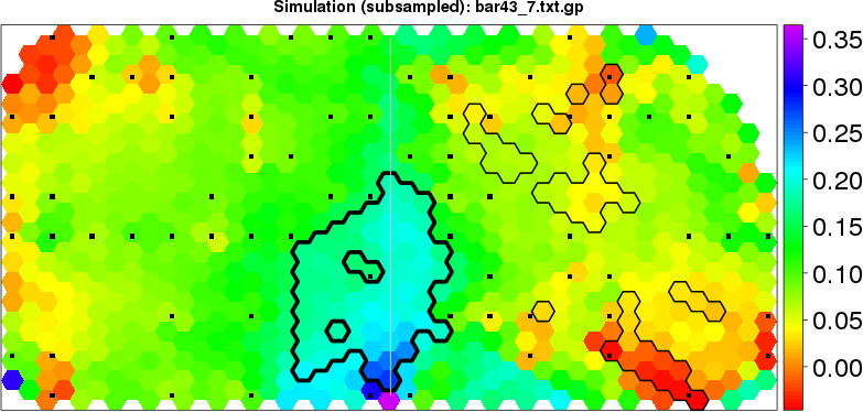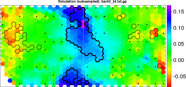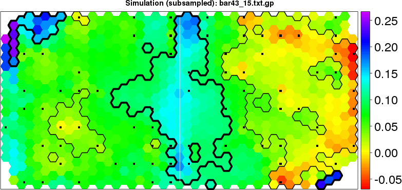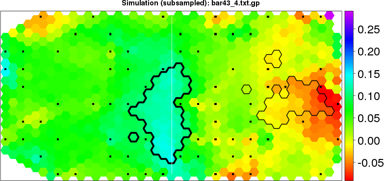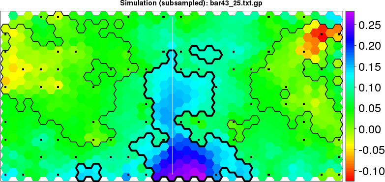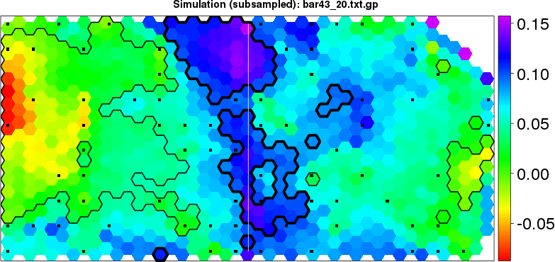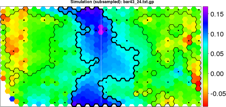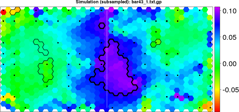 Simulated data | Geographical plots of weighted mean of all ellipse values (i.e., individual genetic distances ar of Rousset 2000) and significant barrier (cells with differentiation values higher than expected under a random distribution (no FDR applied) are materialized with thick black borders) | Idem, Benjamini-Yekutieli FDR applied | MAPI analysis (no FDR applied) with subsampled (75/200) dataset | MAPI analysis (Benjamini-Yekutieli FDR applied) with subsampled (75/200) dataset | Best probability memberships | Probability memberships for cluster 1 | Probability memberships for cluster 2 | Probability memberships for cluster 3 | Probability memberships for cluster 4 | Probability memberships for cluster 5 | Best probability memberships | Probability memberships for cluster 1 | Probability memberships for cluster 2 | Probability memberships for cluster 3 | Probability memberships for cluster 4 | Probability memberships for cluster 5 | Scatter plot showing the first two components of the DAPC (when K*>2) or density plot showing the first principal component of the DAPC (when K*=2) | Probability memberships for cluster 1 | Probability memberships for cluster 2 | Probability memberships for cluster 3 | Probability memberships for cluster 4 | Probability memberships for cluster 5 | Scatter plot showing the first two components of the DAPC (when K*>2) or density plot showing the first principal component of the DAPC (when K*=2) | Probability memberships for cluster 1 | Probability memberships for cluster 2 | Probability memberships for cluster 3 | Probability memberships for cluster 4 | Probability memberships for cluster 5 |