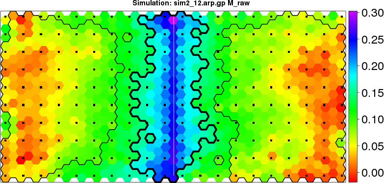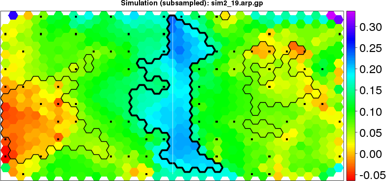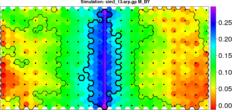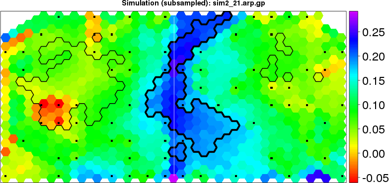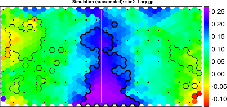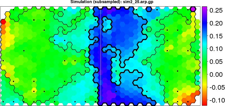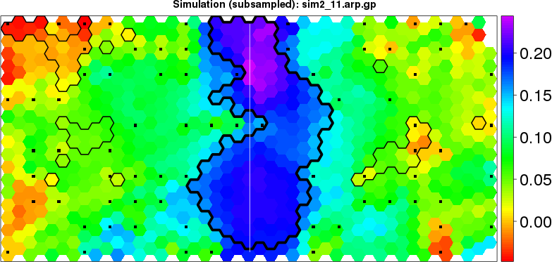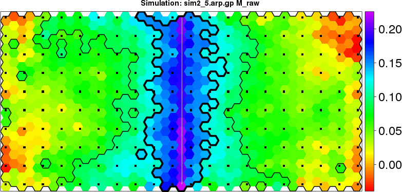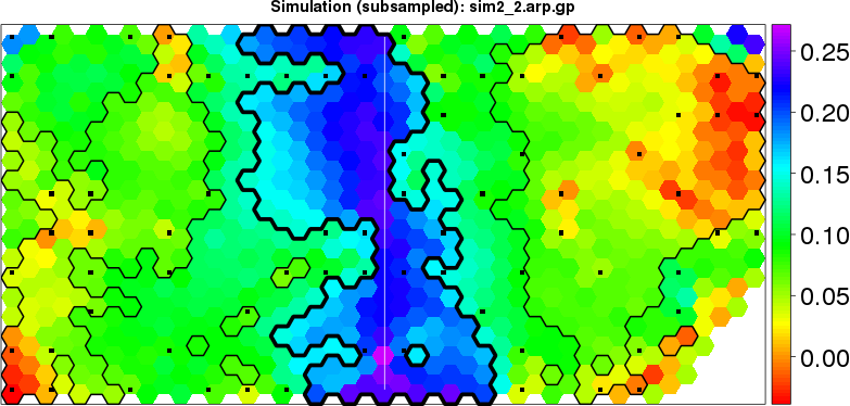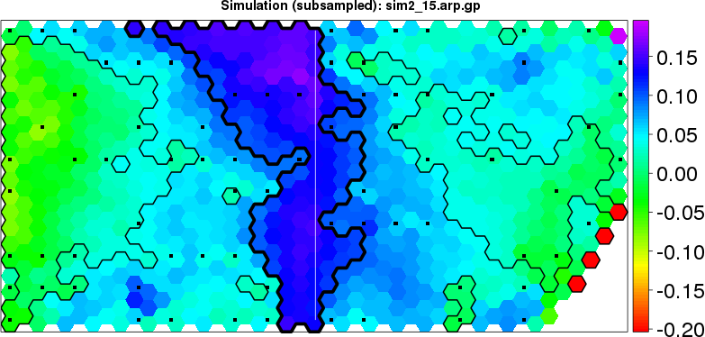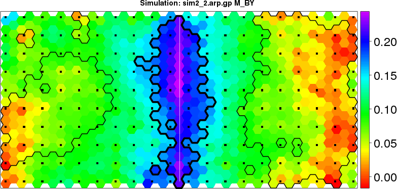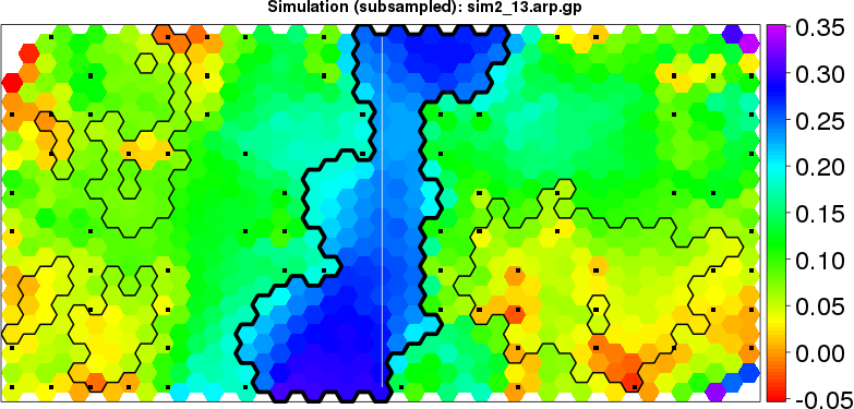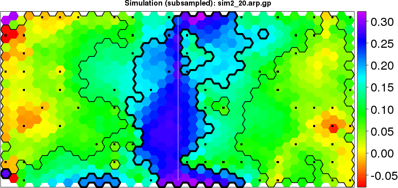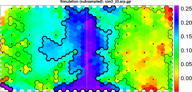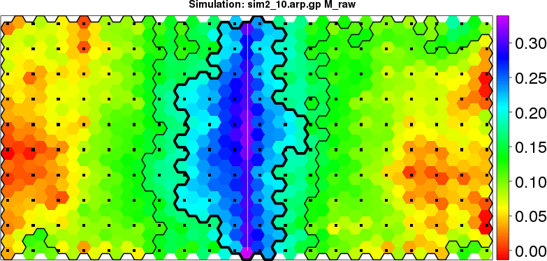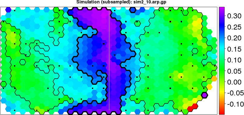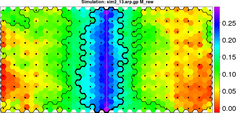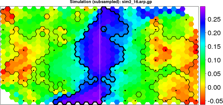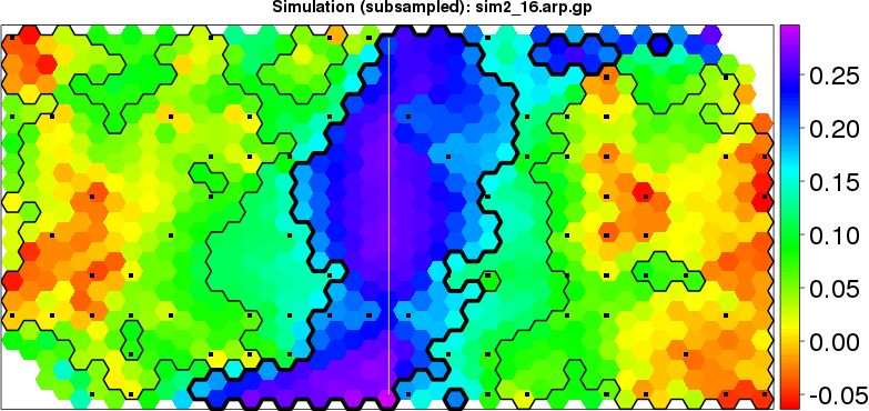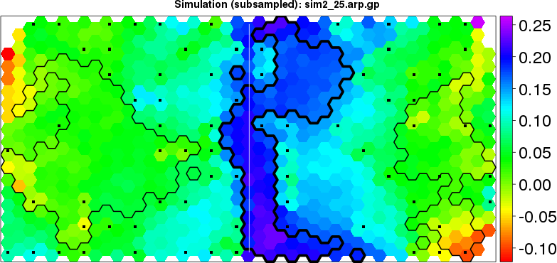 Simulated data | Geographical plots of weighted mean of all ellipse values (i.e., individual genetic distances ar of Rousset 2000) and significant barrier (cells with differentiation values higher than expected under a random distribution (no FDR applied) are materialized with thick black borders) | Idem, Benjamini-Yekutieli FDR applied | MAPI analysis (no FDR applied) with subsampled (75/200) dataset | MAPI analysis (Benjamini-Yekutieli FDR applied) with subsampled (75/200) dataset | Best probability memberships | Probability memberships for cluster 1 | Probability memberships for cluster 2 | Probability memberships for cluster 3 | Probability memberships for cluster 4 | Probability memberships for cluster 5 | Best probability memberships | Probability memberships for cluster 1 | Probability memberships for cluster 2 | Probability memberships for cluster 3 | Probability memberships for cluster 4 | Probability memberships for cluster 5 | Scatter plot showing the first two components of the DAPC (when K*>2) or density plot showing the first principal component of the DAPC (when K*=2) | Probability memberships for cluster 1 | Probability memberships for cluster 2 | Probability memberships for cluster 3 | Probability memberships for cluster 4 | Probability memberships for cluster 5 | Scatter plot showing the first two components of the DAPC (when K*>2) or density plot showing the first principal component of the DAPC (when K*=2) | Probability memberships for cluster 1 | Probability memberships for cluster 2 | Probability memberships for cluster 3 | Probability memberships for cluster 4 | Probability memberships for cluster 5 |