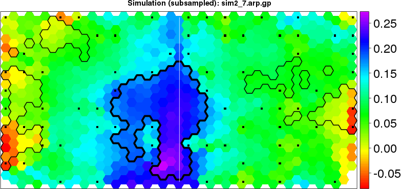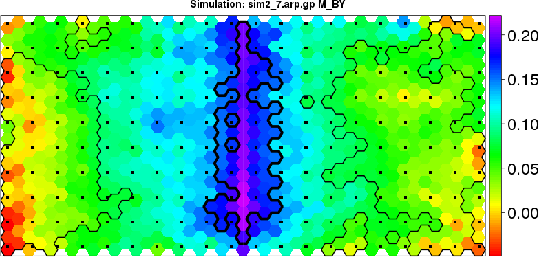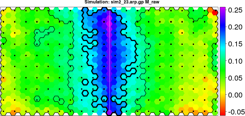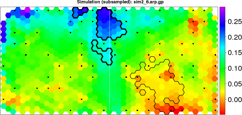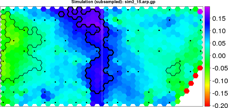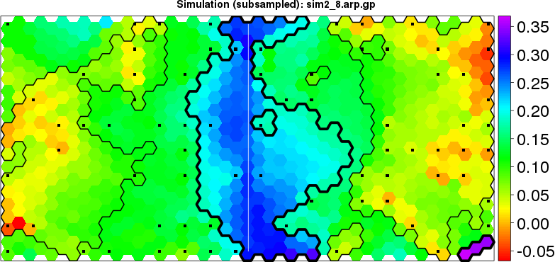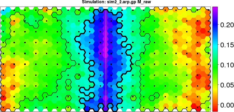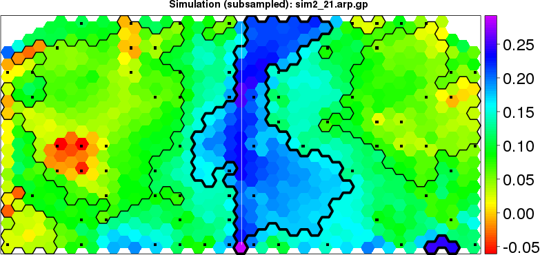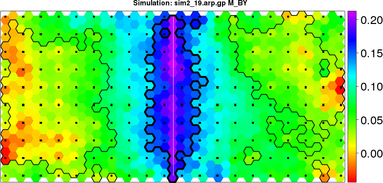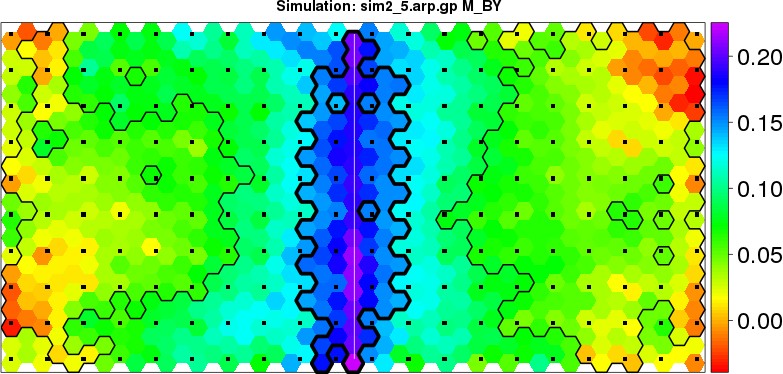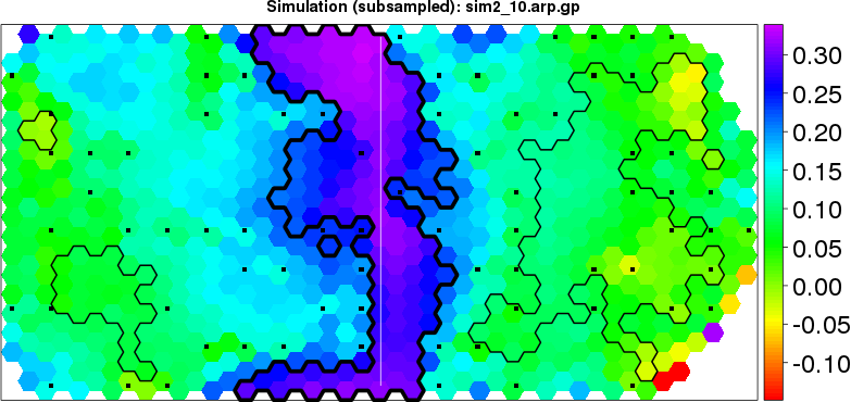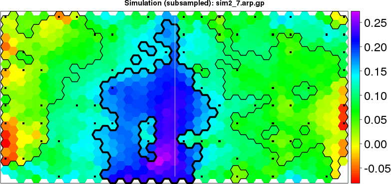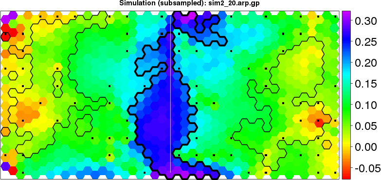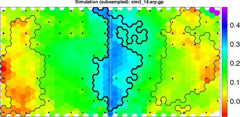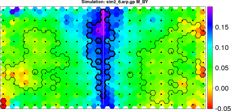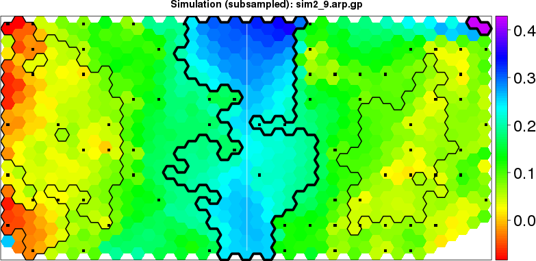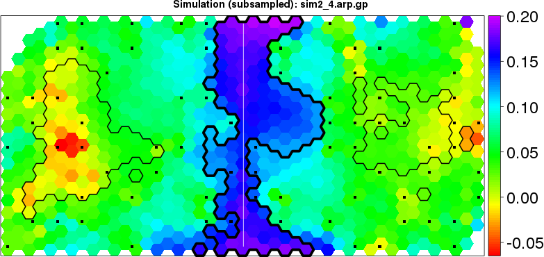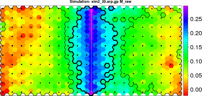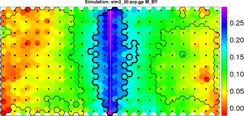Simulated data | Geographical plots of weighted mean of all ellipse values (i.e., individual genetic distances ar of Rousset 2000) and significant barrier (cells with differentiation values higher than expected under a random distribution (no FDR applied) are materialized with thick black borders) | Idem, Benjamini-Yekutieli FDR applied | MAPI analysis (no FDR applied) with subsampled (75/200) dataset | MAPI analysis (Benjamini-Yekutieli FDR applied) with subsampled (75/200) dataset | Best probability memberships | Probability memberships for cluster 1 | Probability memberships for cluster 2 | Probability memberships for cluster 3 | Probability memberships for cluster 4 | Probability memberships for cluster 5 | Best probability memberships | Probability memberships for cluster 1 | Probability memberships for cluster 2 | Probability memberships for cluster 3 | Probability memberships for cluster 4 | Probability memberships for cluster 5 | Scatter plot showing the first two components of the DAPC (when K*>2) or density plot showing the first principal component of the DAPC (when K*=2) | Probability memberships for cluster 1 | Probability memberships for cluster 2 | Probability memberships for cluster 3 | Probability memberships for cluster 4 | Probability memberships for cluster 5 | Scatter plot showing the first two components of the DAPC (when K*>2) or density plot showing the first principal component of the DAPC (when K*=2) | Probability memberships for cluster 1 | Probability memberships for cluster 2 | Probability memberships for cluster 3 | Probability memberships for cluster 4 | Probability memberships for cluster 5 |