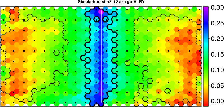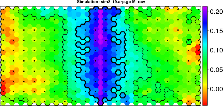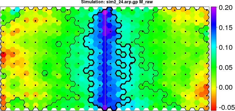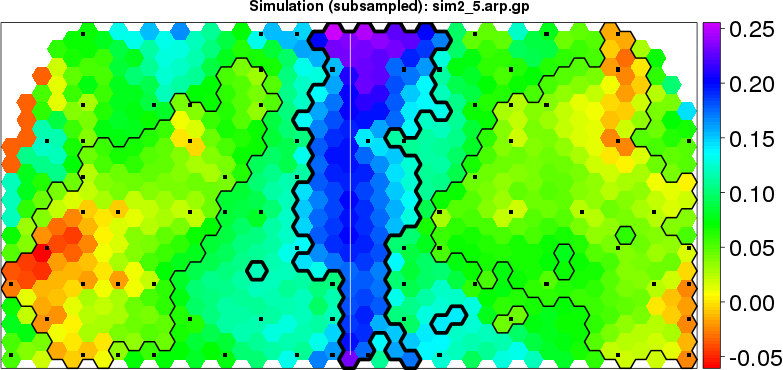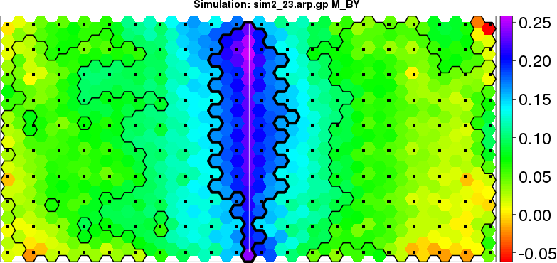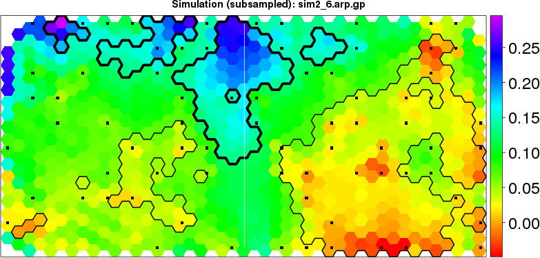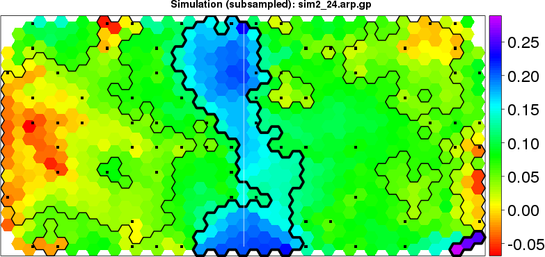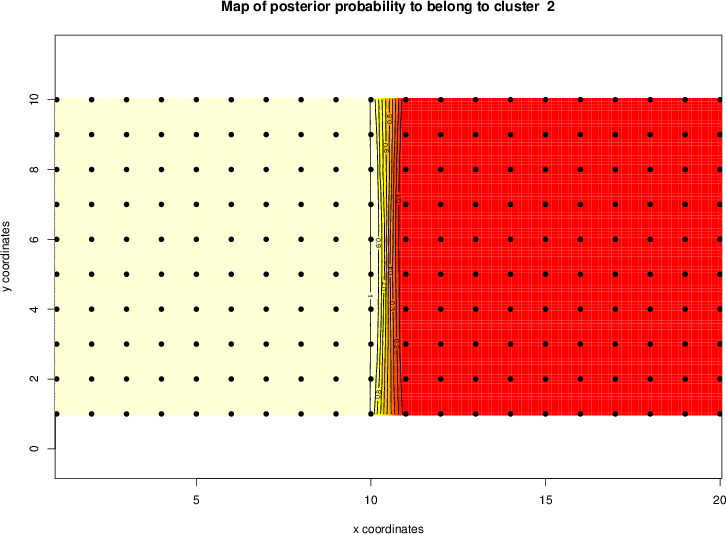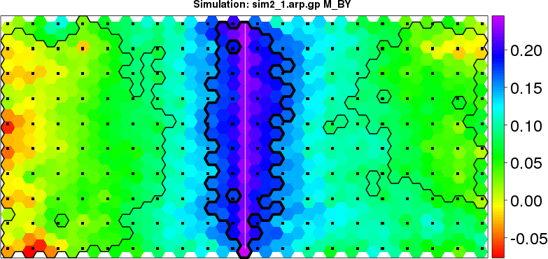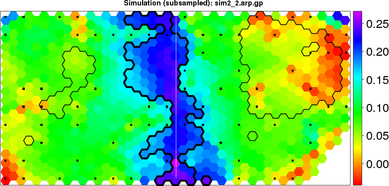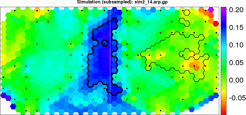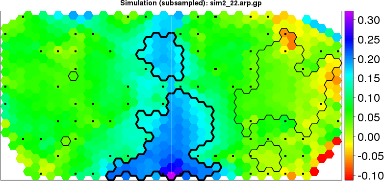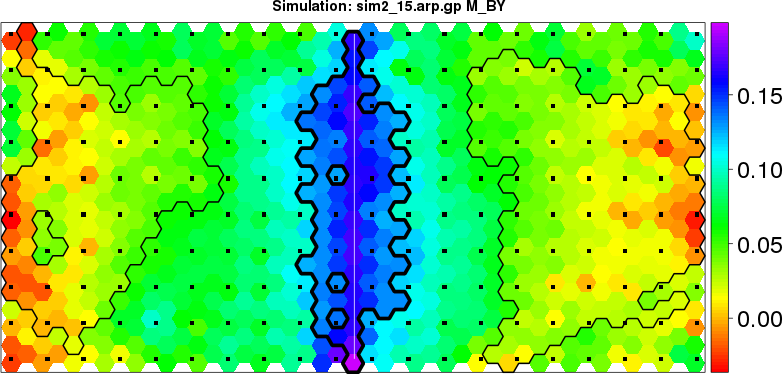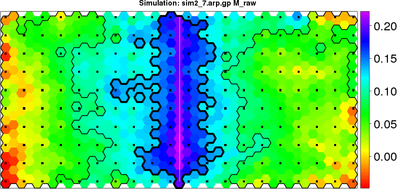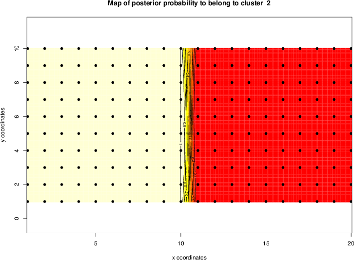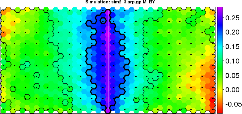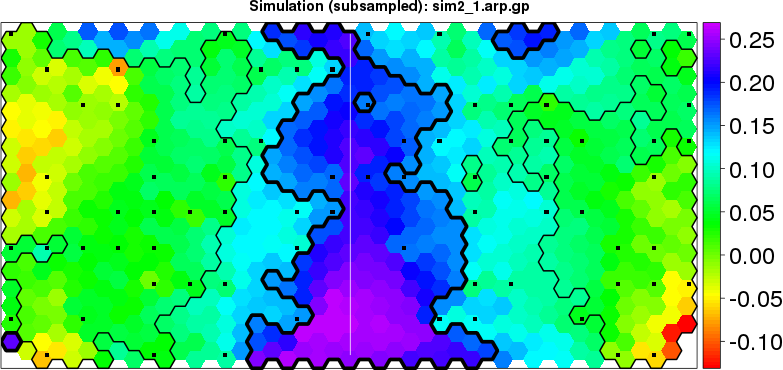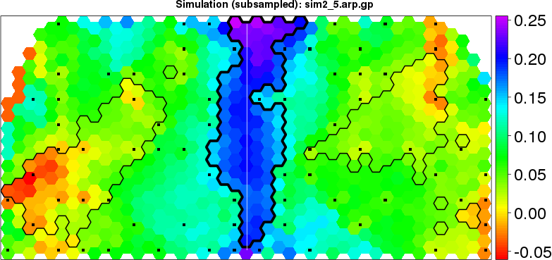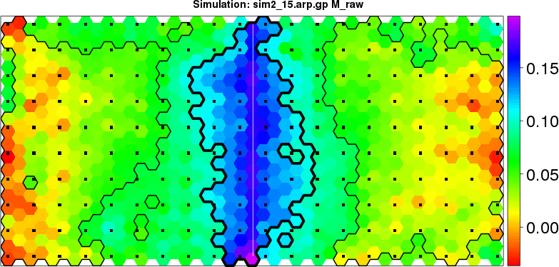 Simulated data | Geographical plots of weighted mean of all ellipse values (i.e., individual genetic distances ar of Rousset 2000) and significant barrier (cells with differentiation values higher than expected under a random distribution (no FDR applied) are materialized with thick black borders) | Idem, Benjamini-Yekutieli FDR applied | MAPI analysis (no FDR applied) with subsampled (75/200) dataset | MAPI analysis (Benjamini-Yekutieli FDR applied) with subsampled (75/200) dataset | Best probability memberships | Probability memberships for cluster 1 | Probability memberships for cluster 2 | Probability memberships for cluster 3 | Probability memberships for cluster 4 | Probability memberships for cluster 5 | Best probability memberships | Probability memberships for cluster 1 | Probability memberships for cluster 2 | Probability memberships for cluster 3 | Probability memberships for cluster 4 | Probability memberships for cluster 5 | Scatter plot showing the first two components of the DAPC (when K*>2) or density plot showing the first principal component of the DAPC (when K*=2) | Probability memberships for cluster 1 | Probability memberships for cluster 2 | Probability memberships for cluster 3 | Probability memberships for cluster 4 | Probability memberships for cluster 5 | Scatter plot showing the first two components of the DAPC (when K*>2) or density plot showing the first principal component of the DAPC (when K*=2) | Probability memberships for cluster 1 | Probability memberships for cluster 2 | Probability memberships for cluster 3 | Probability memberships for cluster 4 | Probability memberships for cluster 5 |