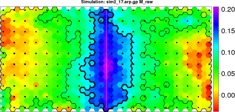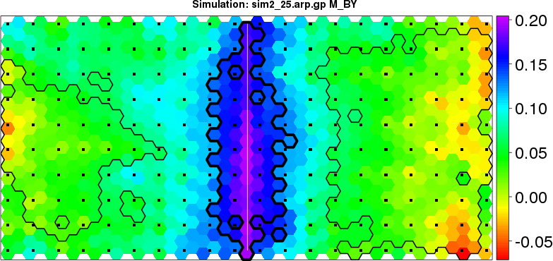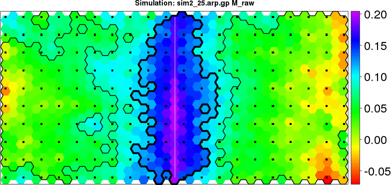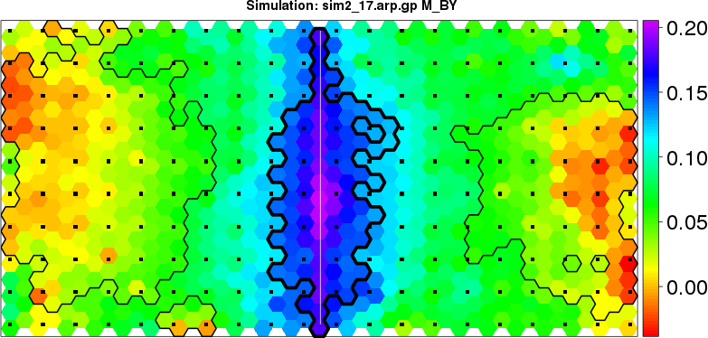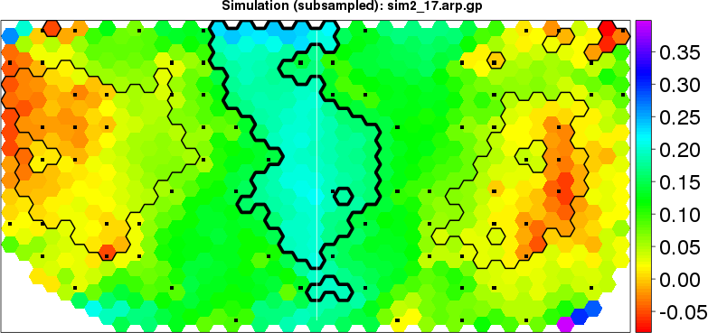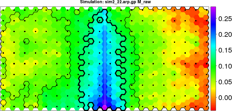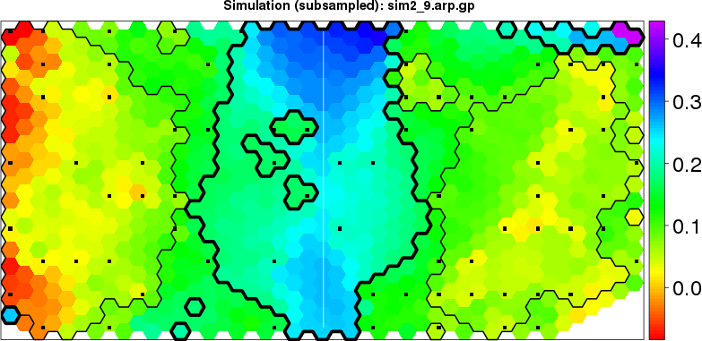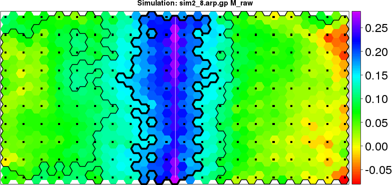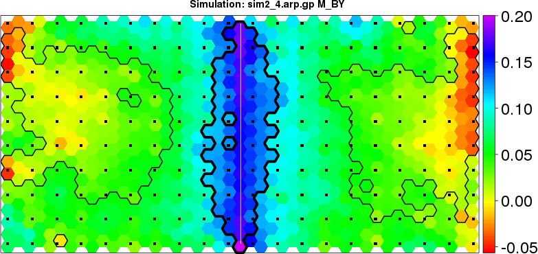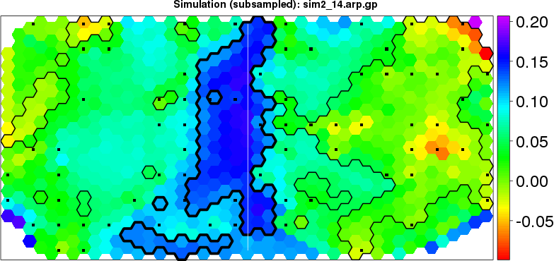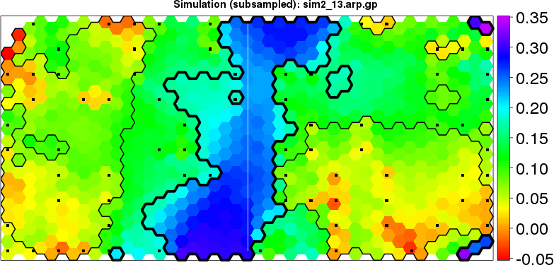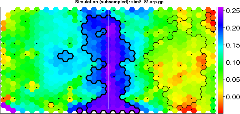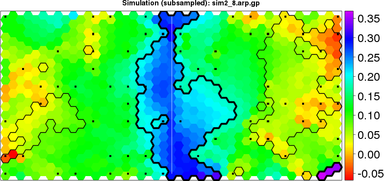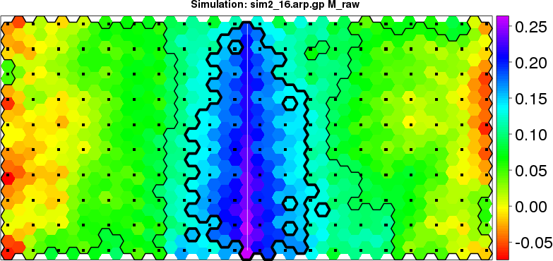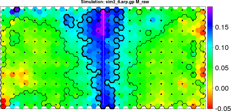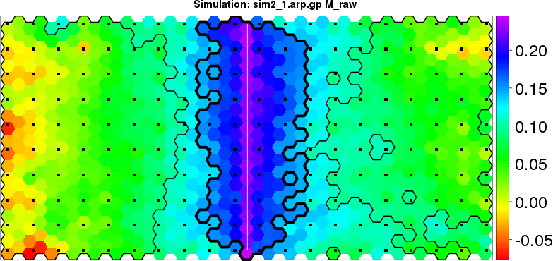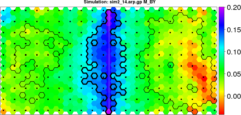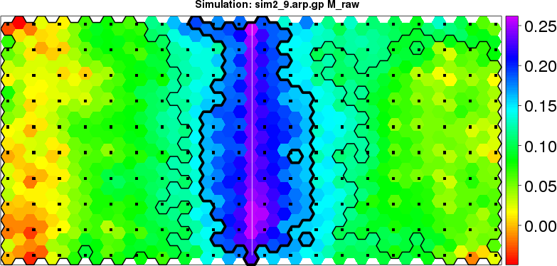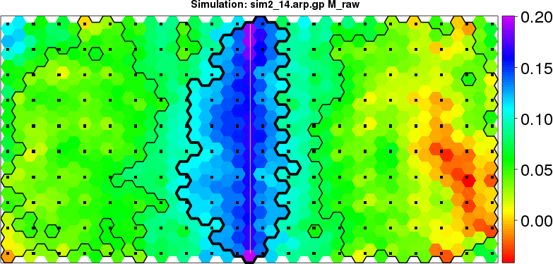 Simulated data | Geographical plots of weighted mean of all ellipse values (i.e., individual genetic distances ar of Rousset 2000) and significant barrier (cells with differentiation values higher than expected under a random distribution (no FDR applied) are materialized with thick black borders) | Idem, Benjamini-Yekutieli FDR applied | MAPI analysis (no FDR applied) with subsampled (75/200) dataset | MAPI analysis (Benjamini-Yekutieli FDR applied) with subsampled (75/200) dataset | Best probability memberships | Probability memberships for cluster 1 | Probability memberships for cluster 2 | Probability memberships for cluster 3 | Probability memberships for cluster 4 | Probability memberships for cluster 5 | Best probability memberships | Probability memberships for cluster 1 | Probability memberships for cluster 2 | Probability memberships for cluster 3 | Probability memberships for cluster 4 | Probability memberships for cluster 5 | Scatter plot showing the first two components of the DAPC (when K*>2) or density plot showing the first principal component of the DAPC (when K*=2) | Probability memberships for cluster 1 | Probability memberships for cluster 2 | Probability memberships for cluster 3 | Probability memberships for cluster 4 | Probability memberships for cluster 5 | Scatter plot showing the first two components of the DAPC (when K*>2) or density plot showing the first principal component of the DAPC (when K*=2) | Probability memberships for cluster 1 | Probability memberships for cluster 2 | Probability memberships for cluster 3 | Probability memberships for cluster 4 | Probability memberships for cluster 5 |