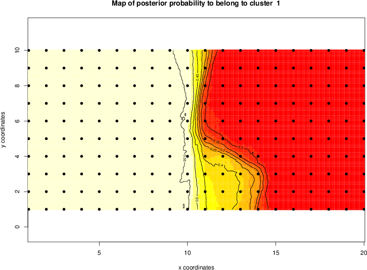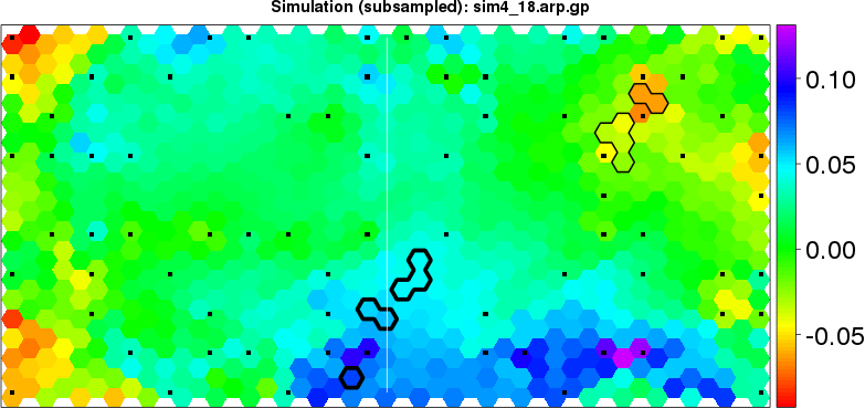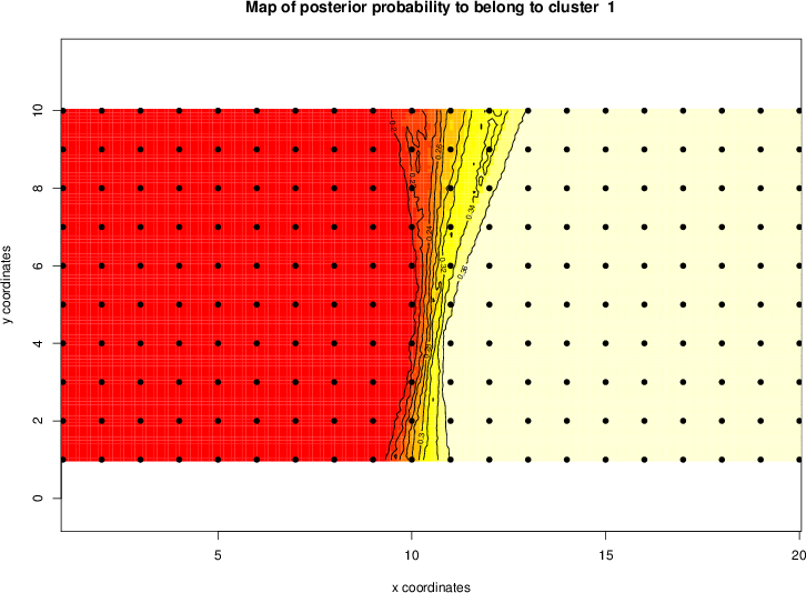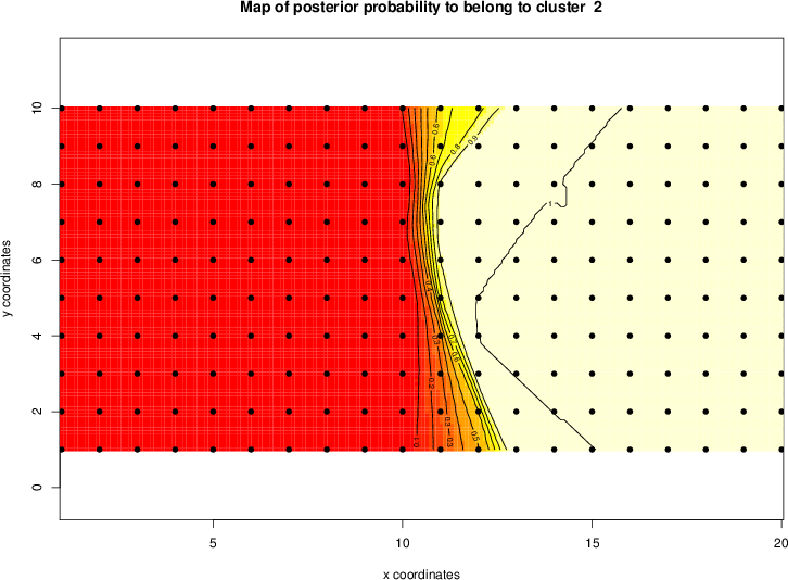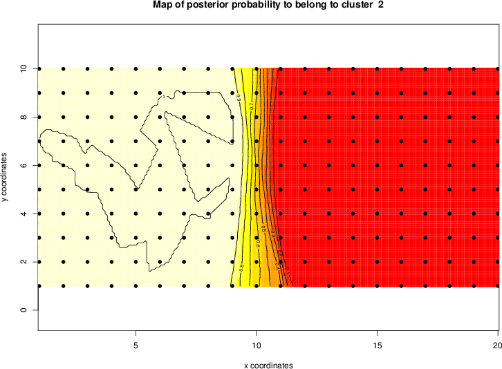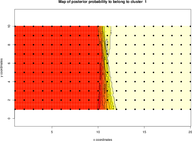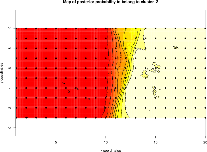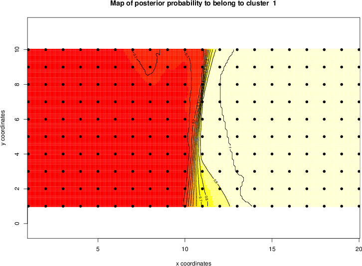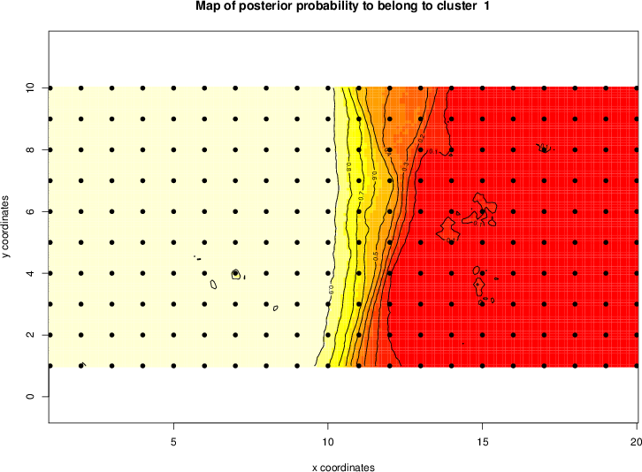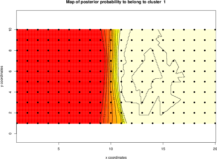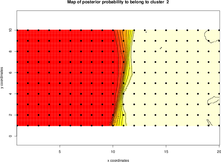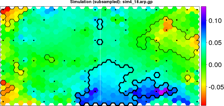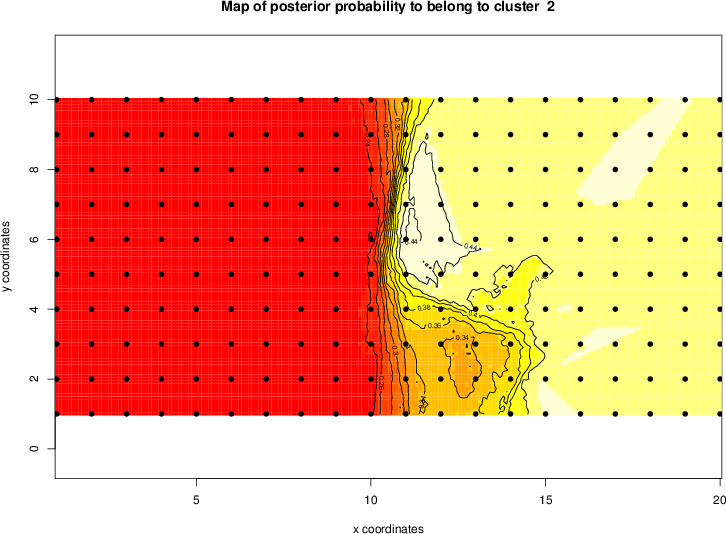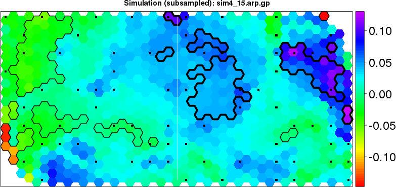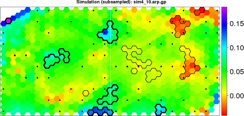 Simulated data | Geographical plots of weighted mean of all ellipse values (i.e., individual genetic distances ar of Rousset 2000) and significant barrier (cells with differentiation values higher than expected under a random distribution (no FDR applied) are materialized with thick black borders) | Idem, Benjamini-Yekutieli FDR applied | MAPI analysis (no FDR applied) with subsampled (75/200) dataset | MAPI analysis (Benjamini-Yekutieli FDR applied) with subsampled (75/200) dataset | Best probability memberships | Probability memberships for cluster 1 | Probability memberships for cluster 2 | Probability memberships for cluster 3 | Probability memberships for cluster 4 | Probability memberships for cluster 5 | Best probability memberships | Probability memberships for cluster 1 | Probability memberships for cluster 2 | Probability memberships for cluster 3 | Probability memberships for cluster 4 | Probability memberships for cluster 5 | Scatter plot showing the first two components of the DAPC (when K*>2) or density plot showing the first principal component of the DAPC (when K*=2) | Probability memberships for cluster 1 | Probability memberships for cluster 2 | Probability memberships for cluster 3 | Probability memberships for cluster 4 | Probability memberships for cluster 5 | Scatter plot showing the first two components of the DAPC (when K*>2) or density plot showing the first principal component of the DAPC (when K*=2) | Probability memberships for cluster 1 | Probability memberships for cluster 2 | Probability memberships for cluster 3 | Probability memberships for cluster 4 | Probability memberships for cluster 5 |