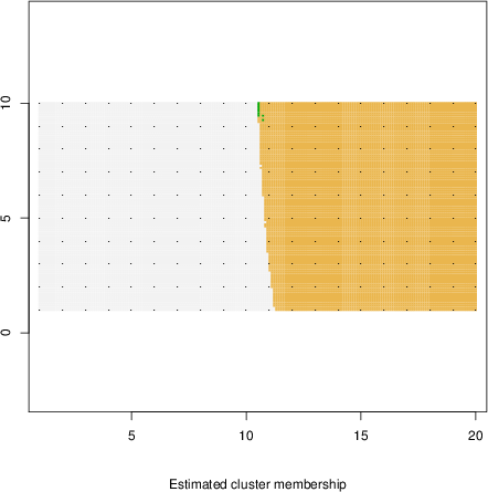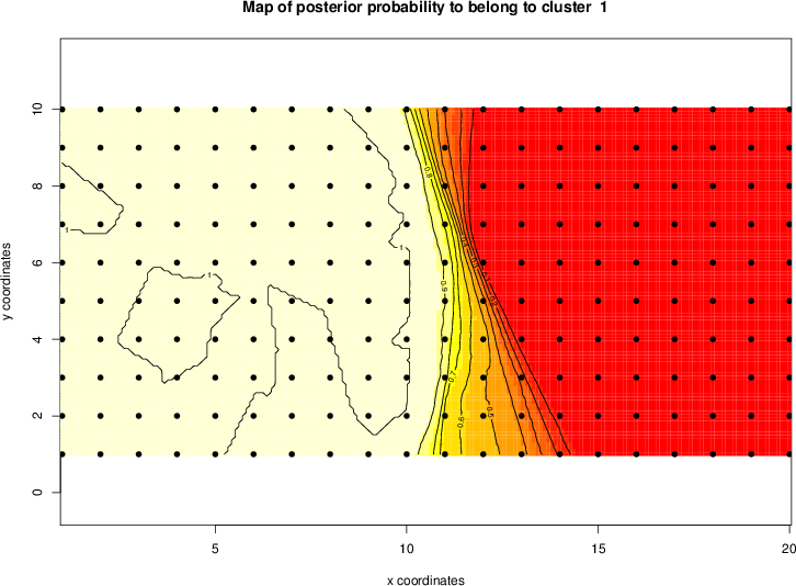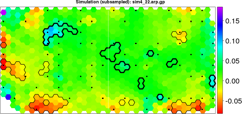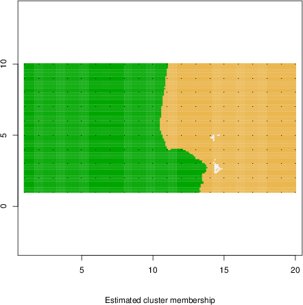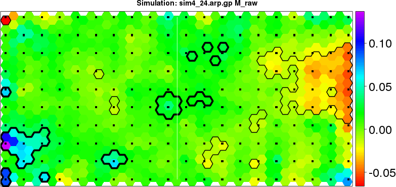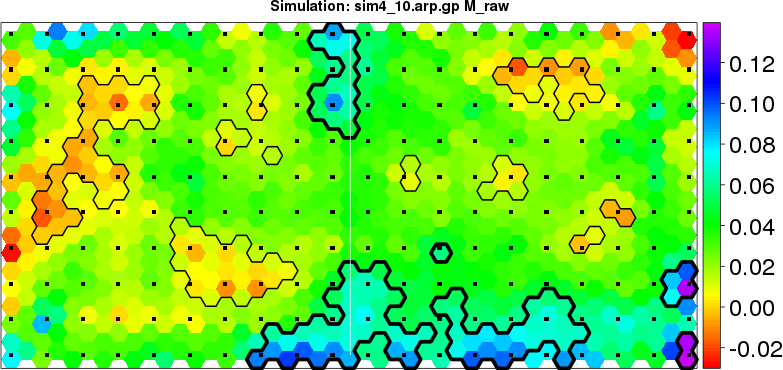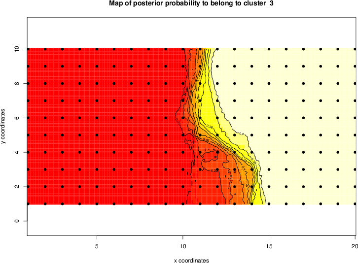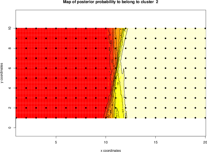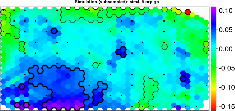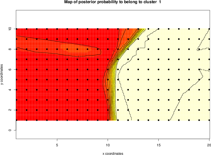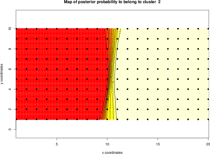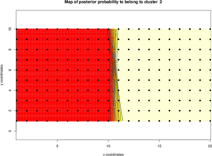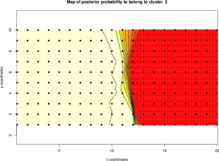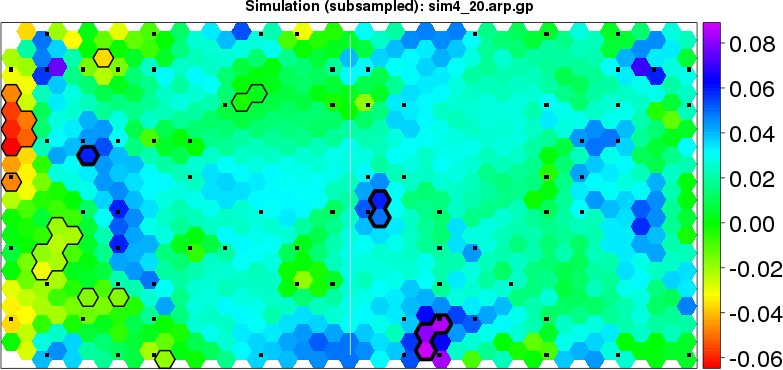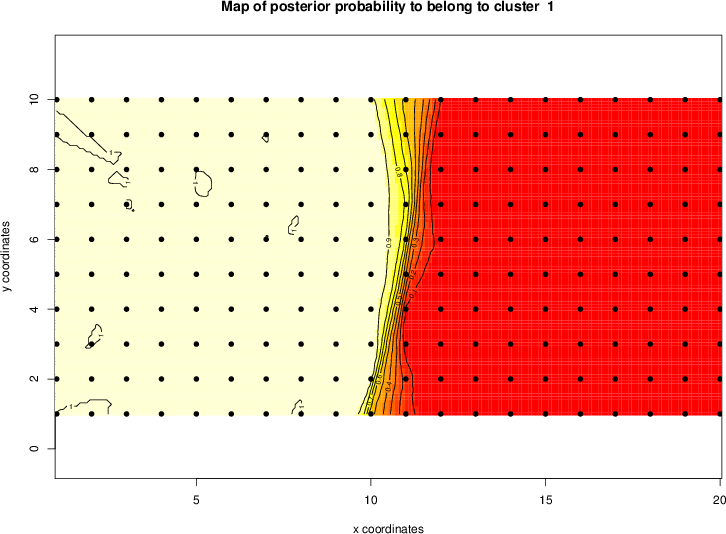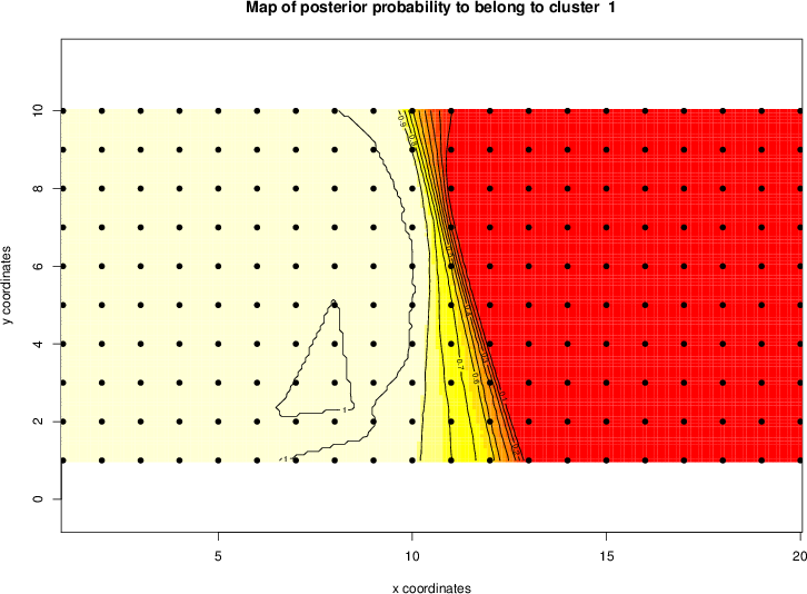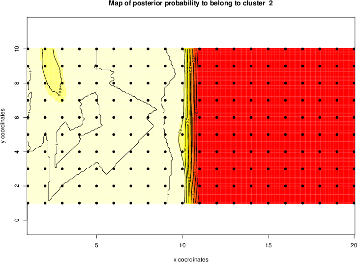 Simulated data | Geographical plots of weighted mean of all ellipse values (i.e., individual genetic distances ar of Rousset 2000) and significant barrier (cells with differentiation values higher than expected under a random distribution (no FDR applied) are materialized with thick black borders) | Idem, Benjamini-Yekutieli FDR applied | MAPI analysis (no FDR applied) with subsampled (75/200) dataset | MAPI analysis (Benjamini-Yekutieli FDR applied) with subsampled (75/200) dataset | Best probability memberships | Probability memberships for cluster 1 | Probability memberships for cluster 2 | Probability memberships for cluster 3 | Probability memberships for cluster 4 | Probability memberships for cluster 5 | Best probability memberships | Probability memberships for cluster 1 | Probability memberships for cluster 2 | Probability memberships for cluster 3 | Probability memberships for cluster 4 | Probability memberships for cluster 5 | Scatter plot showing the first two components of the DAPC (when K*>2) or density plot showing the first principal component of the DAPC (when K*=2) | Probability memberships for cluster 1 | Probability memberships for cluster 2 | Probability memberships for cluster 3 | Probability memberships for cluster 4 | Probability memberships for cluster 5 | Scatter plot showing the first two components of the DAPC (when K*>2) or density plot showing the first principal component of the DAPC (when K*=2) | Probability memberships for cluster 1 | Probability memberships for cluster 2 | Probability memberships for cluster 3 | Probability memberships for cluster 4 | Probability memberships for cluster 5 |