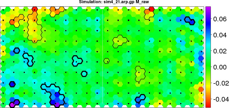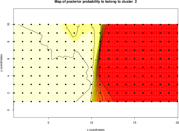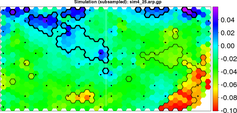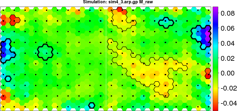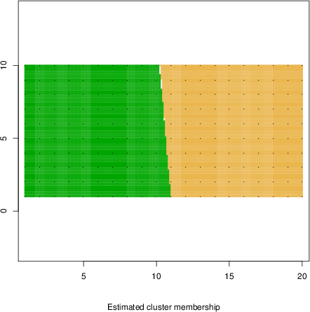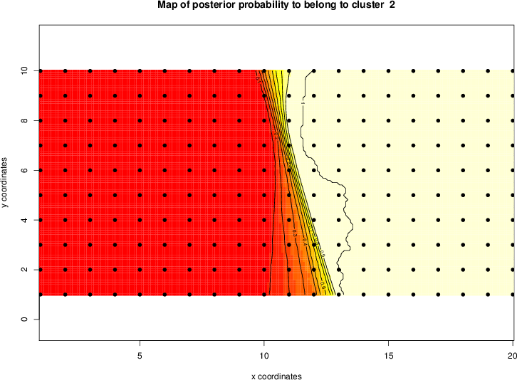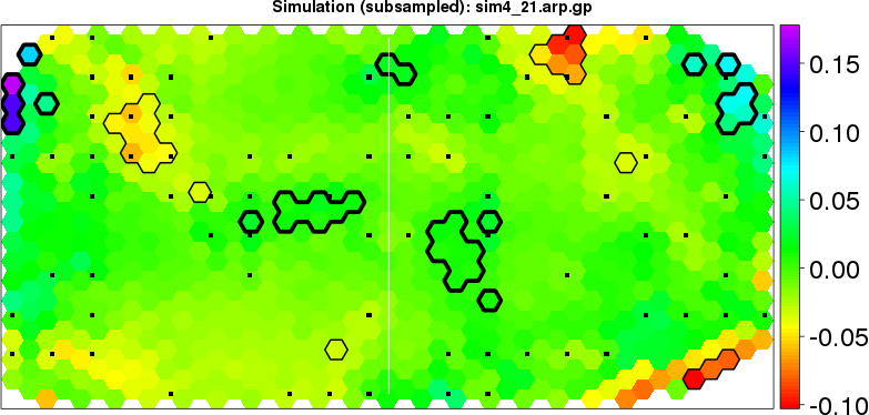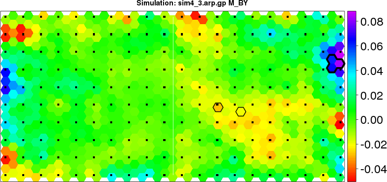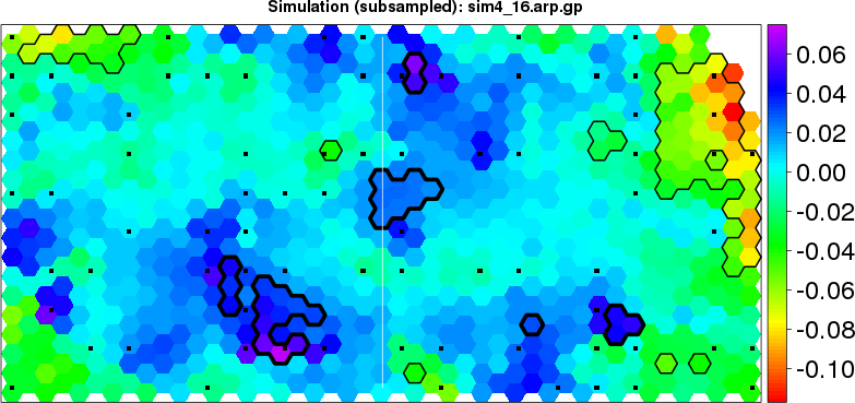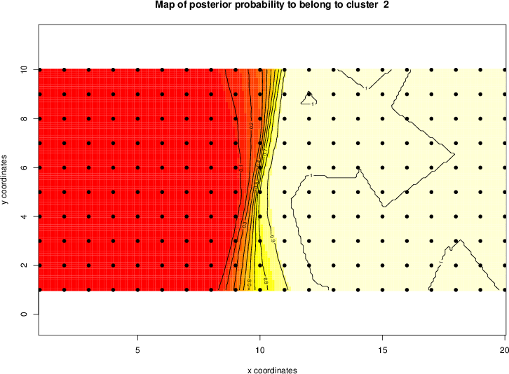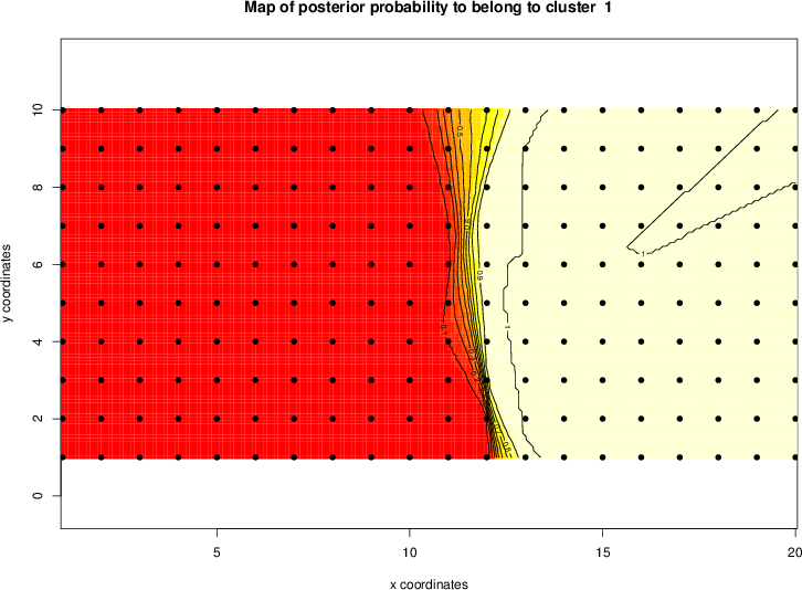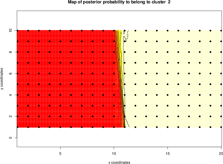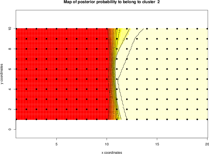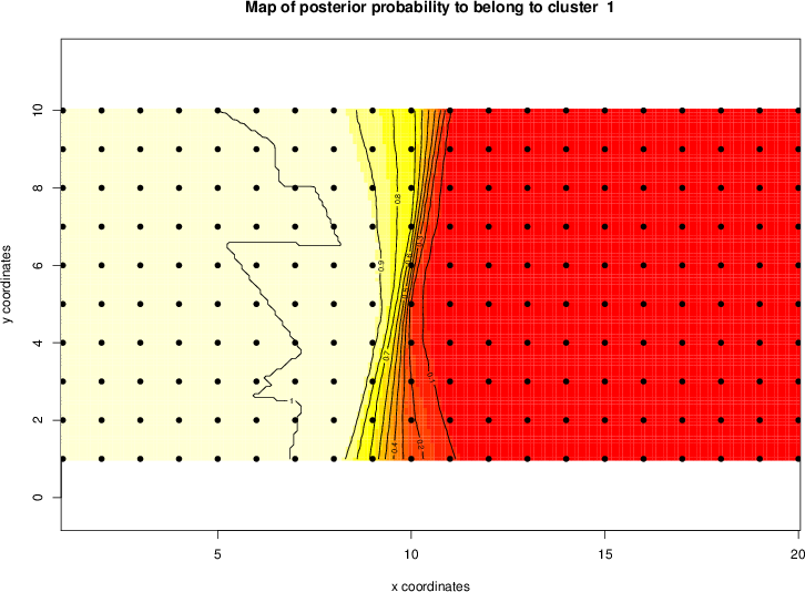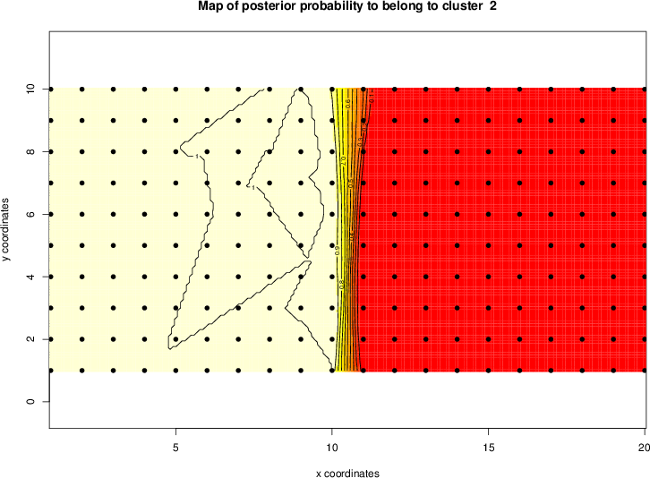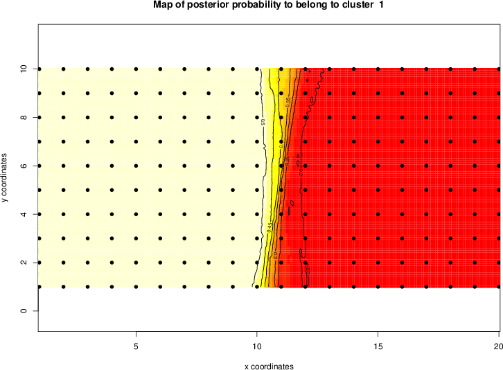 Simulated data | Geographical plots of weighted mean of all ellipse values (i.e., individual genetic distances ar of Rousset 2000) and significant barrier (cells with differentiation values higher than expected under a random distribution (no FDR applied) are materialized with thick black borders) | Idem, Benjamini-Yekutieli FDR applied | MAPI analysis (no FDR applied) with subsampled (75/200) dataset | MAPI analysis (Benjamini-Yekutieli FDR applied) with subsampled (75/200) dataset | Best probability memberships | Probability memberships for cluster 1 | Probability memberships for cluster 2 | Probability memberships for cluster 3 | Probability memberships for cluster 4 | Probability memberships for cluster 5 | Best probability memberships | Probability memberships for cluster 1 | Probability memberships for cluster 2 | Probability memberships for cluster 3 | Probability memberships for cluster 4 | Probability memberships for cluster 5 | Scatter plot showing the first two components of the DAPC (when K*>2) or density plot showing the first principal component of the DAPC (when K*=2) | Probability memberships for cluster 1 | Probability memberships for cluster 2 | Probability memberships for cluster 3 | Probability memberships for cluster 4 | Probability memberships for cluster 5 | Scatter plot showing the first two components of the DAPC (when K*>2) or density plot showing the first principal component of the DAPC (when K*=2) | Probability memberships for cluster 1 | Probability memberships for cluster 2 | Probability memberships for cluster 3 | Probability memberships for cluster 4 | Probability memberships for cluster 5 |
