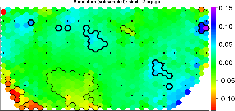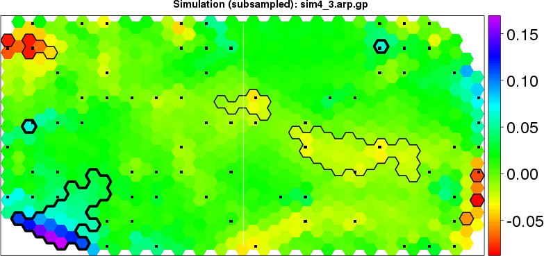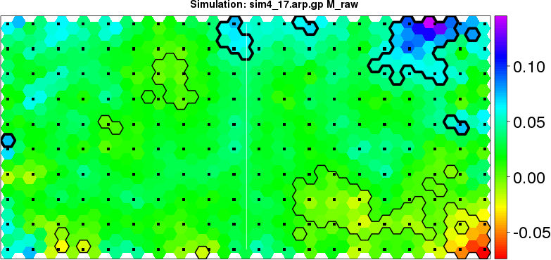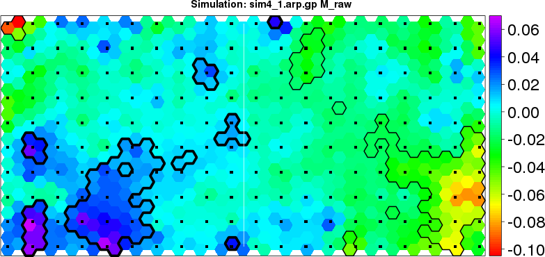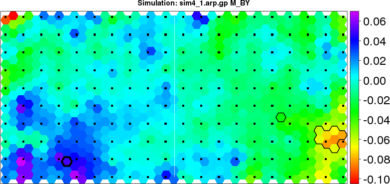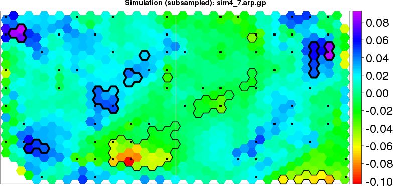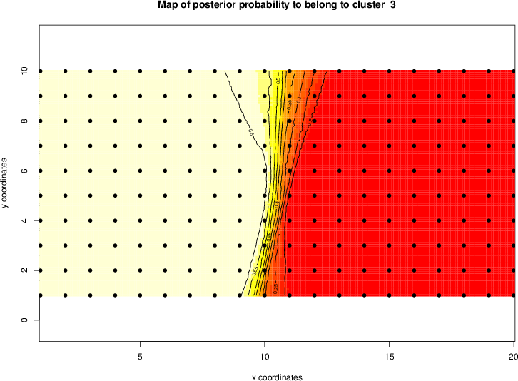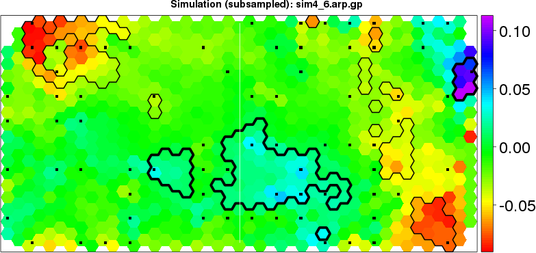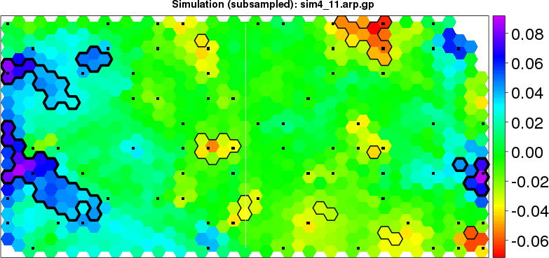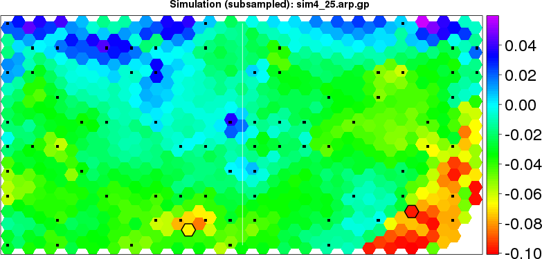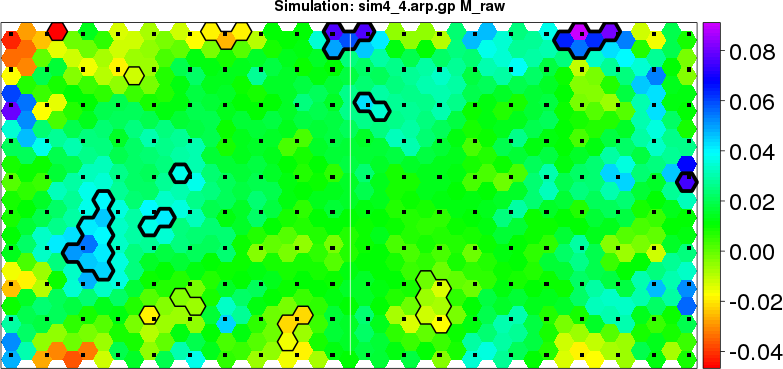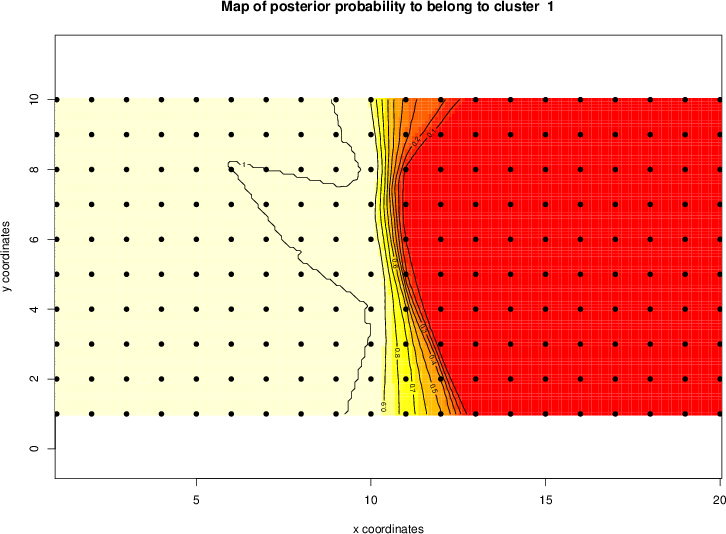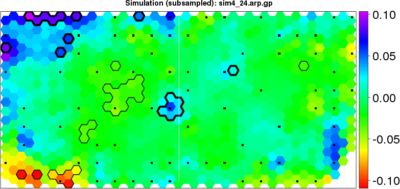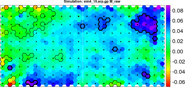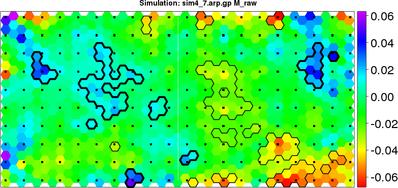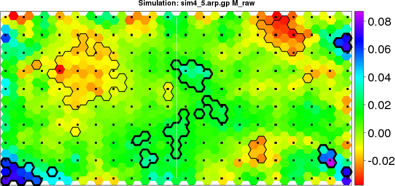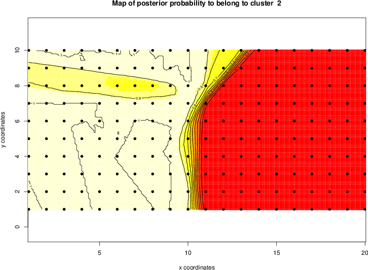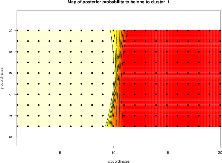Simulated data | Geographical plots of weighted mean of all ellipse values (i.e., individual genetic distances ar of Rousset 2000) and significant barrier (cells with differentiation values higher than expected under a random distribution (no FDR applied) are materialized with thick black borders) | Idem, Benjamini-Yekutieli FDR applied | MAPI analysis (no FDR applied) with subsampled (75/200) dataset | MAPI analysis (Benjamini-Yekutieli FDR applied) with subsampled (75/200) dataset | Best probability memberships | Probability memberships for cluster 1 | Probability memberships for cluster 2 | Probability memberships for cluster 3 | Probability memberships for cluster 4 | Probability memberships for cluster 5 | Best probability memberships | Probability memberships for cluster 1 | Probability memberships for cluster 2 | Probability memberships for cluster 3 | Probability memberships for cluster 4 | Probability memberships for cluster 5 | Scatter plot showing the first two components of the DAPC (when K*>2) or density plot showing the first principal component of the DAPC (when K*=2) | Probability memberships for cluster 1 | Probability memberships for cluster 2 | Probability memberships for cluster 3 | Probability memberships for cluster 4 | Probability memberships for cluster 5 | Scatter plot showing the first two components of the DAPC (when K*>2) or density plot showing the first principal component of the DAPC (when K*=2) | Probability memberships for cluster 1 | Probability memberships for cluster 2 | Probability memberships for cluster 3 | Probability memberships for cluster 4 | Probability memberships for cluster 5 |