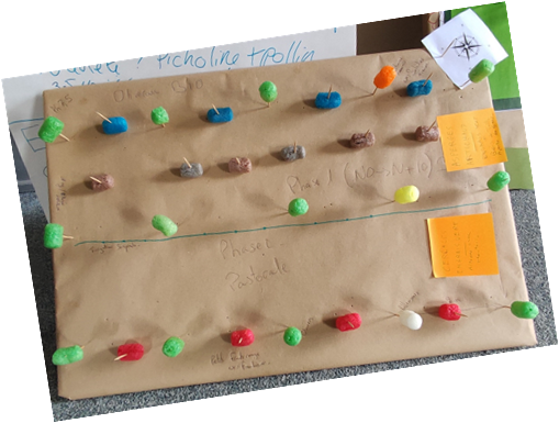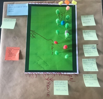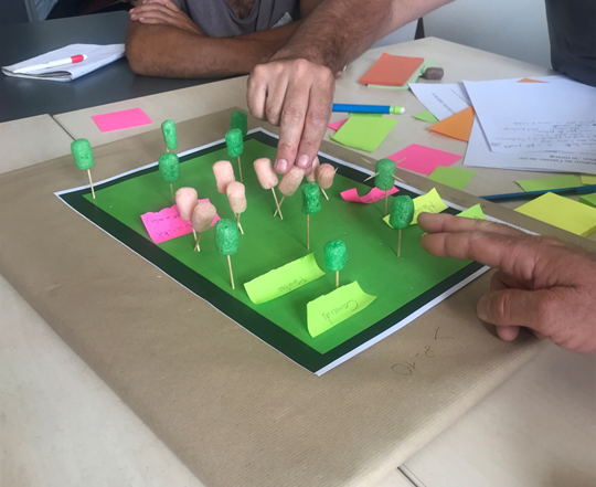 Two workshops were organised with stakeholders in France. The aims of the first one (co-design worksho) were: 1) to raise awareness of participants about the possibilities offered by diversified olive groves, 2) to stimulate exchanges of ideas between participants and 3) to co-design HSD system(s) based on olive trees that could then be tested in virtual experiments. Due to the high number of stakeholders involved, the participants were divided into three subgroups, with different objectives. One subgroup worked on diversification of olive groves with service crops (to increase soil fertility, improve water infiltration, reduce erosion), and two subgroups worked on the diversification of agricultural systems including olive production to increase total productivity of the plot while maintaining or improving soil fertility and water infiltration, and reducing erosion. All groups worked in a framework of constraints that were decided beforehand (soil type, slope) or during workshop (conventional/organic, commercialization channels…).