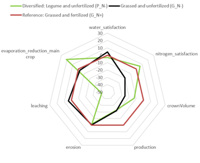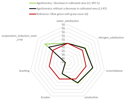 The hi-sAFe model was used to simulate the ecosystem services and disservices (namely, water and nitrogen satisfaction in olive trees, olive tree crown volume, agricultural production, soil erosion, nitrogen leaching, reduced soil evaporation) in 2 different conditions (deep and shallow soil), comparing the reference olive grove (red lines), with difversified systems, either with legumes cover crops to replace fertilization (in green in the first plot), or with arable rotation and lettuce on the tree line (black line in the second graph). The results show that the legume intercrop has some environmental benefits, but greatly reduces olive production, while the agroforestry system in the deep soil allows both an increase in total production (olive + crops) and environmental benefits.