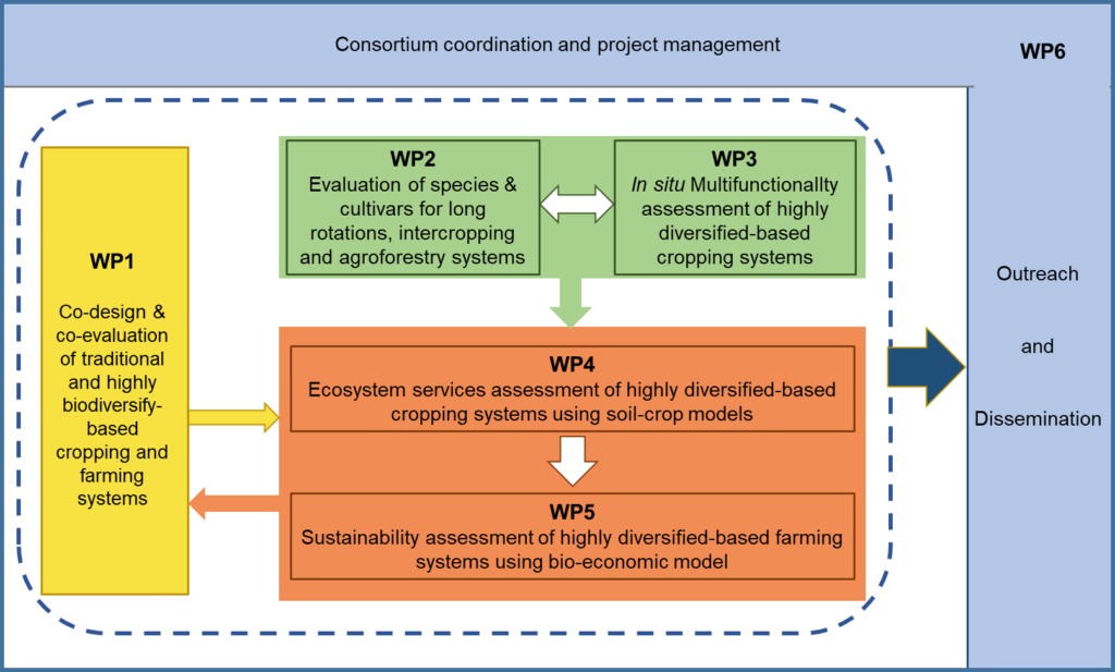 WP1 will manage the 8 case studies under a participatory approach aiming at co-designing innovative HSD cropping and farming systems using existing scientific and expert knowledge and considering farmers’ needs. WP2 and WP3 will produce novel scientific knowledge on the agronomic performances of selected germplasms, innovative crops rotations, intercropping and agroforestry systems in order to confirm the relevance of WP1 co-designed HSD cropping systems. WP4 will use WP2 and WP3 information as inputs for modelling cropping systems (field level and rotation scale) proposed in WP1 and will provide various types of outputs to WP5 (farm level). WP5 will then perform bio-economic modelling for calculating indicators and optimized solutions that allow improving the sustainability of Mediterranean farming systems co-designed in WP1. WP6 will identify the needs of farmers and stakeholders for renewing their knowledge on HSD systems, in connection with WP1, and will produce the ad hoc resources to answer the concerns.