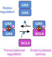 Les glutarédoxines (GRX) ont au moins trois fonctions principales identifiées. Dans les apoformes, elles présentent une activité oxydoréductase contrôlant notamment la glutathionylation / déglutathionylation des protéines. Dans les holoformes, c’est-à-dire les formes de pontage fer-soufre (Fe-S), elles agissent comme des facteurs de maturation pour la biogenèse des protéines à centre Fe-S ou comme régulateurs de l’homéostasie du fer contribuant directement ou indirectement à la détection de l’état du fer cellulaire et/ou sa distribution. Ces dernières fonctions semblent intimement liées à la capacité de GRX spécifiques à former des complexes homodimériques ou hétérodimériques de pontage [2Fe-2S] avec les protéines BOLA. Chez les levures, les deux protéines modulent la localisation et/ou l’activité des facteurs de transcription régulant les gènes codant pour les protéines impliquées dans l’absorption du fer et la séquestration intracellulaire en réponse notamment à une carence en fer. Alors que les isoformes GRX et BOLA des vertébrés peuvent afficher des fonctions similaires, les protéines partenaires impliquées sont différentes. Nous effectuons ici une évaluation critique des résultats soutenant l’implication des deux familles de protéines dans des voies de signalisation similaires dans les plantes et fournissons des idées et des stratégies expérimentales pour délimiter davantage leurs fonctions.