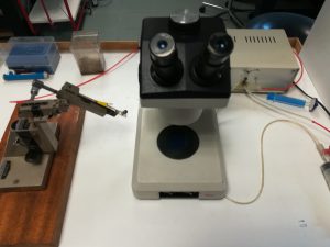 Injection d’ARN/ADN dans des ovocytes de xénope à l’aide d’un micro-injecteur.